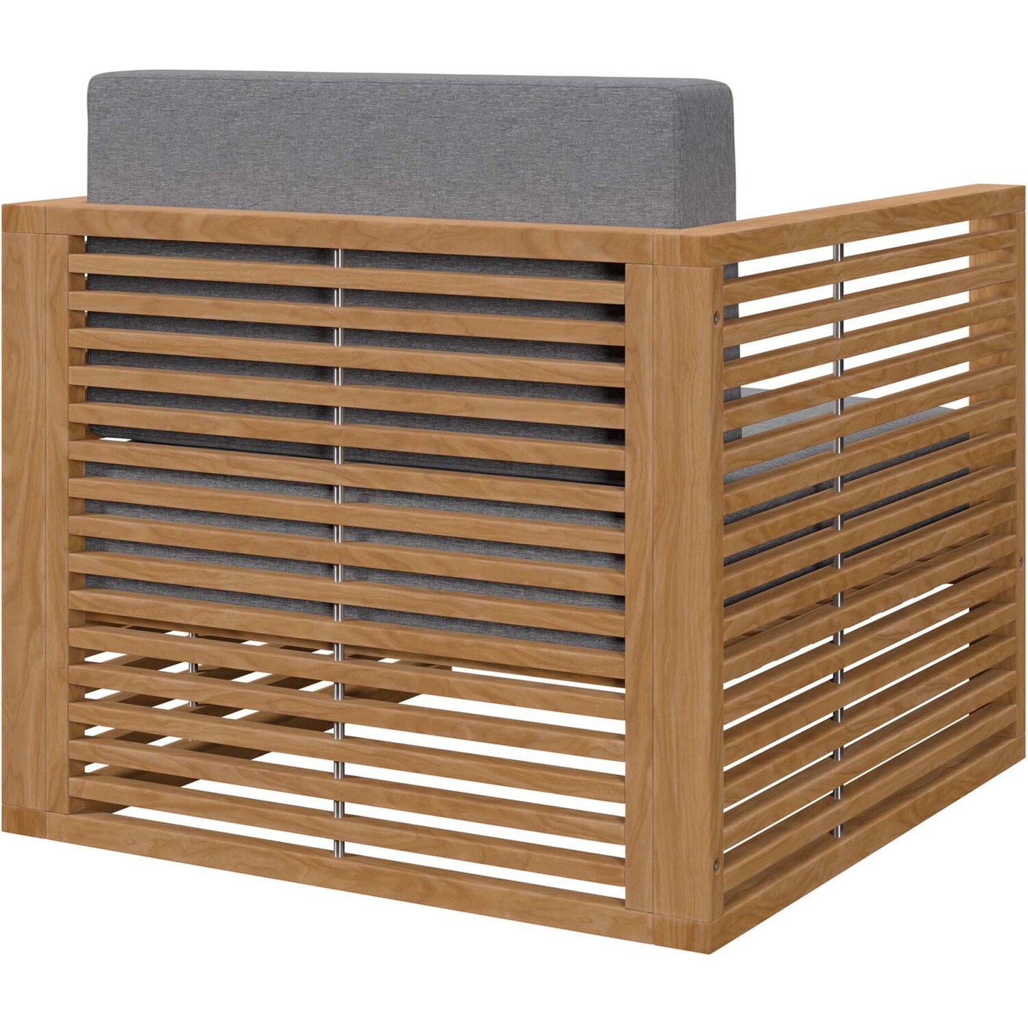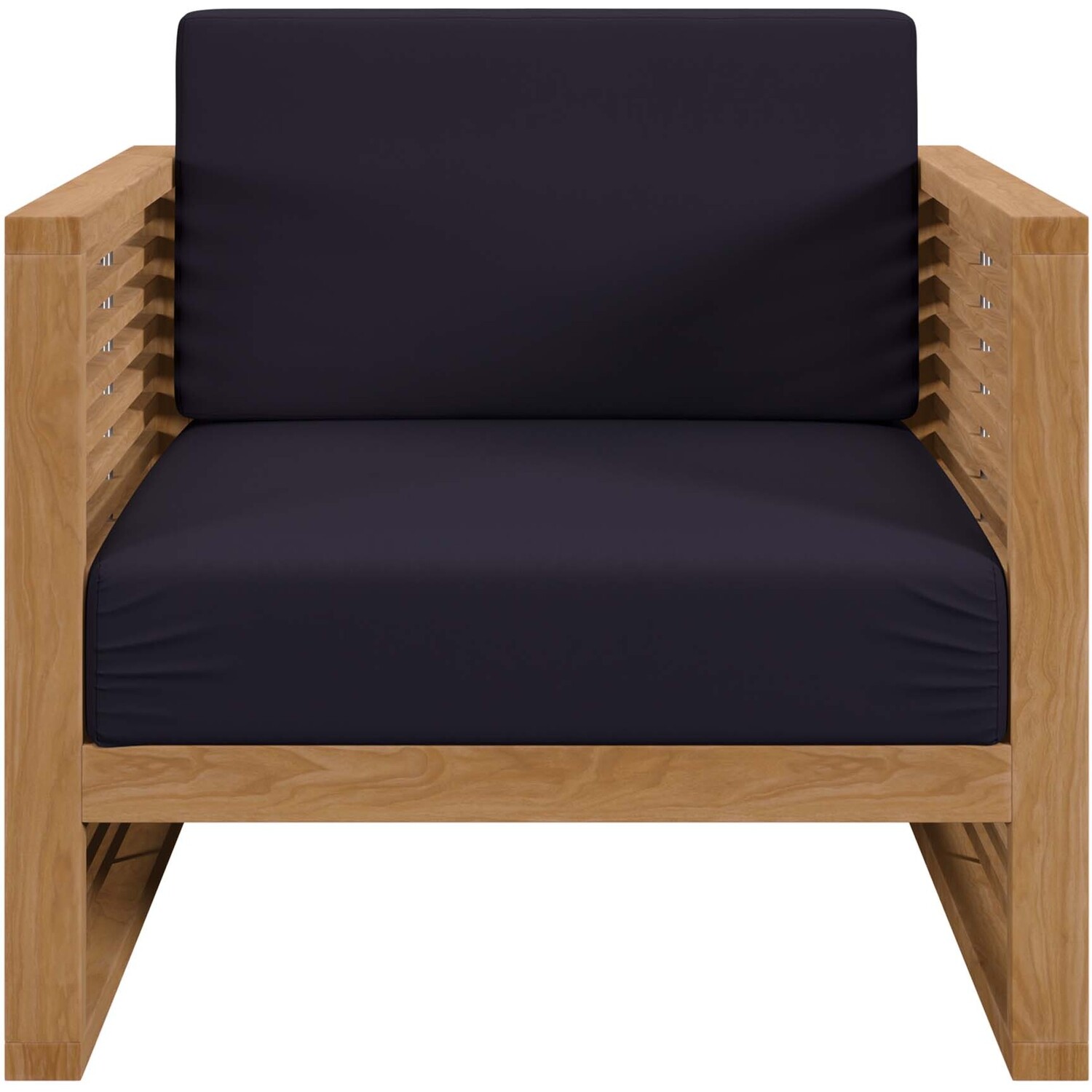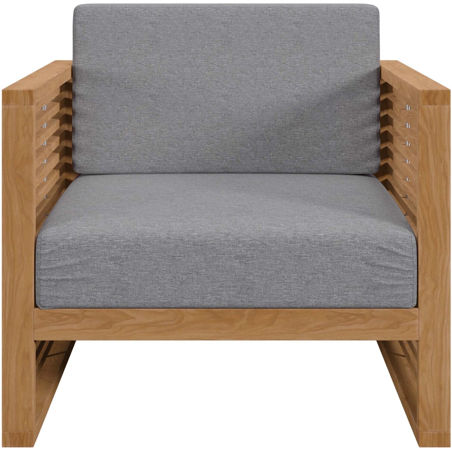 Enjoy warm weather and spirited conversation with the Carlsbad Teak Wood Outdoor Patio Furniture Set. A bold statement on the porch, in your backyard, or poolside, this patio set abounds in contemporary style with a slatted, clean-lined design. Ideal for al fresco entertaining or relaxing by the pool, the Carlsbad Outdoor Patio Furniture Collection is crafted with durable Premium Grade A teak wood and complete with comfortable cushions covered in machine washable sun, stain, water, and fade resistant Sunproof® fabric covers. Includes non-marking plastic foot glides. Patio Set Includes: 2 Armchairs, 1 Side TableOutdoor Patio Furniture Set