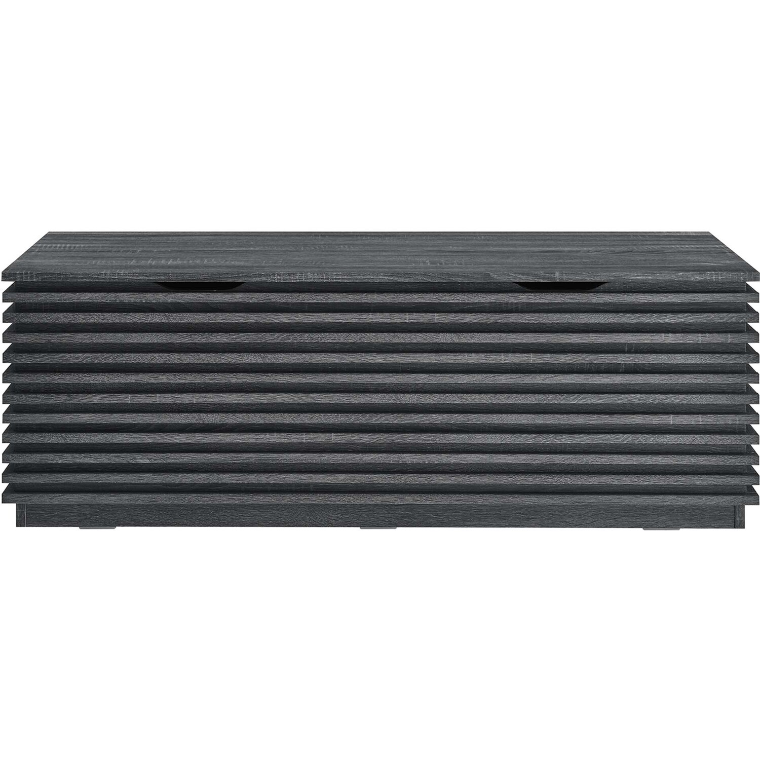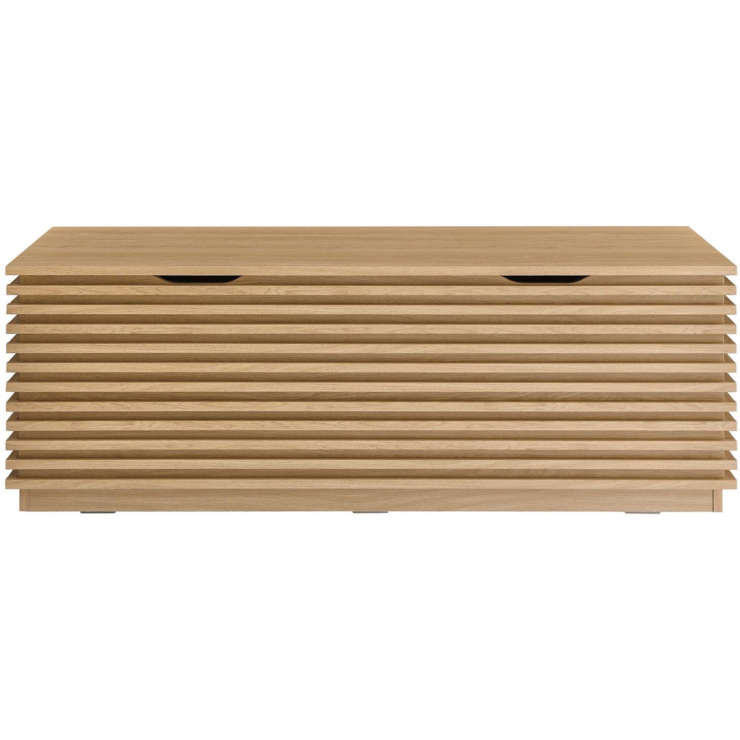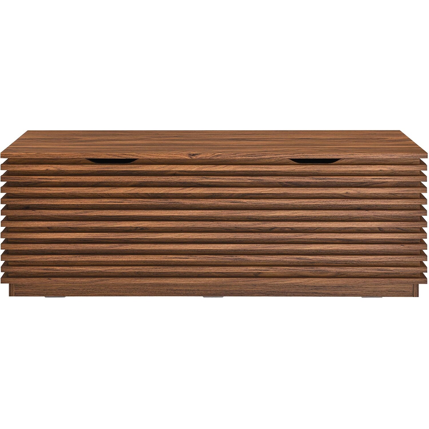 Tap into mid-century aesthetics with the Render Storage Bench. This installment of the Render collection features a durable particleboard frame with a smooth wood grain laminate and retro slatted detail. With a hinged top, this versatile accent bench features a solid construction with a pleasing look and practical functionality. Perfect for the living room, bedroom, entryway, or mudroom, this 47" bench offers ample storage space for linens, clothes, blankets, or whatever else suits your needs. Includes cutouts as a safety measure. Assembly required.Mid-Century Modern Storage Bench