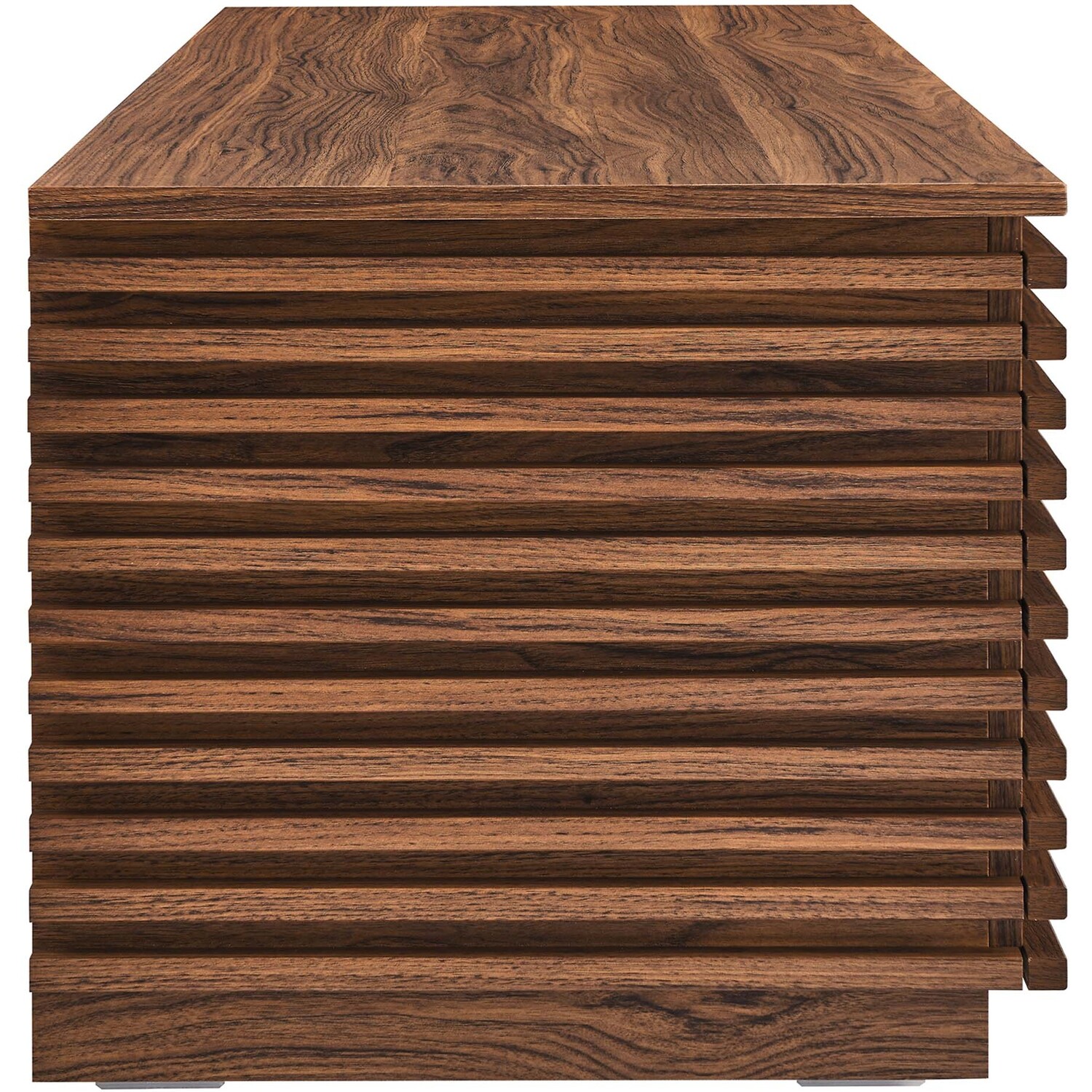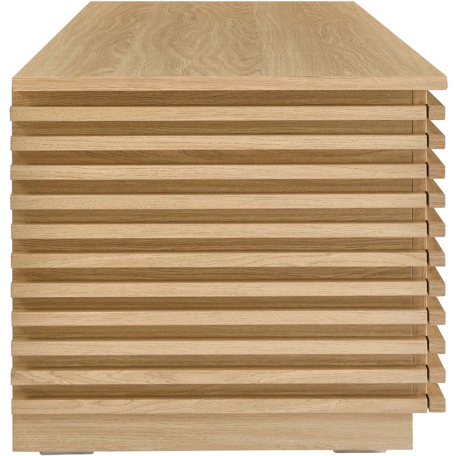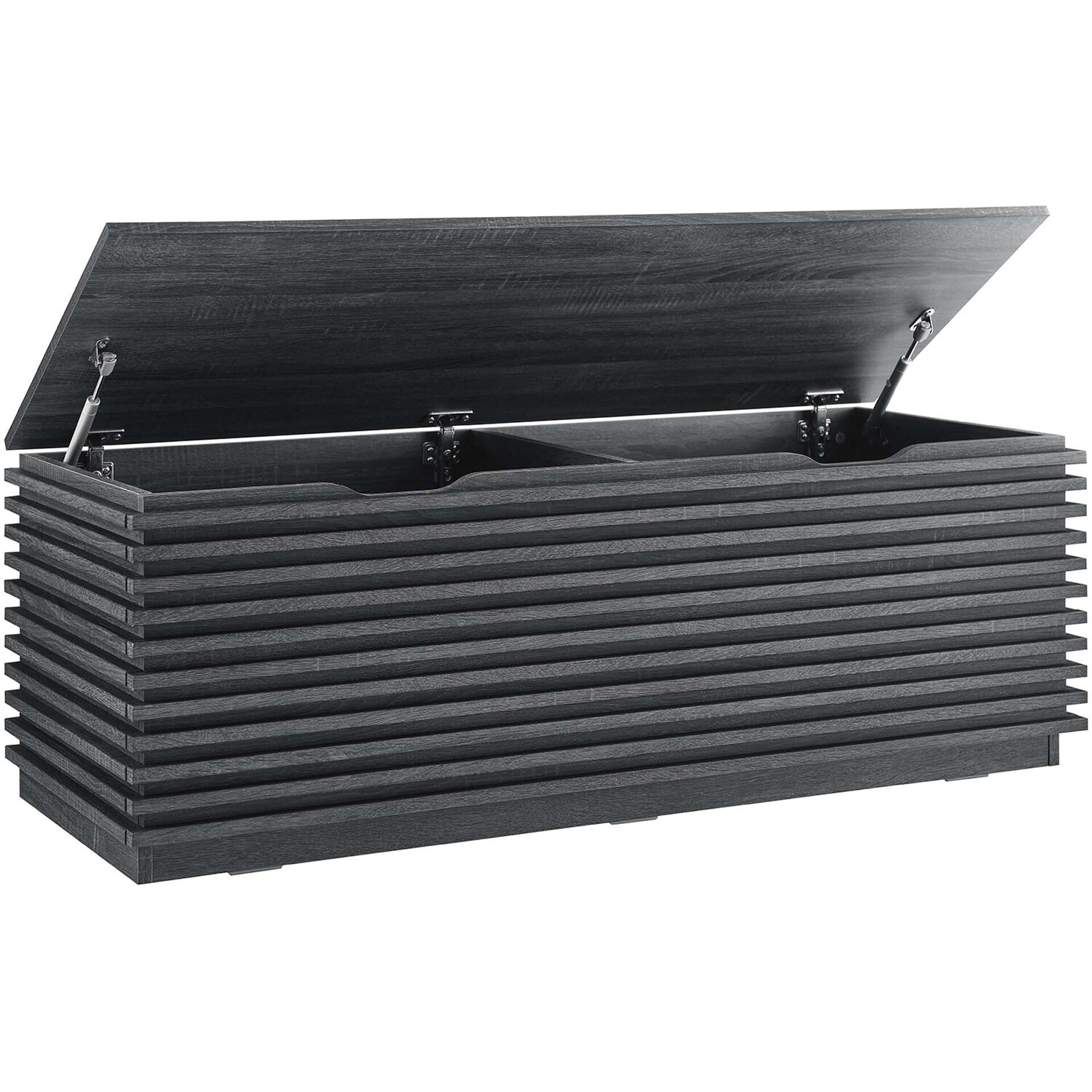Tap into mid-century aesthetics with the Render Storage Bench. This installment of the Render collection features a durable particleboard frame with a smooth wood grain laminate and retro slatted detail. With a hinged top, this versatile accent bench features a solid construction with a pleasing look and practical functionality. Perfect for the living room, bedroom, entryway, or mudroom, this 47" bench offers ample storage space for linens, clothes, blankets, or whatever else suits your needs. Includes cutouts as a safety measure. Assembly required.Mid-Century Modern Storage Bench