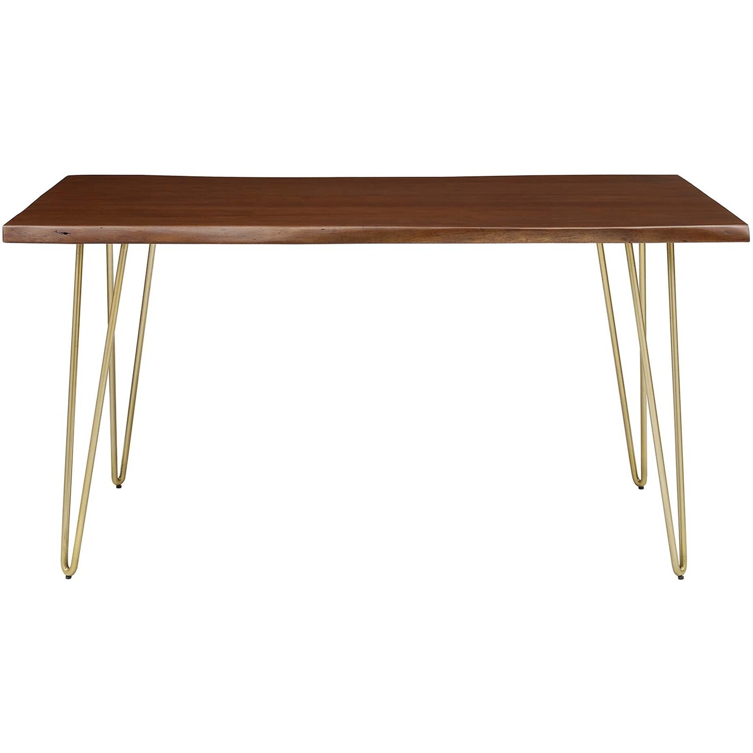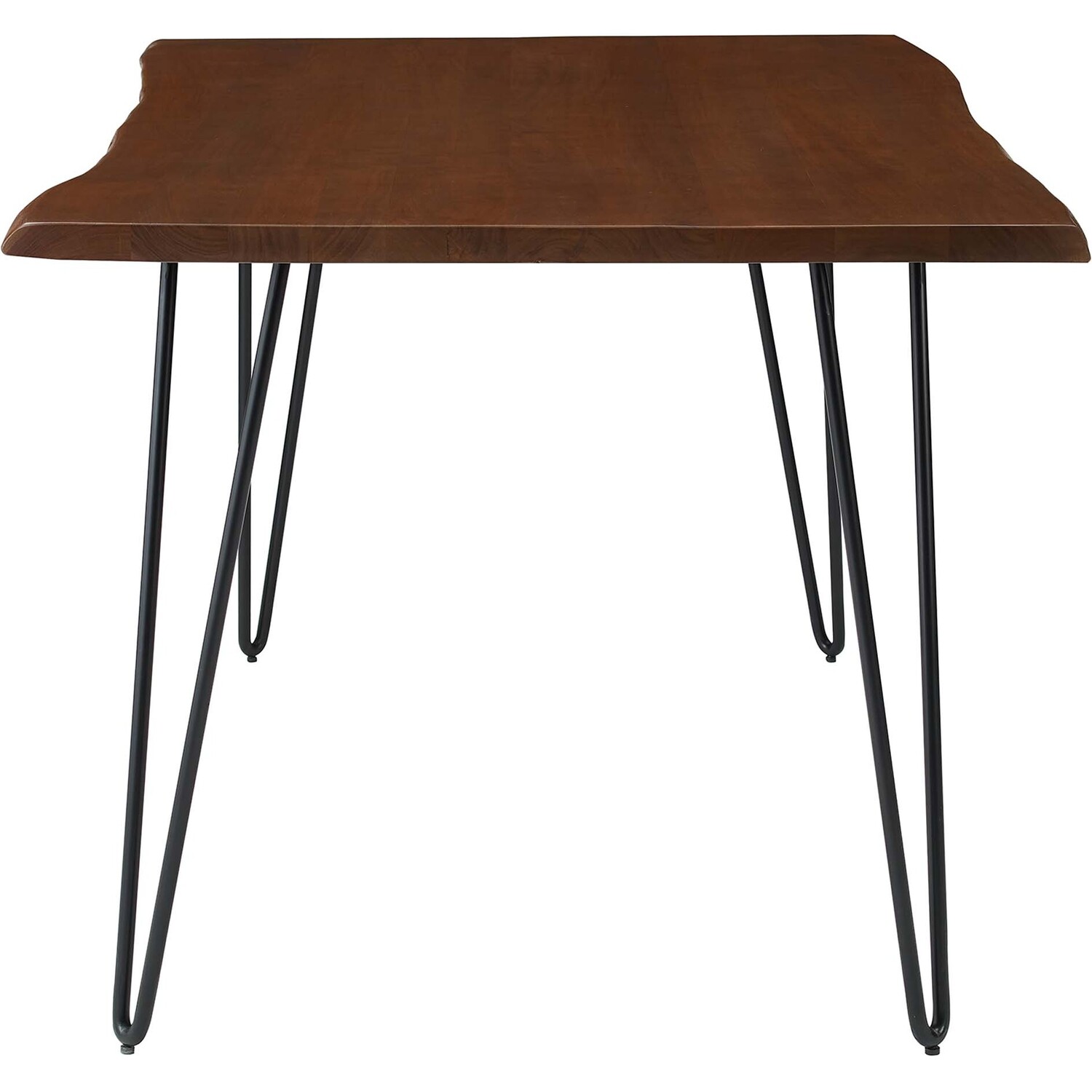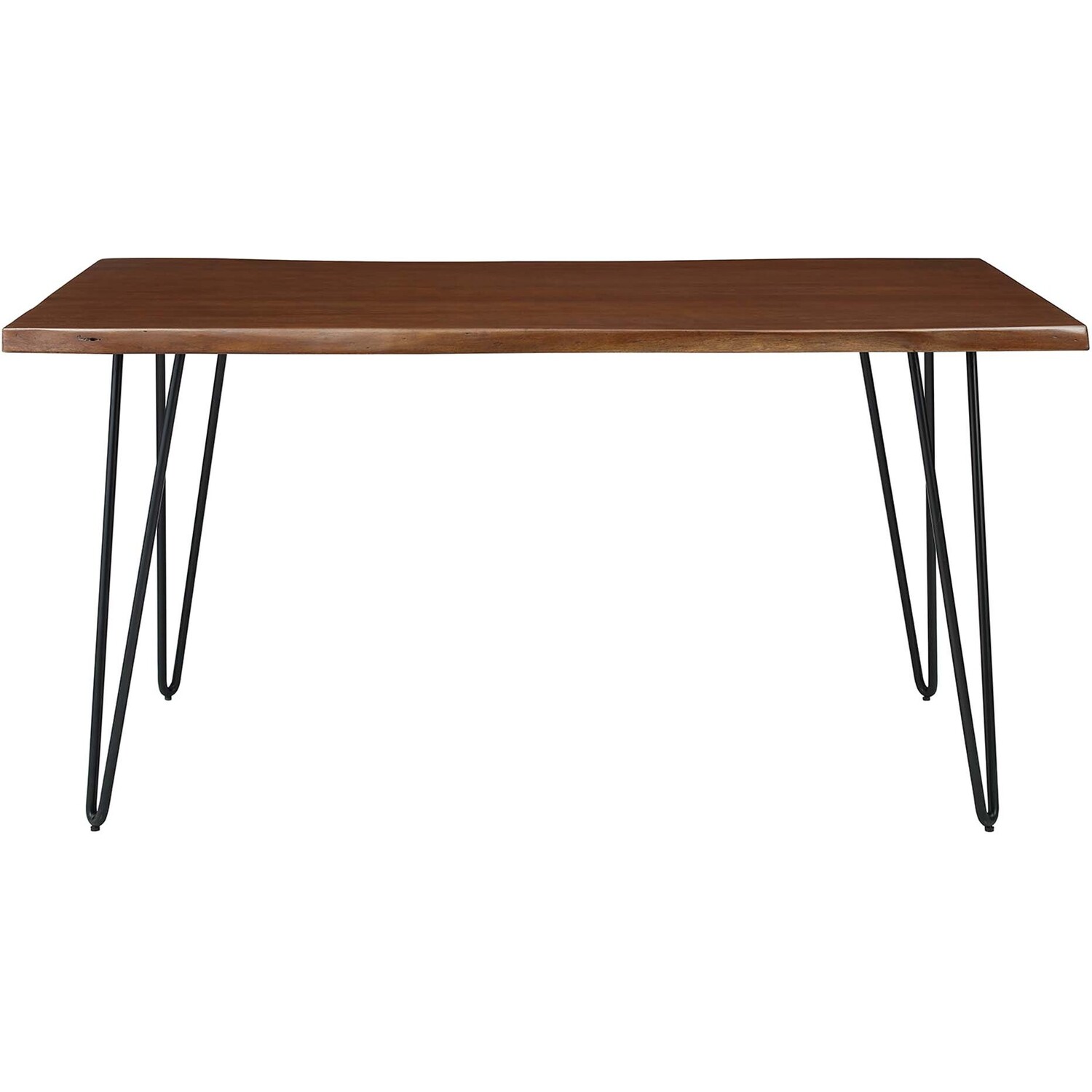 Sit amidst organic intrigue and retro style with the Ardor Rectangular Live Edge Dining Table. Featuring a one-of-a-kind raw edge tabletop crafted with a solid piece of acacia wood, this dining table is brimming with natural beauty. Comfortably accommodating six dining chairs, this 60" table rests on four powder-coated metal hairpin legs. This versatile dining table is ideal for everyday dining and entertaining and can also serve as a functional office desk. Due to the natural characteristics of the wood, each live edge table is unique. Includes non-marking foot pins to protect flooring. Assembly required.Live Edge Dining Table