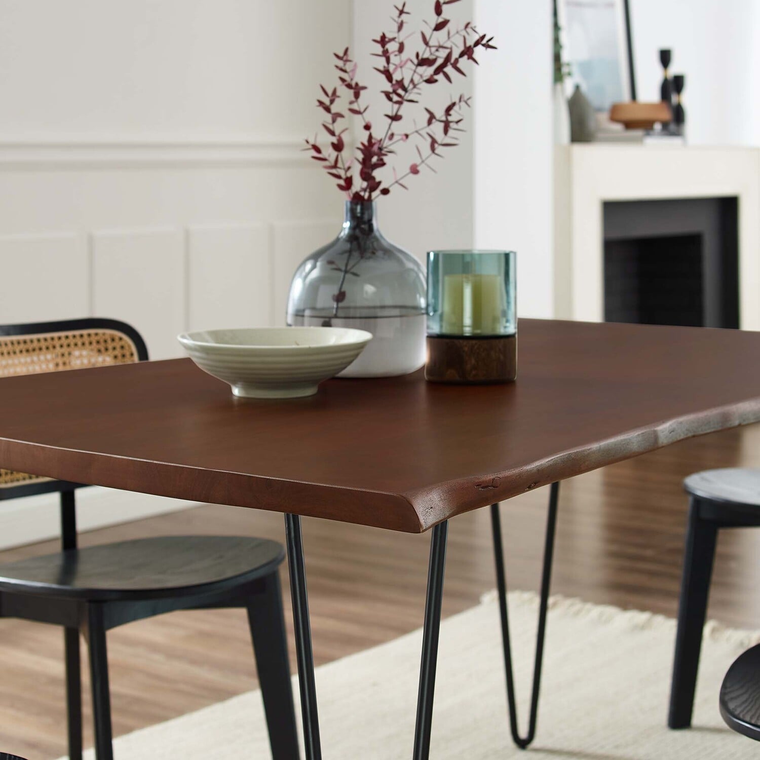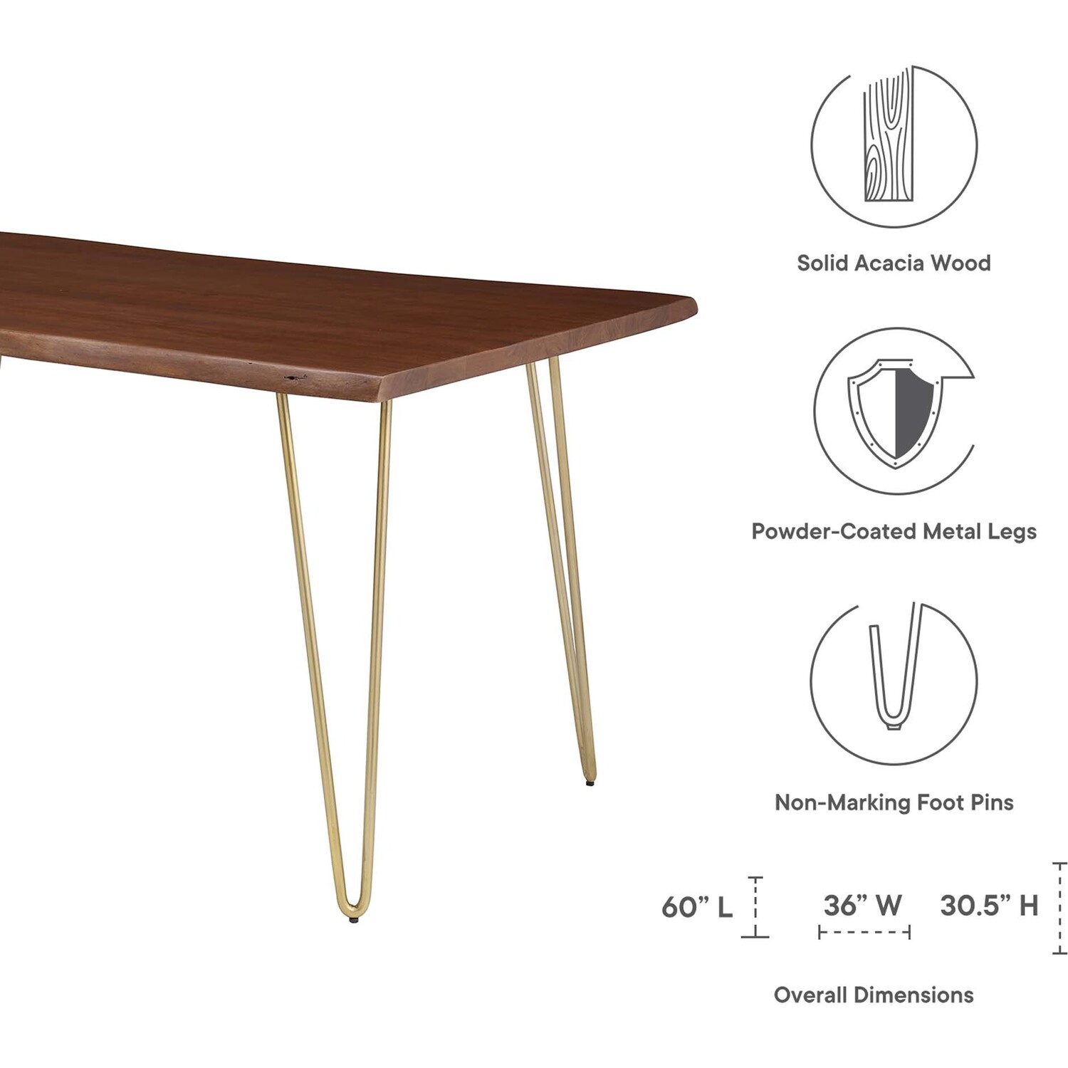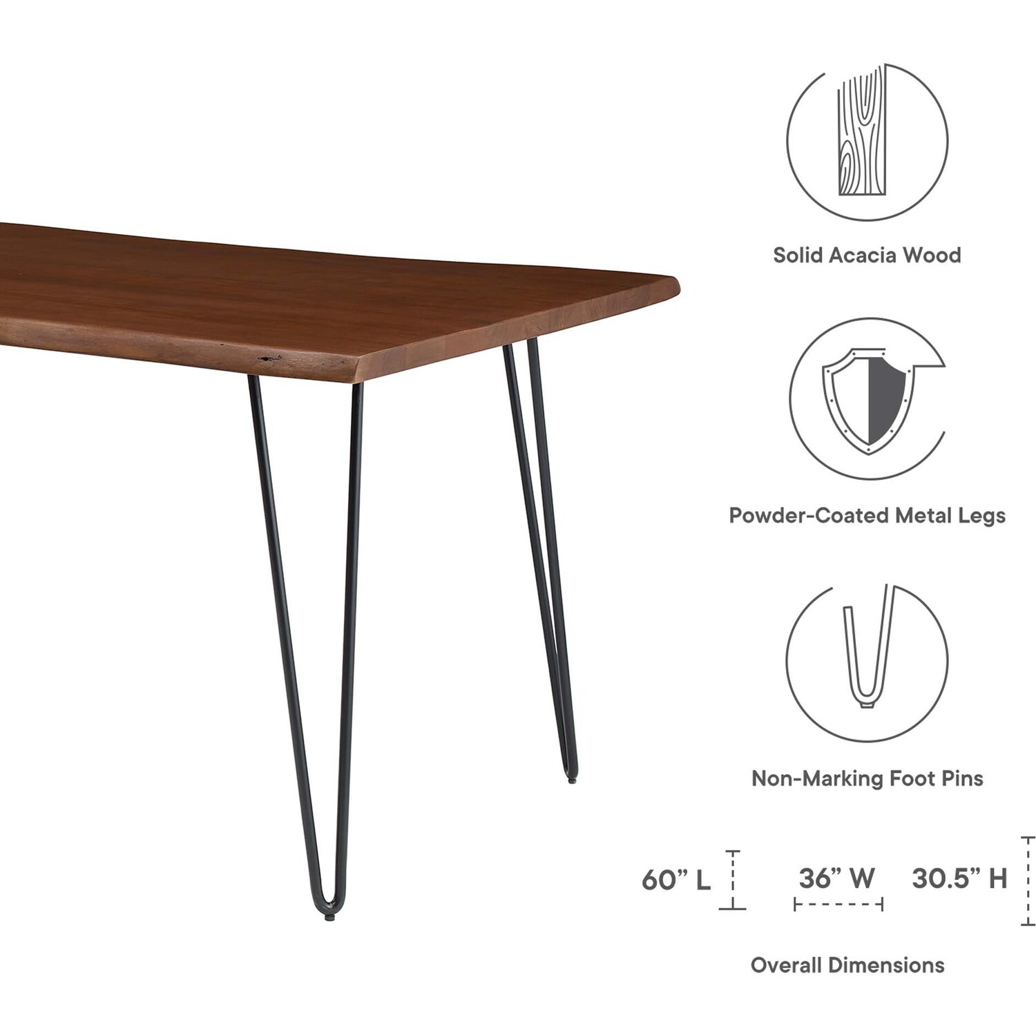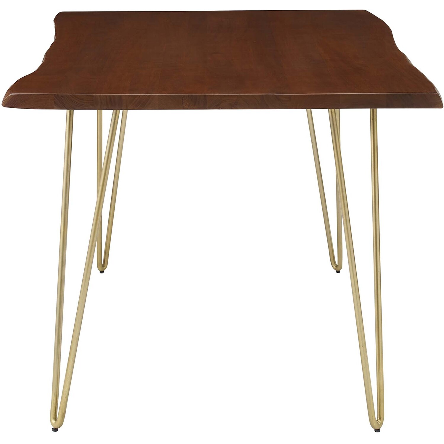 Sit amidst organic intrigue and retro style with the Ardor Rectangular Live Edge Dining Table. Featuring a one-of-a-kind raw edge tabletop crafted with a solid piece of acacia wood, this dining table is brimming with natural beauty. Comfortably accommodating six dining chairs, this 60" table rests on four powder-coated metal hairpin legs. This versatile dining table is ideal for everyday dining and entertaining and can also serve as a functional office desk. Due to the natural characteristics of the wood, each live edge table is unique. Includes non-marking foot pins to protect flooring. Assembly required.Live Edge Dining Table