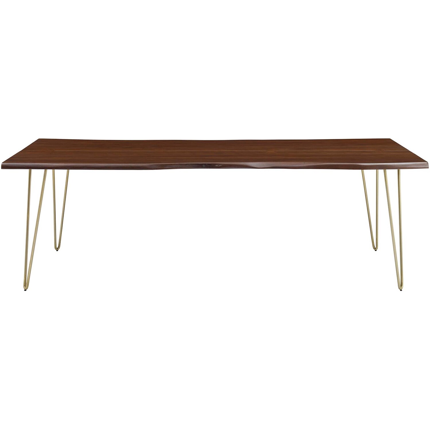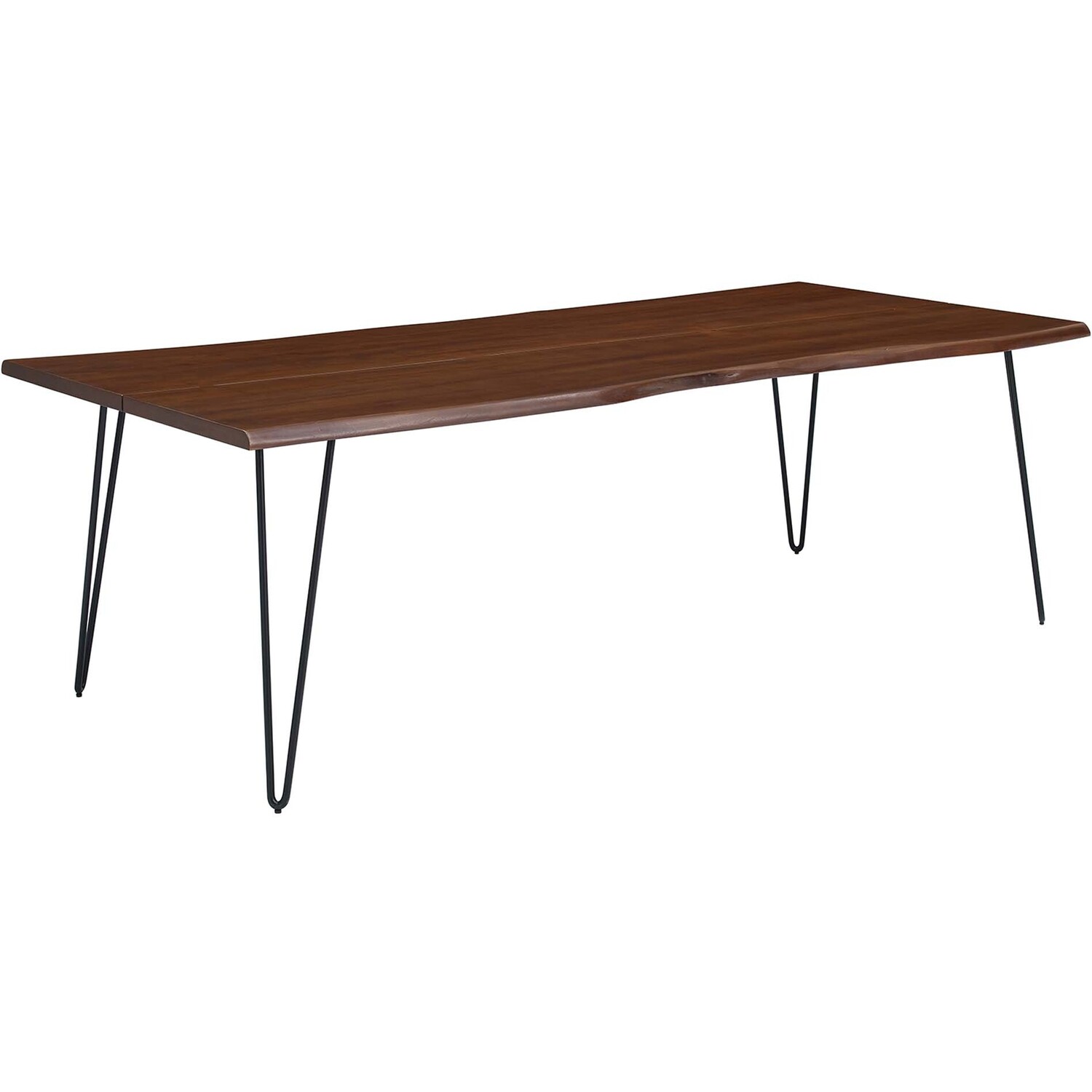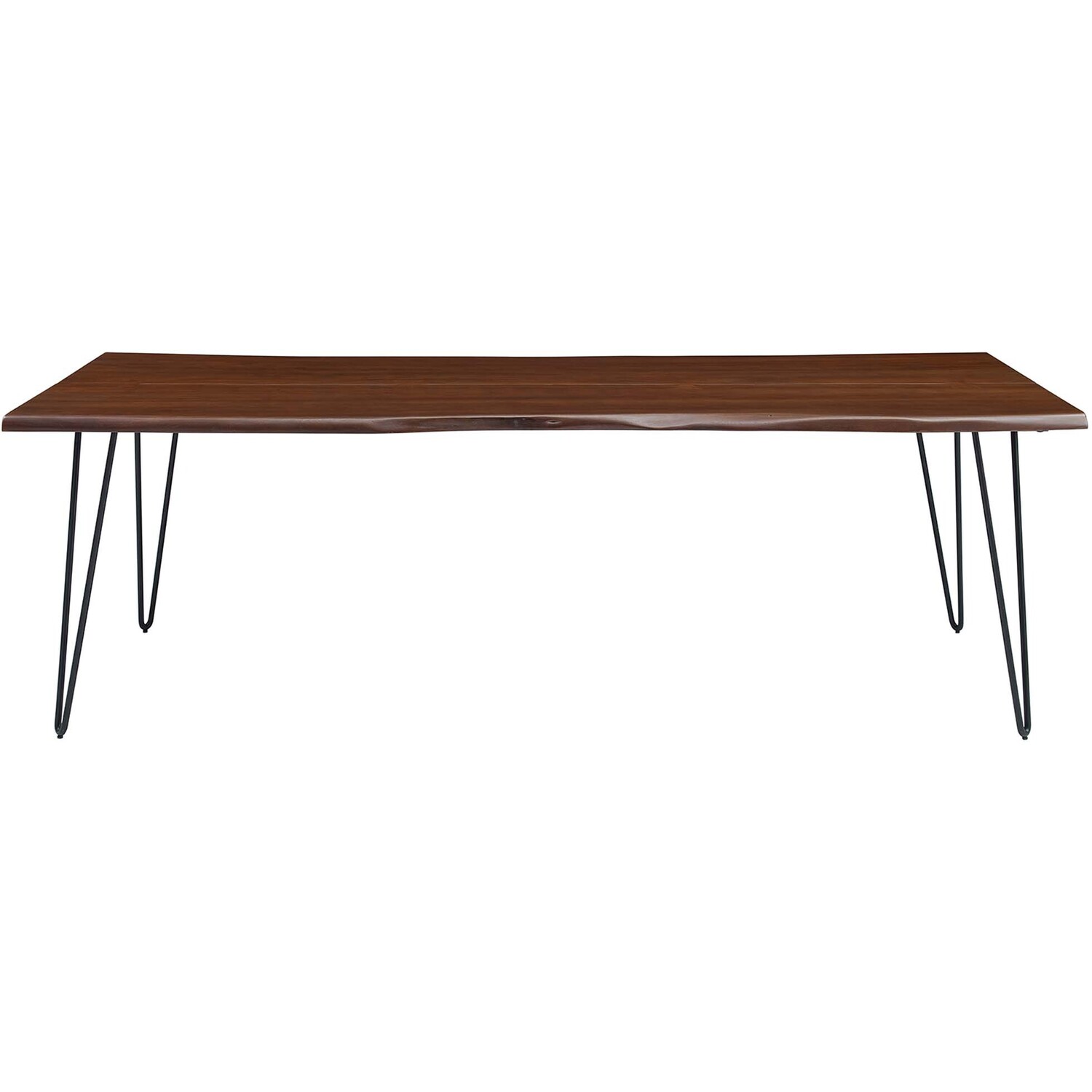 Incorporate organic intrigue to the dining space with the live wood edges of the Ardor Rectangular Dining Table. An eye-catching statement piece in the modern home or apartment, this one-of-a-kind dining table is crafted with solid planks of acacia wood joined together by butterfly joints. The live edge dining table rests on four powder-coated metal hairpin legs that bring mid-century aesthetics to dining room decor. Perfect for entertaining family and friends as well as everyday mealtimes, this spacious 96" dining table effortlessly accommodates ten dining chairs. Due to the natural characteristics of the wood, each live edge table is unique. Includes non-marking foot pins to protect flooring. Assembly required.Live Edge Dining Table