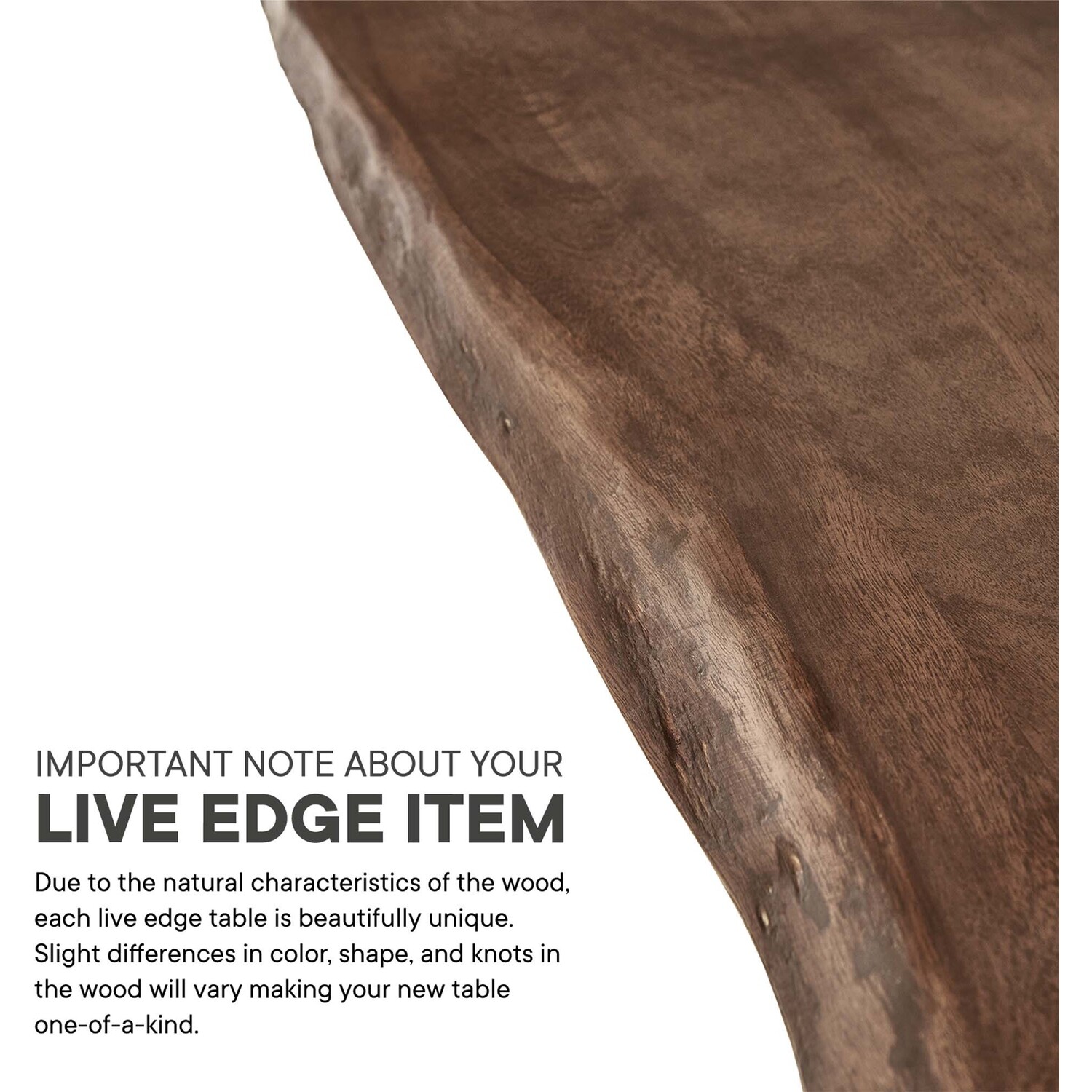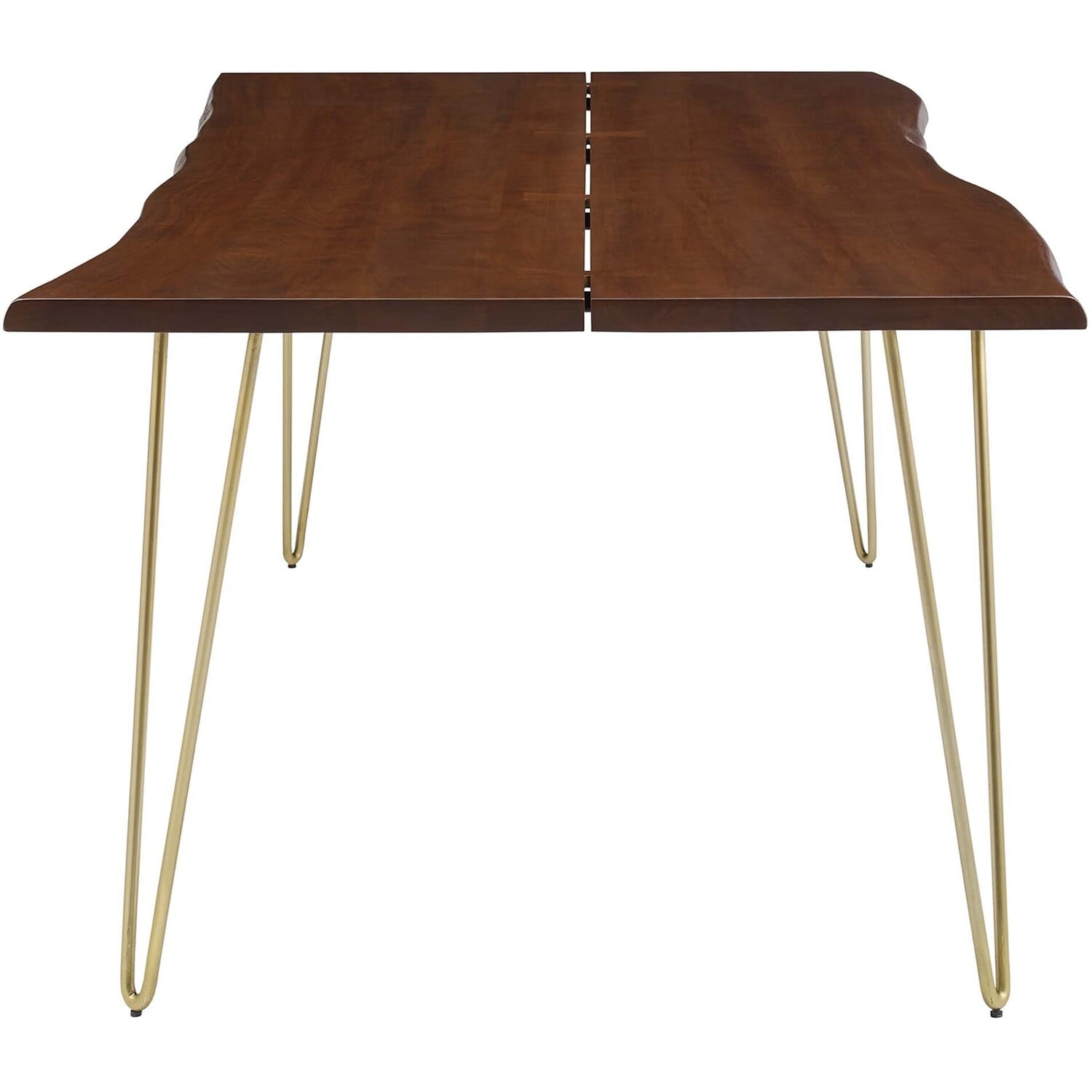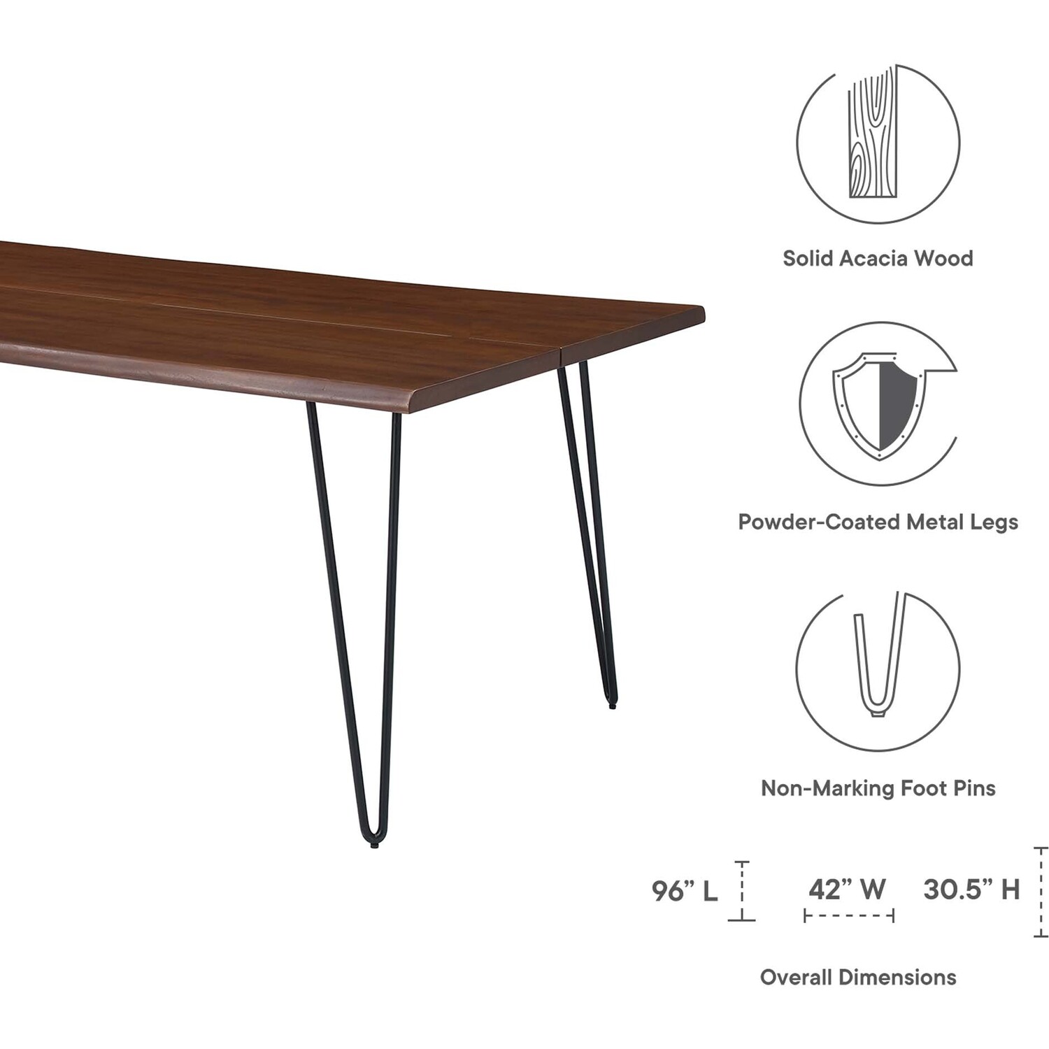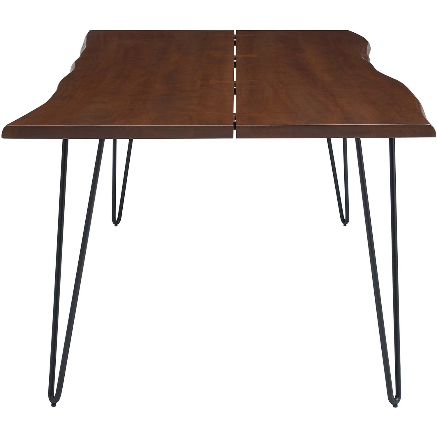 Incorporate organic intrigue to the dining space with the live wood edges of the Ardor Rectangular Dining Table. An eye-catching statement piece in the modern home or apartment, this one-of-a-kind dining table is crafted with solid planks of acacia wood joined together by butterfly joints. The live edge dining table rests on four powder-coated metal hairpin legs that bring mid-century aesthetics to dining room decor. Perfect for entertaining family and friends as well as everyday mealtimes, this spacious 96" dining table effortlessly accommodates ten dining chairs. Due to the natural characteristics of the wood, each live edge table is unique. Includes non-marking foot pins to protect flooring. Assembly required.Live Edge Dining Table
