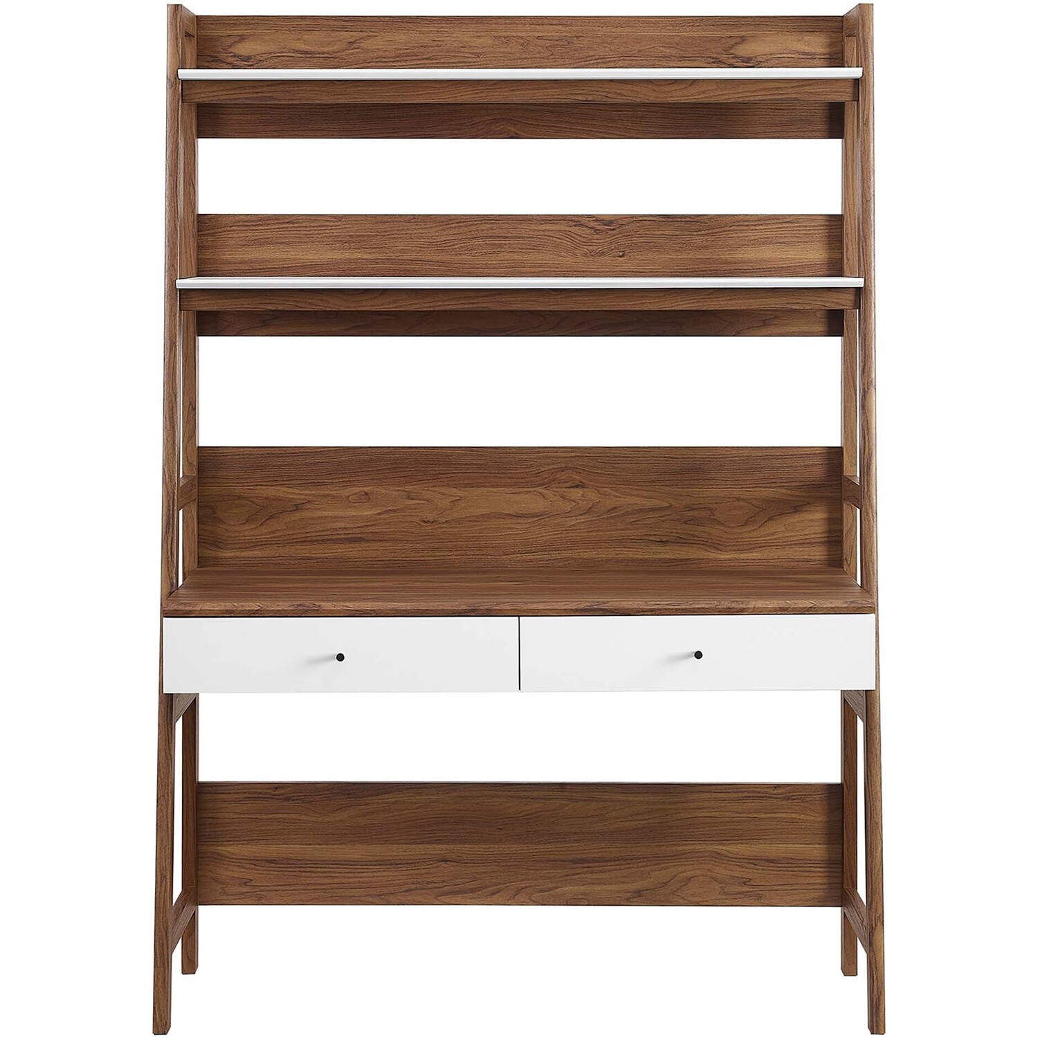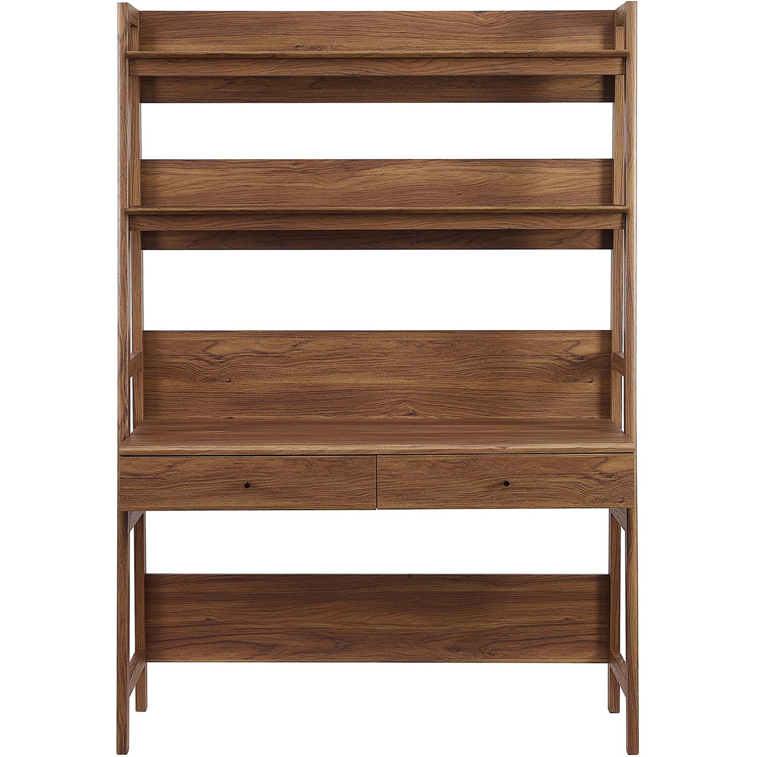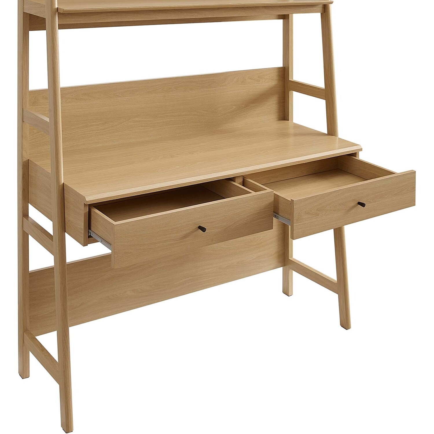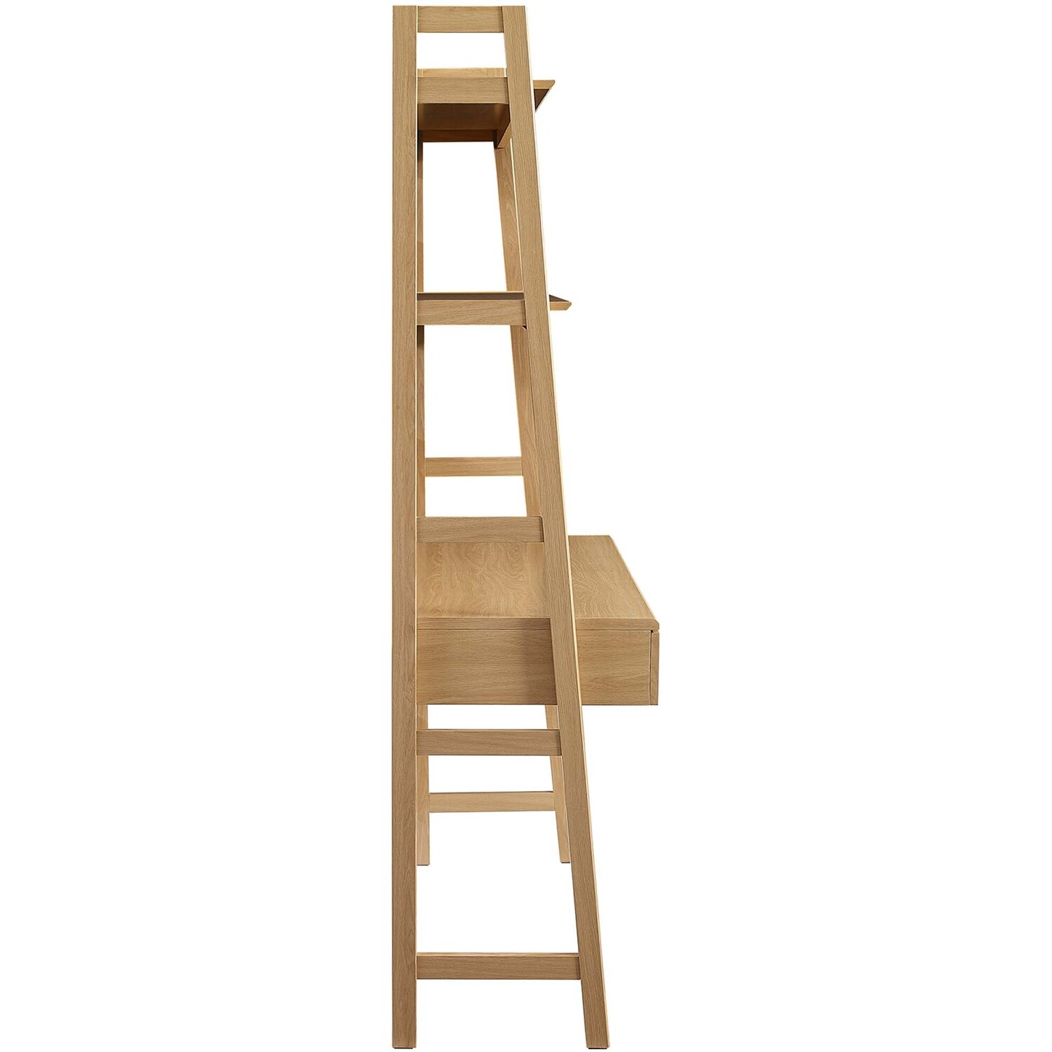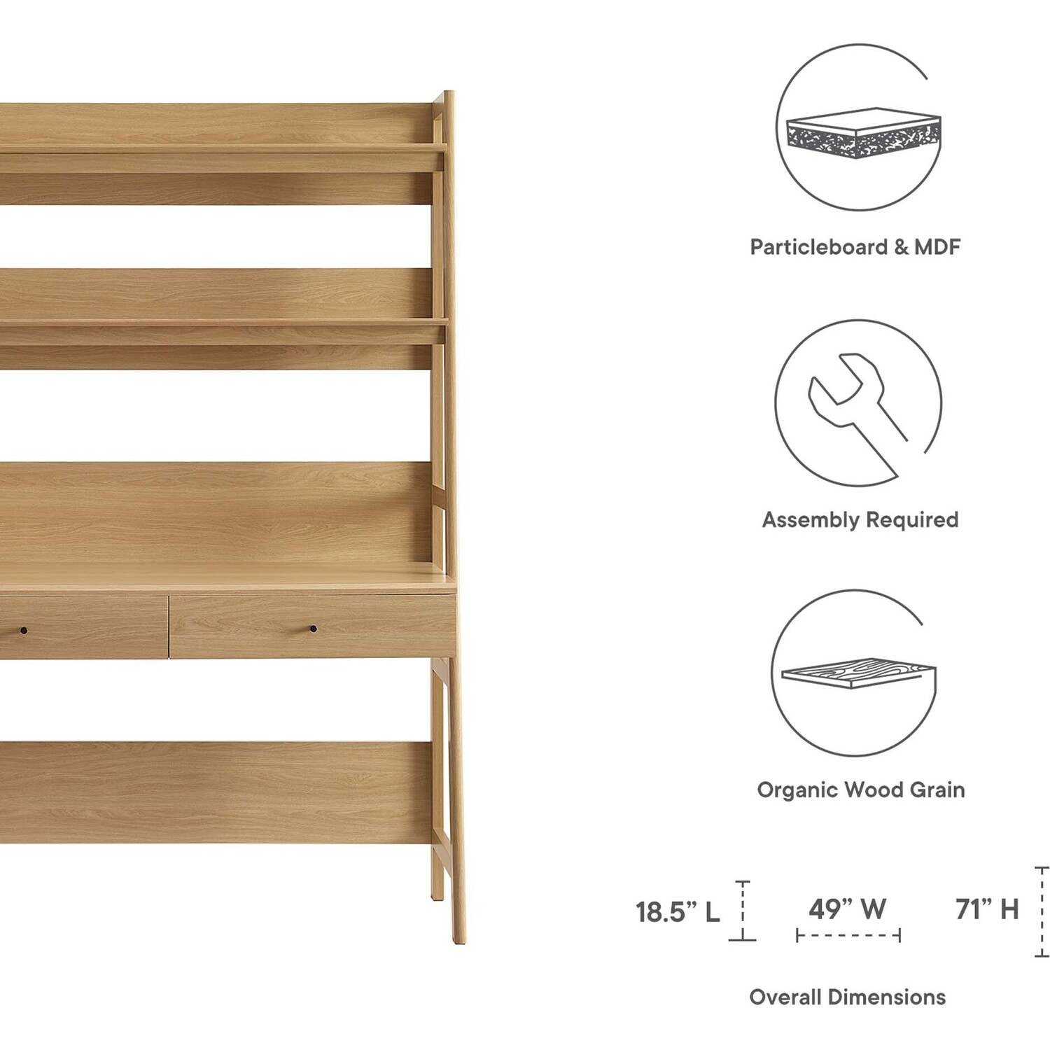 Let productivity take centerstage in your home office with the Bixby Office Desk. Stack your favorite reads and display home accessories on the stylish bookshelf while you focus on the task at hand while seated at the spacious desk. Featuring a slim, tiered silhouette, Bixby blends organic wood grain with the sleek lines of the shelves to create beautiful contrast. With plenty of room for storage and display, this bookshelf is complete with spacious shelves and two pull-out desk drawers. This computer desk is crafted with particleboard and MDF for a sturdy construction that's built to last.Tiered Desk and Bookshelf