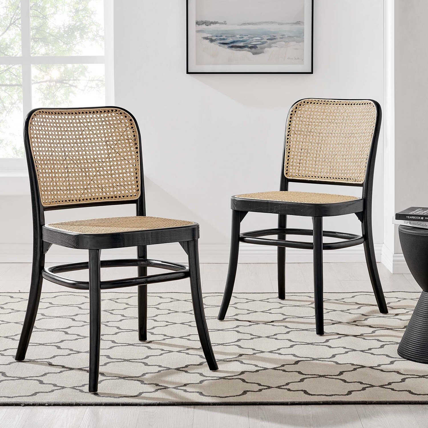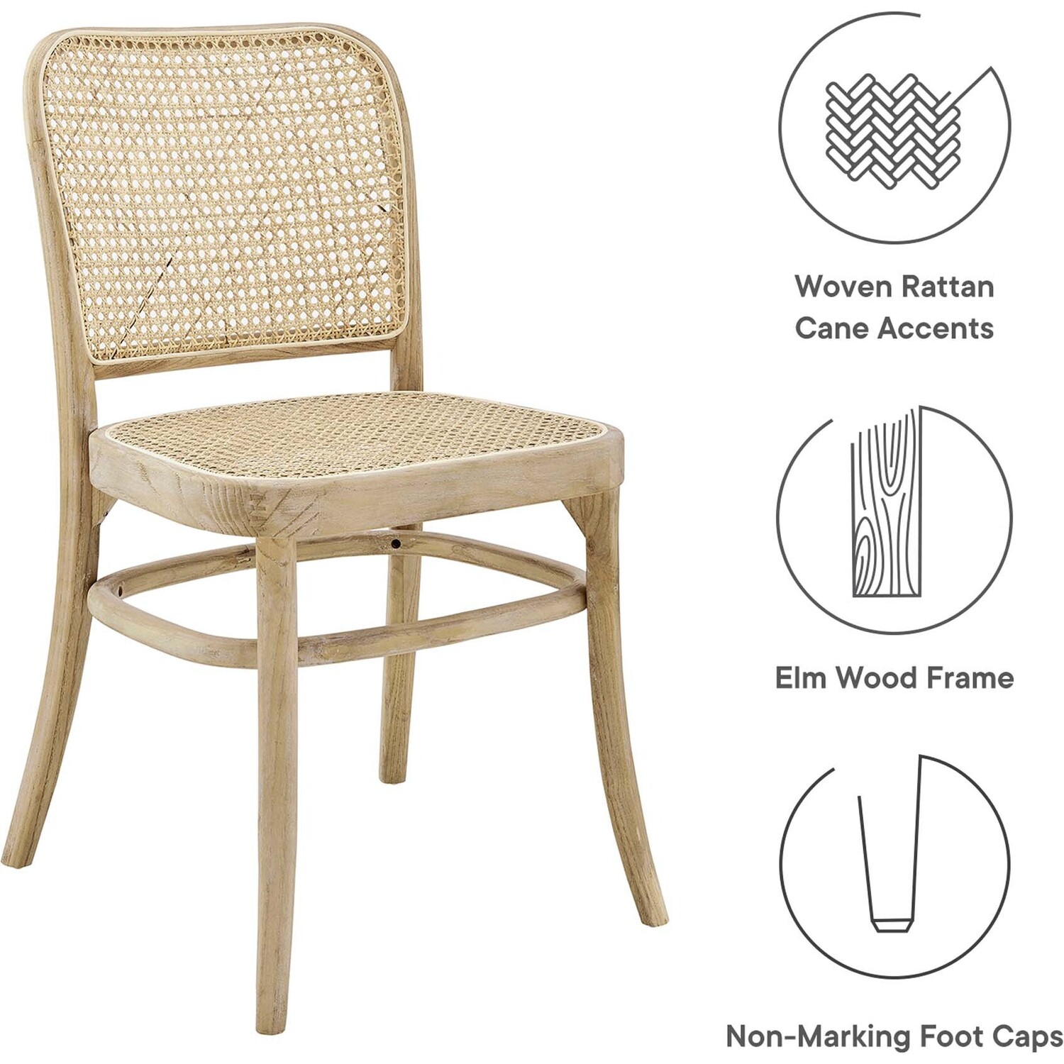 Blend rustic farmhouse charm and coastal serenity in your dining space with the Winona Dining Side Chair Set. Featuring a woven rattan cane backrest and seat, this dining chair set instills vintage modernity around your dining table or as accent chairs in your living space. This dining side chair set is complete with a durable elm wood frame with rounded edges and a stretcher for added interest. Includes non-marking foot caps. Weight Capacity: 330 lbs.Modern Farmhouse Dining Side Chair Set