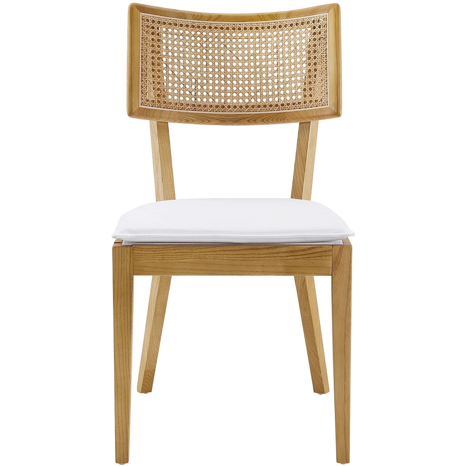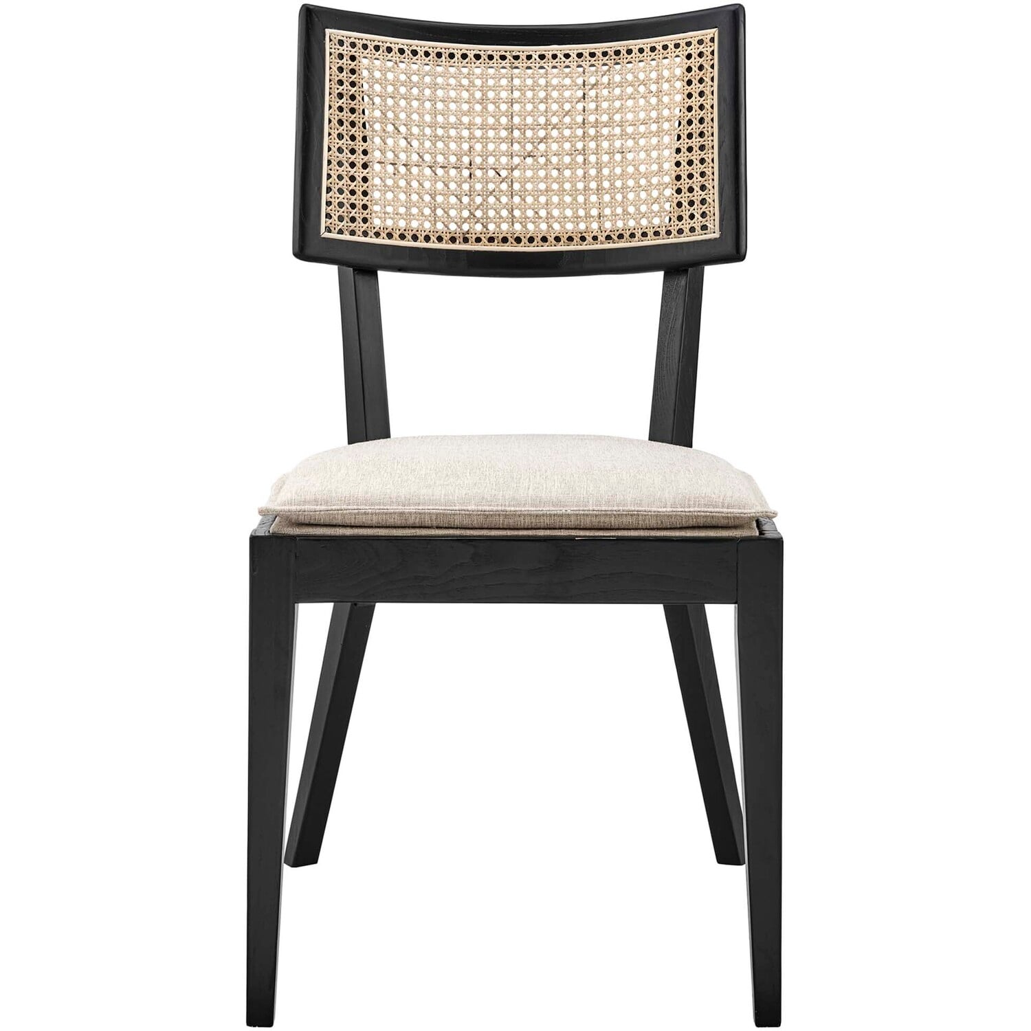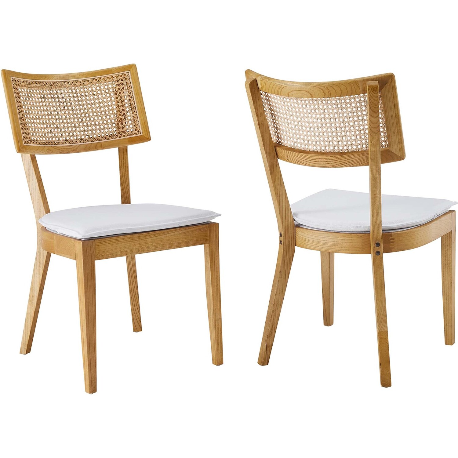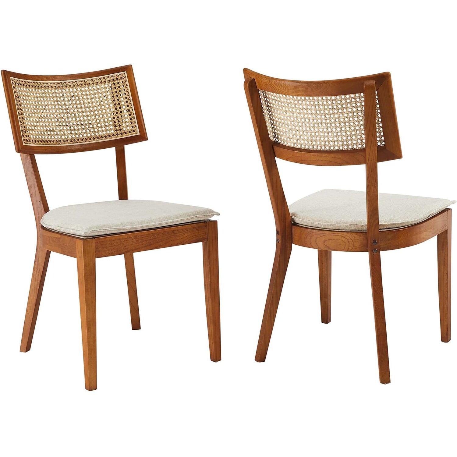 Charming cottage style blends with farmhouse whimsy on the Caledonia Wood Dining Chair Set of Two. Serving as an accent chair or a kitchen chair, this pair adds a touch of retro elegance to the dining or living room. Featuring a curved backrest and airy design thanks to its open weave rattan detail, this dining chair set is crafted with solid elm wood and boasts upholstered seats with foam padding for comfort and support. The fabric seat covers, featuring a hidden zipper for easy removal, are elegantly accentuated with a French seam, adding a refined detail that echoes the artistic vibe of boho dining chairs. A versatile addition to the modern home, these wood chairs make a statement in the dining room or as accent chairs in the living room, office, entryway, or other seating area. Whether you're looking for a dining chair set for your home bistro or a simple chair to complete your dining area, the Caledonia collection has a unique aesthetic that fuses classic comfort with sleek, modern lines. This set includes two elm wood and rattan dining chairs, with non-marking foot caps to protect floors. Assembly required. Weight Capacity: 330 lbs.Modern Farmhouse Dining Chairs - Set of 2