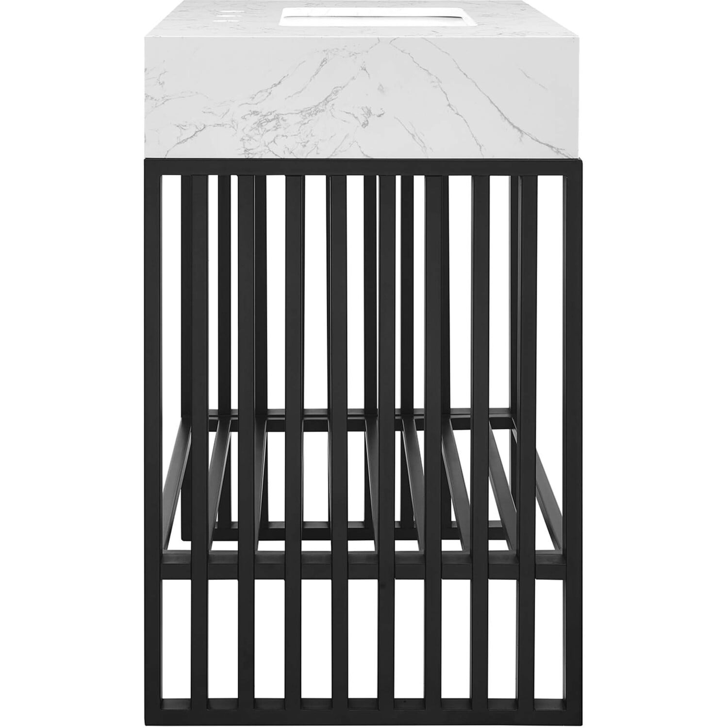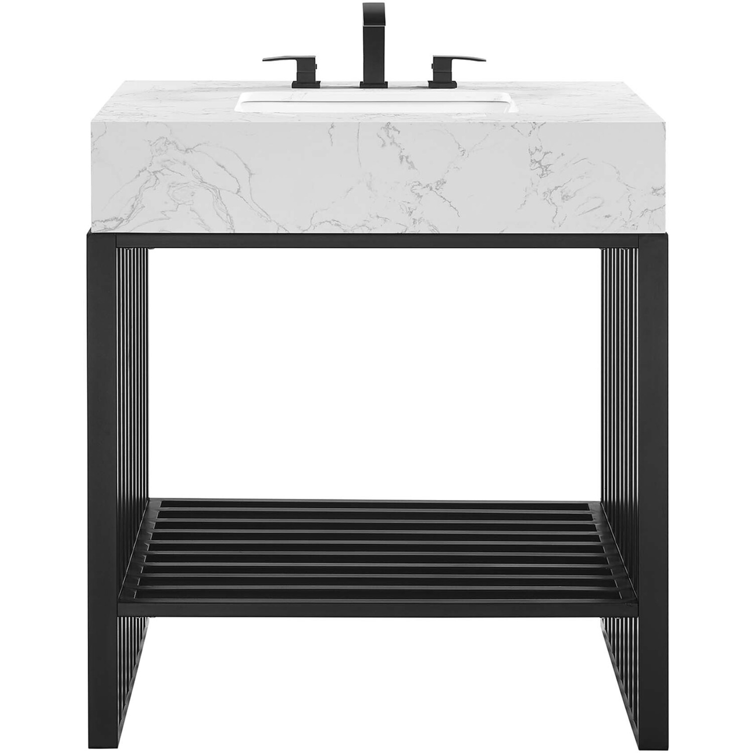 Introduce stark modernity to your bathroom space with the straight lines, matte detail, and angular profile of the Gridiron 30" Bathroom Vanity. Crafted with durable stainless steel, this open-concept vanity offers ample storage space underneath for towels, bathroom essentials, and more. This bathroom vanity features an artificial marble sink with an integrated countertop and 8" centerset faucet holes. A striking addition to the bathroom, this sink vanity rests on adjustable non-marking foot pads to protect flooring. Assembly required. Sink fixtures not included.Modern Bathroom Vanity