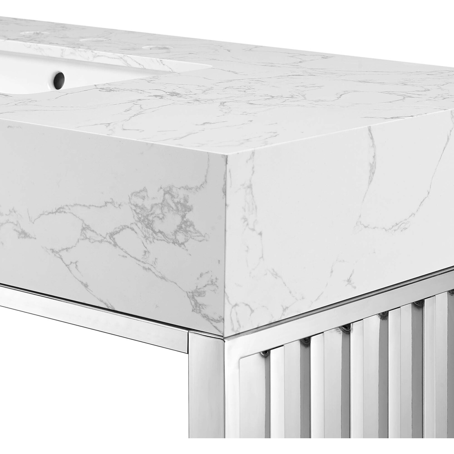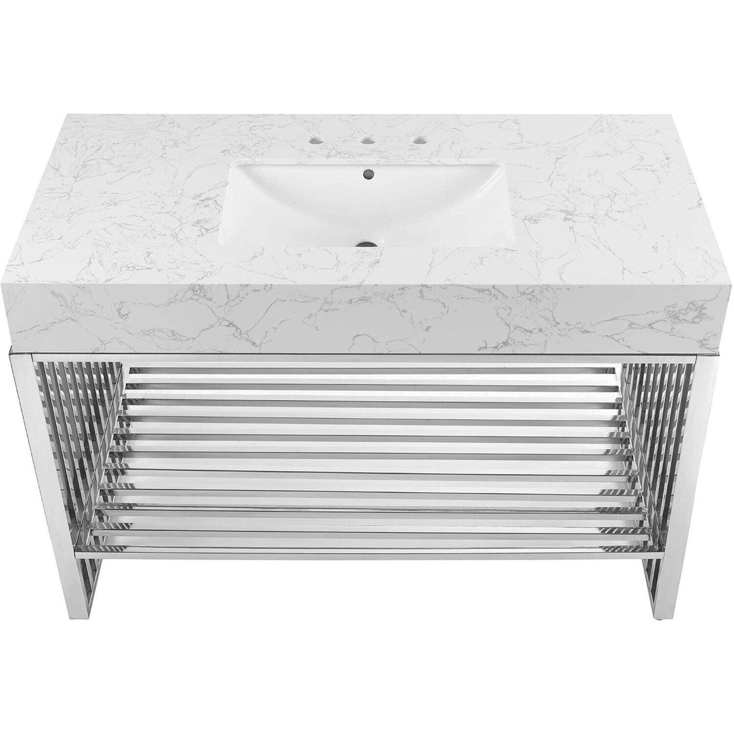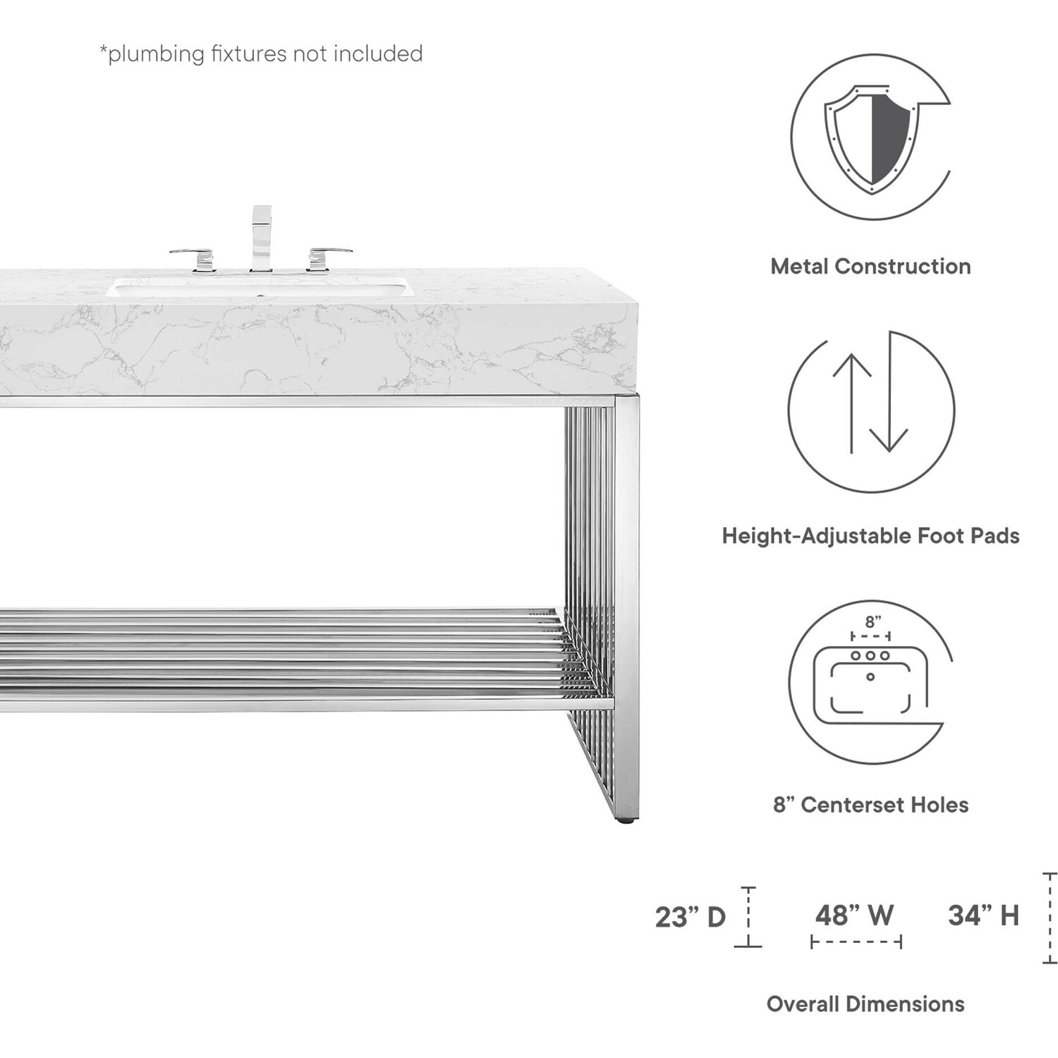 Introduce stark modernity to your bathroom space with the straight lines, polished detail, and angular profile of the Gridiron 48" Bathroom Vanity. Crafted with durable stainless steel, this open-concept vanity offers ample storage space underneath for towels, bathroom essentials, and more. This bathroom vanity features an artificial marble sink with an integrated countertop and 8" centerset faucet holes. A striking addition to the bathroom, this sink vanity rests on adjustable non-marking foot pads to protect flooring. Assembly required. Sink fixtures not included.Modern Bathroom Vanity