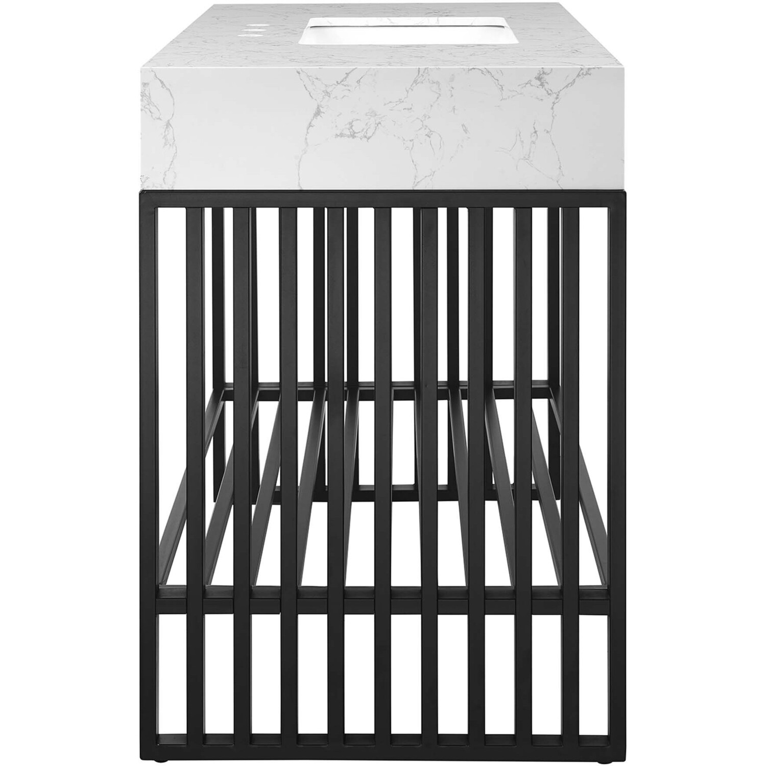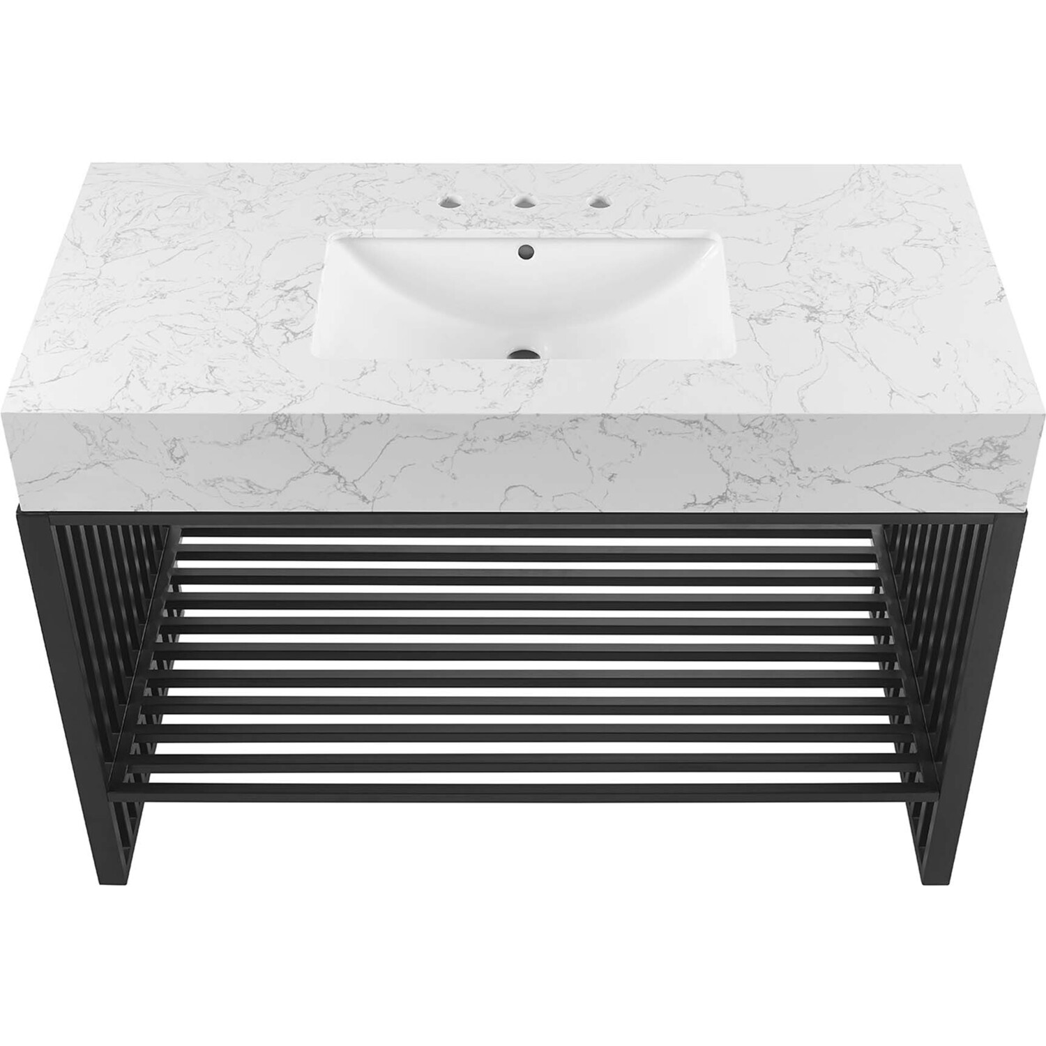 Introduce stark modernity to your bathroom space with the straight lines, matte detail, and angular profile of the Gridiron 48" Bathroom Vanity. Crafted with durable stainless steel, this open-concept vanity offers ample storage space underneath for towels, bathroom essentials, and more. This bathroom vanity features an artificial marble sink with an integrated countertop and 8" centerset faucet holes. A striking addition to the bathroom, this sink vanity rests on adjustable non-marking foot pads to protect flooring. Assembly required. Sink fixtures not included.Modern Bathroom Vanity