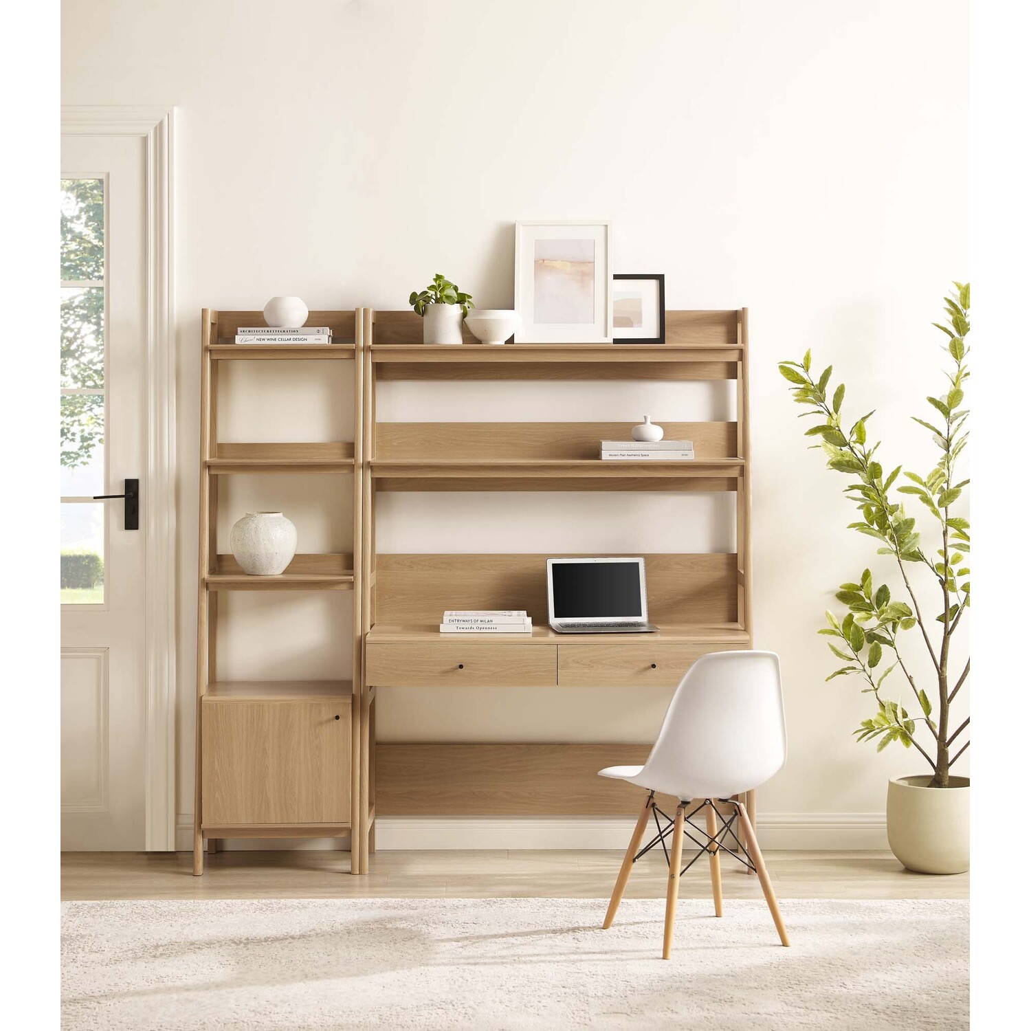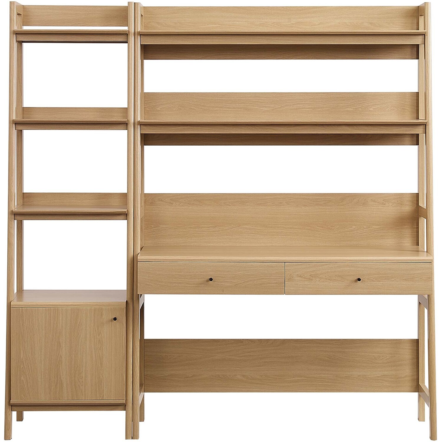 Let productivity take centerstage in your home office with the Bixby Collection. Stack your favorite reads and display home accessories on the stylish bookshelf while you focus on the task at hand seated at the spacious desk. Featuring a slim, tiered silhouette, the Bixby Office Collection blends organic wood grain with the sleek lines of the shelves to create beautiful contrast. With plenty of room for storage and display, this bookshelf is complete with three spacious shelves and a concealed storage area on the bottom. The desk boasts three shelves and two pull-out drawers. This set is crafted with particleboard and MDF for a sturdy construction that's built to last.Tiered Desk and Bookshelf