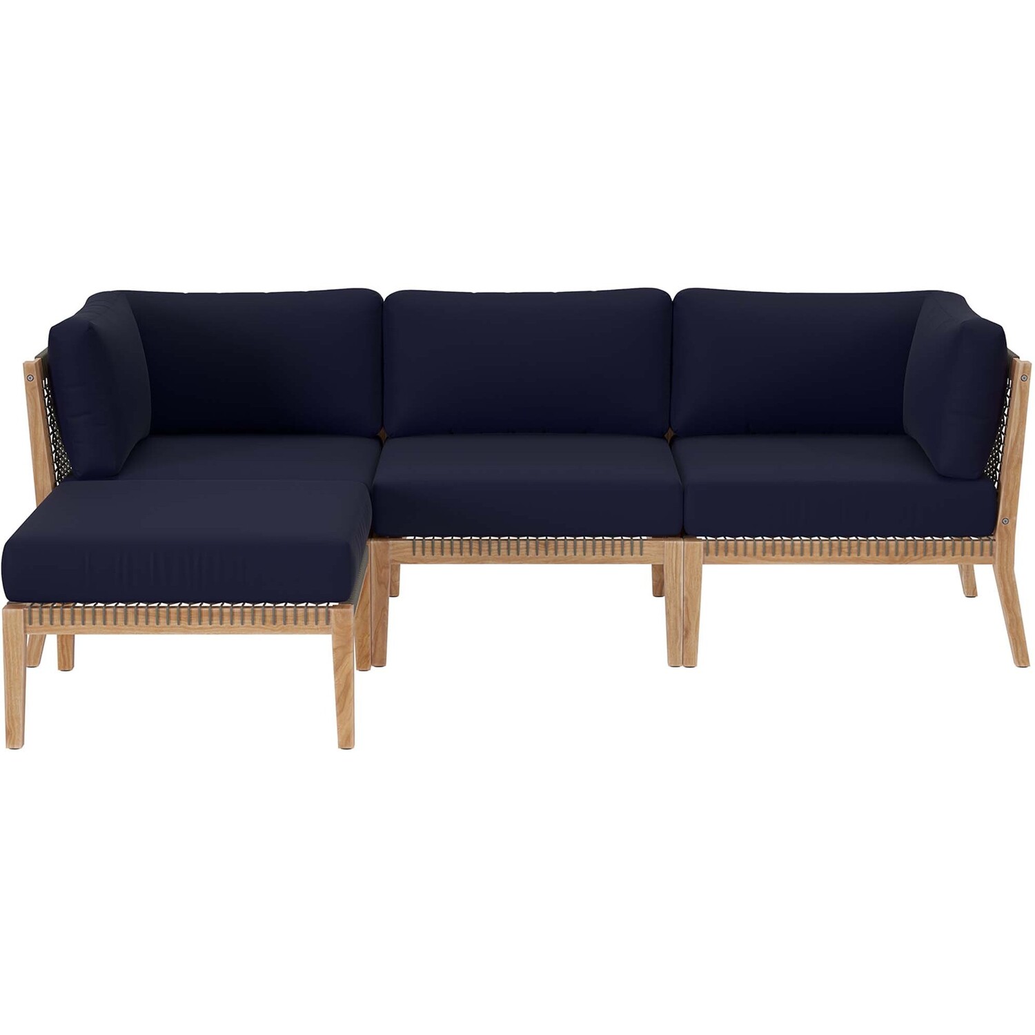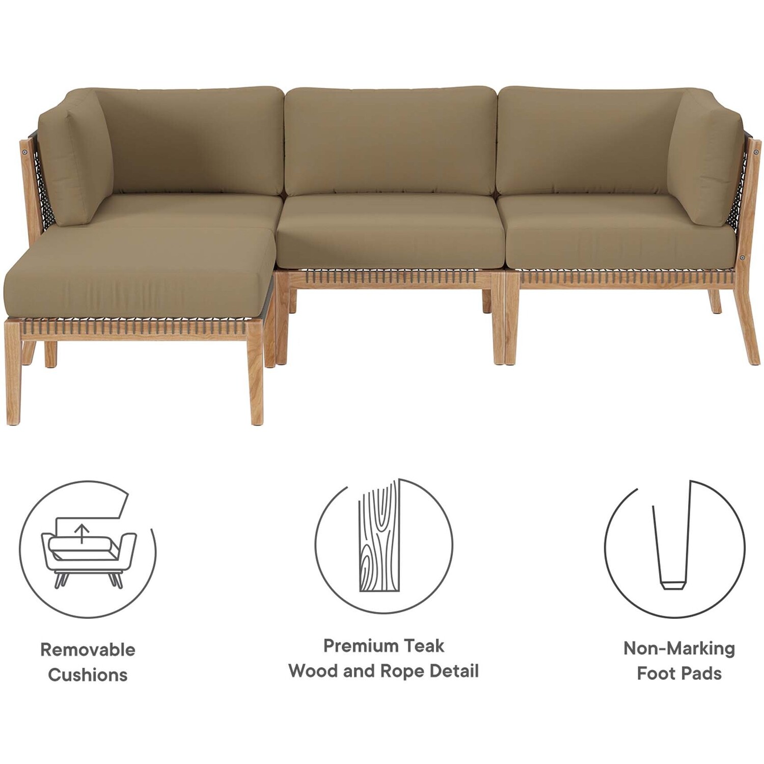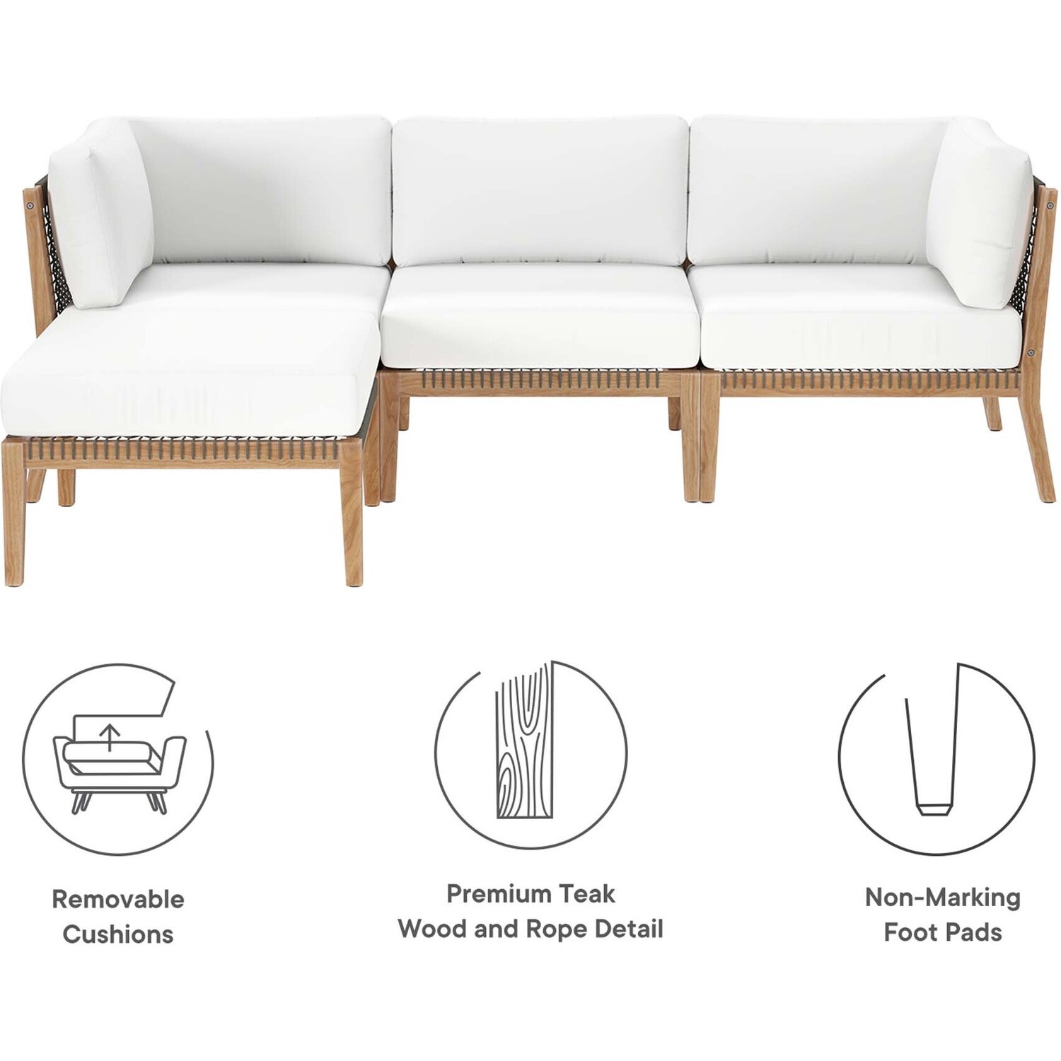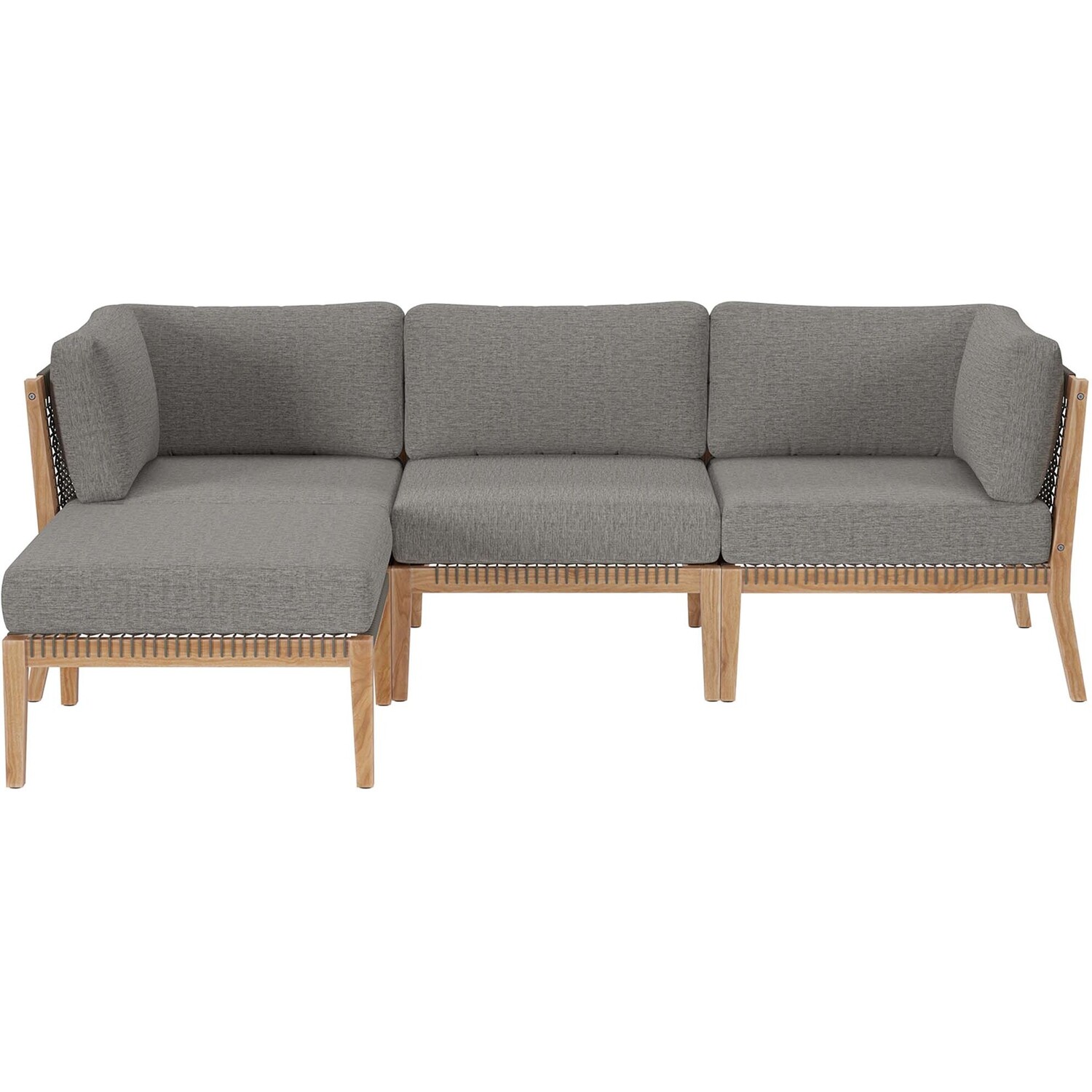 Bask in warm weather as you lounge on the Clearwater Outdoor Patio Furniture Collection. Bringing contemporary aesthetics to a backyard, porch, patio, deck, or poolside, this outdoor sectional sofa features woven rope webbing underneath the foam padded cushions that grants breezy, coastal charm. Rest and relax amidst comfortable cushions with removable all-weather covers for easy cleaning. The base of this patio set is crafted with grade A premium teak wood that boasts a beautiful, rich wood grain and is naturally weather-resistant. Includes non-marking foot glides to protect flooring. Each Seat Weight Capacity: 498 lbs.Outdoor Patio 4-Piece Sectional Sofa
