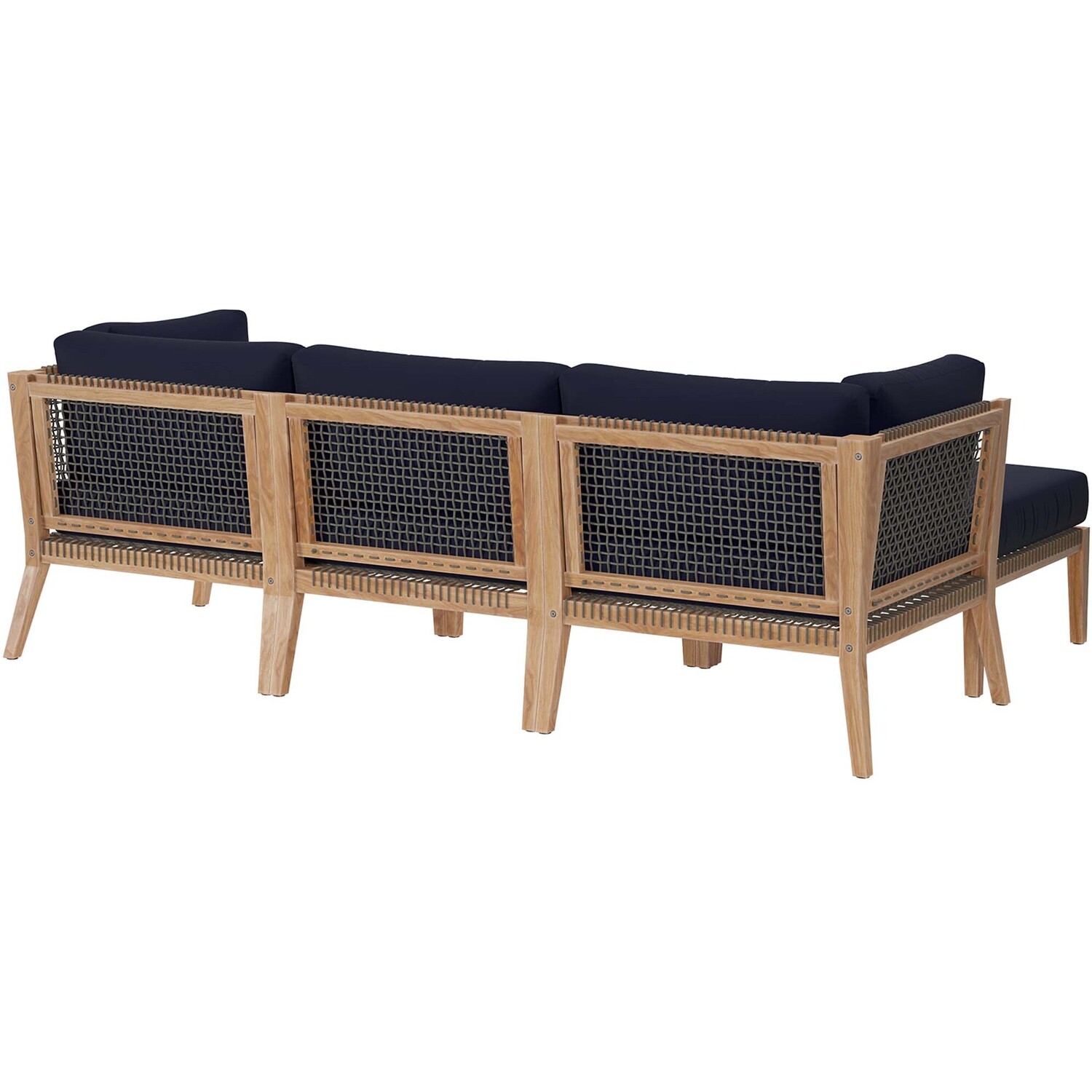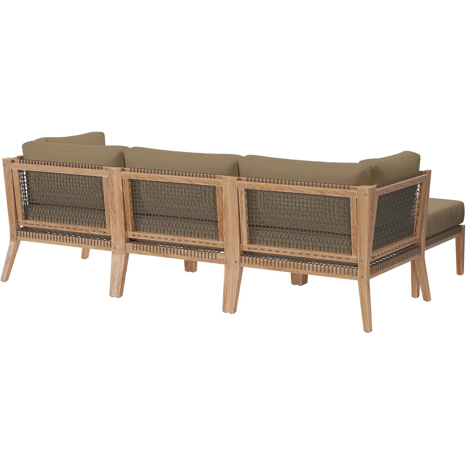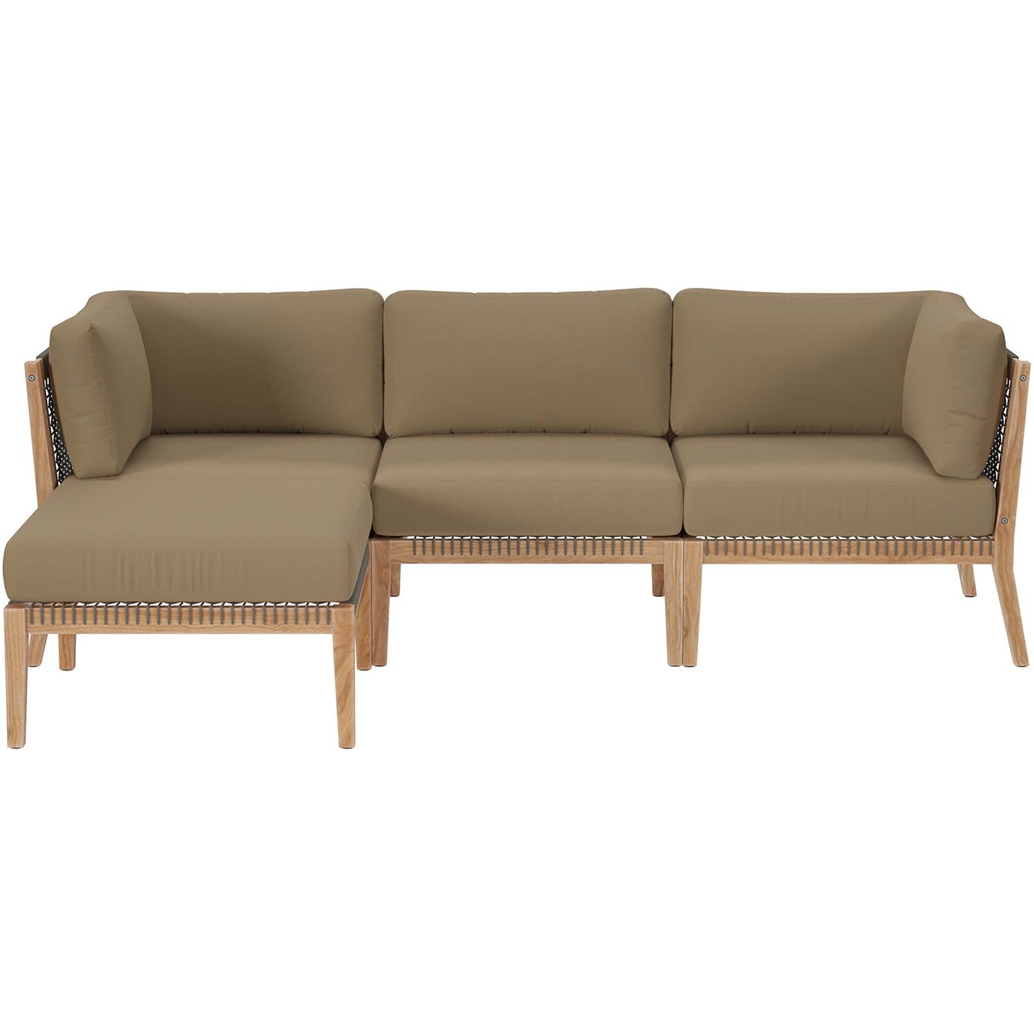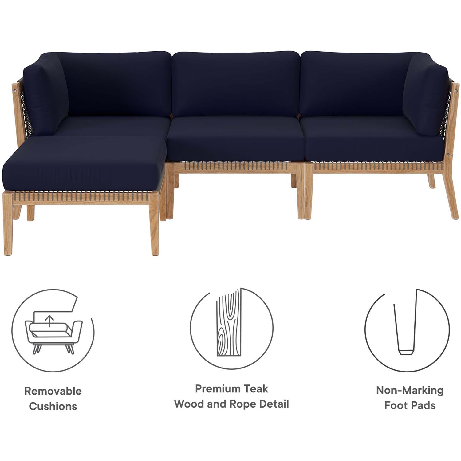 Bask in warm weather as you lounge on the Clearwater Outdoor Patio Furniture Collection. Bringing contemporary aesthetics to a backyard, porch, patio, deck, or poolside, this outdoor sectional sofa features woven rope webbing underneath the foam padded cushions that grants breezy, coastal charm. Rest and relax amidst comfortable cushions with removable all-weather covers for easy cleaning. The base of this patio set is crafted with grade A premium teak wood that boasts a beautiful, rich wood grain and is naturally weather-resistant. Includes non-marking foot glides to protect flooring. Each Seat Weight Capacity: 498 lbs.Outdoor Patio 4-Piece Sectional Sofa