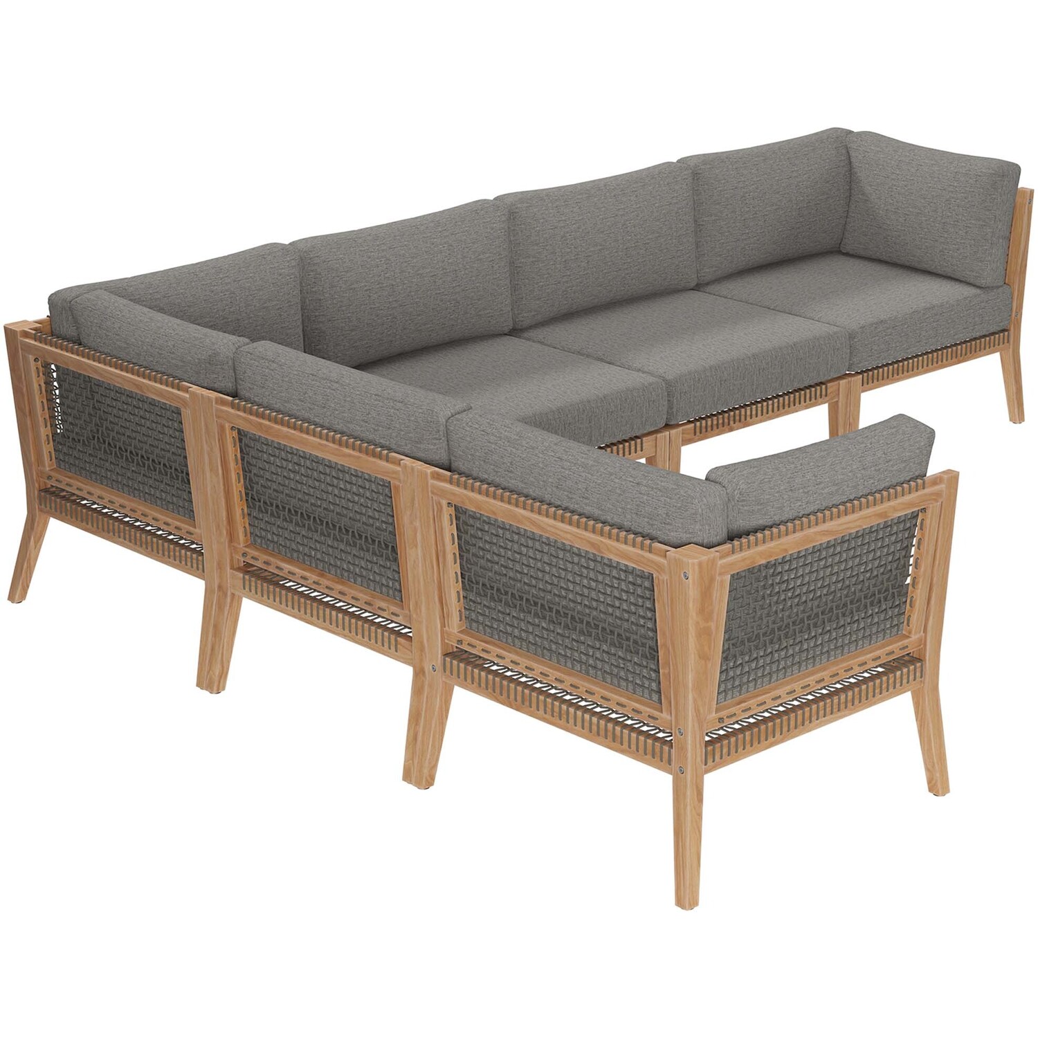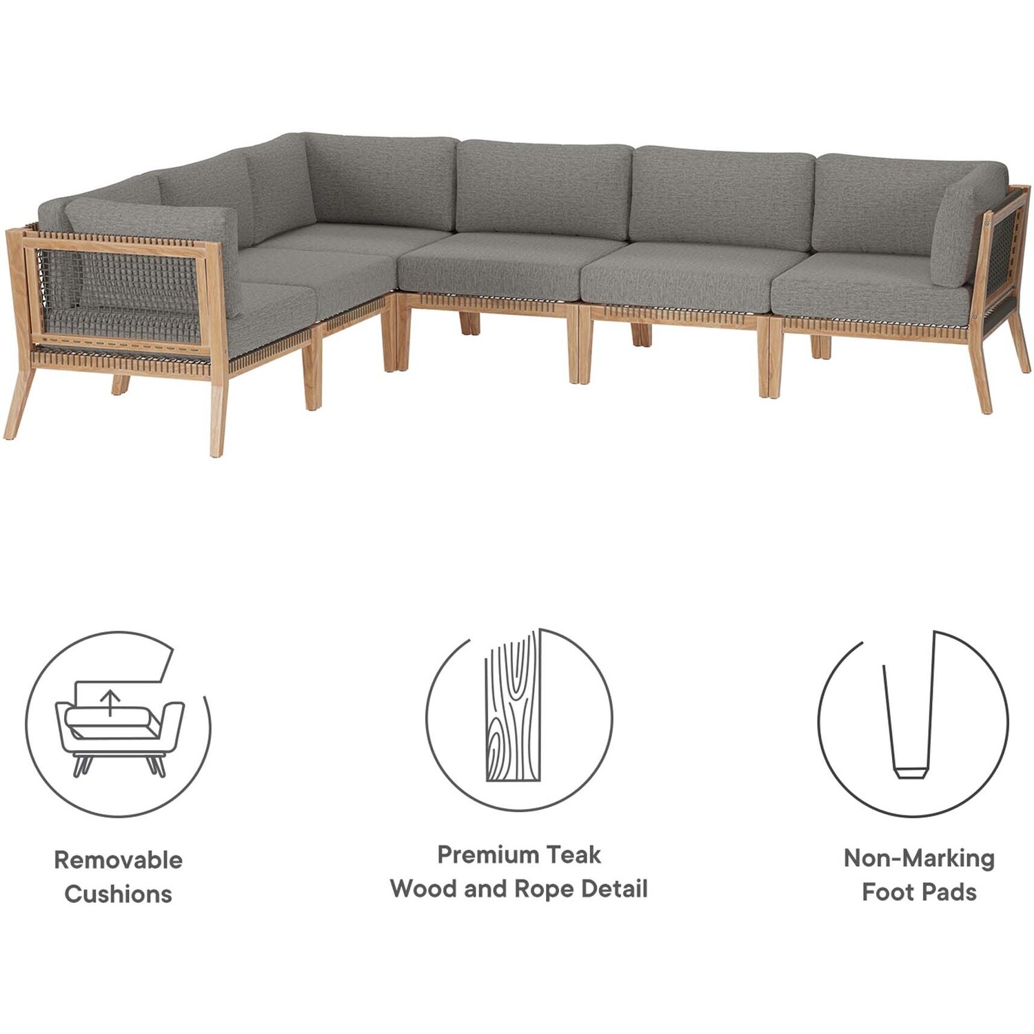 Bask in warm weather as you lounge on the Clearwater Outdoor Patio Furniture Collection. Bringing contemporary aesthetics to a backyard, porch, patio, deck, or poolside, this outdoor sectional sofa features woven rope webbing underneath the foam padded cushions that grants breezy, coastal charm. Rest and relax amidst comfortable cushions with removable all-weather covers for easy cleaning. The base of this patio set is crafted with grade A premium teak wood that boasts a beautiful, rich wood grain and is naturally weather-resistant. Includes non-marking foot glides to protect flooring. Each Seat Weight Capacity: 498 lbs.Outdoor Patio 6-Piece Sectional Sofa