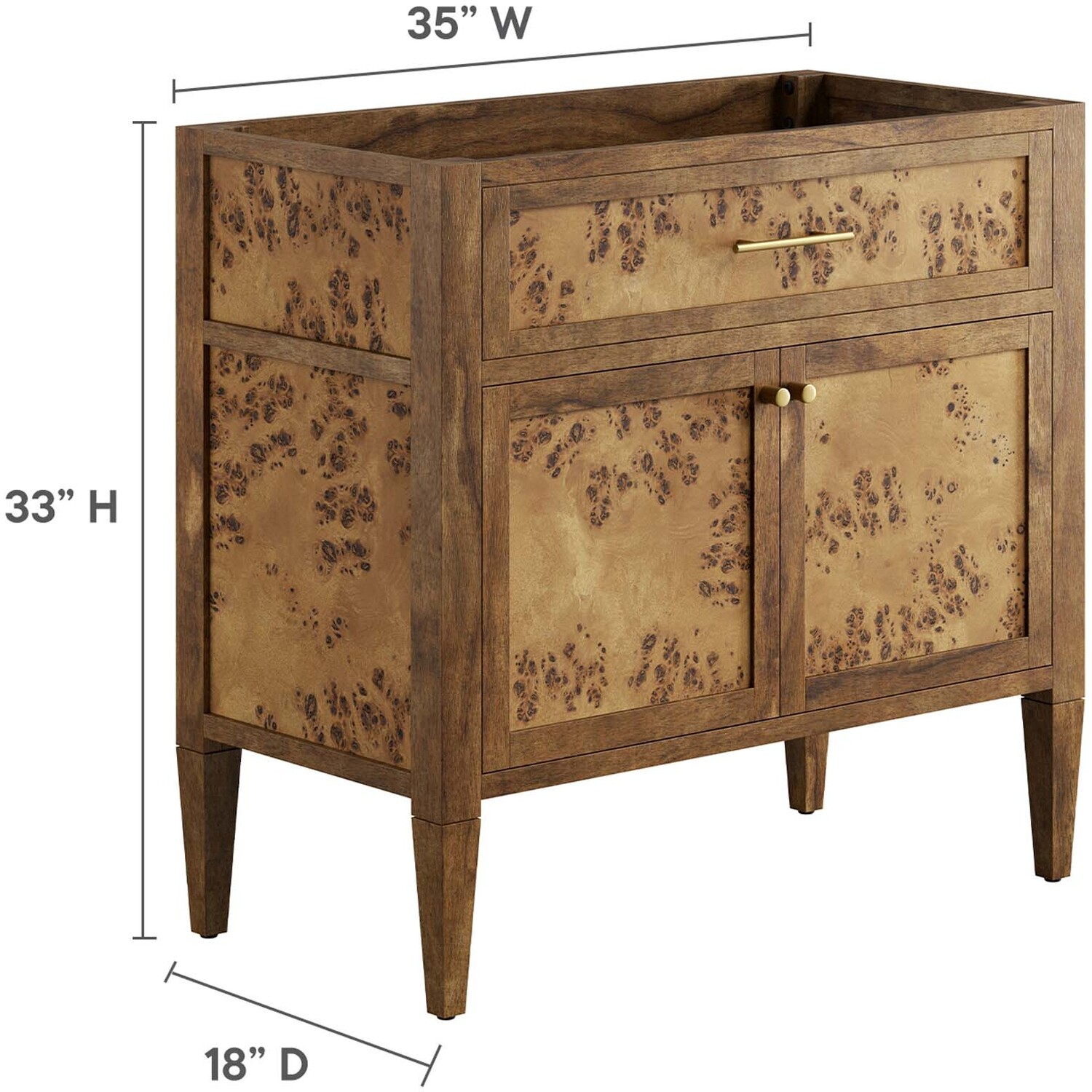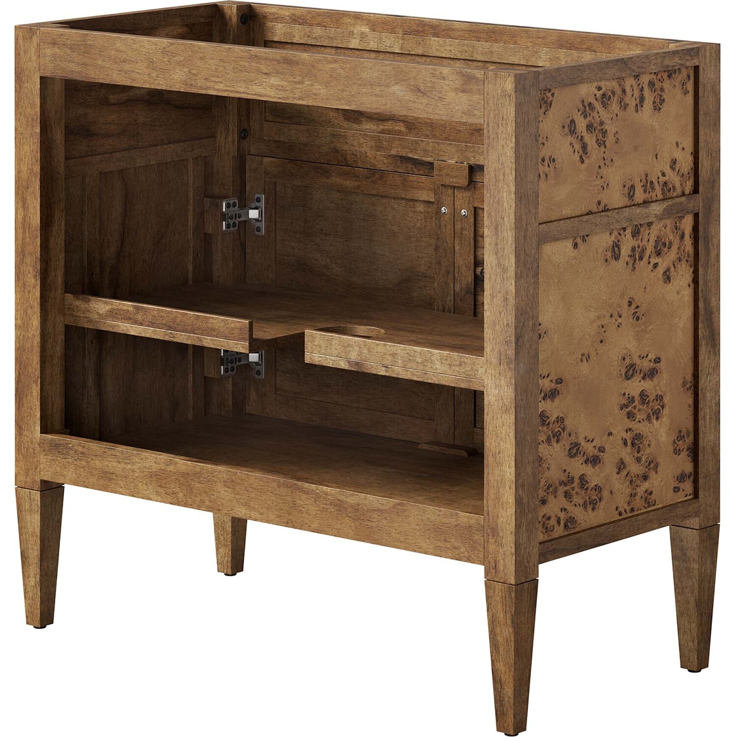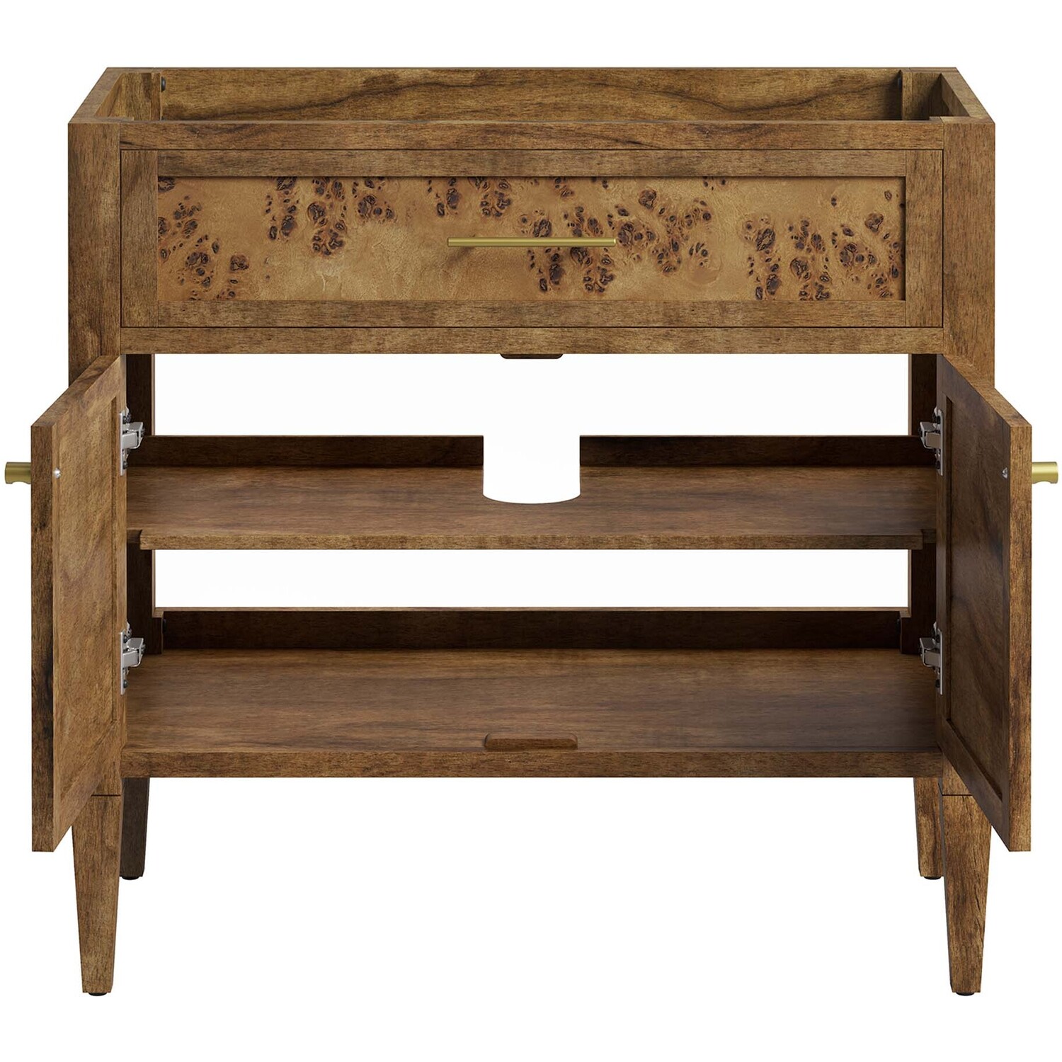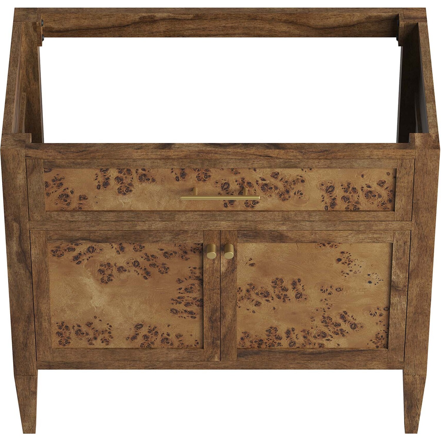 Discover the epitome of organic aesthetics and practicality with the Elysian 36" Burl Wood Bathroom Vanity Cabinet. Each vanity cabinet is uniquely crafted from exquisite mango wood, further adorned with a rich burl wood veneer, radiating a distinctive charm and character. A fixed top drawer and tapered wood legs add to the sleek design, while the spacious shelving–complete with a convenient plumbing cutout–offers ample storage space for all your bathroom essentials. While assembly is required, this vanity includes easy-to-follow assembly instructions. Sink basin and fixtures not included.Modern Bathroom Vanity