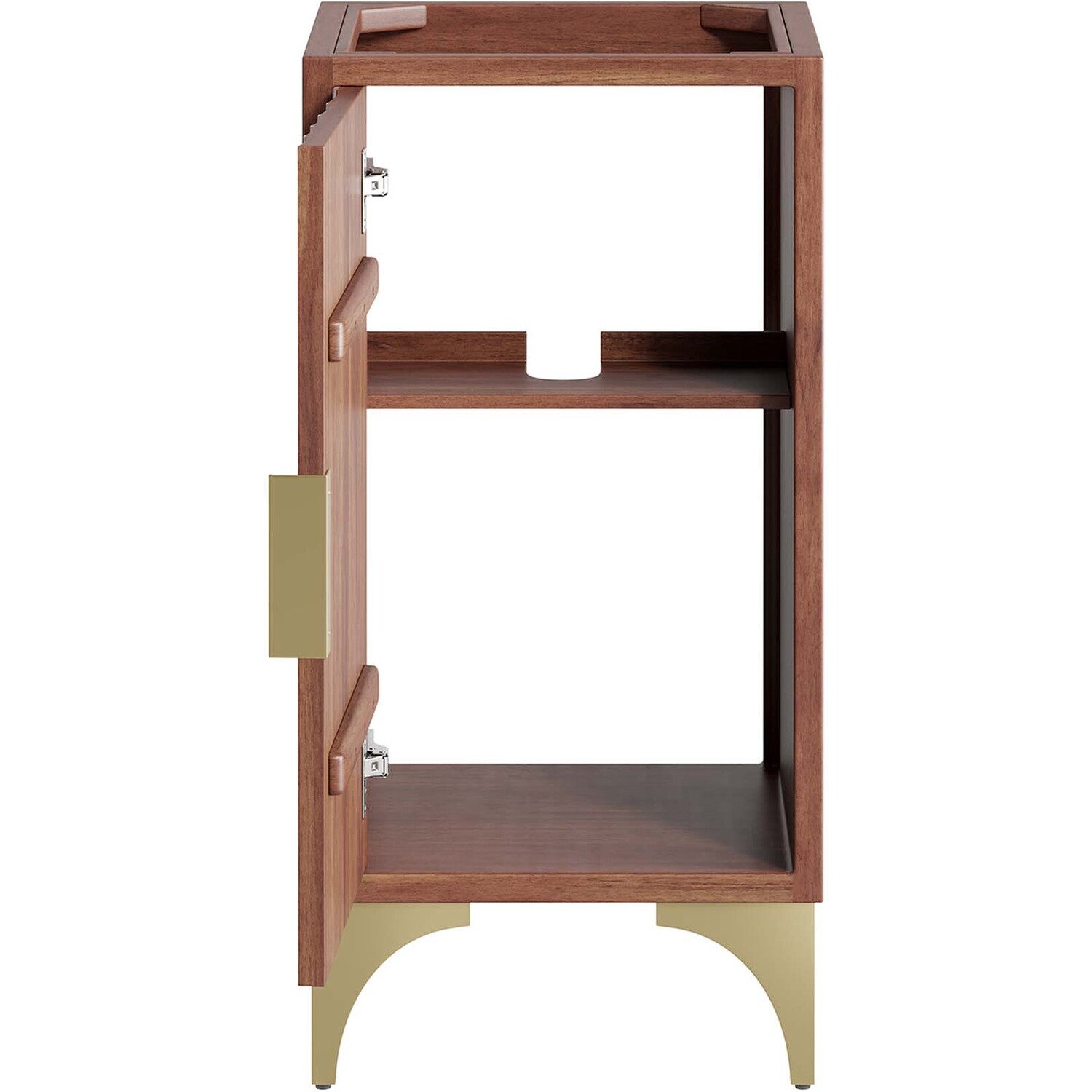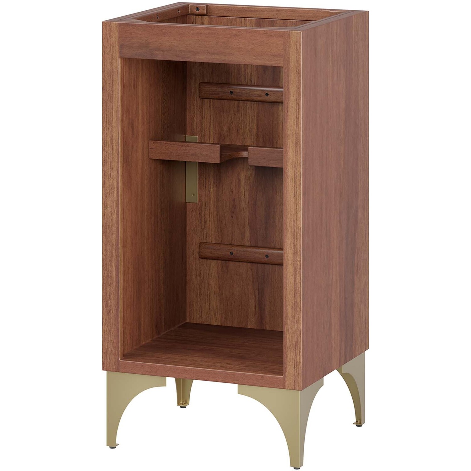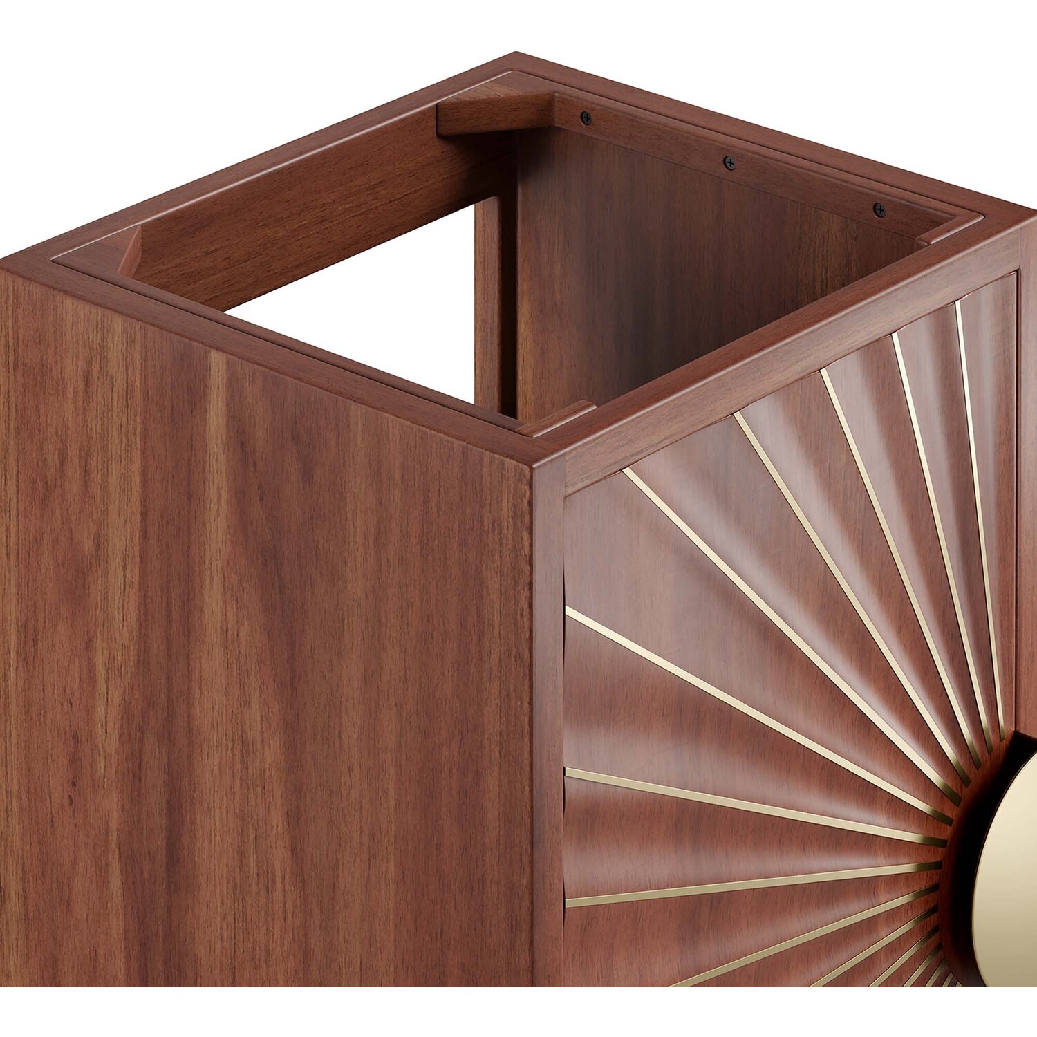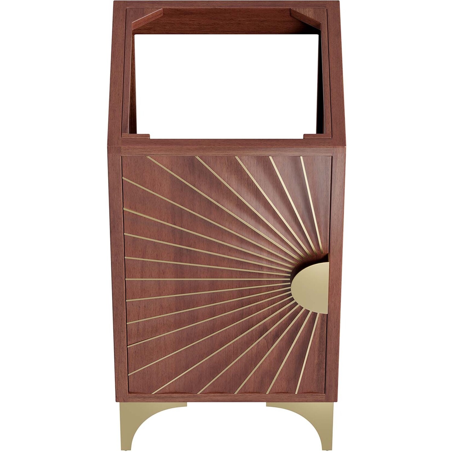 Bring refreshing energy into your bathroom space with the Daylight 18" Bathroom Vanity Cabinet. Beautifully crafted with solid mango wood and a rich wood stain, this bathroom cabinet features a sun ray design made possible through intricate powder-coated brass details and hardware. Resting on a brass base with arched details and non-marking foot caps, this bathroom vanity offers ample storage space for bathroom essentials with the spacious open shelving. Fixtures and sink basin not included. Assembly required.Modern Bathroom Vanity Cabinet