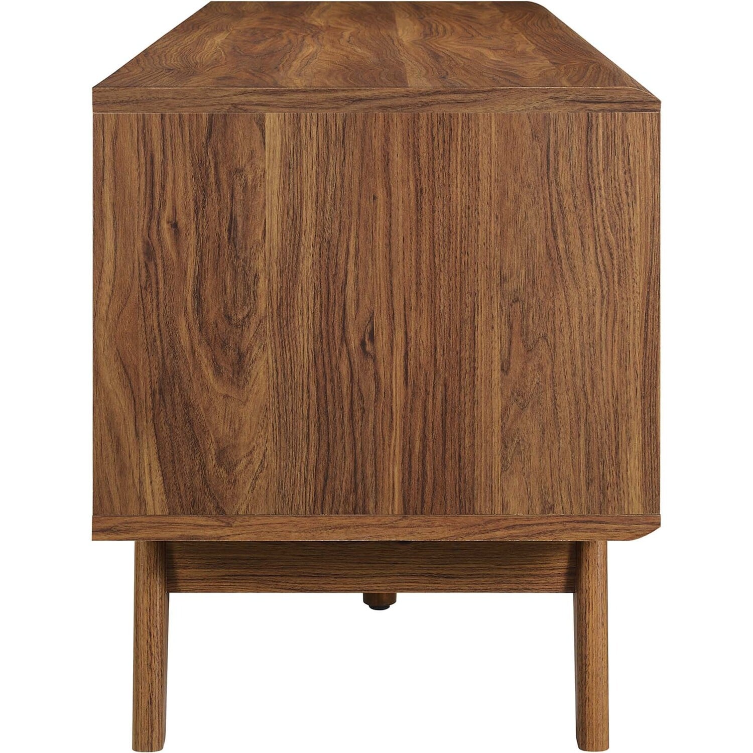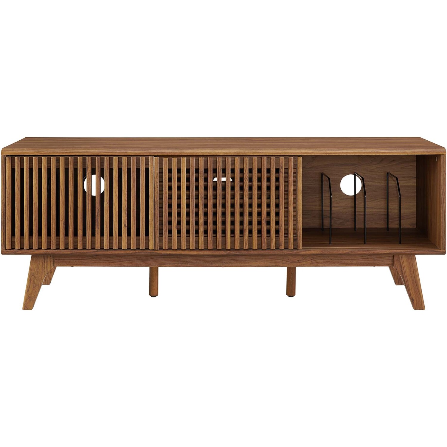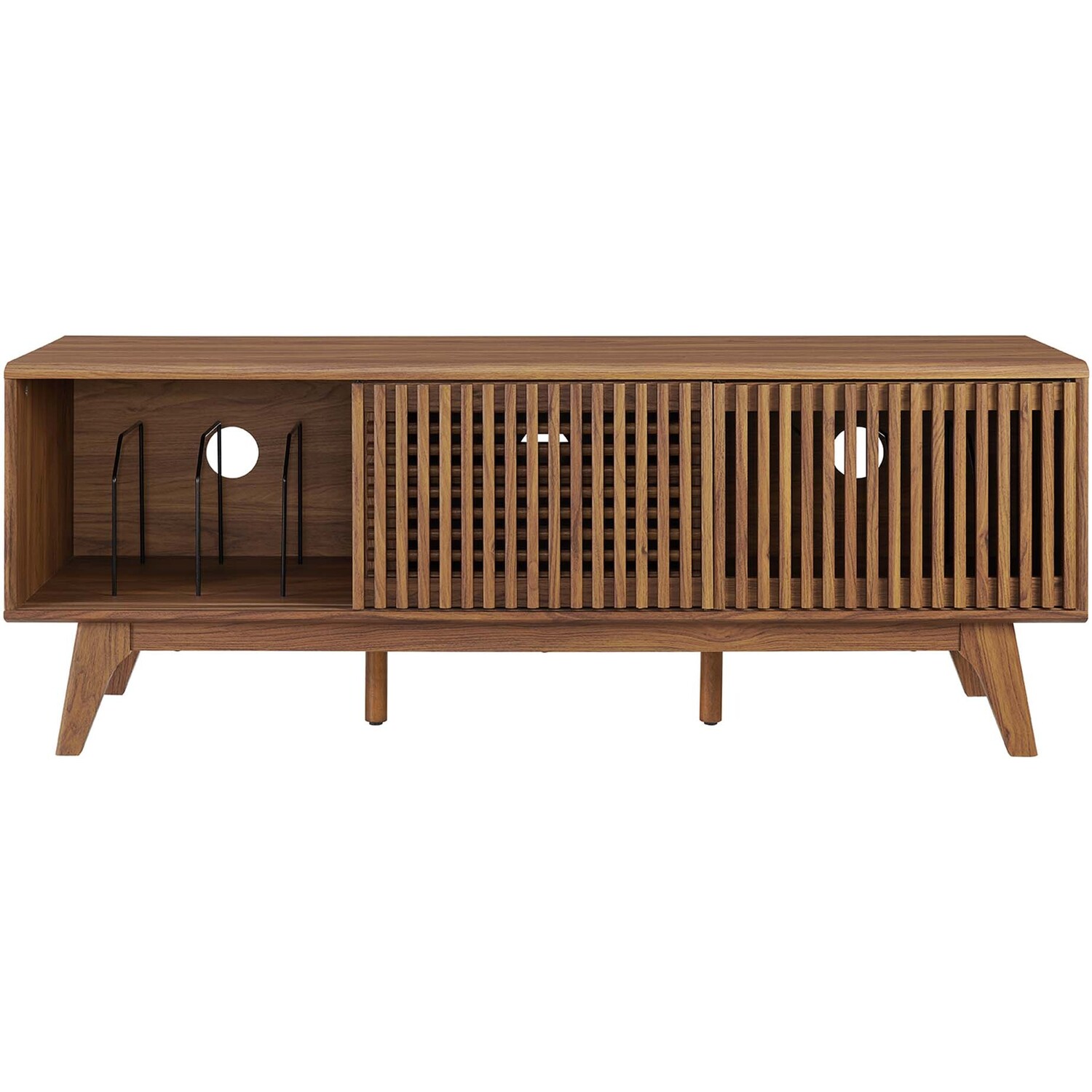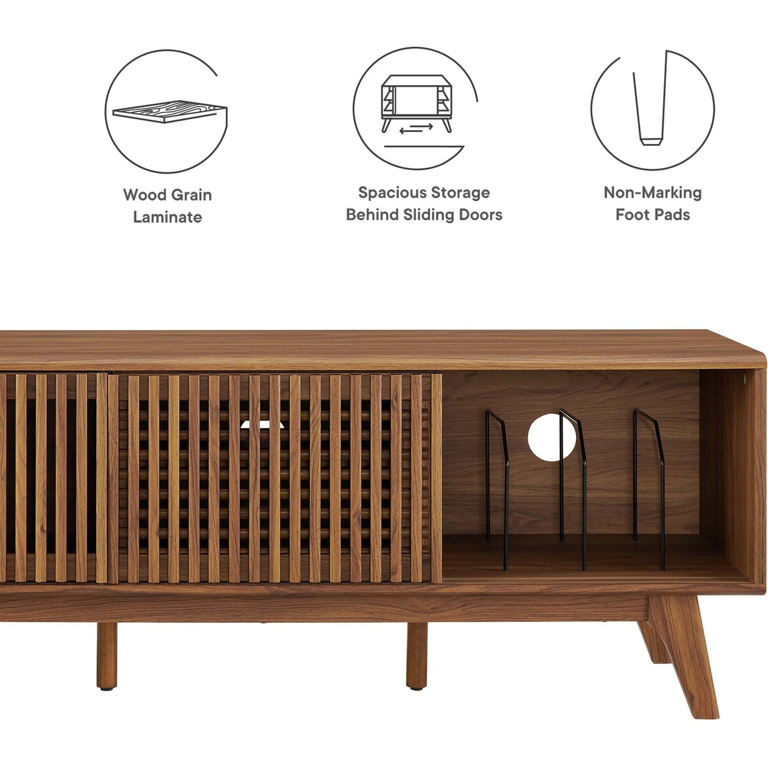 Reclaim modernity in your living space with the Iterate 59" TV Stand. This low-profile entertainment center features three sliding slatted doors, organic aesthetics, and a sleek silhouette to bring contemporary style to your living room, bedroom, home office, or lounge area. Crafted from durable particleboard and wood grain laminate, this TV stand offers spacious storage for all your media essentials with open shelving and a special area to store and display vinyl records or DVDs. The metal partitions are easily removed to allow for open storage space if preferred. With cable managment holes to keep visual space clean, this media console accommodates TVs up to 65"es. Includes non-marking foot pads to protect flooring. Assembly required. Weight Capacity: 200 lbs.Contemporary TV Stand