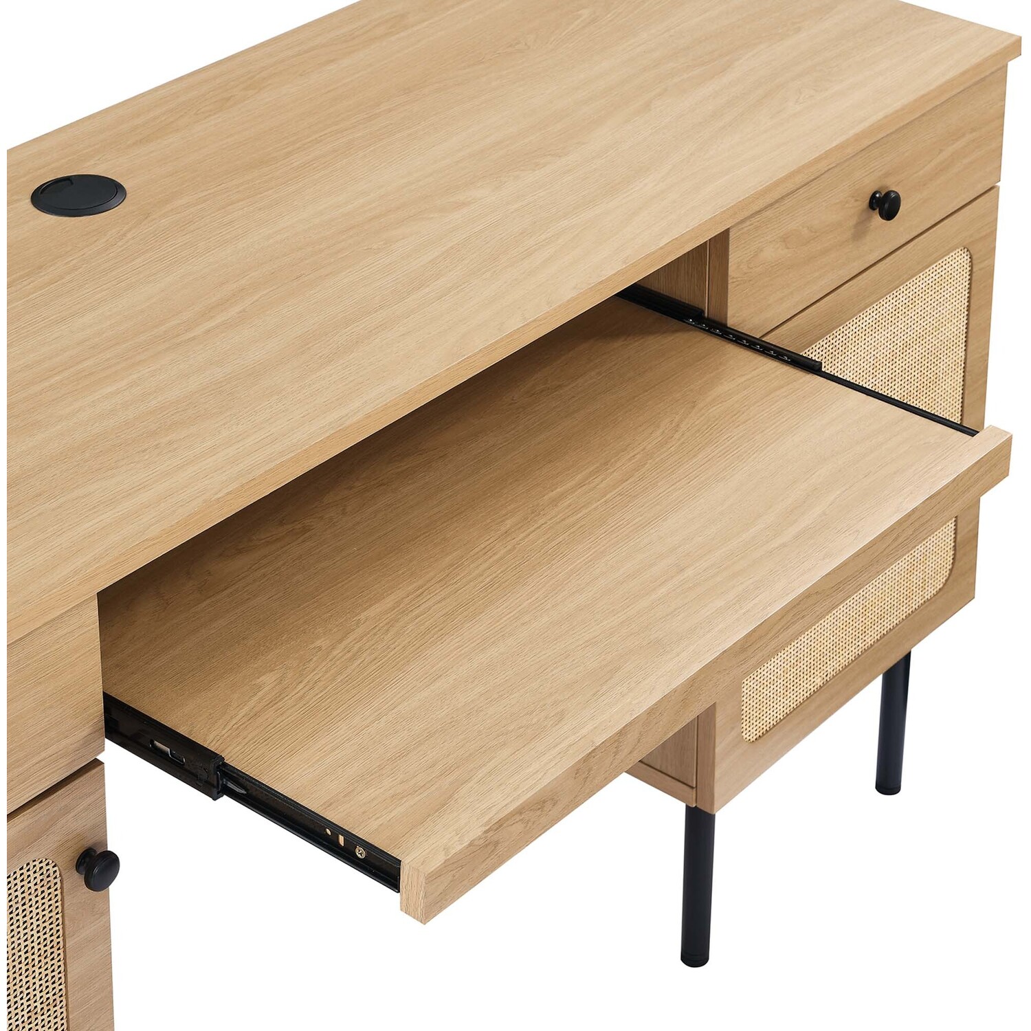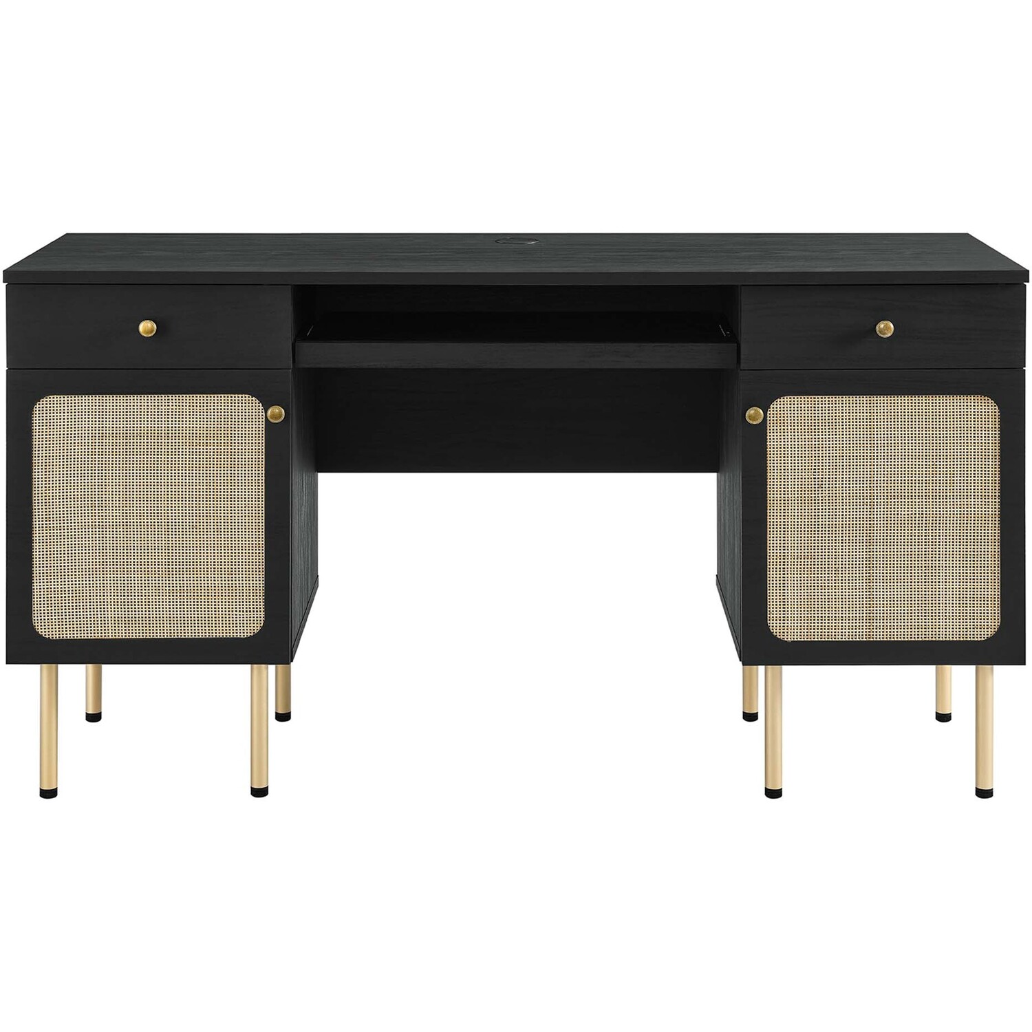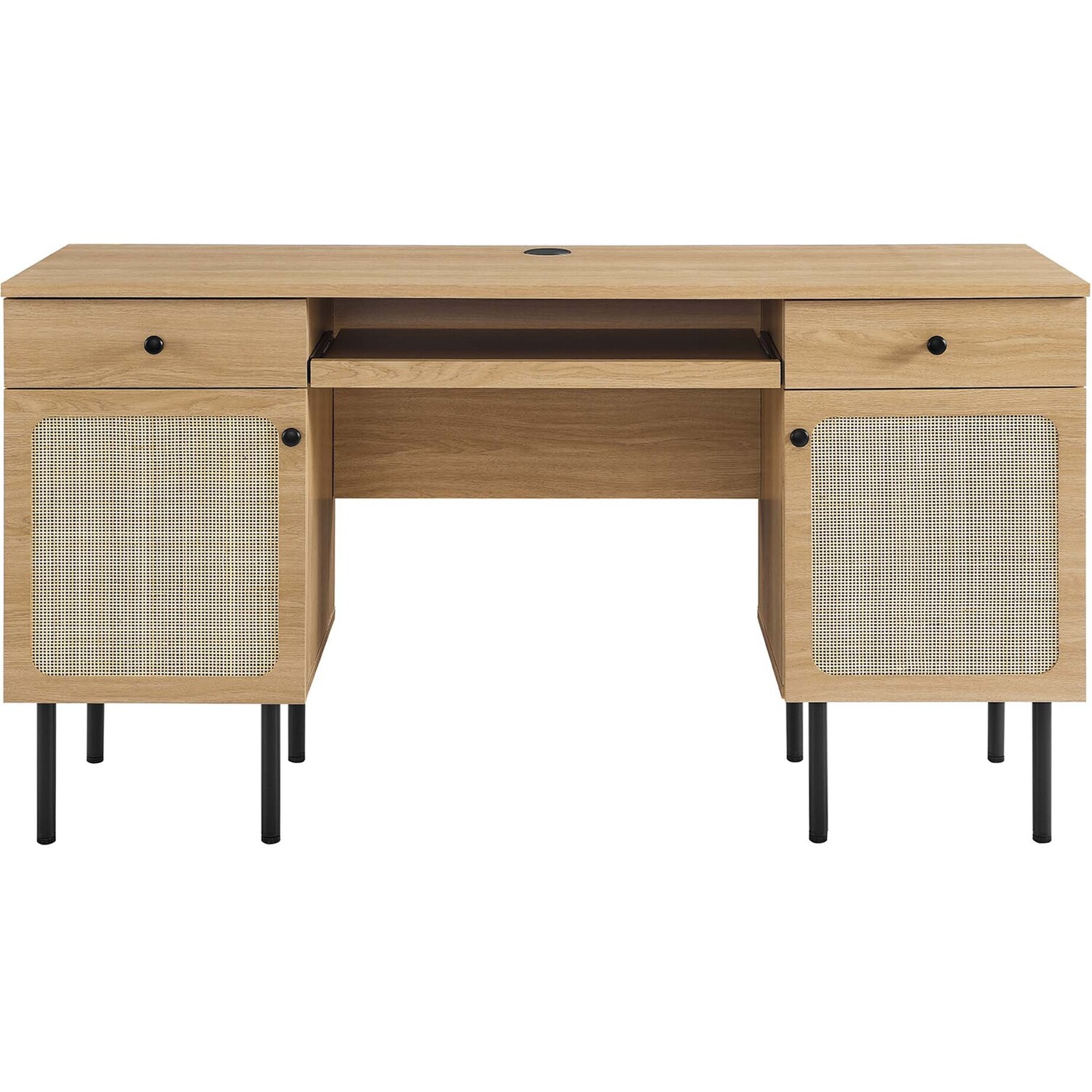 Refresh your workspace with the textured detail of the Chaucer Office Desk. Featuring beautiful rattan weaving on the doors, this computer desk updates a home office, college dorm, lounge area, or other workspace. Two full extension drawers, a pull-out keyboard tray, and spacious height-adjustabe shelves behind hinged doors offer ample storage for all your office essentials. Resting on sleek legs with adjustable feet for added stability, this office desk is durably crafted with particleboard and wood grain laminate to bring natural organic aesthetics to your bedroom decor. Assembly required.Modern Office Desk