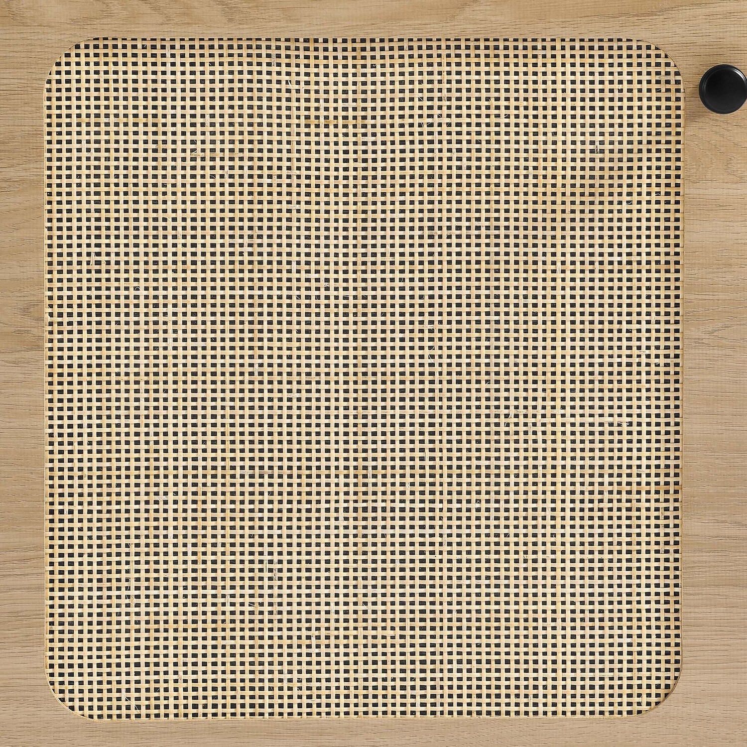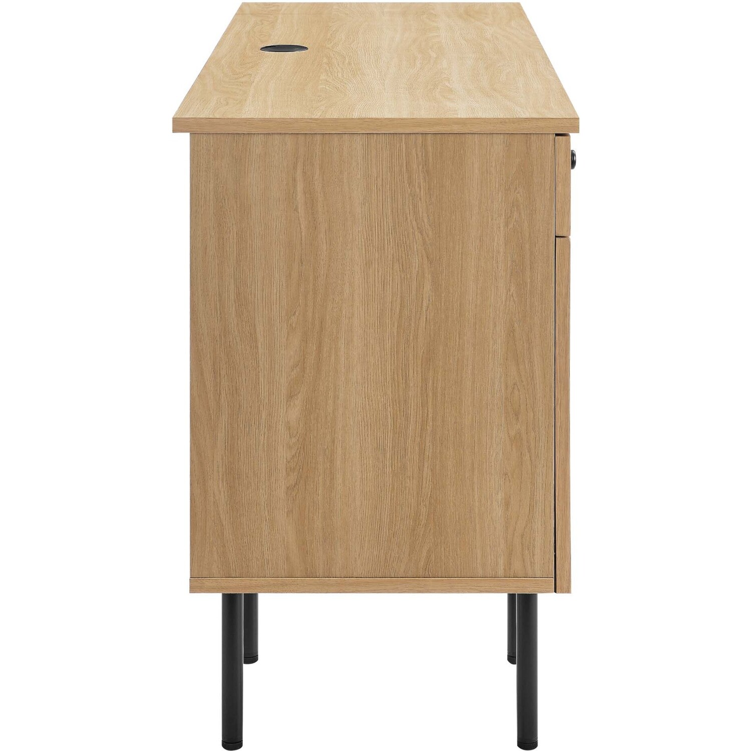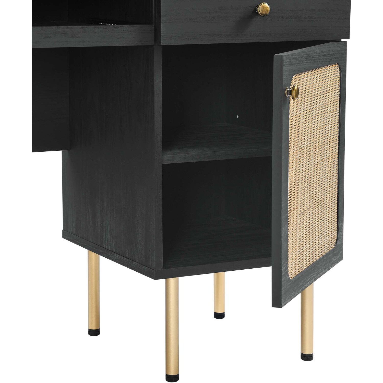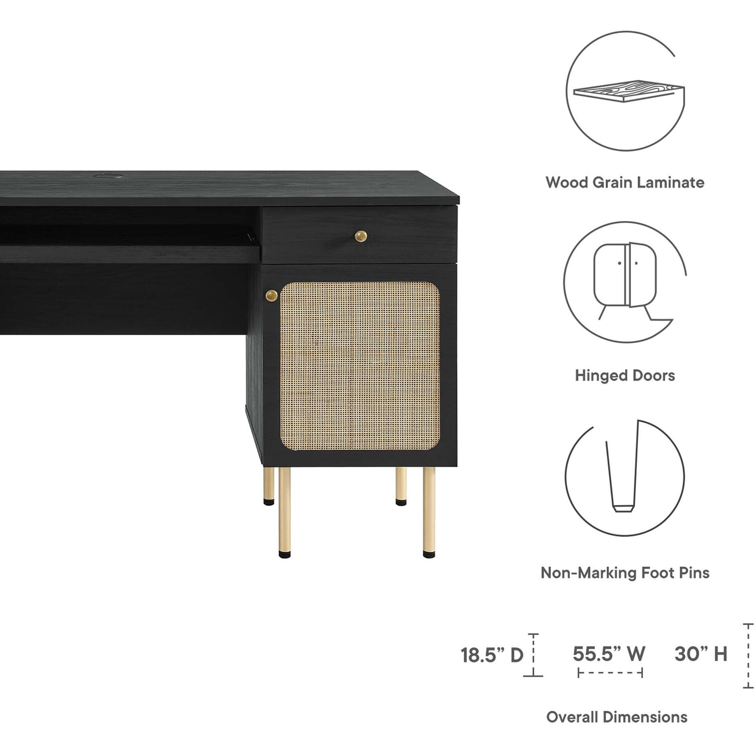 Refresh your workspace with the textured detail of the Chaucer Office Desk. Featuring beautiful rattan weaving on the doors, this computer desk updates a home office, college dorm, lounge area, or other workspace. Two full extension drawers, a pull-out keyboard tray, and spacious height-adjustabe shelves behind hinged doors offer ample storage for all your office essentials. Resting on sleek legs with adjustable feet for added stability, this office desk is durably crafted with particleboard and wood grain laminate to bring natural organic aesthetics to your bedroom decor. Assembly required.Modern Office Desk