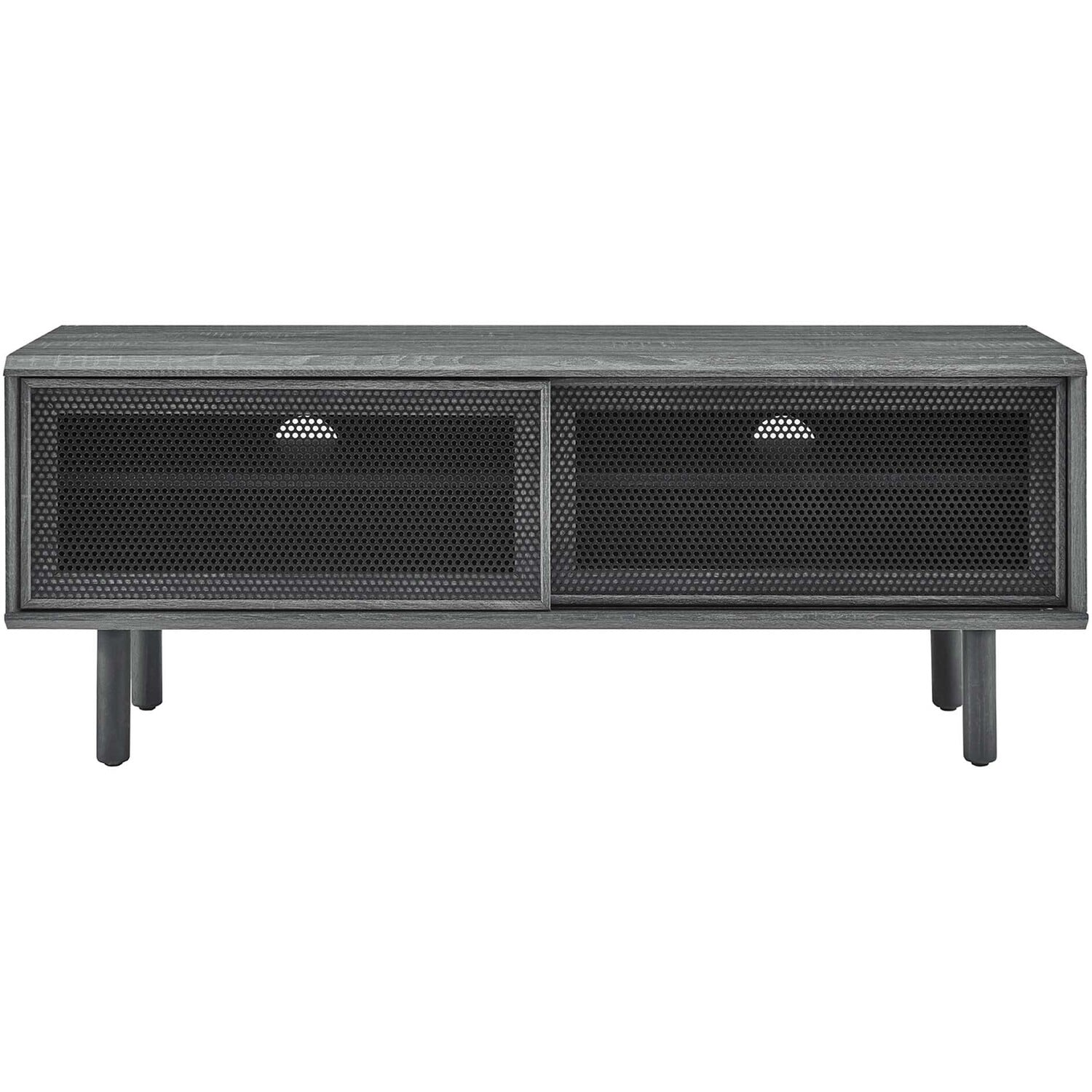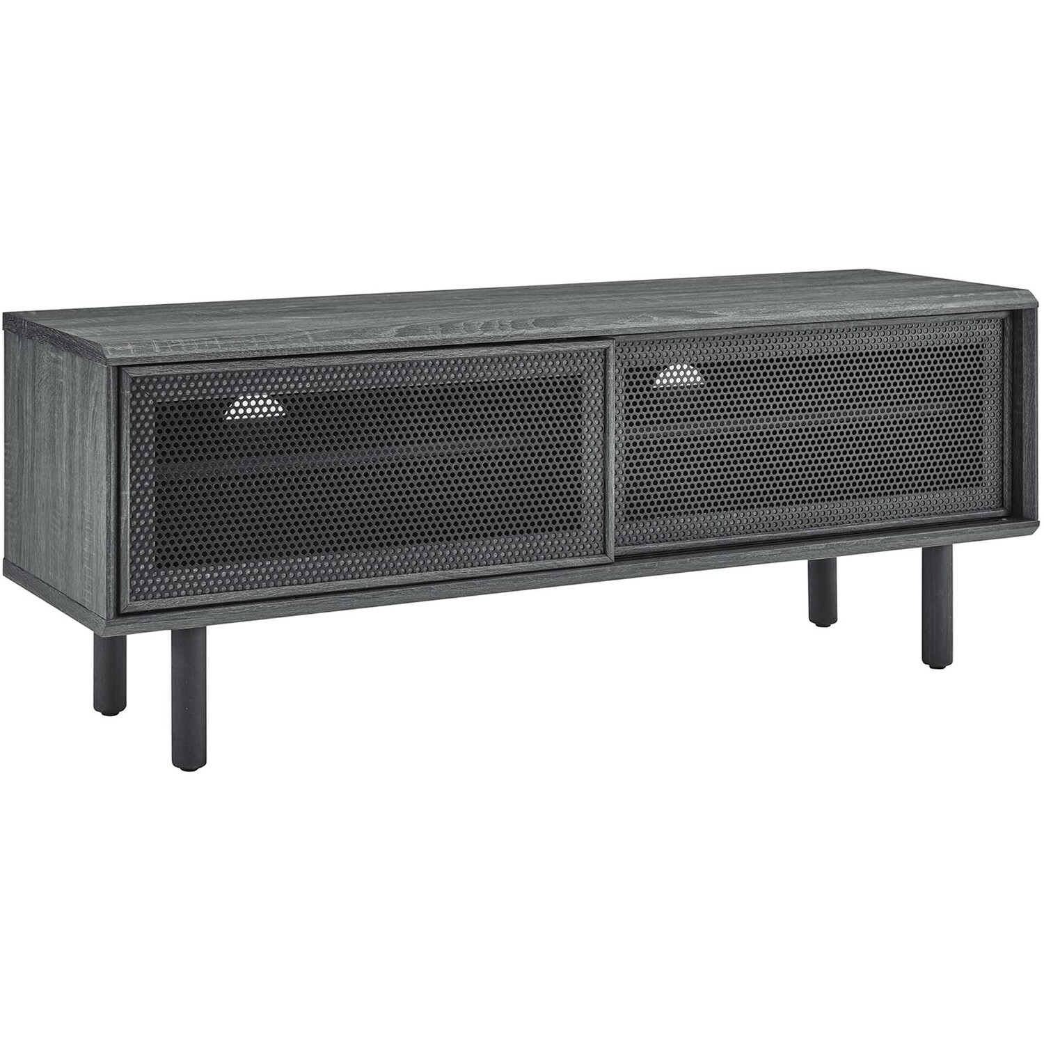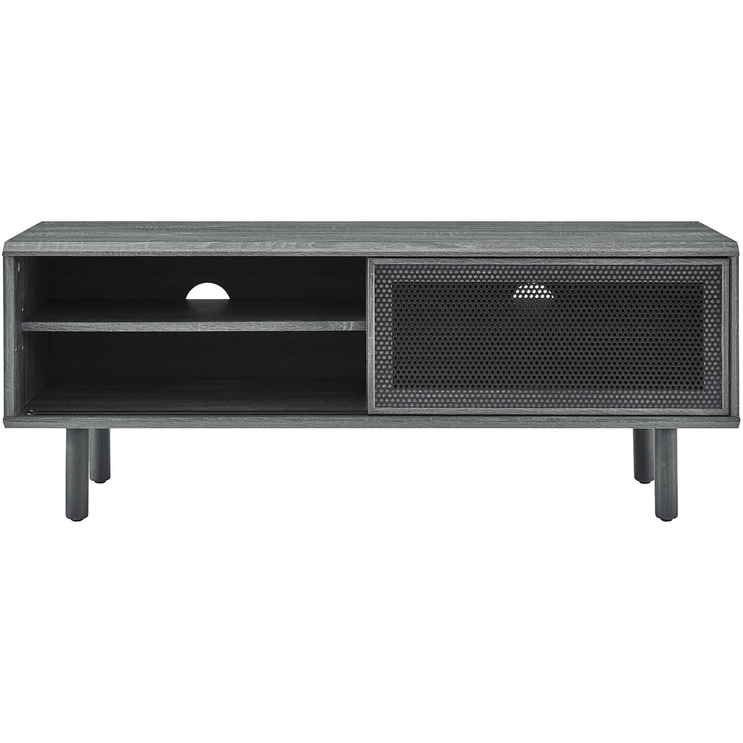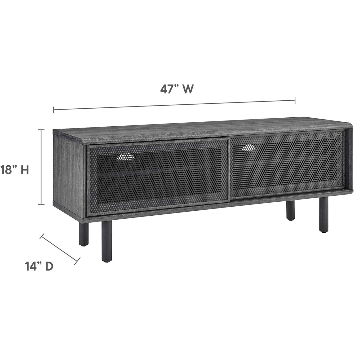 Bring urban flare to your living space with the modern design of the Kurtis 47" TV Stand. Featuring sliding metal mesh doors, this entertainment center brings industrial design to the living room, bedroom, home office, or lounge area. This media stand is crafted from MDF and particleboard with a natural wood grain design. Offering ample storage space for all your media essentials, this TV console features an open shelving area concealed by mesh sliding doors with cable management holes that keep things organized and allow for flow through ventilation. Resting on sturdy wood legs with non-marking foot pads to protect flooring, this low-profile TV stand accommodates flat screen TVs up to 52"es. Assembly required. Weight Capacity: 137 lbs.Modern Urban TV Stand