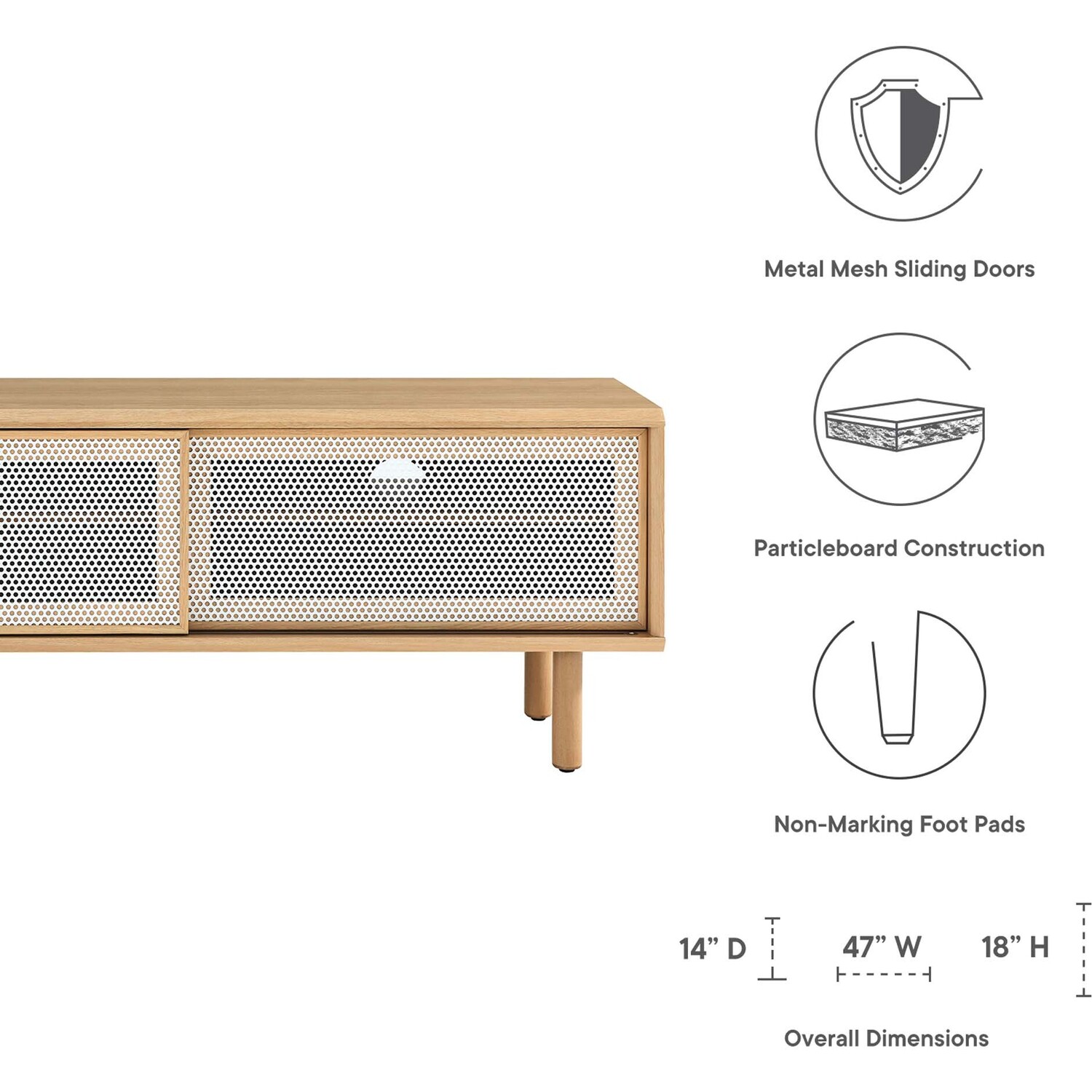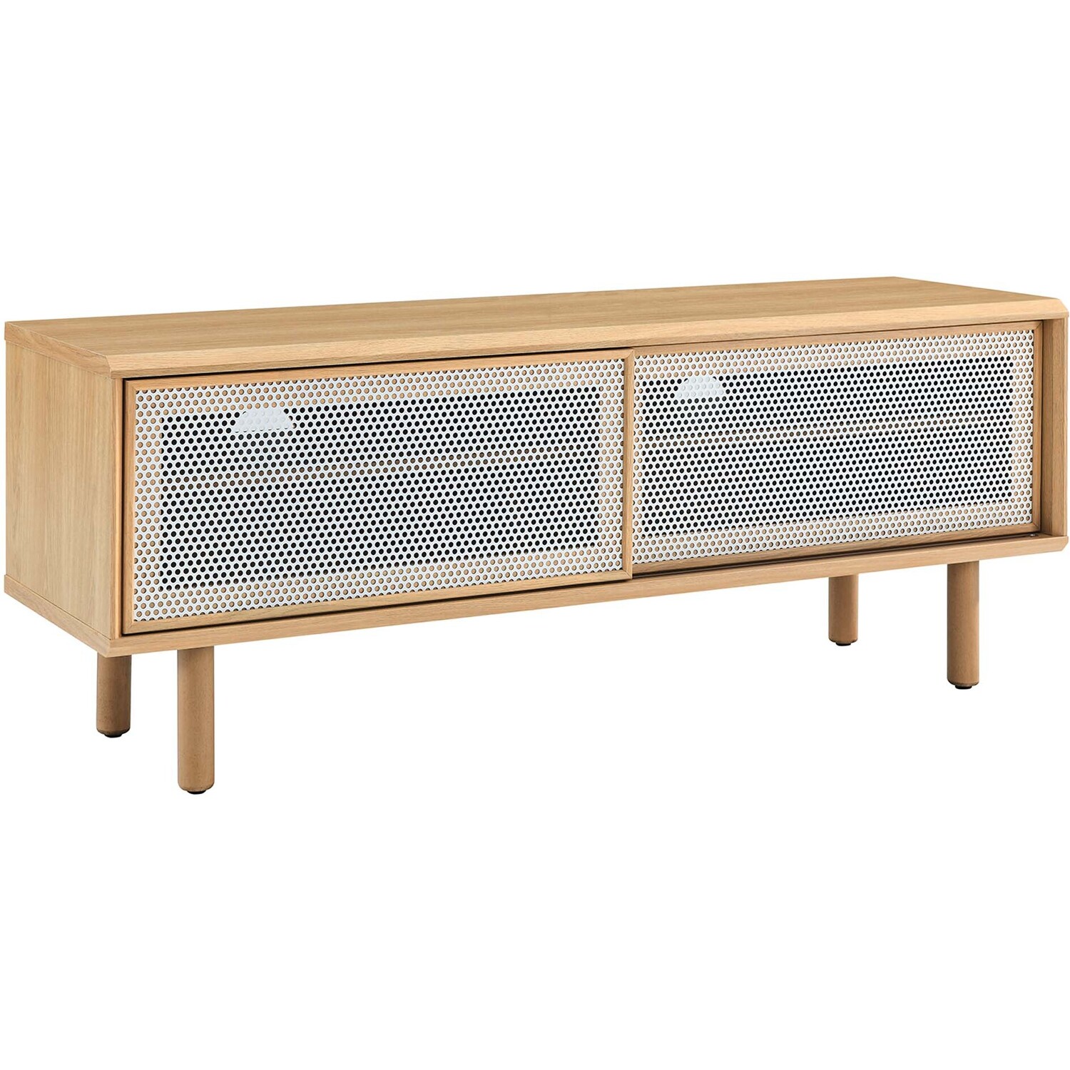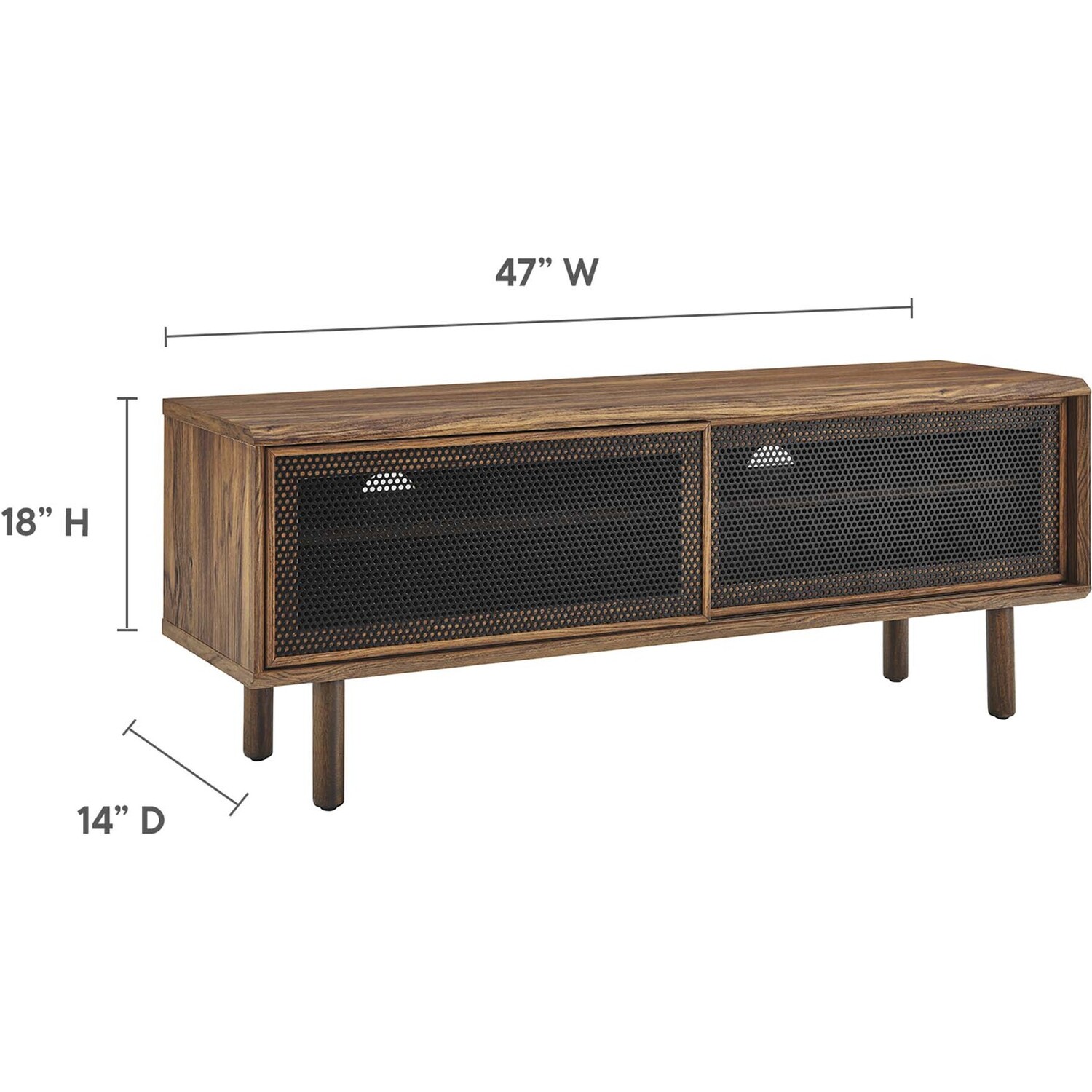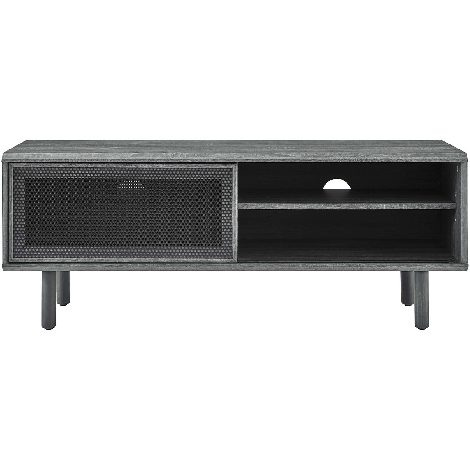 Bring urban flare to your living space with the modern design of the Kurtis 47" TV Stand. Featuring sliding metal mesh doors, this entertainment center brings industrial design to the living room, bedroom, home office, or lounge area. This media stand is crafted from MDF and particleboard with a natural wood grain design. Offering ample storage space for all your media essentials, this TV console features an open shelving area concealed by mesh sliding doors with cable management holes that keep things organized and allow for flow through ventilation. Resting on sturdy wood legs with non-marking foot pads to protect flooring, this low-profile TV stand accommodates flat screen TVs up to 52"es. Assembly required. Weight Capacity: 137 lbs.Modern Urban TV Stand