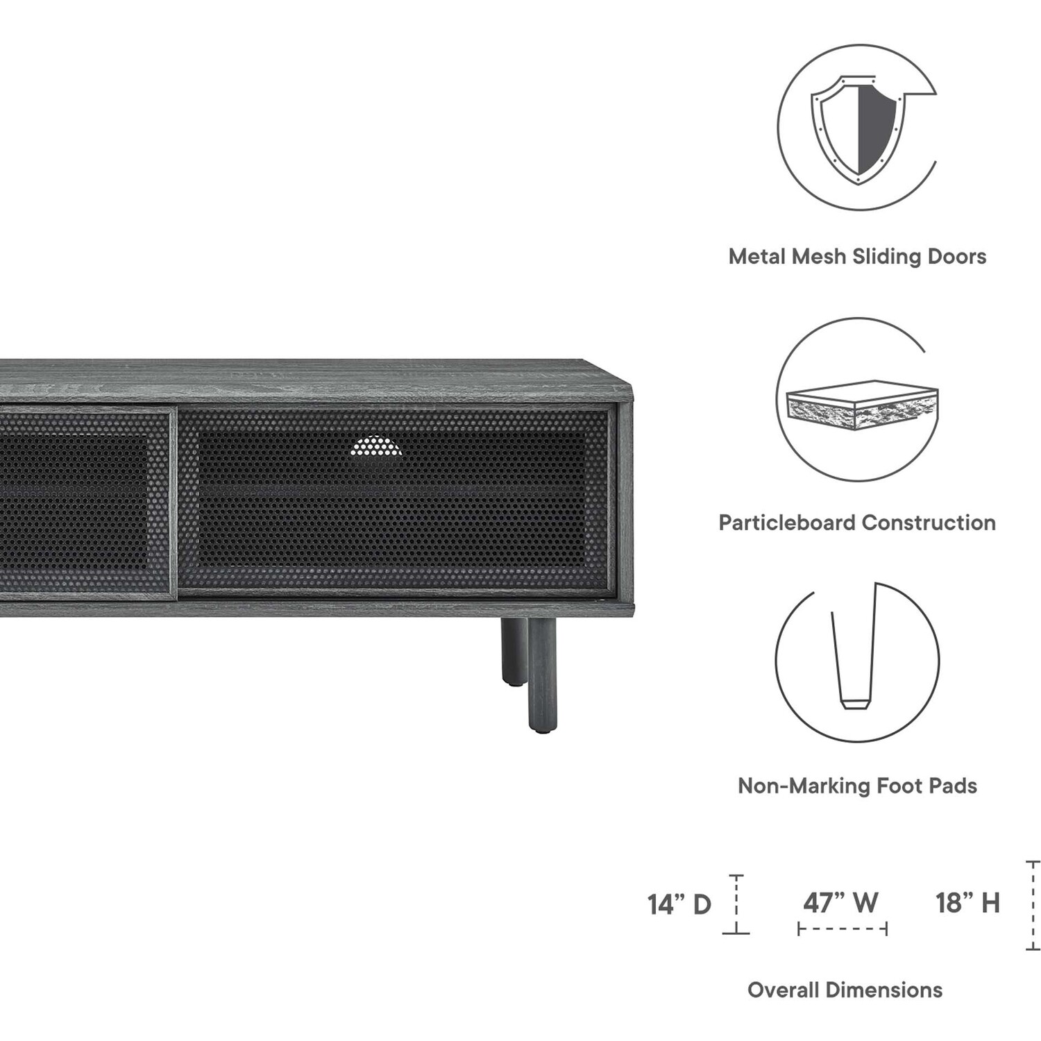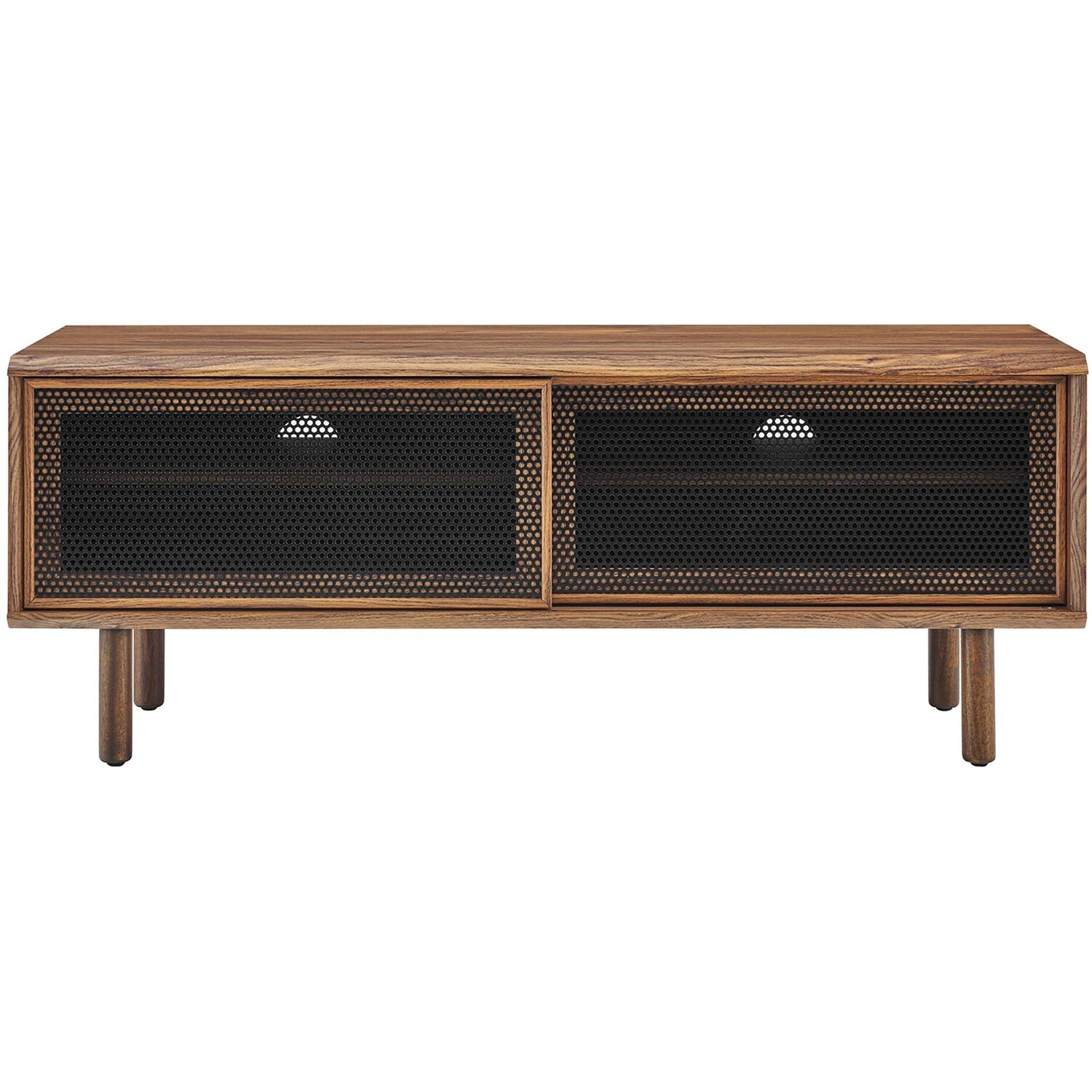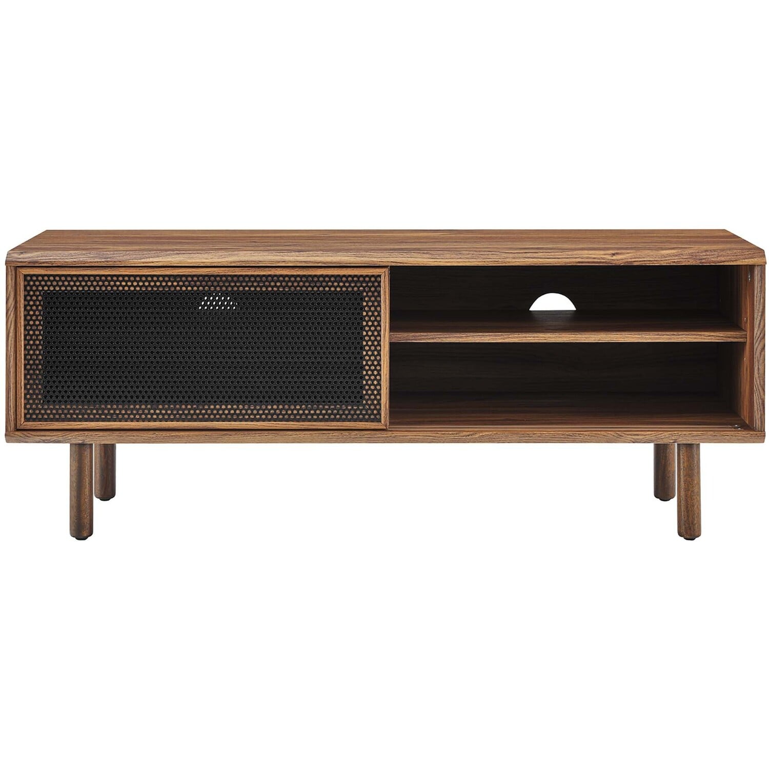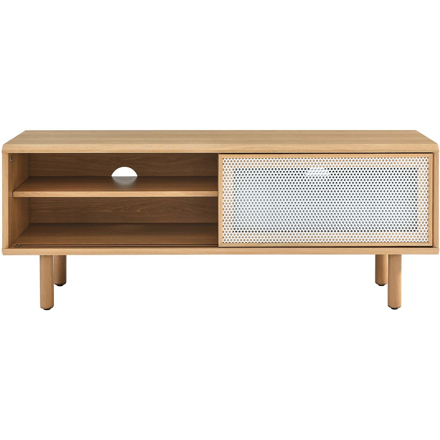 Bring urban flare to your living space with the modern design of the Kurtis 47" TV Stand. Featuring sliding metal mesh doors, this entertainment center brings industrial design to the living room, bedroom, home office, or lounge area. This media stand is crafted from MDF and particleboard with a natural wood grain design. Offering ample storage space for all your media essentials, this TV console features an open shelving area concealed by mesh sliding doors with cable management holes that keep things organized and allow for flow through ventilation. Resting on sturdy wood legs with non-marking foot pads to protect flooring, this low-profile TV stand accommodates flat screen TVs up to 52"es. Assembly required. Weight Capacity: 137 lbs.Modern Urban TV Stand