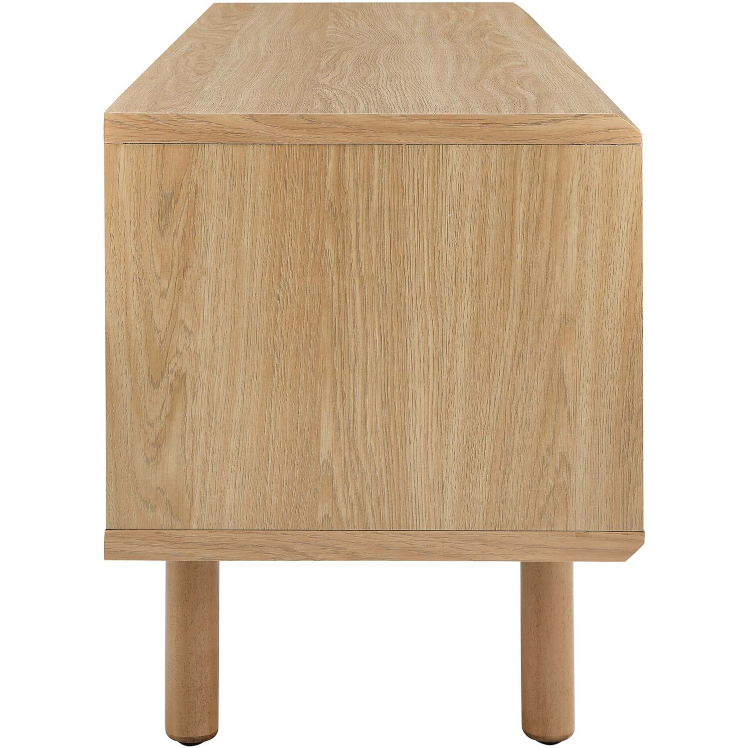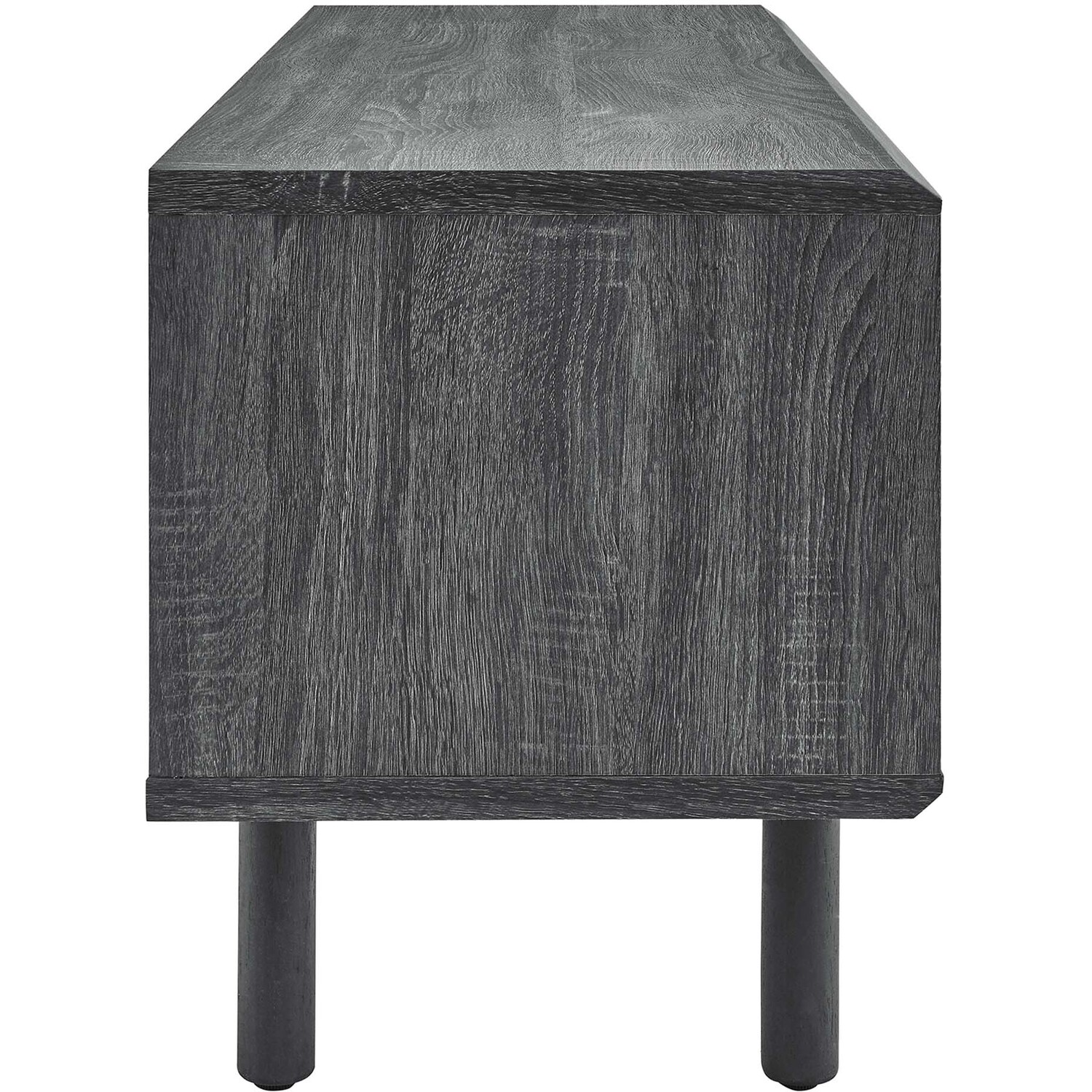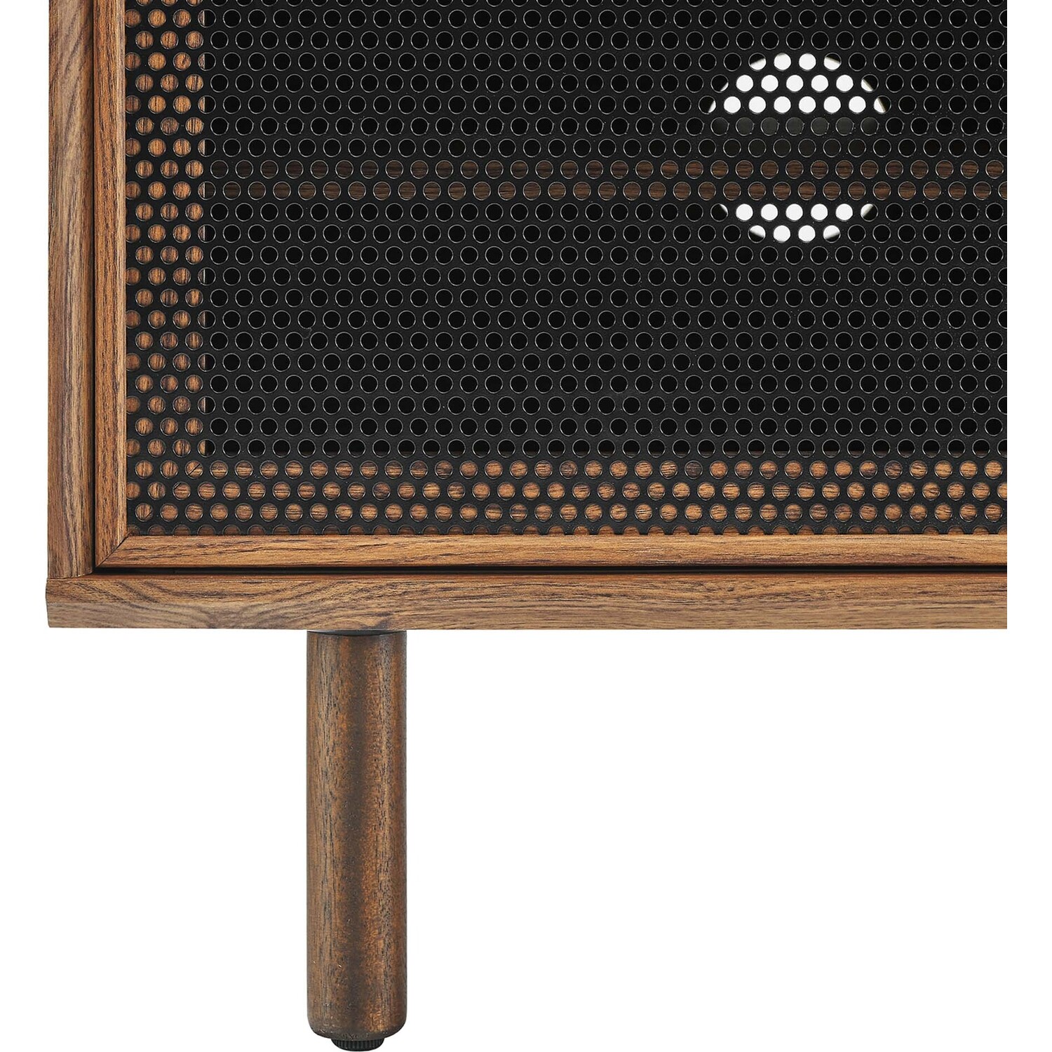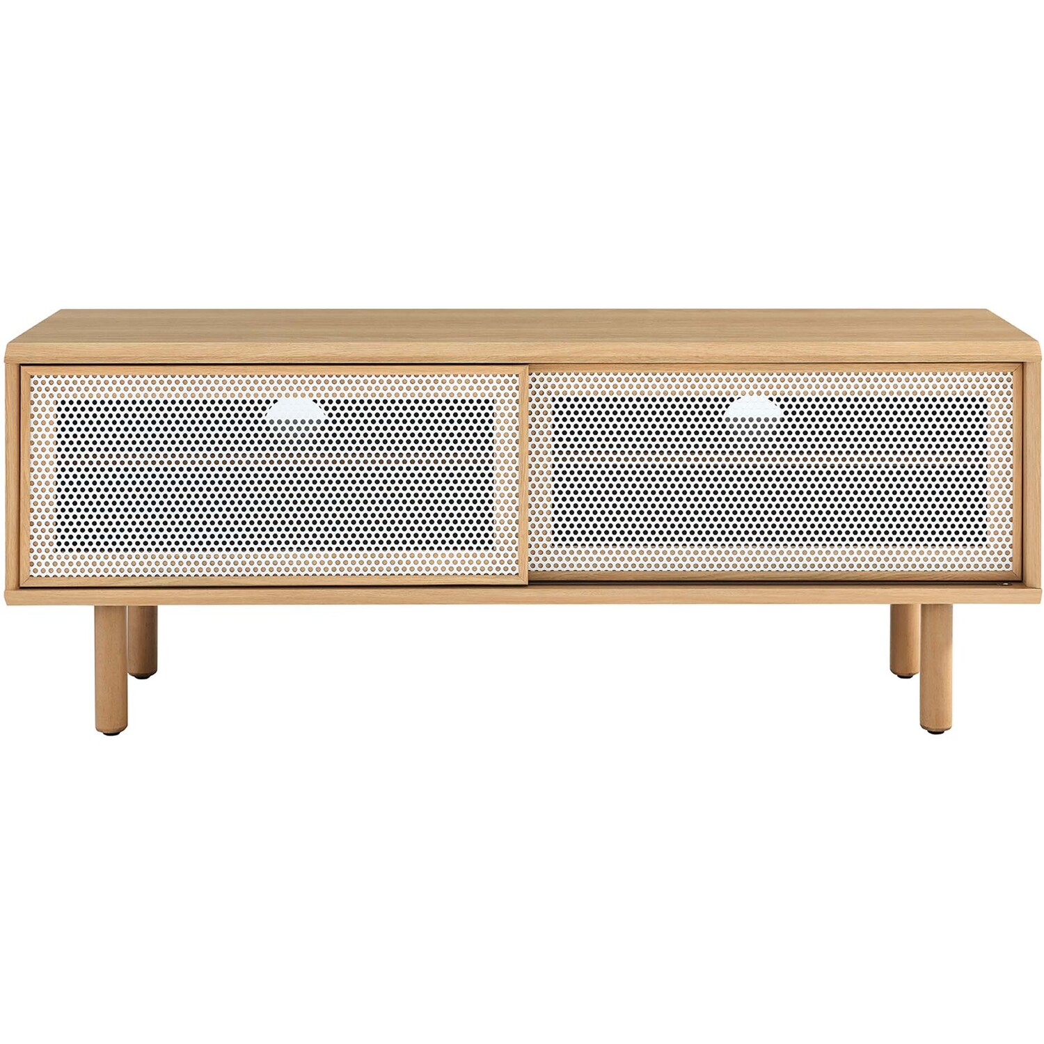 Bring urban flare to your living space with the modern design of the Kurtis 47" TV Stand. Featuring sliding metal mesh doors, this entertainment center brings industrial design to the living room, bedroom, home office, or lounge area. This media stand is crafted from MDF and particleboard with a natural wood grain design. Offering ample storage space for all your media essentials, this TV console features an open shelving area concealed by mesh sliding doors with cable management holes that keep things organized and allow for flow through ventilation. Resting on sturdy wood legs with non-marking foot pads to protect flooring, this low-profile TV stand accommodates flat screen TVs up to 52"es. Assembly required. Weight Capacity: 137 lbs.Modern Urban TV Stand