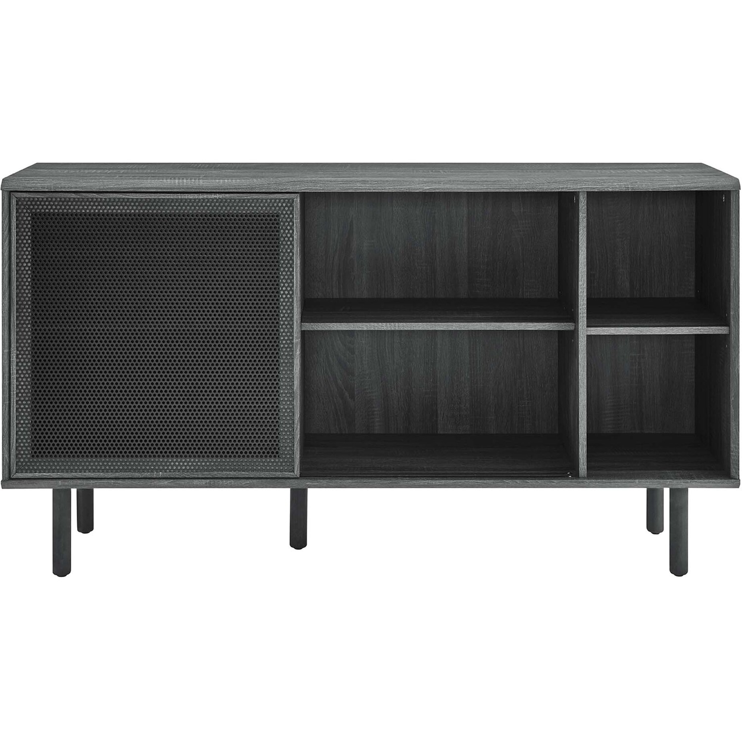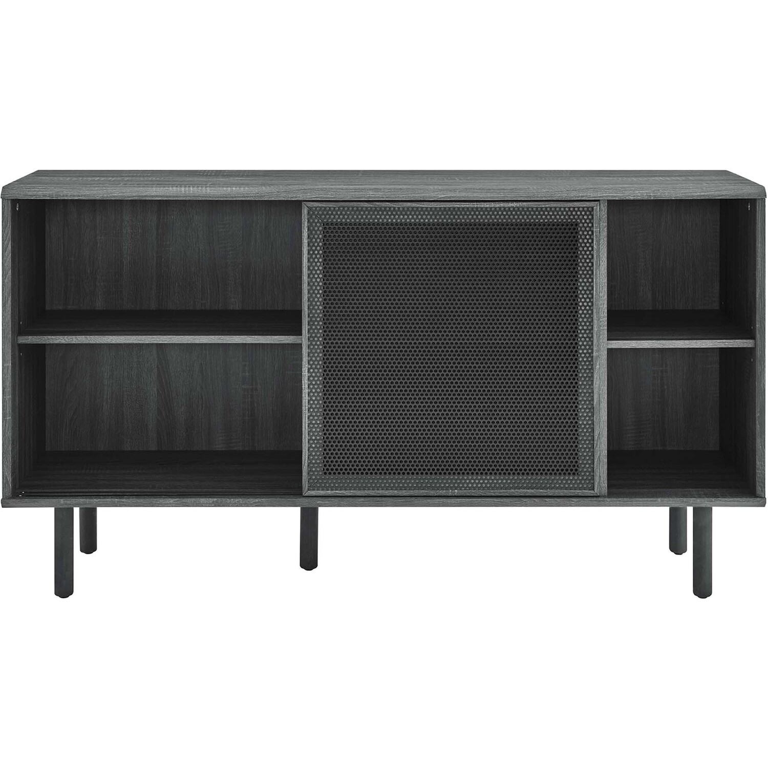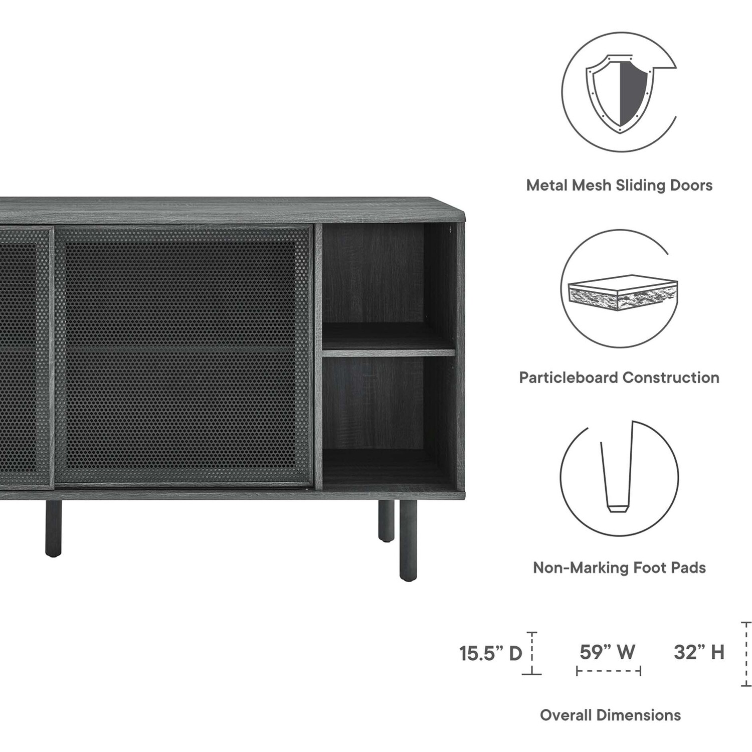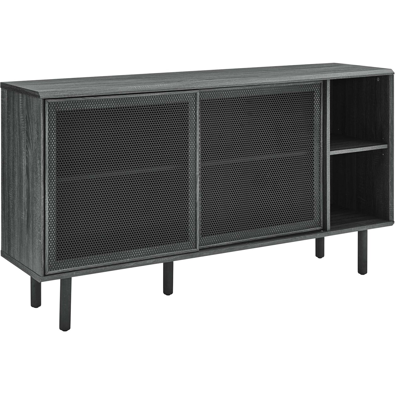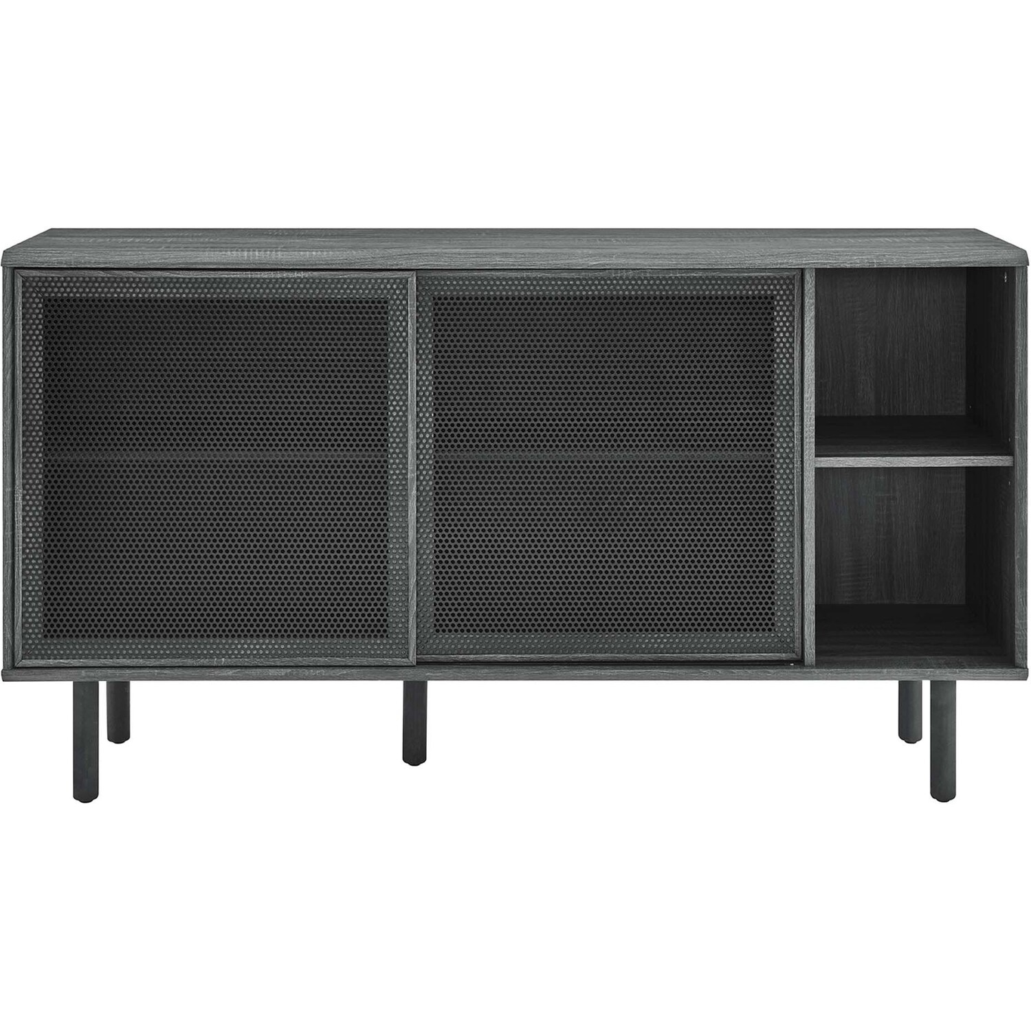 Bring urban flare to your living space with the modern design of the Kurtis 59" Sideboard. Featuring sliding metal mesh doors, this storage cabinet brings industrial design to a dining room, living room, lounge area, or hallway. This versatile display cabinet is crafted from MDF and particleboard with a natural wood grain design. Offering ample storage space for dishes, stemware, bar essentials, linens, or anything else that suits your needs, this credenza features open shelving areas partially concealed by mesh sliding doors allowing for both storage and display. Resting on sturdy wood legs with non-marking felt pads to protect flooring, this sideboard doubles as a TV stand that can accommodate TVs up to 65"es. Assembly required. Weight Capacity: 181 lbs. Please Note: When placing the TV directly on the unit, we recommend anchoring it in place.Modern Sideboard