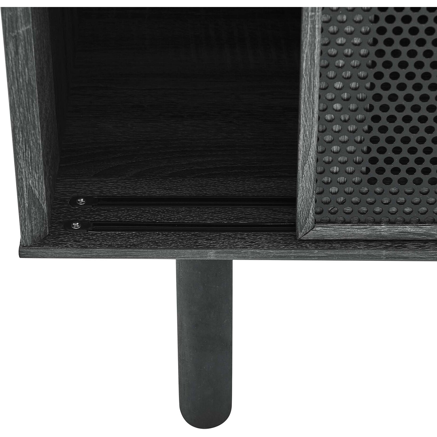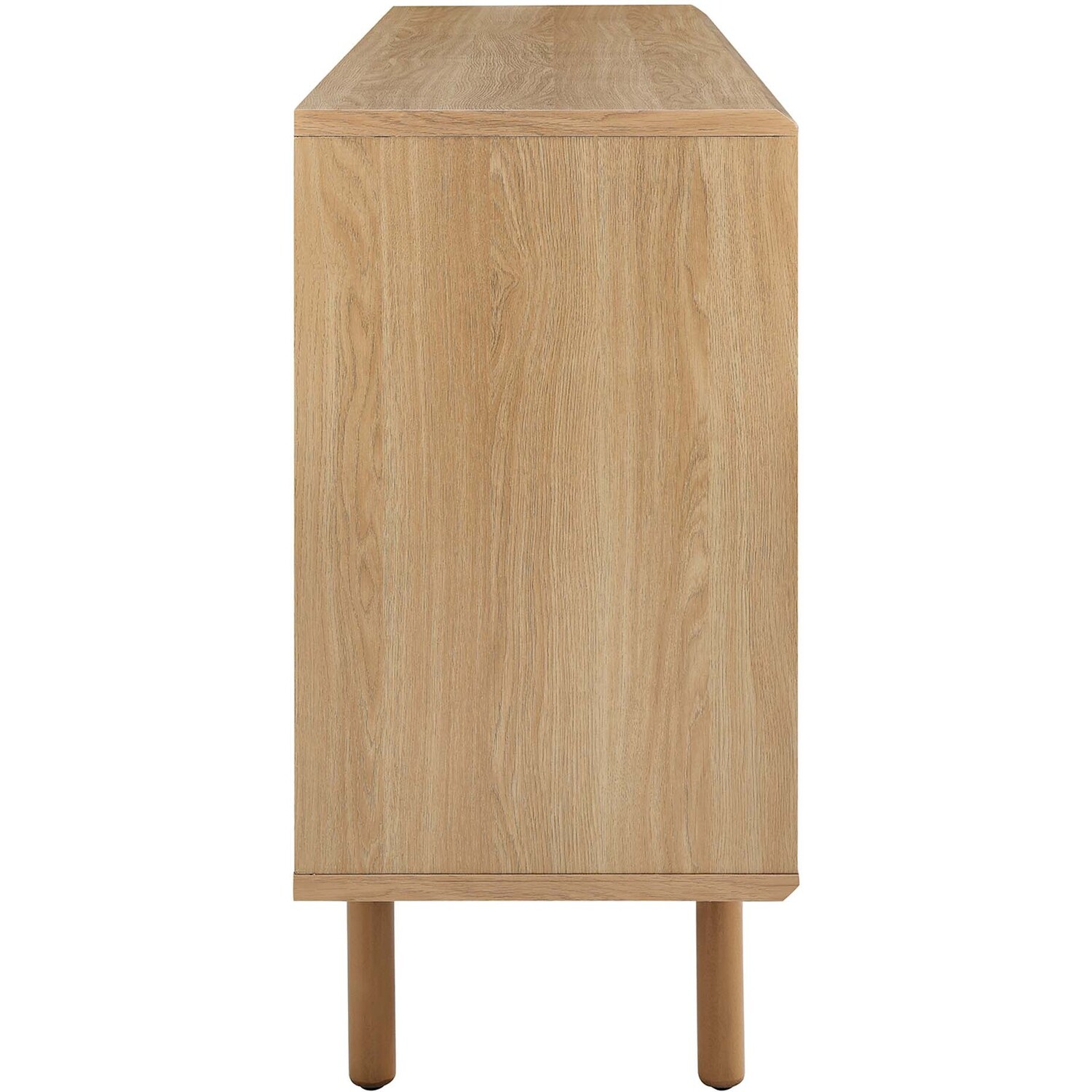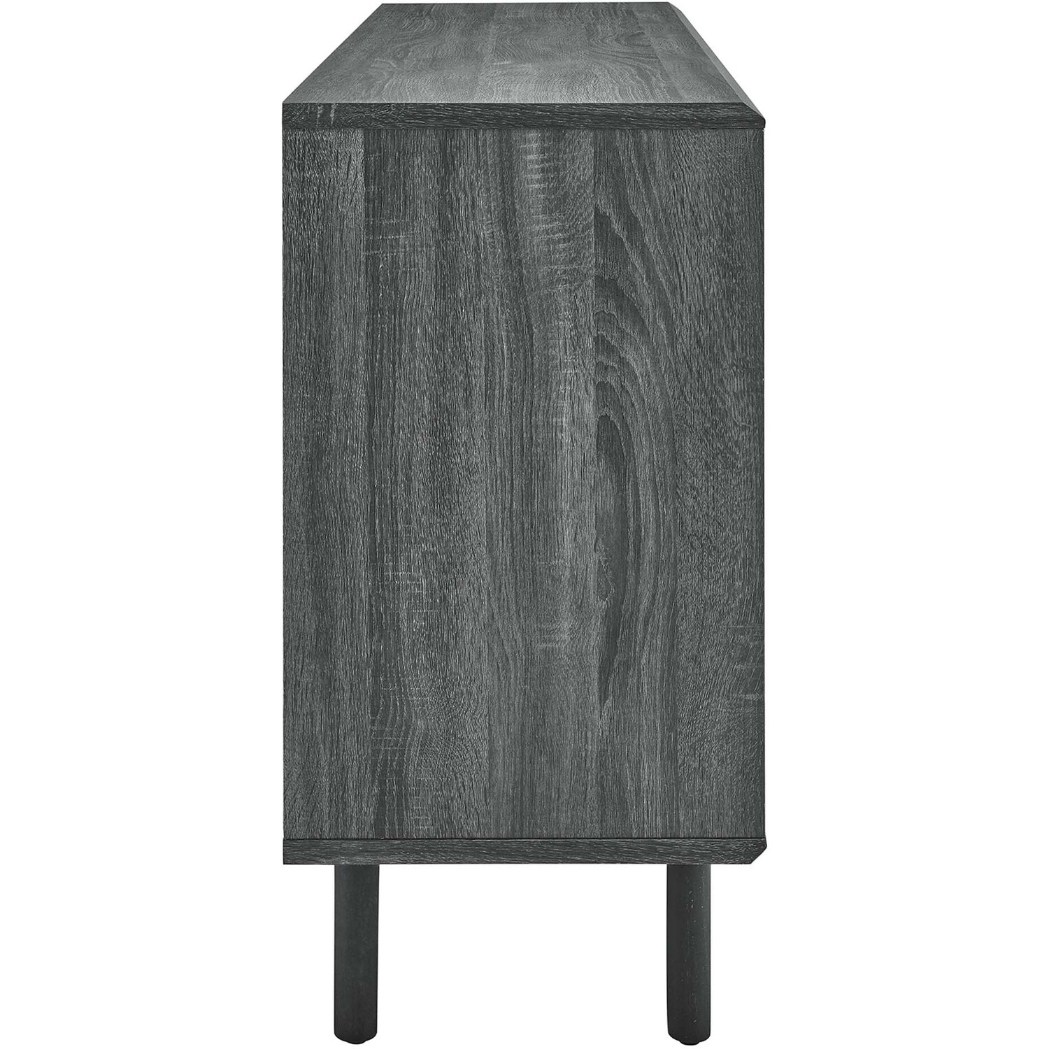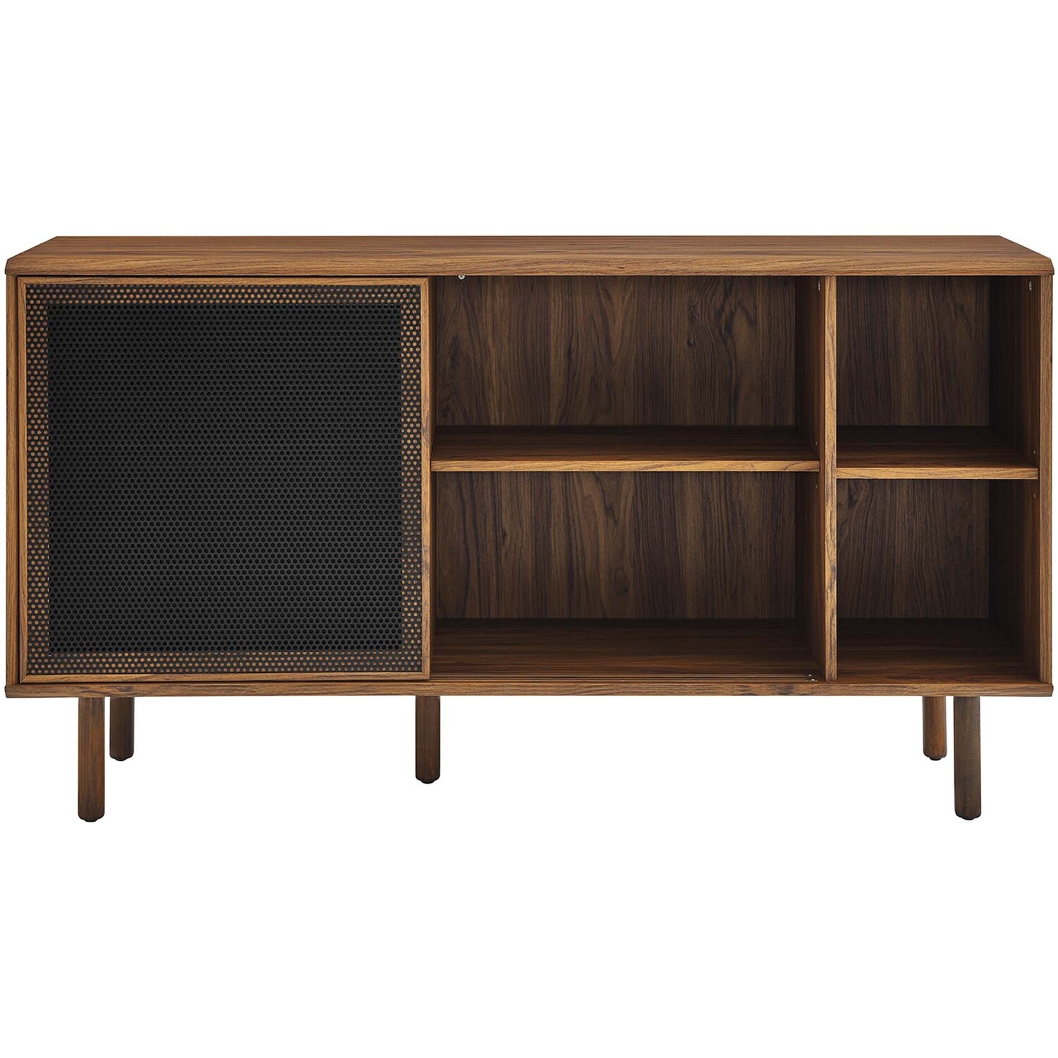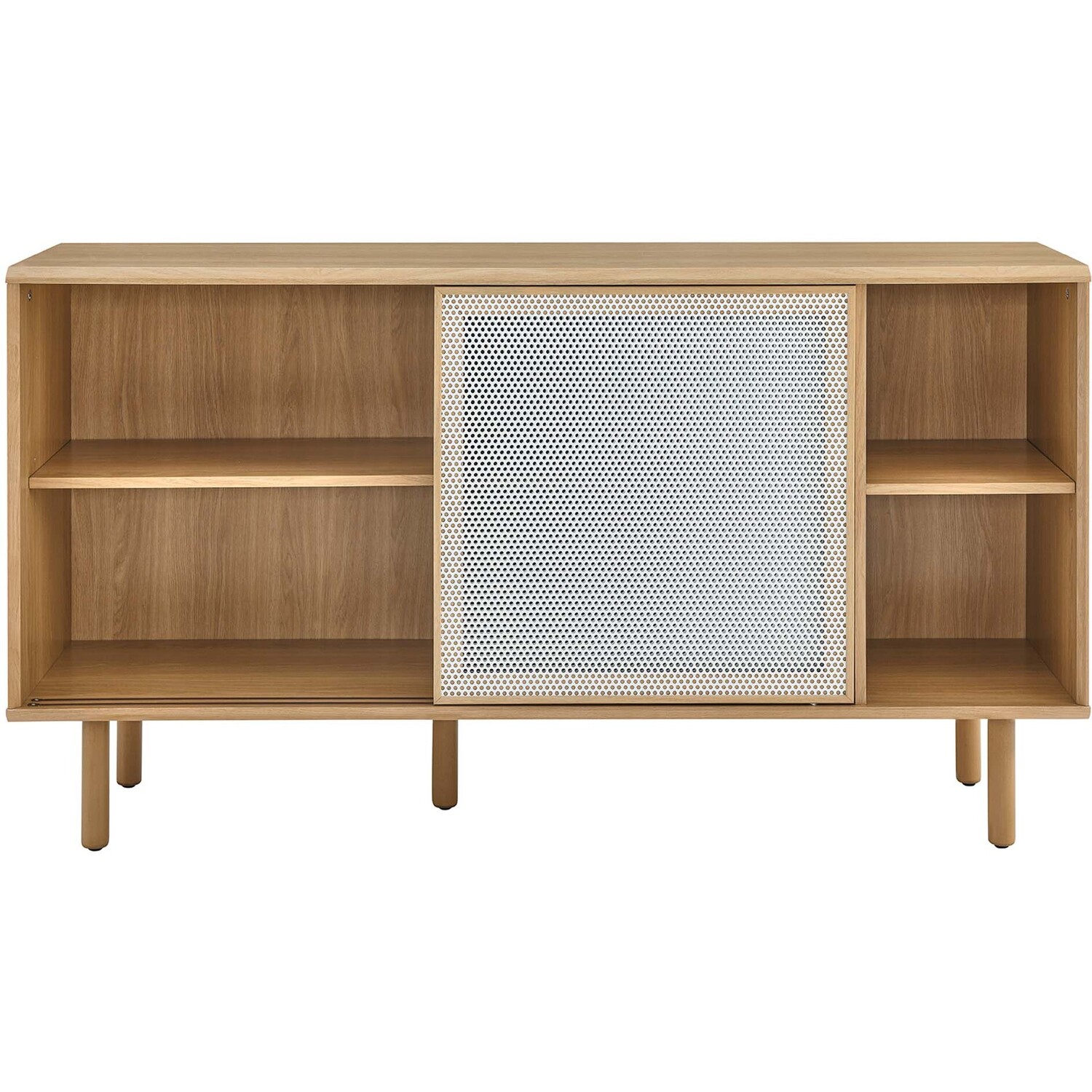 Bring urban flare to your living space with the modern design of the Kurtis 59" Sideboard. Featuring sliding metal mesh doors, this storage cabinet brings industrial design to a dining room, living room, lounge area, or hallway. This versatile display cabinet is crafted from MDF and particleboard with a natural wood grain design. Offering ample storage space for dishes, stemware, bar essentials, linens, or anything else that suits your needs, this credenza features open shelving areas partially concealed by mesh sliding doors allowing for both storage and display. Resting on sturdy wood legs with non-marking felt pads to protect flooring, this sideboard doubles as a TV stand that can accommodate TVs up to 65"es. Assembly required. Weight Capacity: 181 lbs. Please Note: When placing the TV directly on the unit, we recommend anchoring it in place.Modern Sideboard