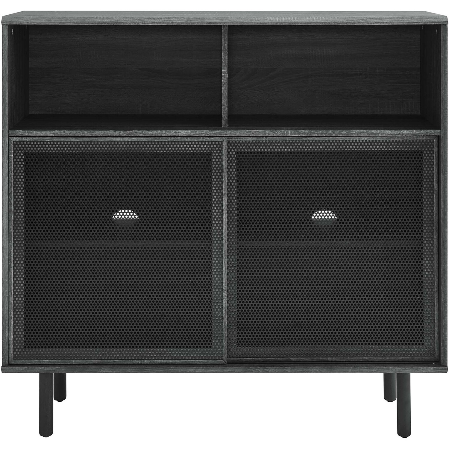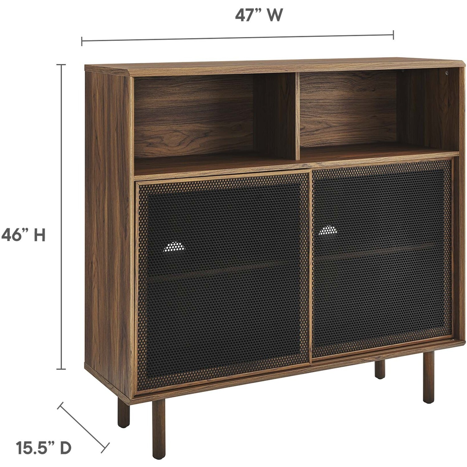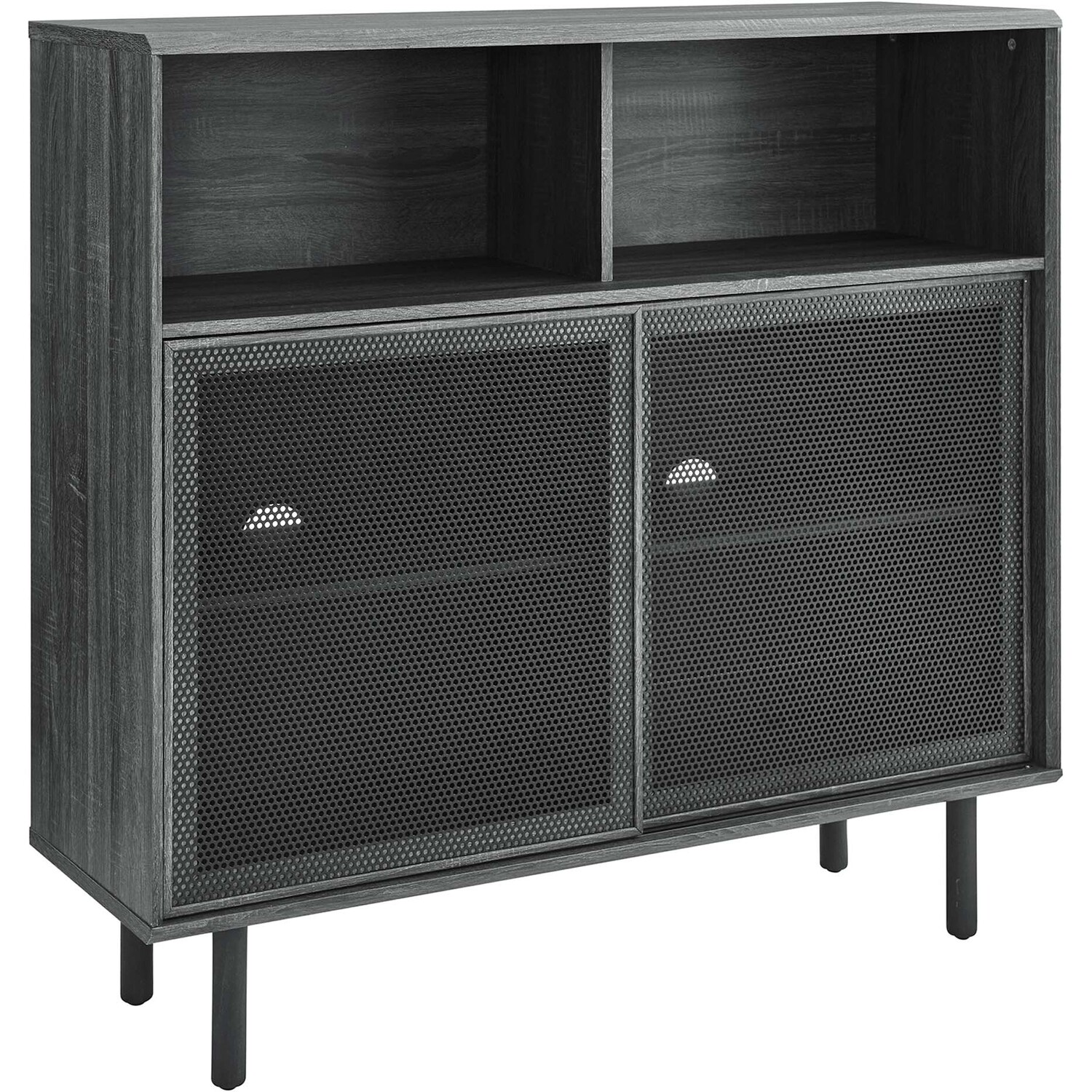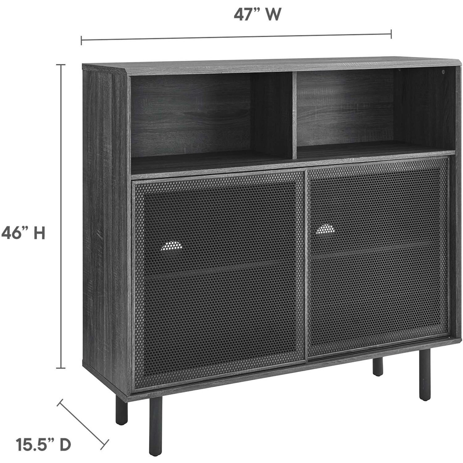 Bring urban flare to your living space with the modern design of the Kurtis 47" Display Cabinet. Featuring sliding metal mesh doors, this storage cabinet brings industrial design to a living room, lounge area, home office, or hallway. This versatile display cabinet is crafted from MDF and particleboard with a natural wood grain design. Offering ample storage space for media essentials, linens, décor, or anything else that suits your needs, this sideboard features open shelving areas partially concealed by mesh sliding doors allowing for both storage and display. Resting on sturdy wood legs with non-marking felt pads to protect flooring, this sideboard doubles as a high TV stand that can accommodate TVs up to 52"es. Assembly required. Weight Capacity: 181 lbs.Modern Display Cabinet