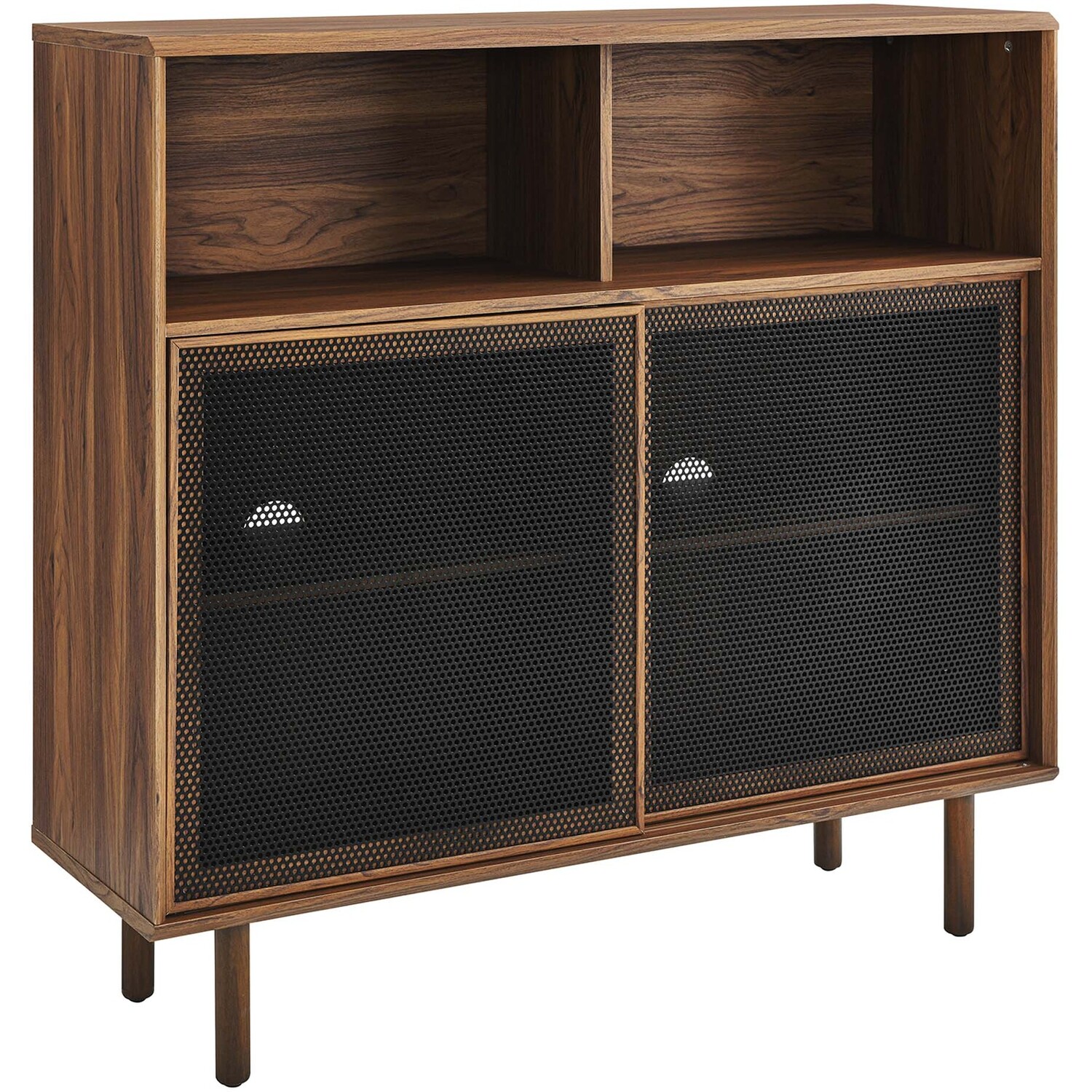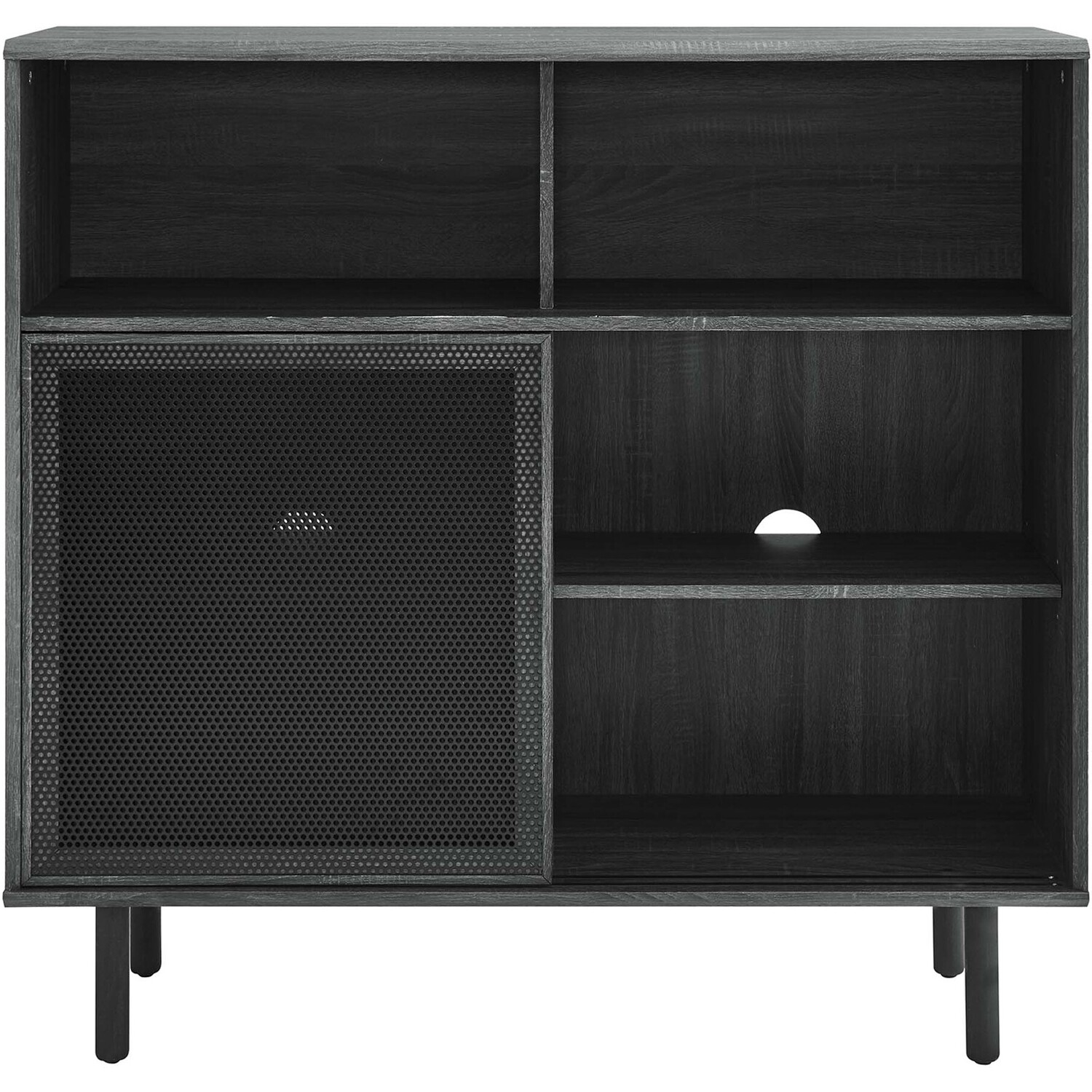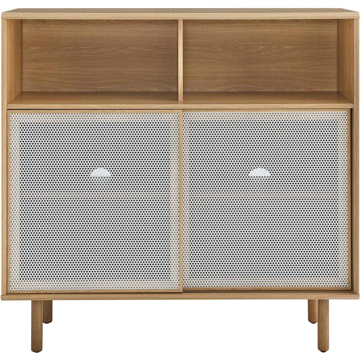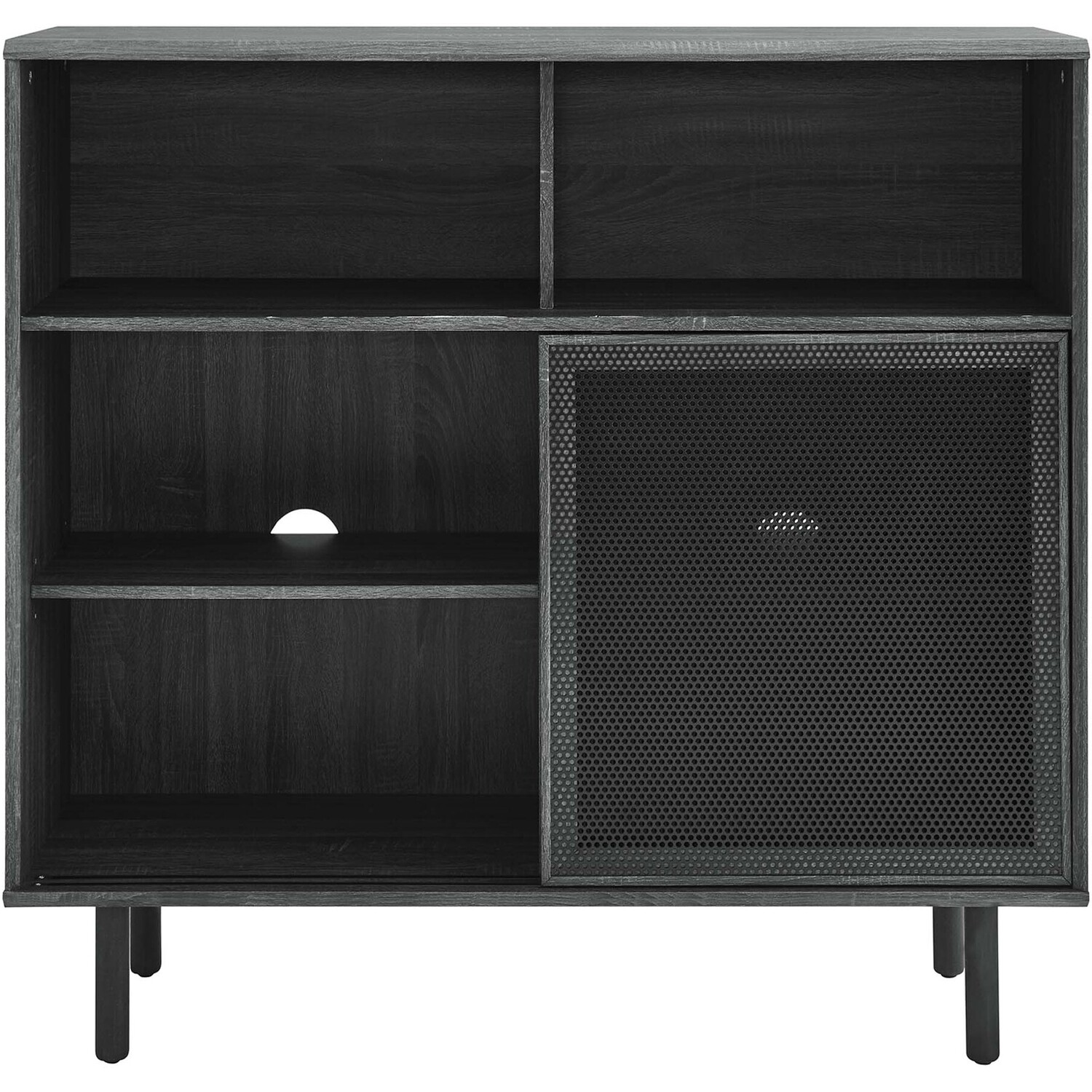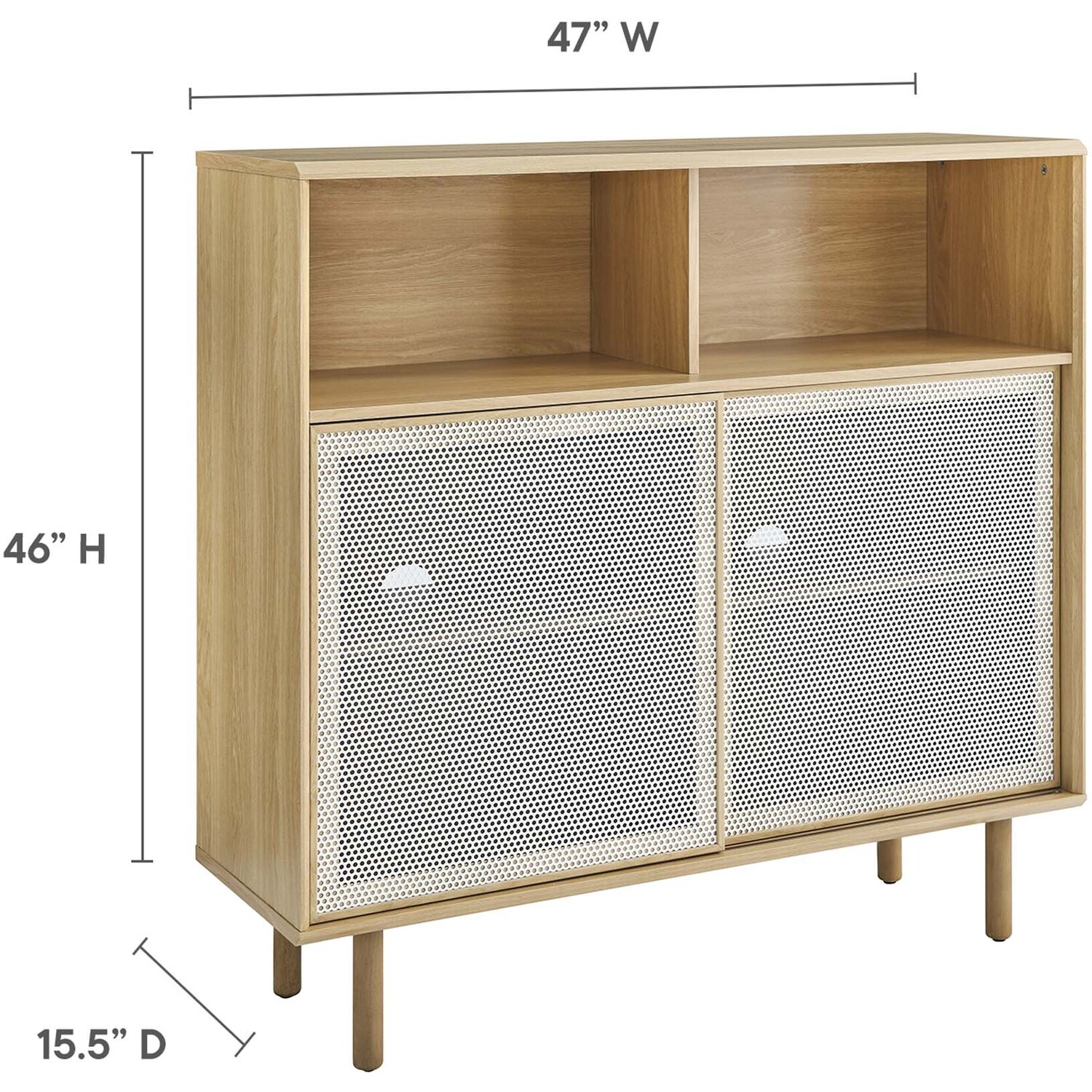 Bring urban flare to your living space with the modern design of the Kurtis 47" Display Cabinet. Featuring sliding metal mesh doors, this storage cabinet brings industrial design to a living room, lounge area, home office, or hallway. This versatile display cabinet is crafted from MDF and particleboard with a natural wood grain design. Offering ample storage space for media essentials, linens, décor, or anything else that suits your needs, this sideboard features open shelving areas partially concealed by mesh sliding doors allowing for both storage and display. Resting on sturdy wood legs with non-marking felt pads to protect flooring, this sideboard doubles as a high TV stand that can accommodate TVs up to 52"es. Assembly required. Weight Capacity: 181 lbs.Modern Display Cabinet