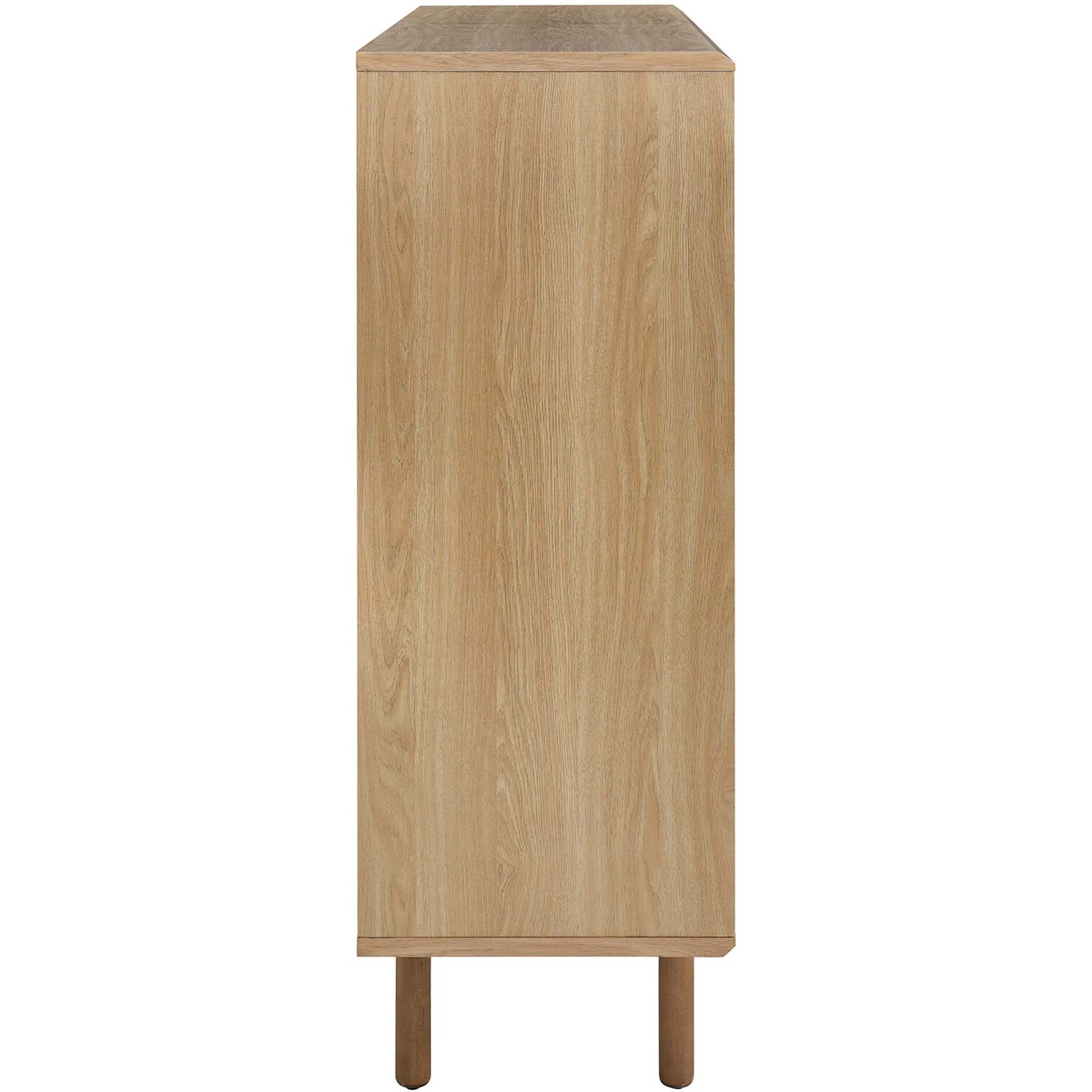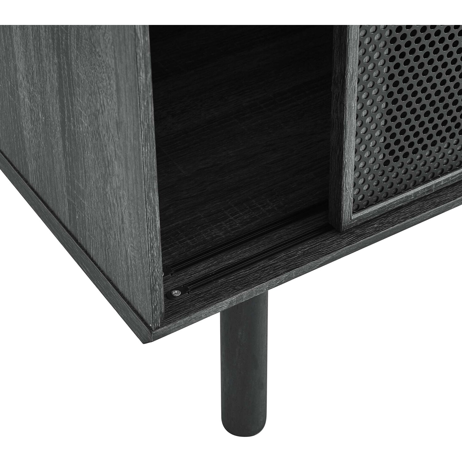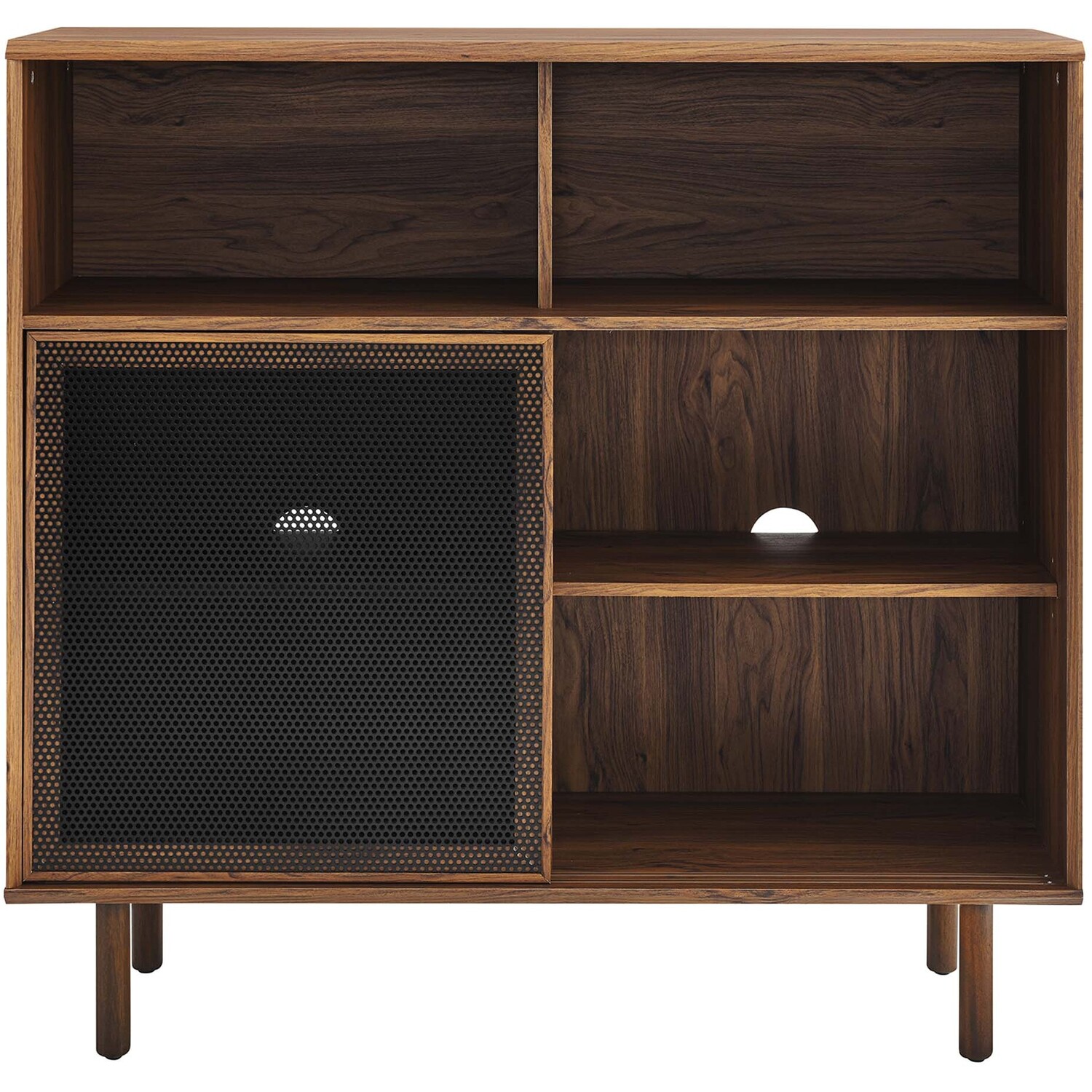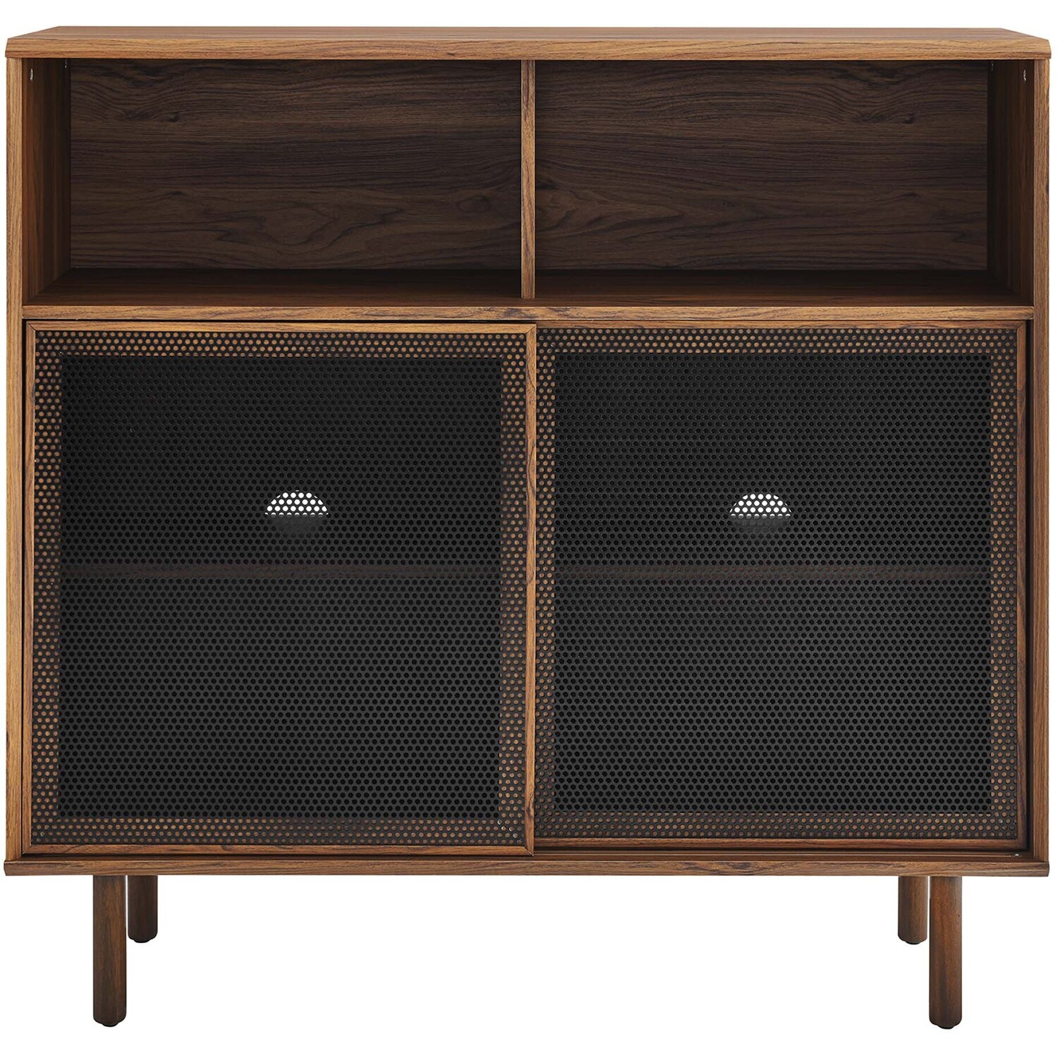 Bring urban flare to your living space with the modern design of the Kurtis 47" Display Cabinet. Featuring sliding metal mesh doors, this storage cabinet brings industrial design to a living room, lounge area, home office, or hallway. This versatile display cabinet is crafted from MDF and particleboard with a natural wood grain design. Offering ample storage space for media essentials, linens, décor, or anything else that suits your needs, this sideboard features open shelving areas partially concealed by mesh sliding doors allowing for both storage and display. Resting on sturdy wood legs with non-marking felt pads to protect flooring, this sideboard doubles as a high TV stand that can accommodate TVs up to 52"es. Assembly required. Weight Capacity: 181 lbs.Modern Display Cabinet