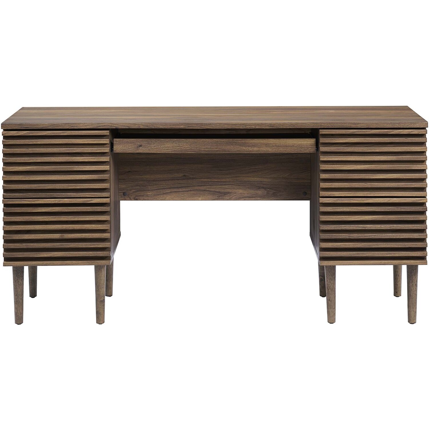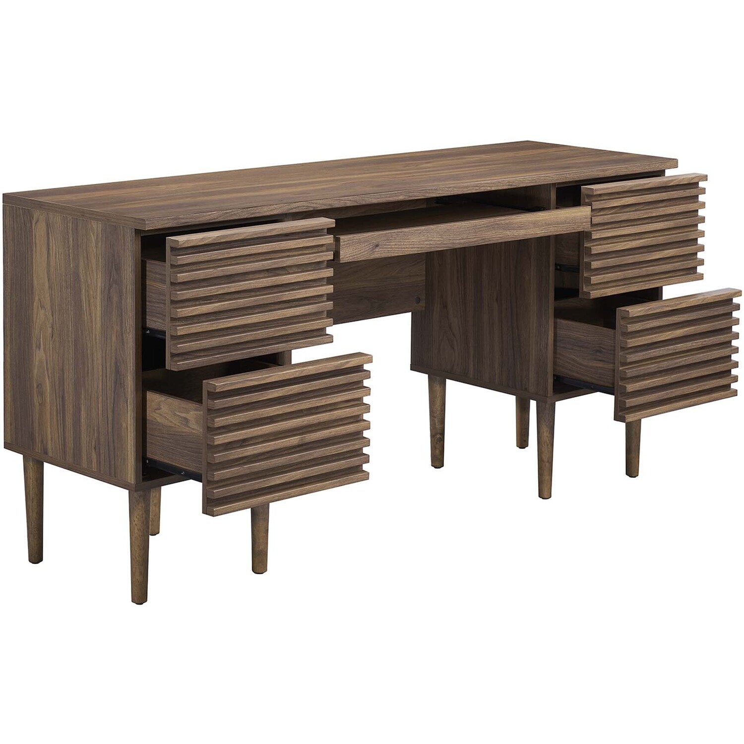 Tap into mid-century aesthetics with the Render Office Desk. This office desk features a durable particleboard frame with a smooth walnut grain laminate. A pull-out keyboard tray and four full-extension glide drawers offer ample storage space for all your office essentials. Boasting a mid-century modern style and resting on tapered wood legs, this computer desk features a solid construction with a pleasing look and practical functionality. Perfect for the apartment, home office, or dorm room. Includes non-marking foot pads. Assembly required.Mid-Century Office Desk