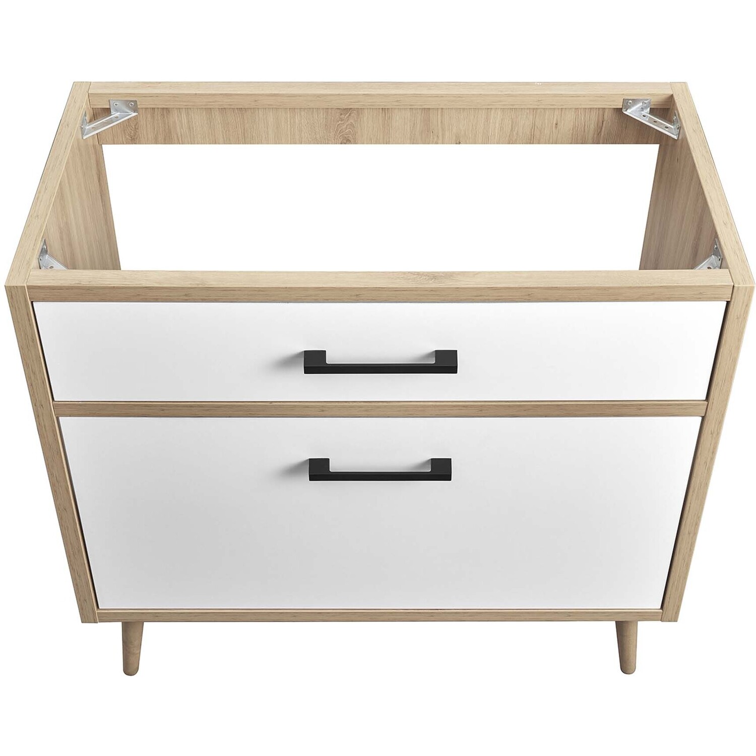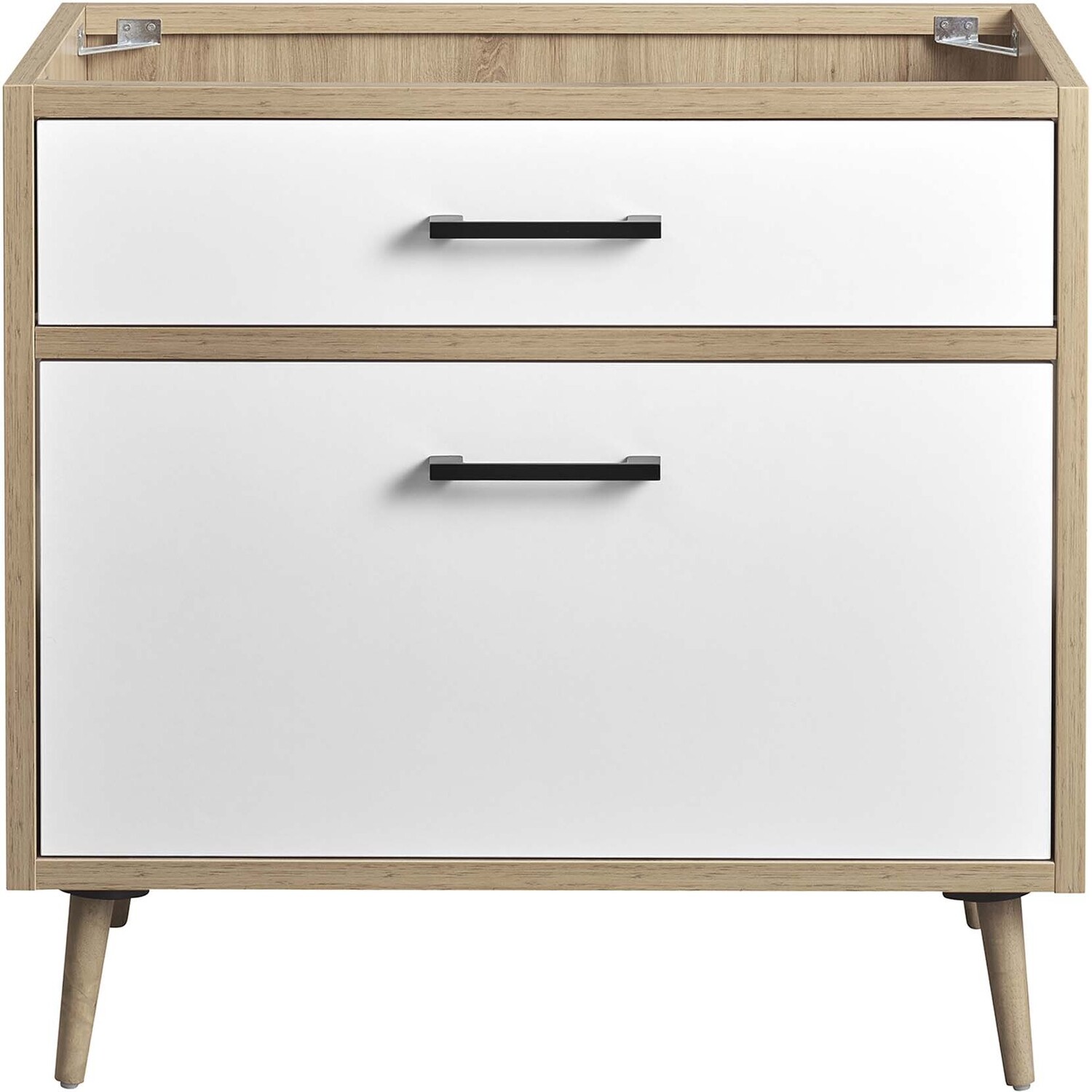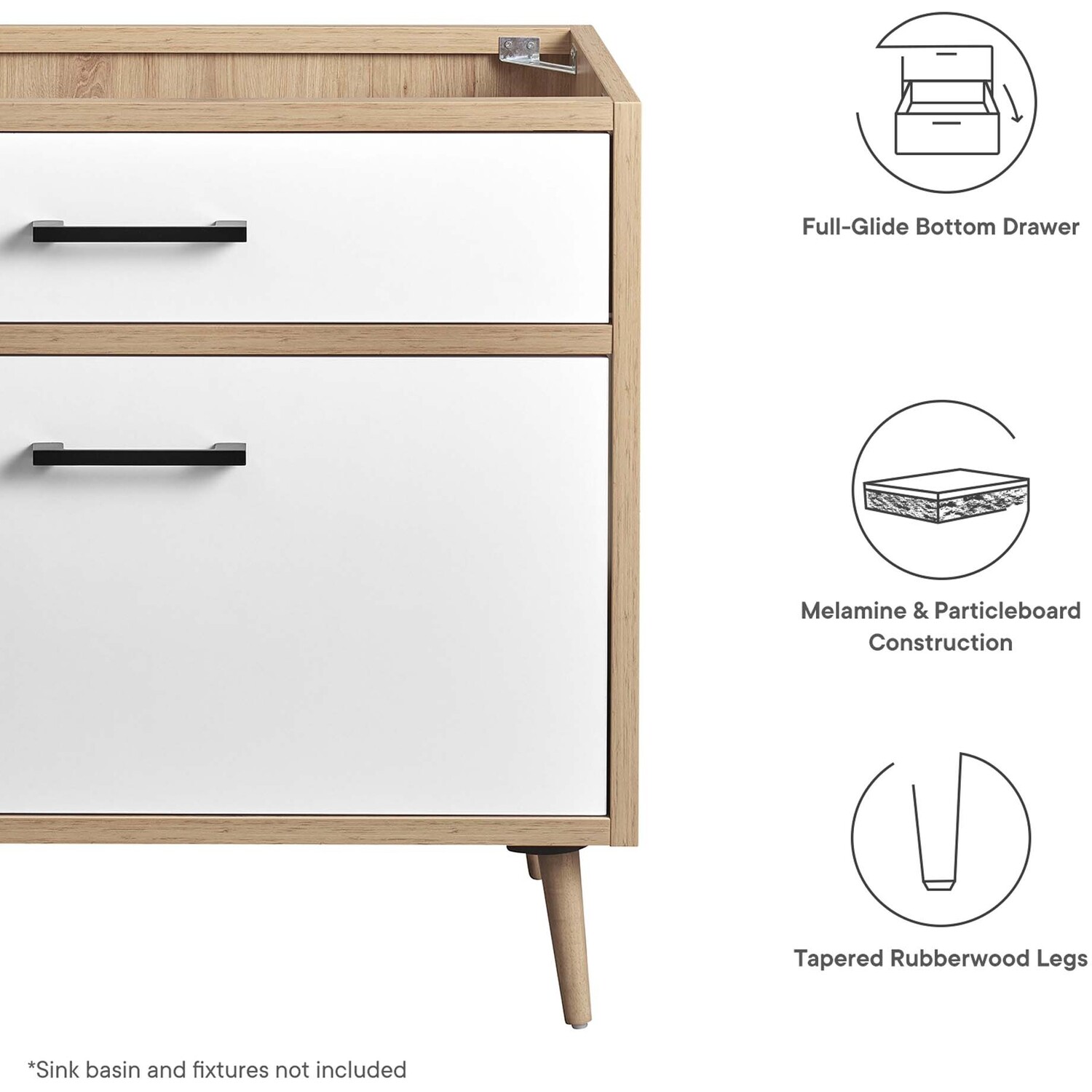 The Maverick 36" Bathroom Vanity Cabinet is the perfect blend of modern style and convenience. Crafted with particleboard and melamine, the simple yet elegant design is enhanced by modern metal handle pulls and tapered and splayed rubberwood legs. The spacious full-glide bottom drawer provides plenty of storage space for all your bathroom essentials, while the fixed top drawer adds complementing style. This bathroom vanity cabinet instantly transforms your space, creating a beautiful, modern look that will last for years. Includes non-marking foot glides to protect flooring. Assembly required. Fixtures and sink basin not included.Modern 36" Bathroom Vanity Cabinet