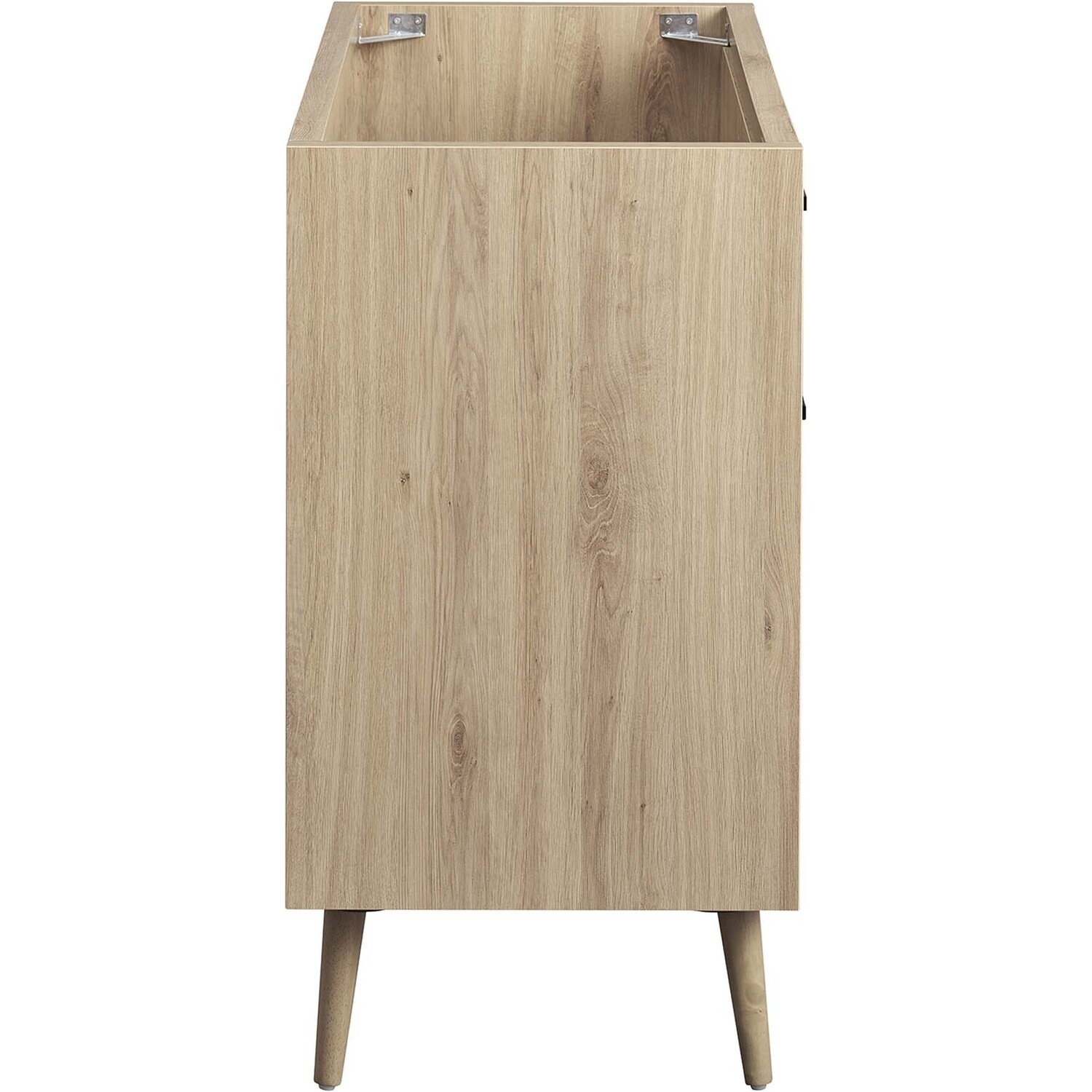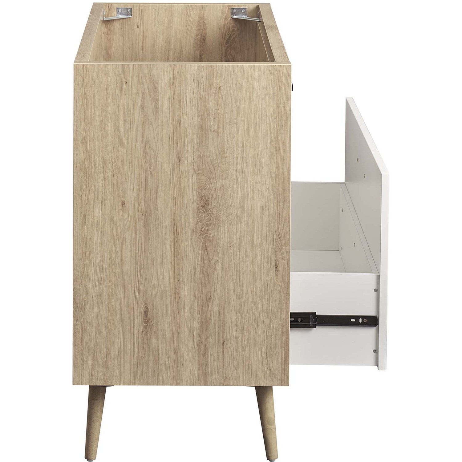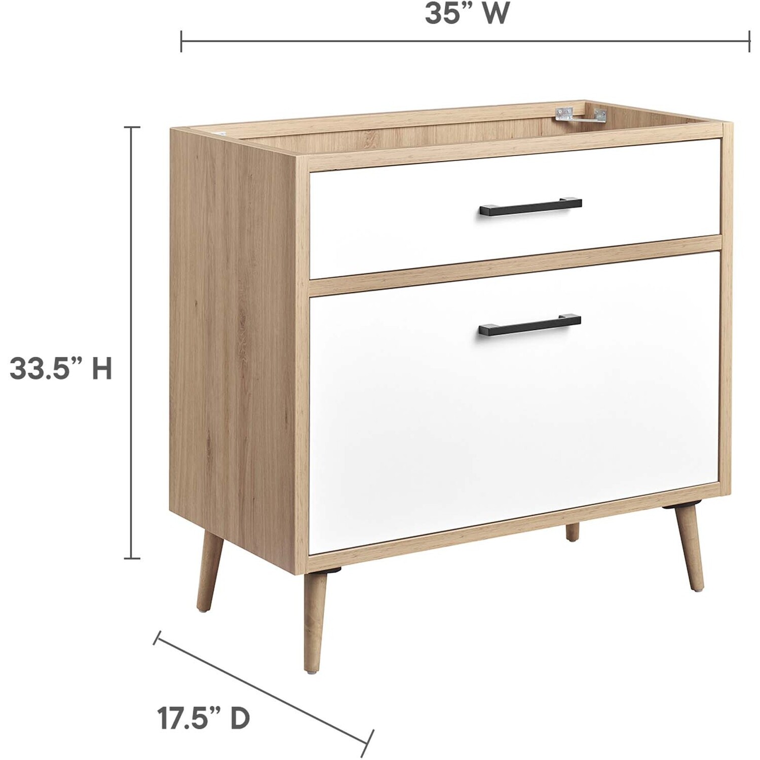 The Maverick 36" Bathroom Vanity Cabinet is the perfect blend of modern style and convenience. Crafted with particleboard and melamine, the simple yet elegant design is enhanced by modern metal handle pulls and tapered and splayed rubberwood legs. The spacious full-glide bottom drawer provides plenty of storage space for all your bathroom essentials, while the fixed top drawer adds complementing style. This bathroom vanity cabinet instantly transforms your space, creating a beautiful, modern look that will last for years. Includes non-marking foot glides to protect flooring. Assembly required. Fixtures and sink basin not included.Modern 36" Bathroom Vanity Cabinet