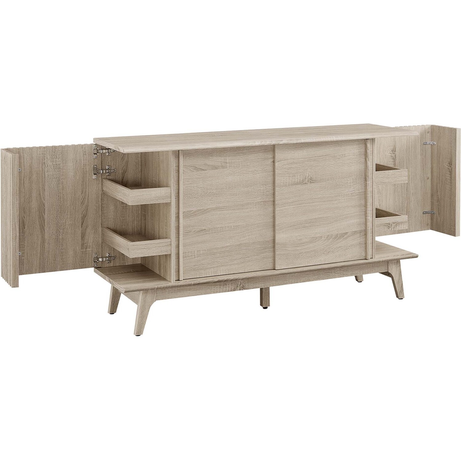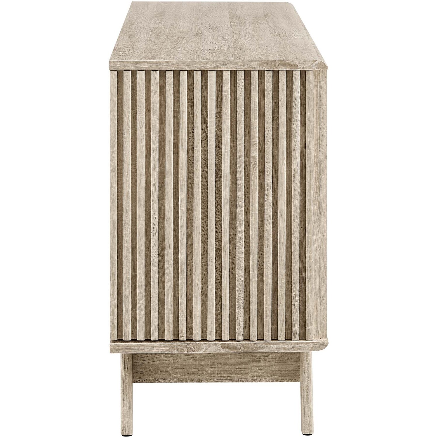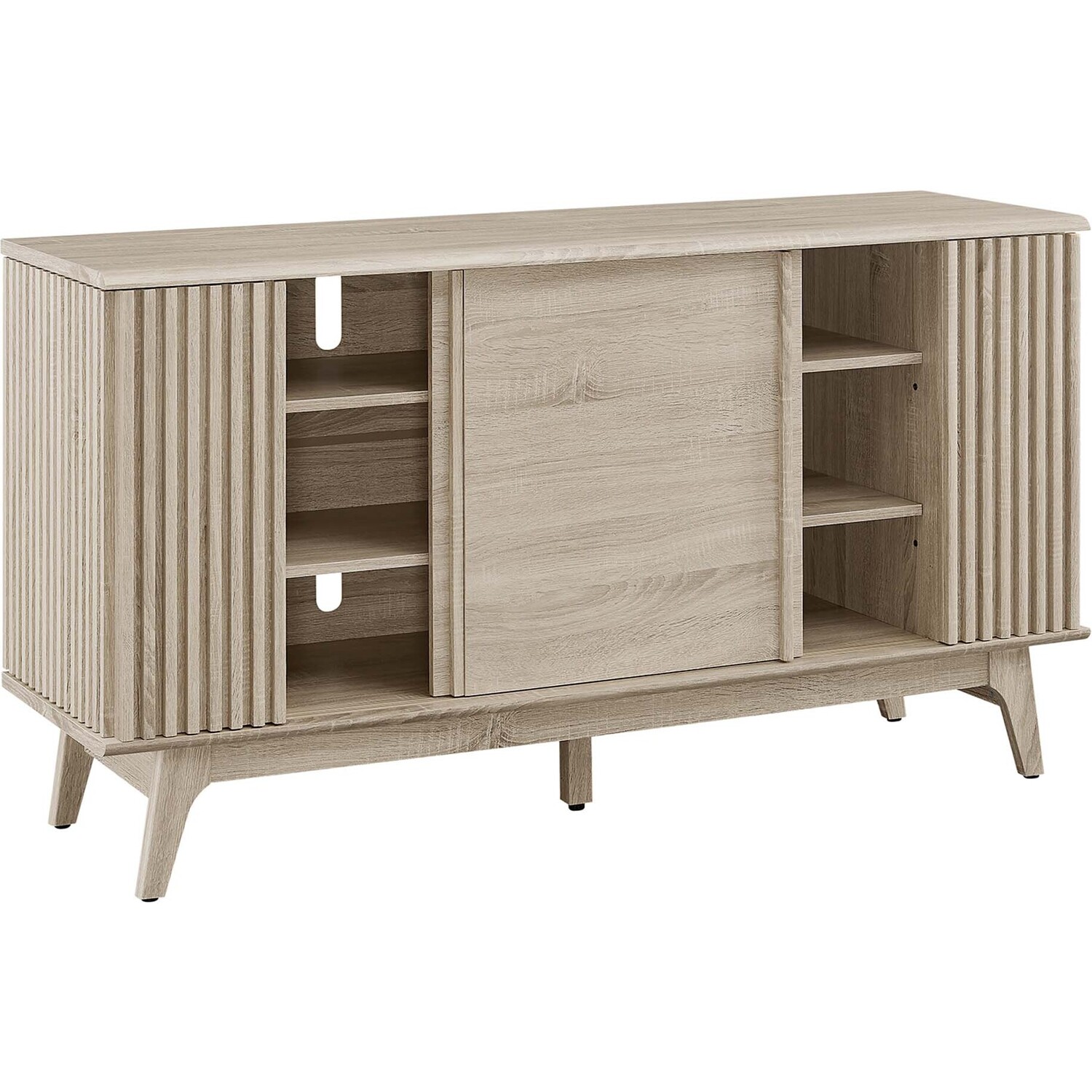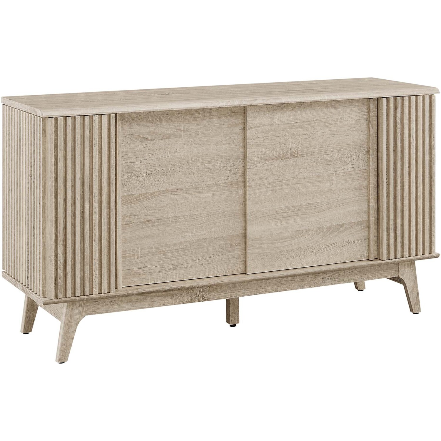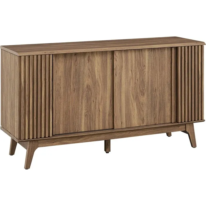 Transform your living space with the Eudora Sideboard. Constructed with MDF and particleboard with a beautiful wood grain design, this sideboard is both stylish and durable. Offering spacious storage in the living room, entryway, dining area, or other living space. This versatile piece can also serve as a high TV stand with its ample storage space for media essentials and cable management holes. Vertical slatting on the sides grants elegant definition to its overall look. The shelving areas are concealed by two sliding doors and hinged corner doors granting more than enough space to store serving pieces, bar essentials, home accessories, and more. The corner storage space can conveniently store remotes, silverware, glasses, barware, and whatever else suits your needs. Bringing mid-century inspiration to the home, its splayed base and non-marking foot pads ensure stability and protect your floors from scratches. Assembly is required, but our easy-to-follow instructions make it a breeze. Weight Capacity: 200 lbs. Please Note: When placing the TV directly on the unit, we recommend anchoring it in place.Modern Sideboard