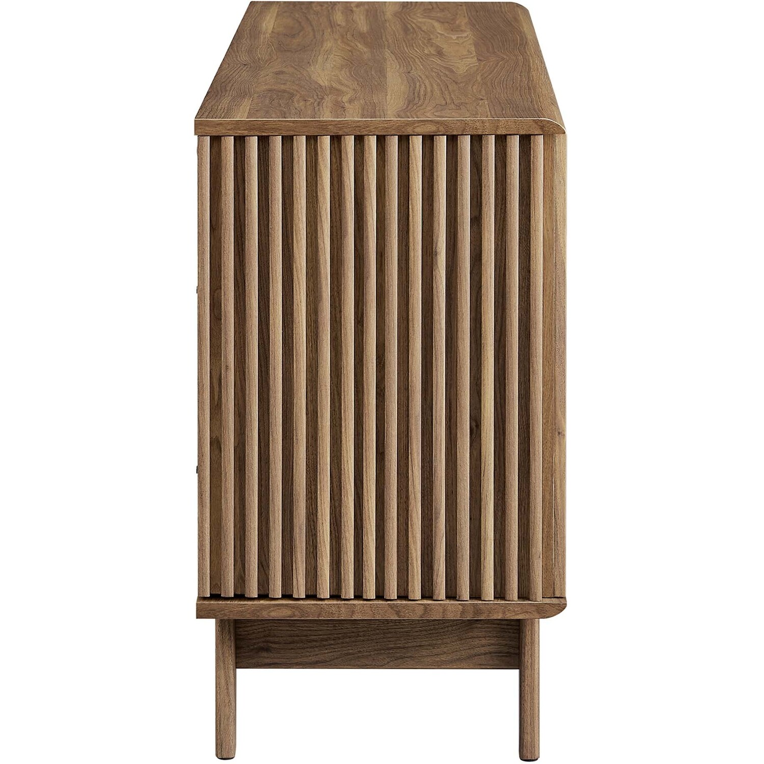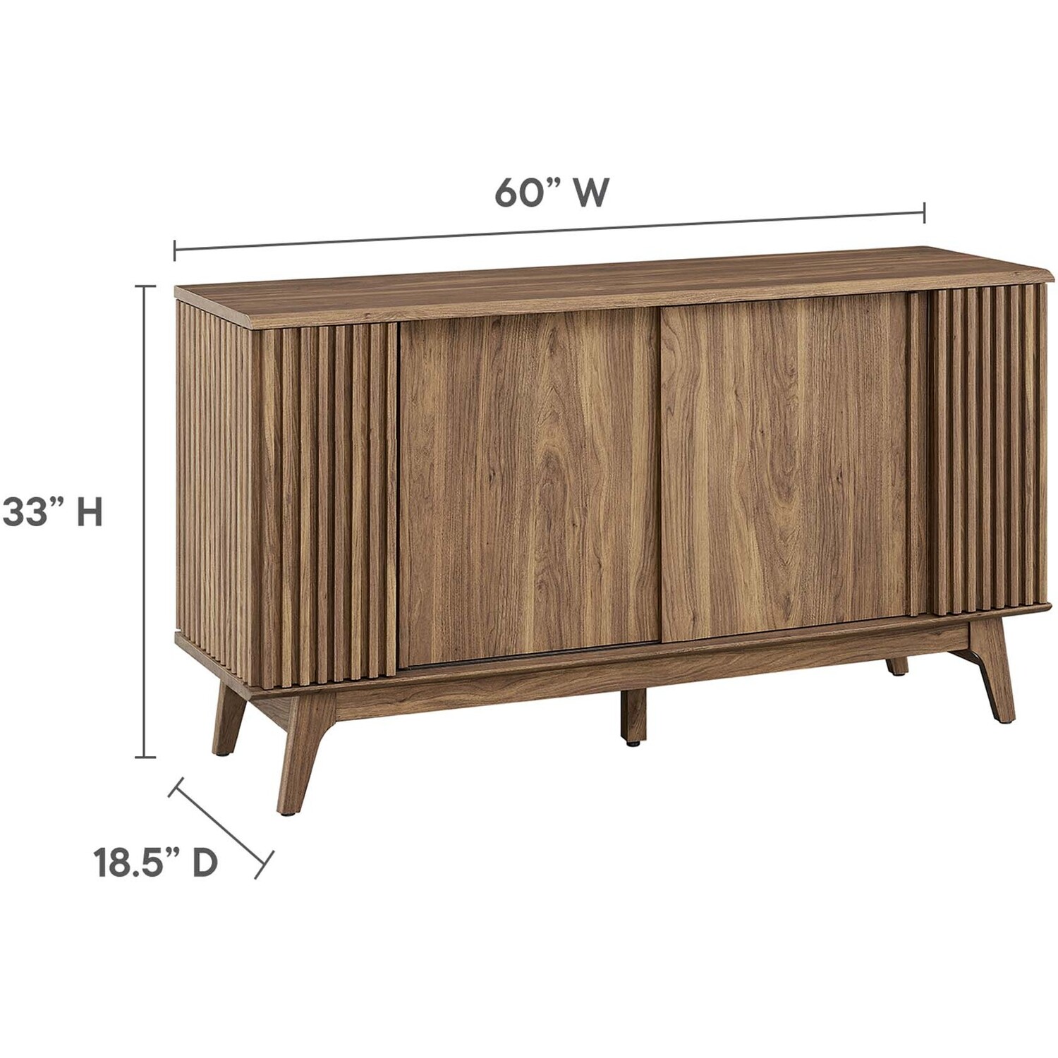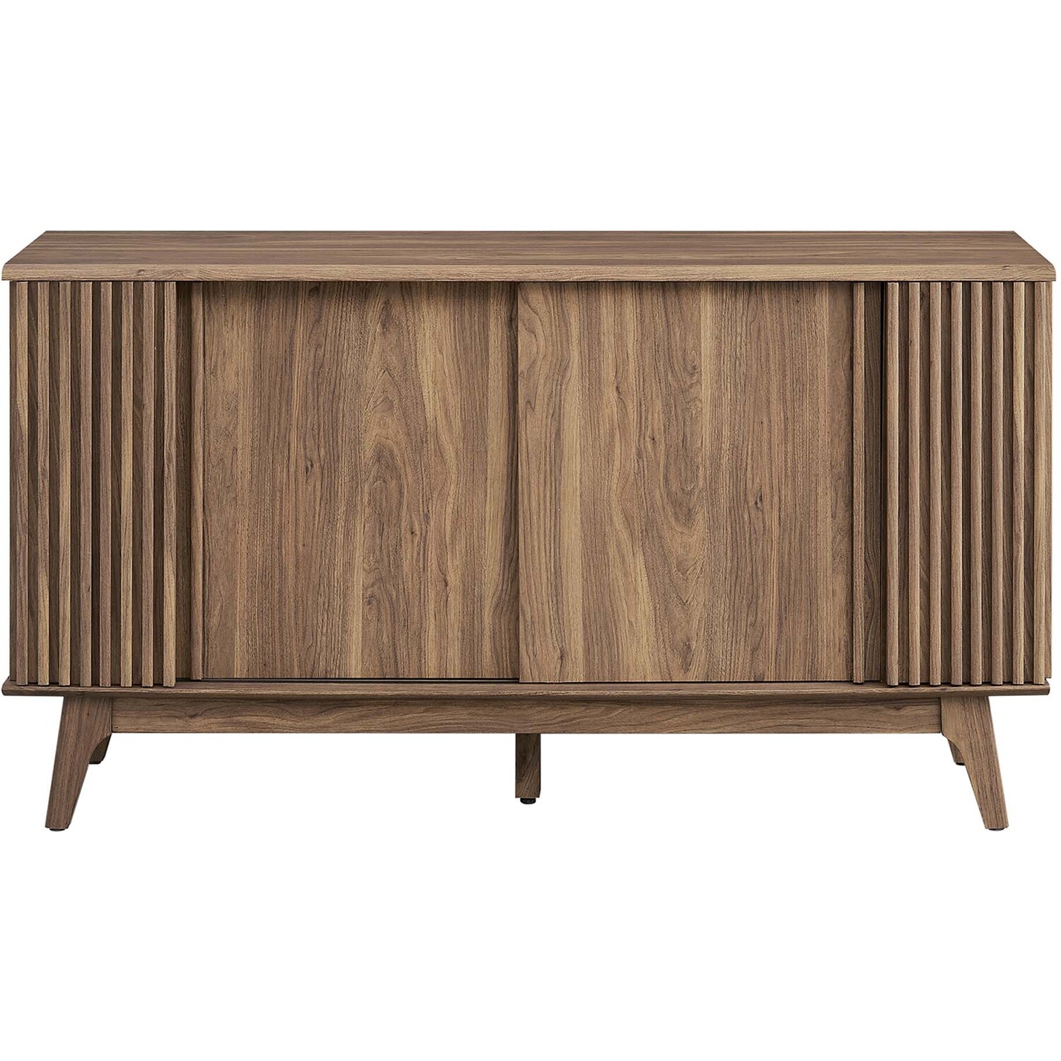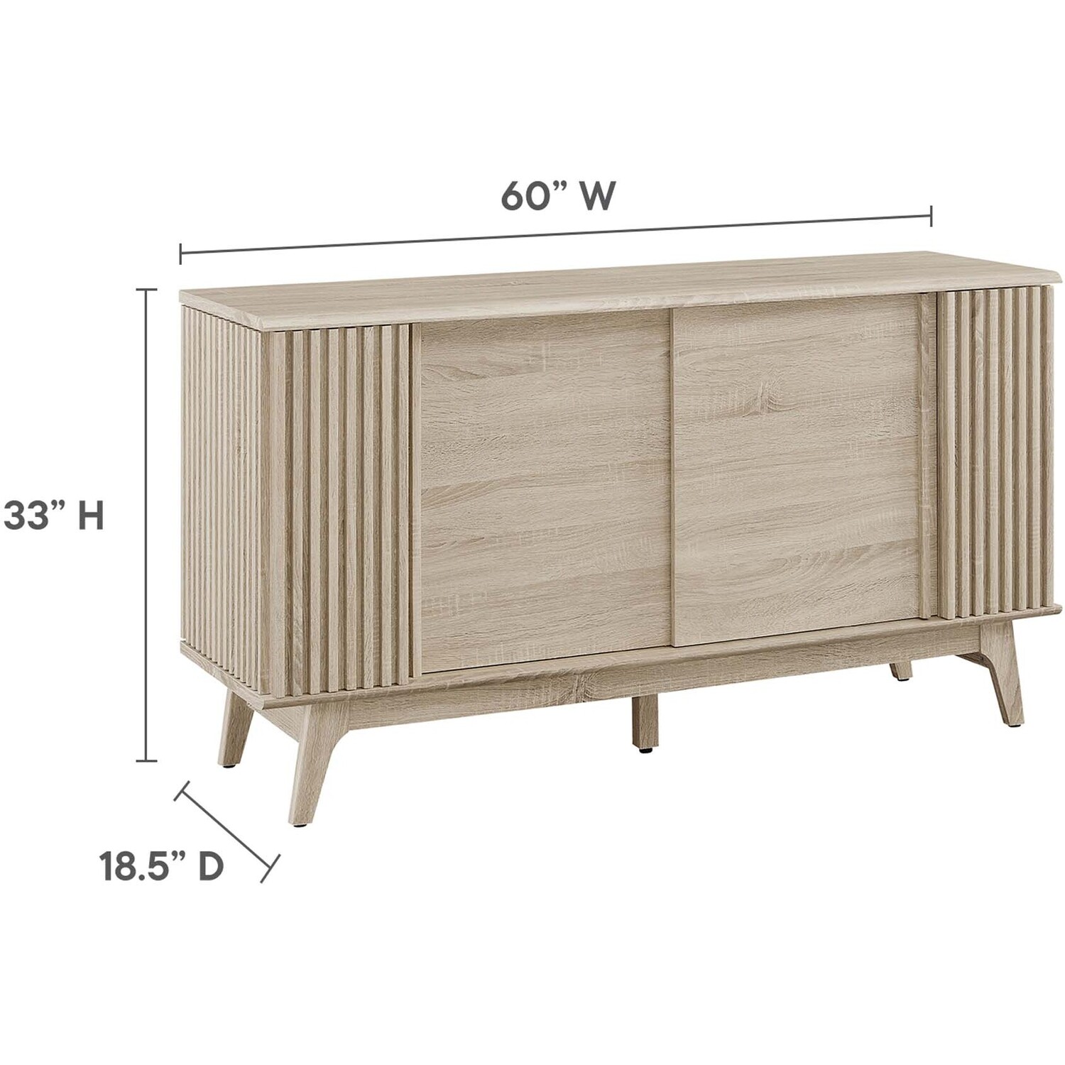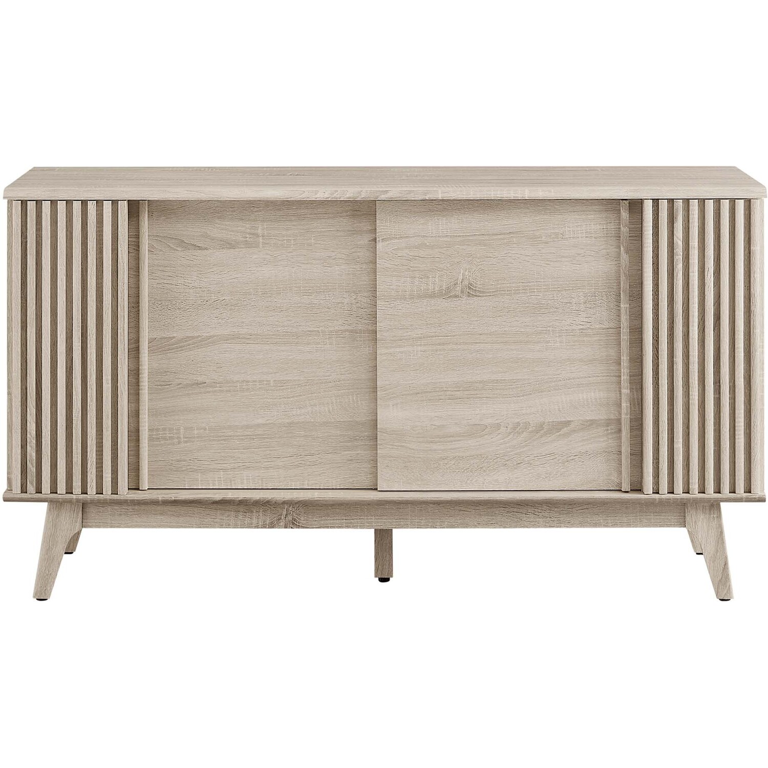 Transform your living space with the Eudora Sideboard. Constructed with MDF and particleboard with a beautiful wood grain design, this sideboard is both stylish and durable. Offering spacious storage in the living room, entryway, dining area, or other living space. This versatile piece can also serve as a high TV stand with its ample storage space for media essentials and cable management holes. Vertical slatting on the sides grants elegant definition to its overall look. The shelving areas are concealed by two sliding doors and hinged corner doors granting more than enough space to store serving pieces, bar essentials, home accessories, and more. The corner storage space can conveniently store remotes, silverware, glasses, barware, and whatever else suits your needs. Bringing mid-century inspiration to the home, its splayed base and non-marking foot pads ensure stability and protect your floors from scratches. Assembly is required, but our easy-to-follow instructions make it a breeze. Weight Capacity: 200 lbs. Please Note: When placing the TV directly on the unit, we recommend anchoring it in place.Modern Sideboard