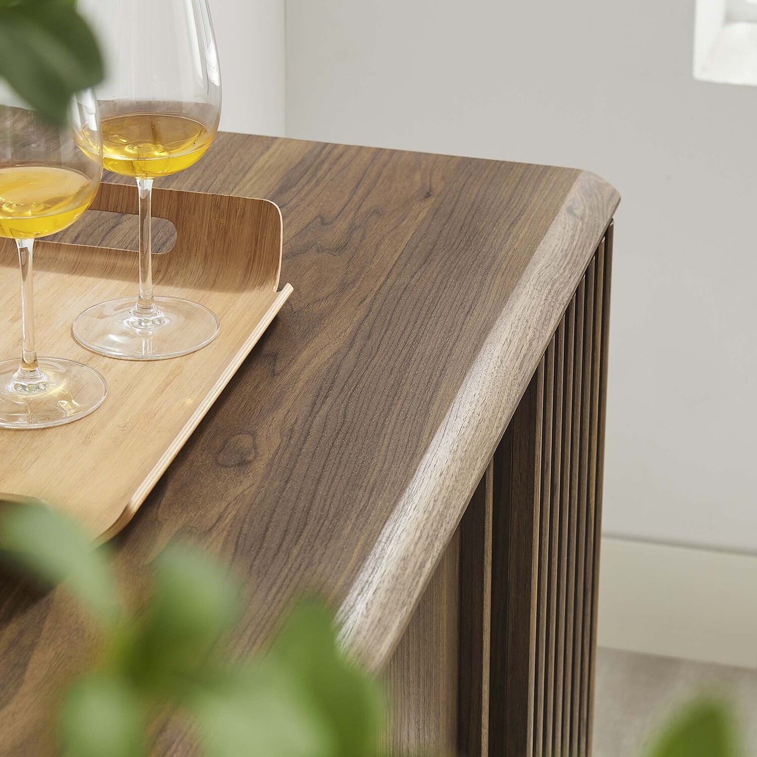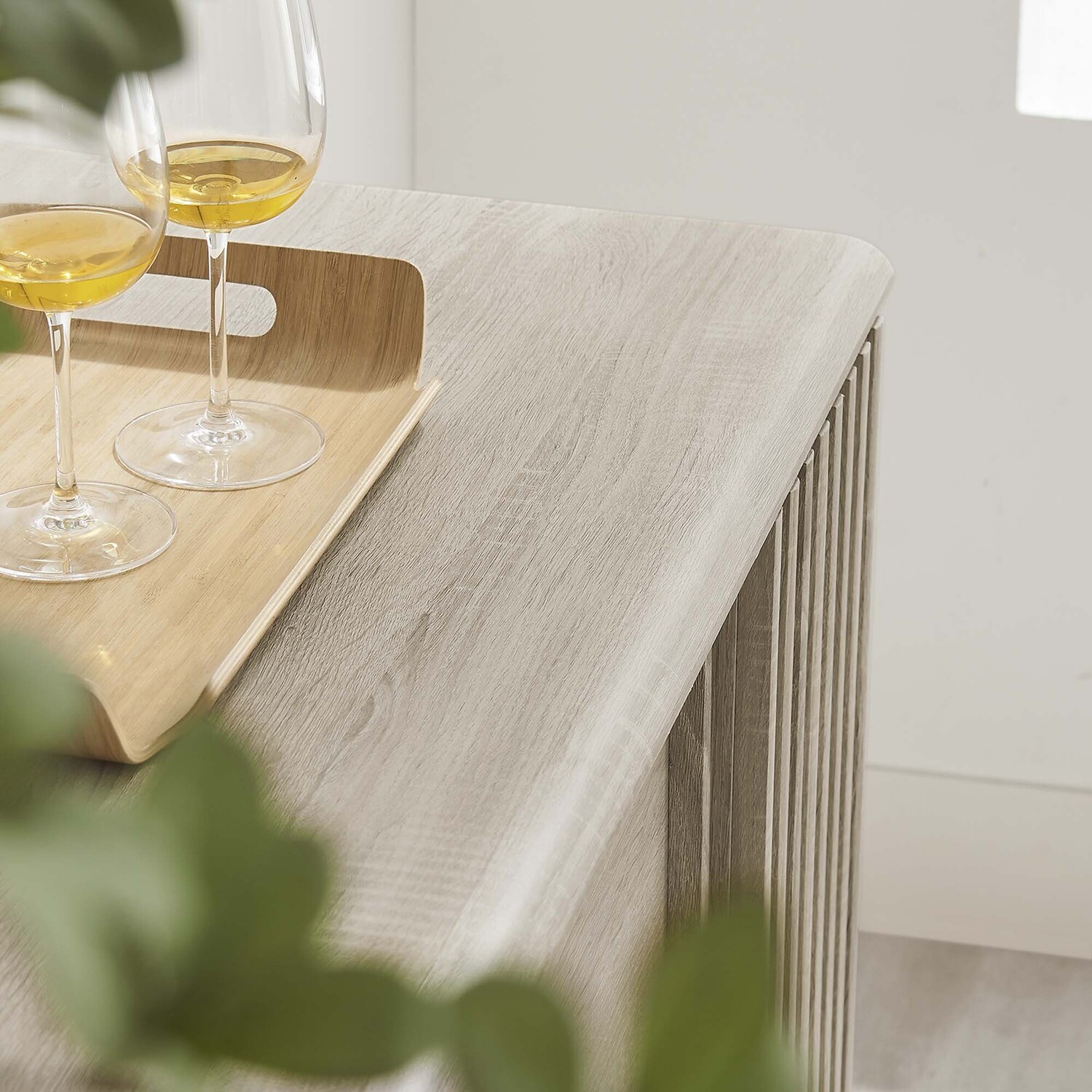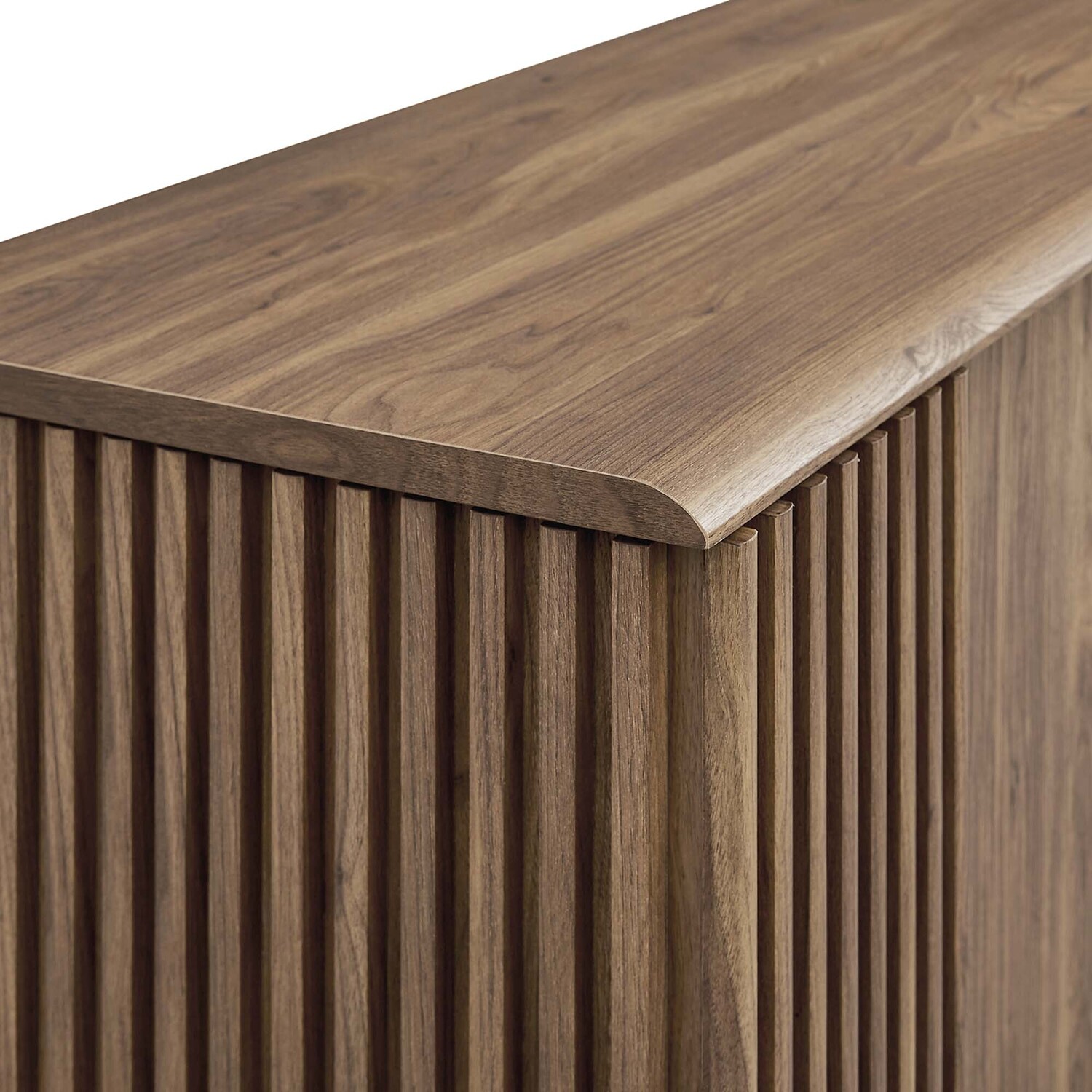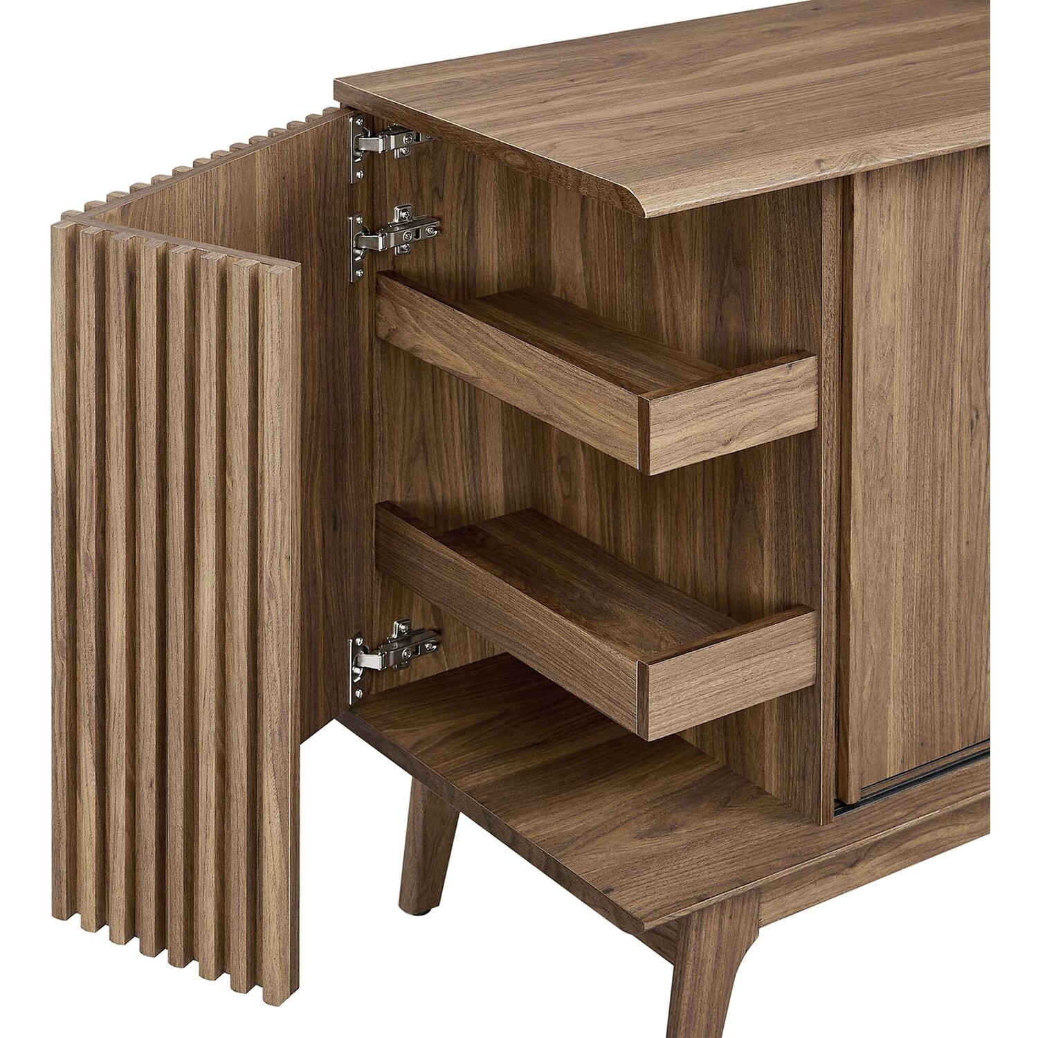 Transform your living space with the Eudora Sideboard. Constructed with MDF and particleboard with a beautiful wood grain design, this sideboard is both stylish and durable. Offering spacious storage in the living room, entryway, dining area, or other living space. This versatile piece can also serve as a high TV stand with its ample storage space for media essentials and cable management holes. Vertical slatting on the sides grants elegant definition to its overall look. The shelving areas are concealed by two sliding doors and hinged corner doors granting more than enough space to store serving pieces, bar essentials, home accessories, and more. The corner storage space can conveniently store remotes, silverware, glasses, barware, and whatever else suits your needs. Bringing mid-century inspiration to the home, its splayed base and non-marking foot pads ensure stability and protect your floors from scratches. Assembly is required, but our easy-to-follow instructions make it a breeze. Weight Capacity: 200 lbs. Please Note: When placing the TV directly on the unit, we recommend anchoring it in place.Modern Sideboard