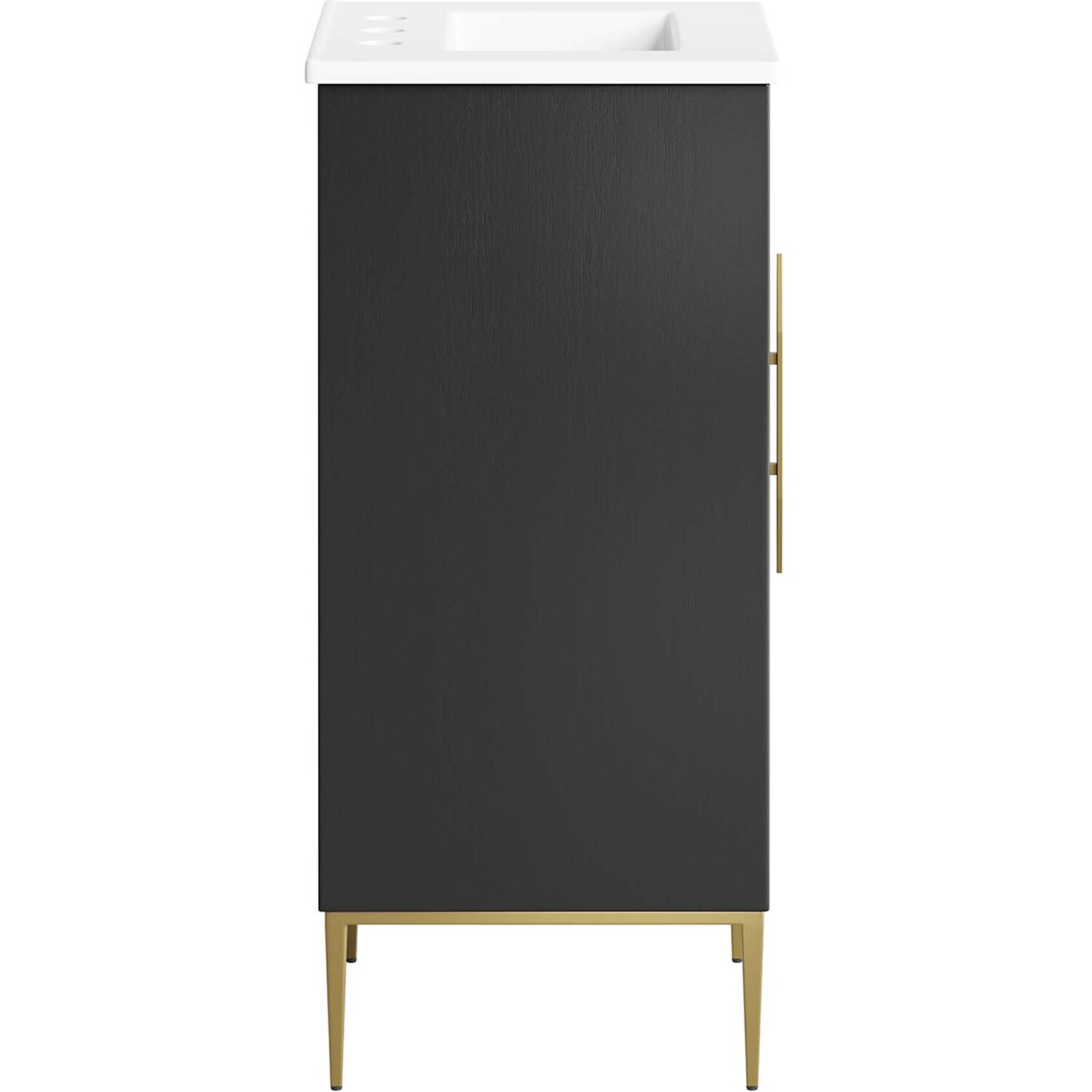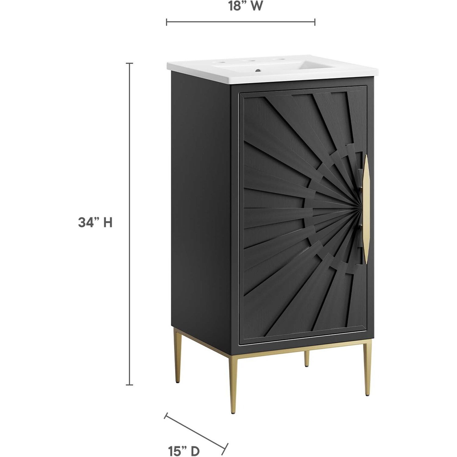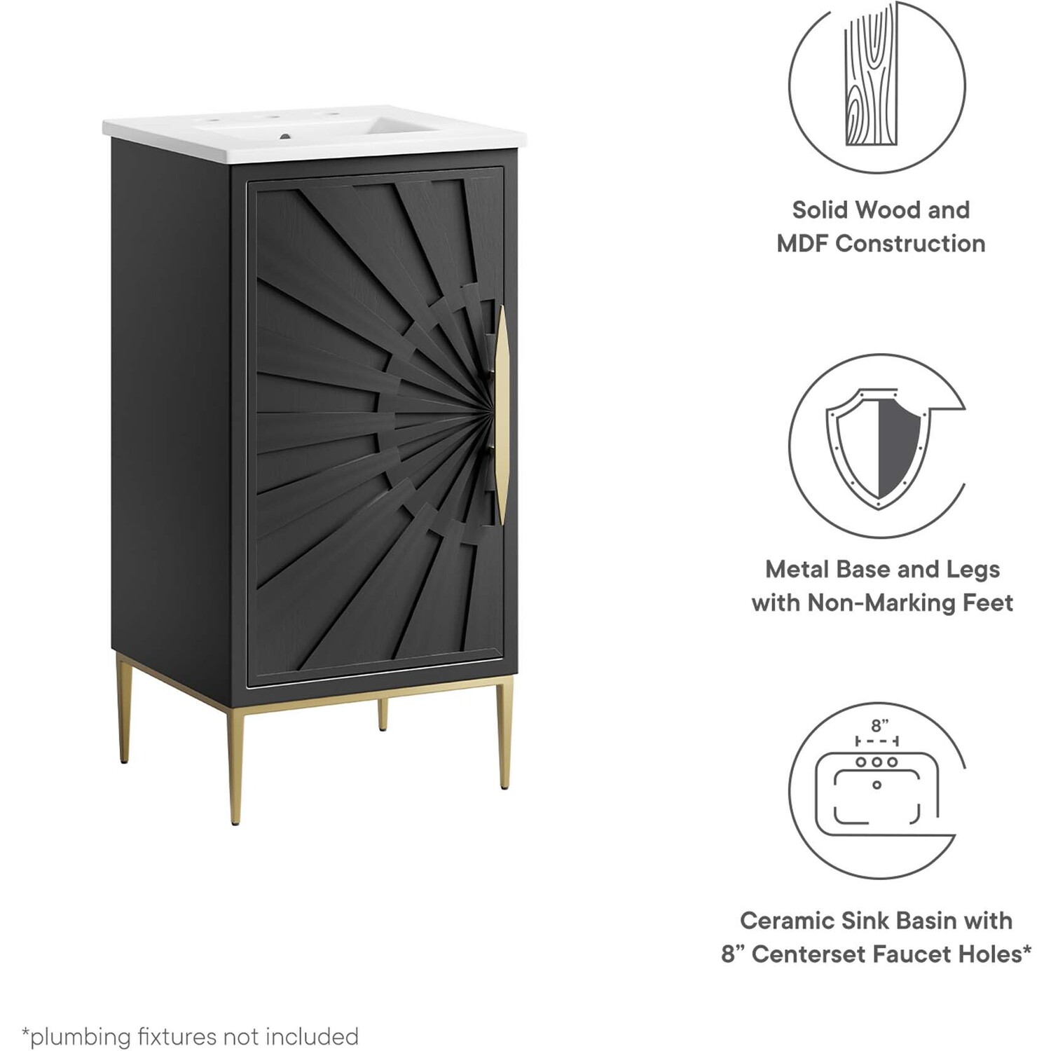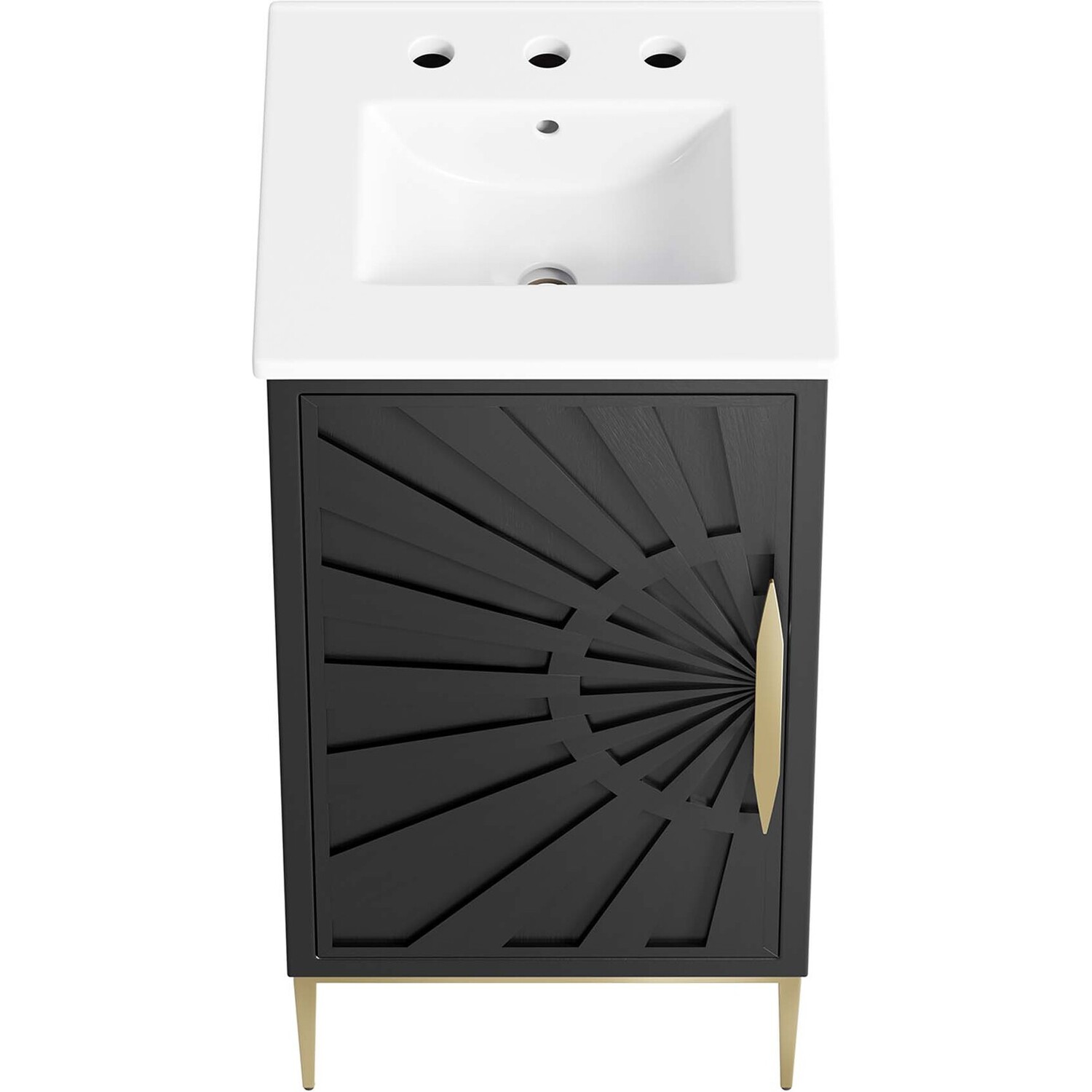 Intricate modernity radiates into your bathroom space with the Awaken 18" Bathroom Vanity. Showcasing clean lines arranged in a radial formation, this bathroom vanity is crafted with solid wood and MDF and rests on a gold base with non-marking foot pads to protect flooring. This vanity is a complete addition to a bathroom with a ceramic sink basin with an integrated countertop and 8" centerset holes. Offering ample storage space for bathroom essentials and more, this vanity cabinet features spacious shelves hidden behind a detailed door with sleek gold hardware. Fixtures not included. Assembly required.Modern Bathroom Vanity Cabinet