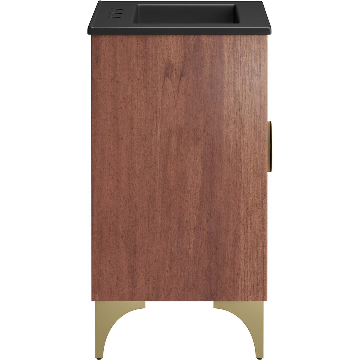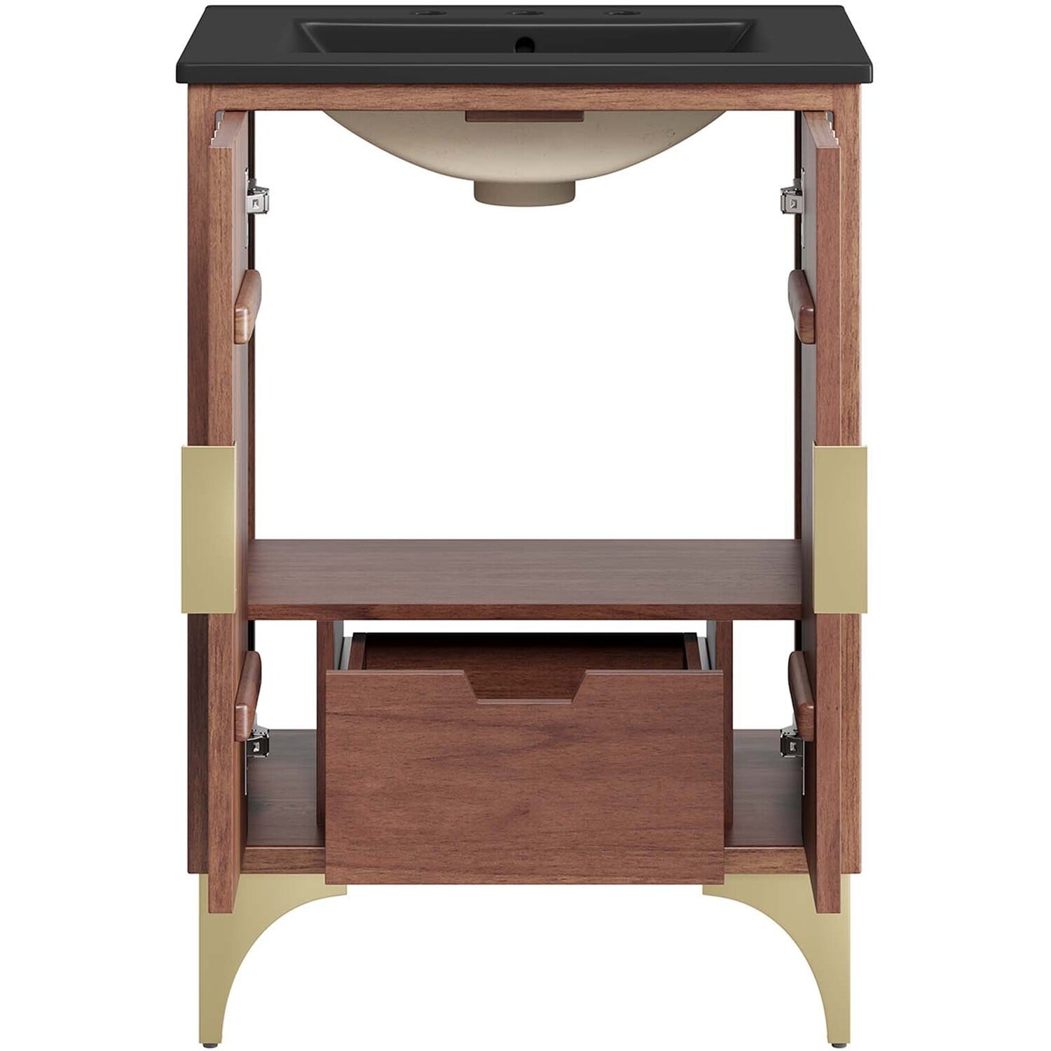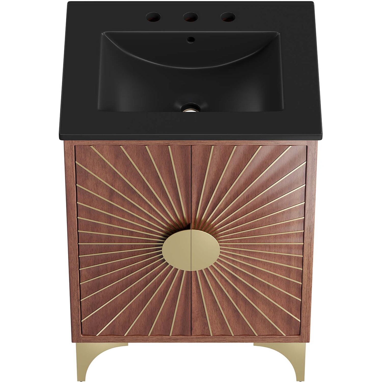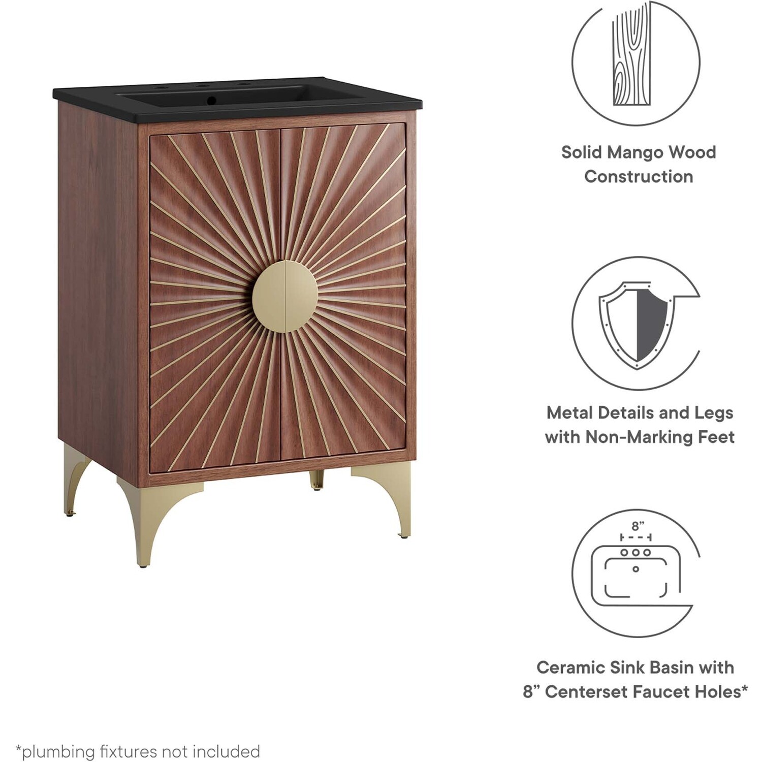 Bring refreshing energy into your bathroom space with the Daylight 24" Bathroom Vanity. Beautifully crafted with solid mango wood and a rich wood stain, this bathroom cabinet features a sun ray design made possible through intricate powder-coated brass details and hardware. This vanity cabinet is a complete addition to a bathroom with a ceramic sink basin and an integrated countertop with 8" centerset holes. Resting on a brass base with arched details and non-marking foot caps, this bathroom vanity offers ample storage space for bathroom essentials with the spacious open shelf and pull-out drawer. Fixtures not included. Assembly required.Modern Bathroom Vanity Cabinet