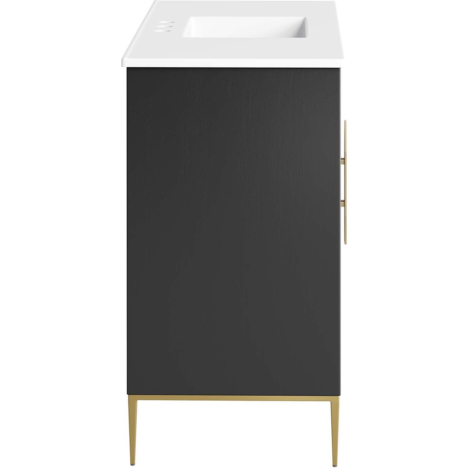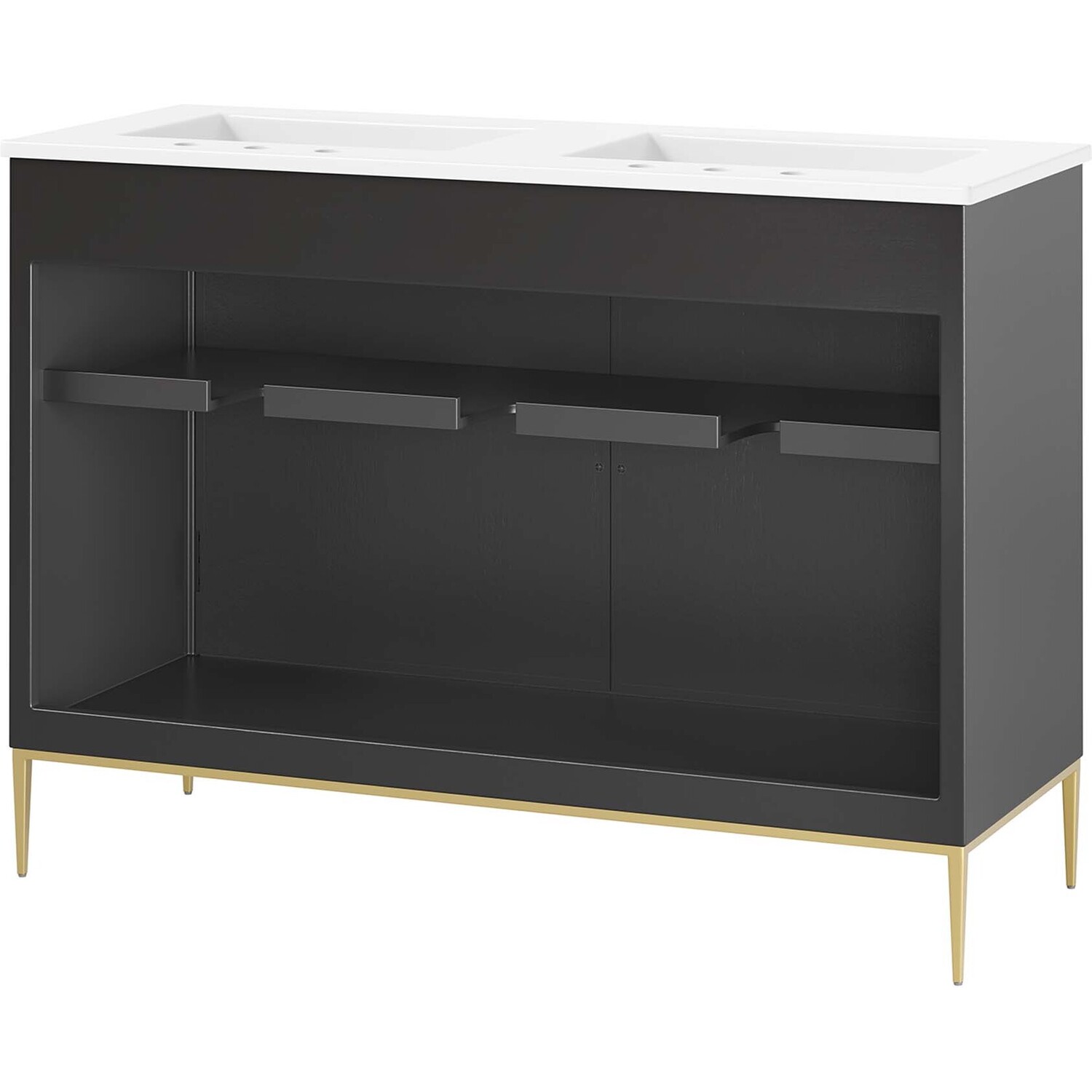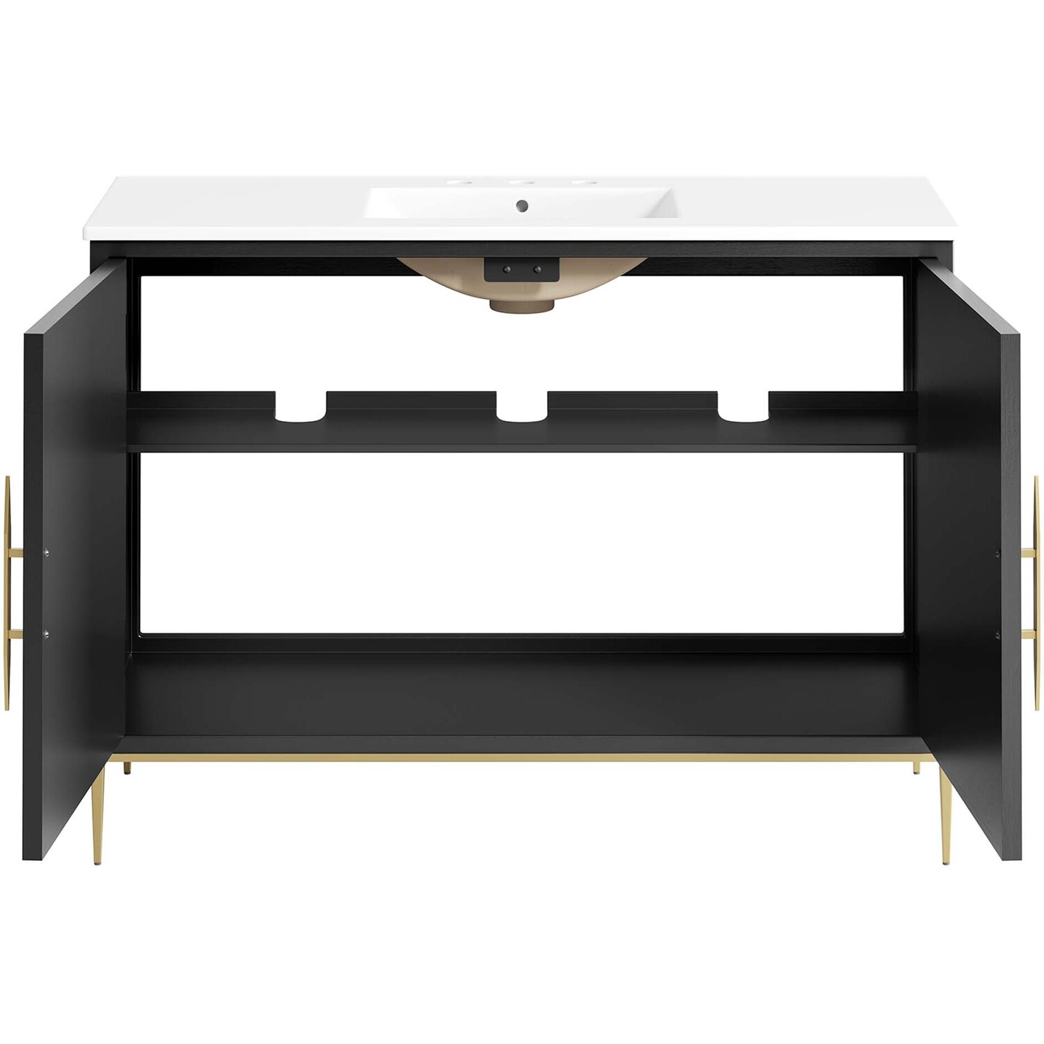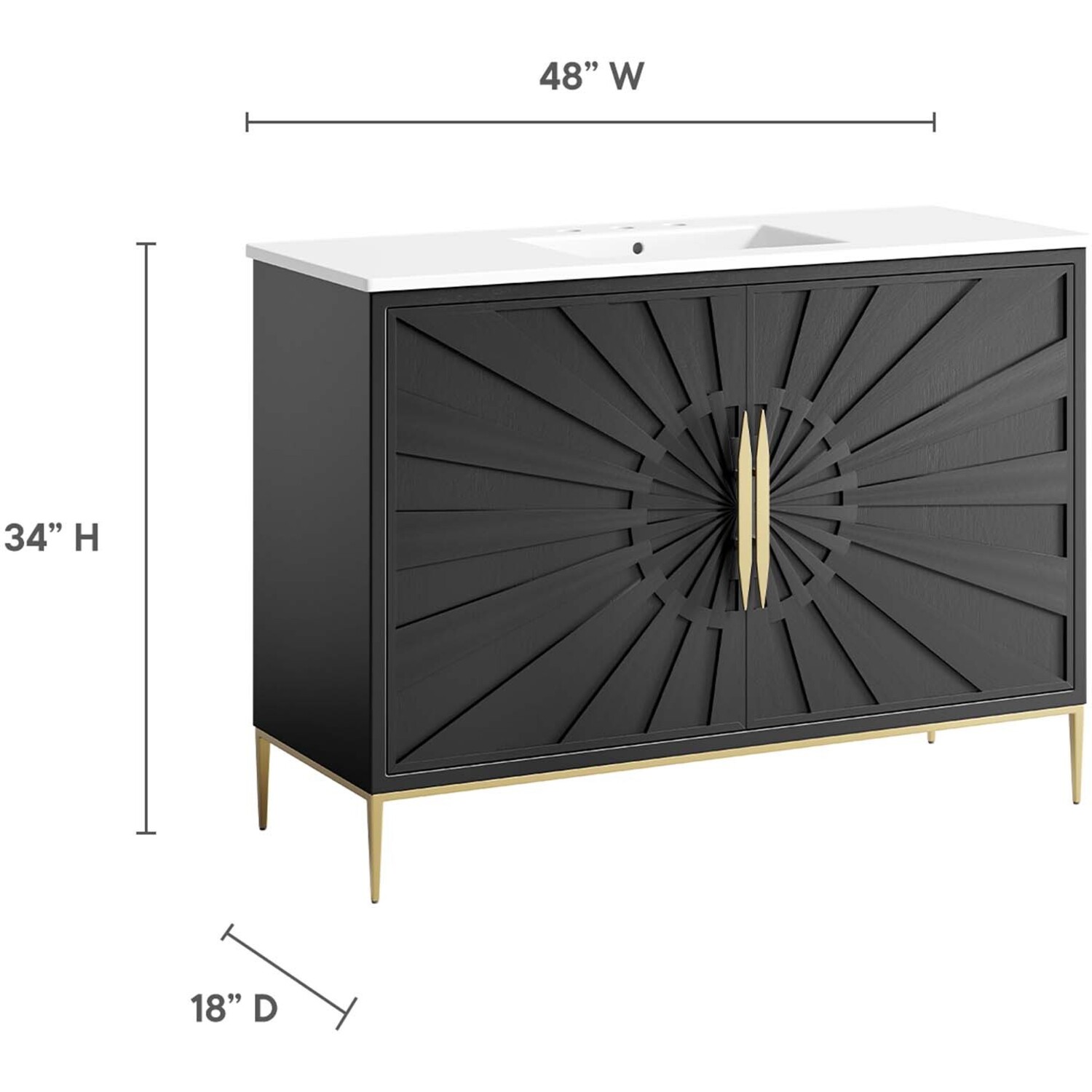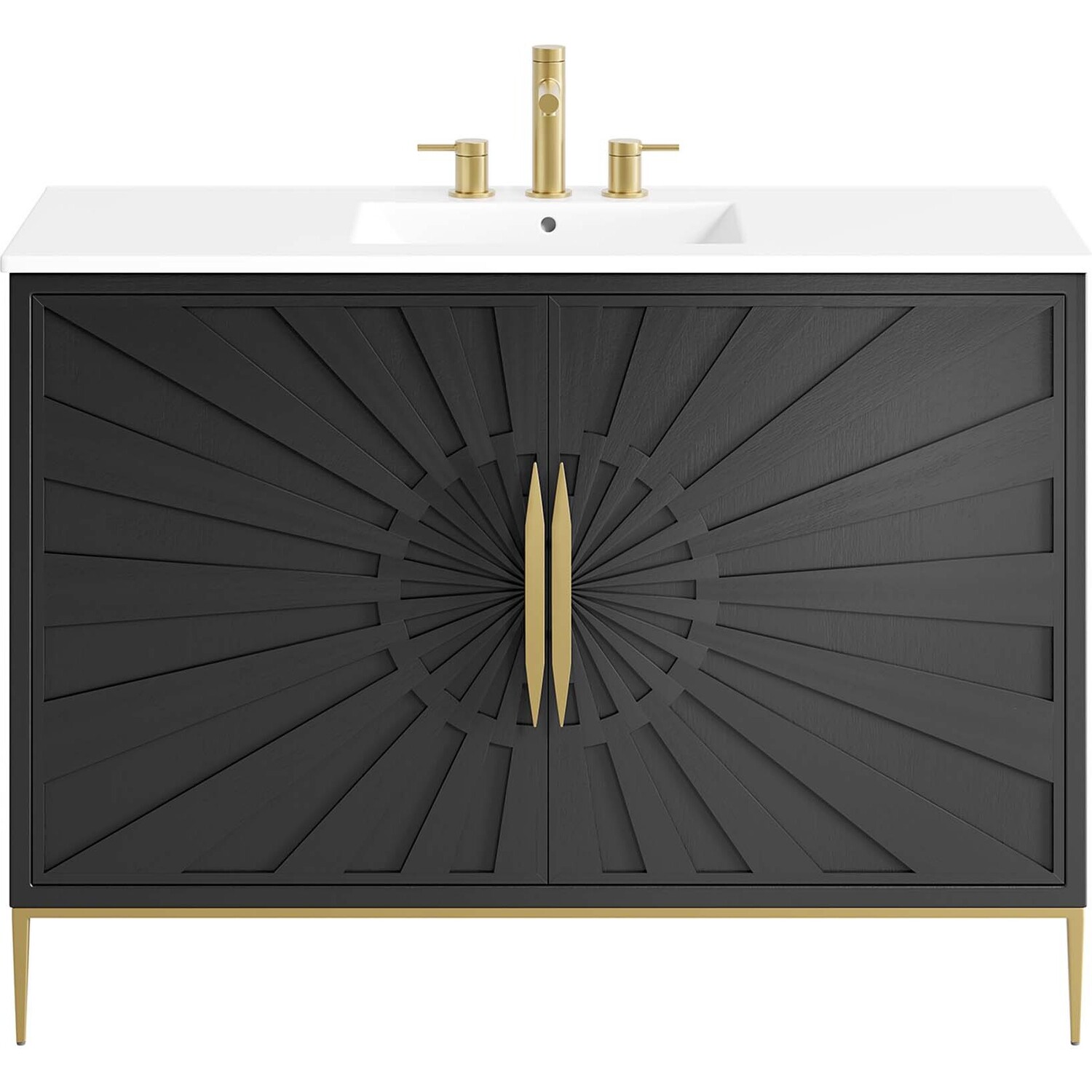 Intricate modernity radiates into your bathroom space with the Awaken 48" Bathroom Vanity. Showcasing clean lines arranged in a radial formation, this bathroom vanity is crafted with solid wood and MDF and rests on a gold base with non-marking foot pads to protect flooring. This vanity is a complete addition to a bathroom with a ceramic sink basin with an integrated countertop and 8" centerset holes. Offering ample storage space for bathroom essentials and more, this vanity cabinet features spacious shelves hidden behind detailed doors with sleek gold hardware. Fixtures not included. Assembly required.Modern Bathroom Vanity Cabinet