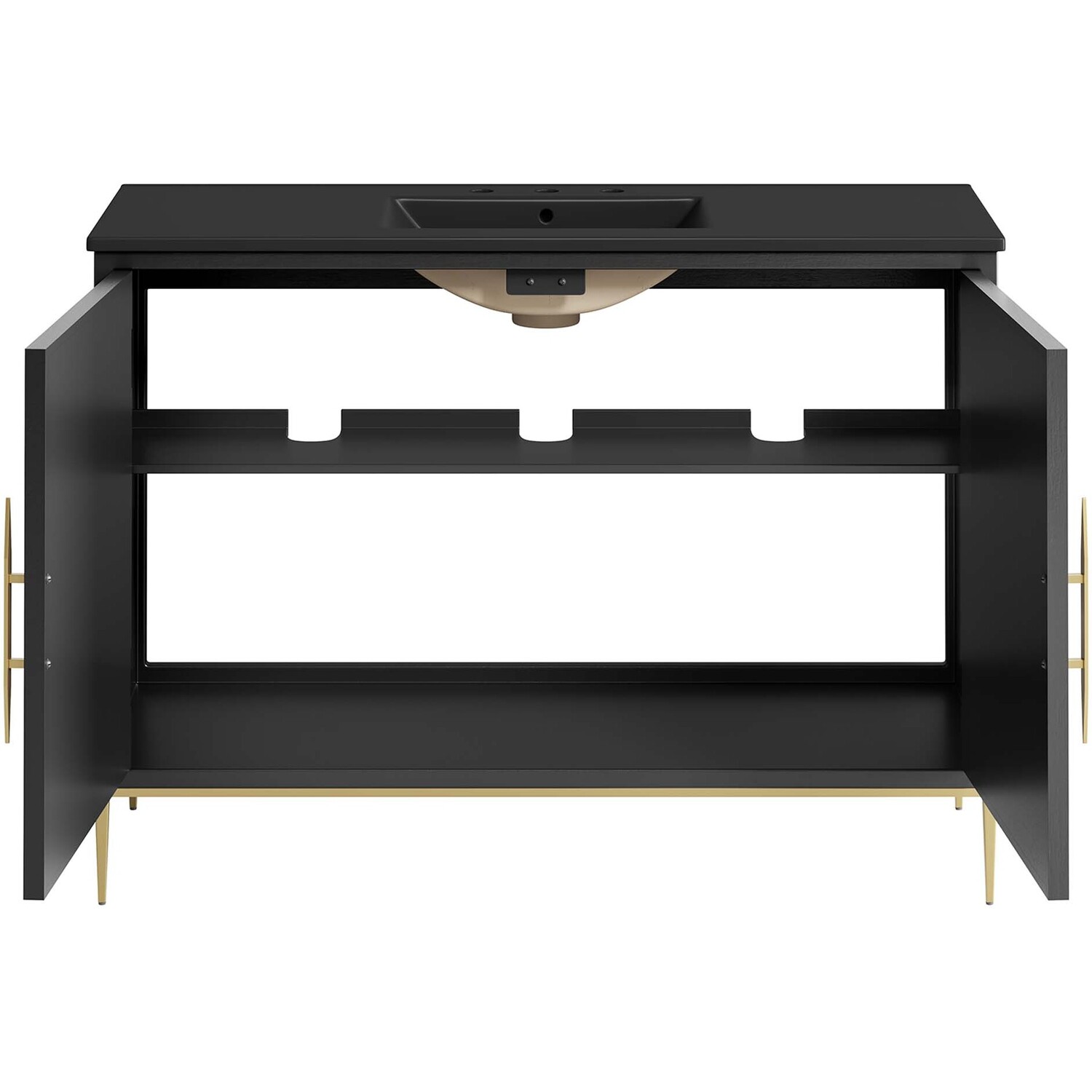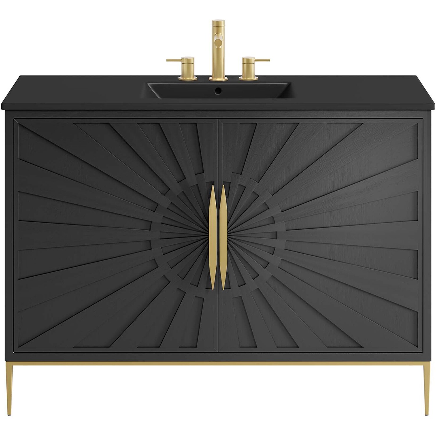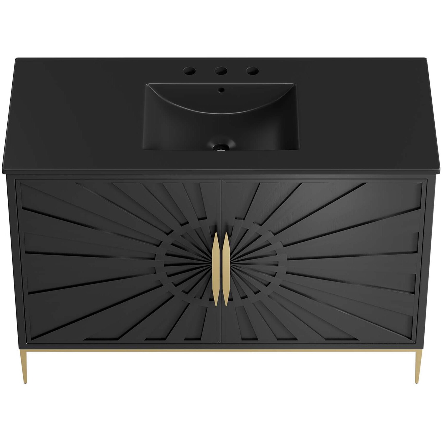 Intricate modernity radiates into your bathroom space with the Awaken 48" Bathroom Vanity. Showcasing clean lines arranged in a radial formation, this bathroom vanity is crafted with solid wood and MDF and rests on a gold base with non-marking foot pads to protect flooring. This vanity is a complete addition to a bathroom with a ceramic sink basin with an integrated countertop and 8" centerset holes. Offering ample storage space for bathroom essentials and more, this vanity cabinet features spacious shelves hidden behind detailed doors with sleek gold hardware. Fixtures not included. Assembly required.Modern Bathroom Vanity Cabinet