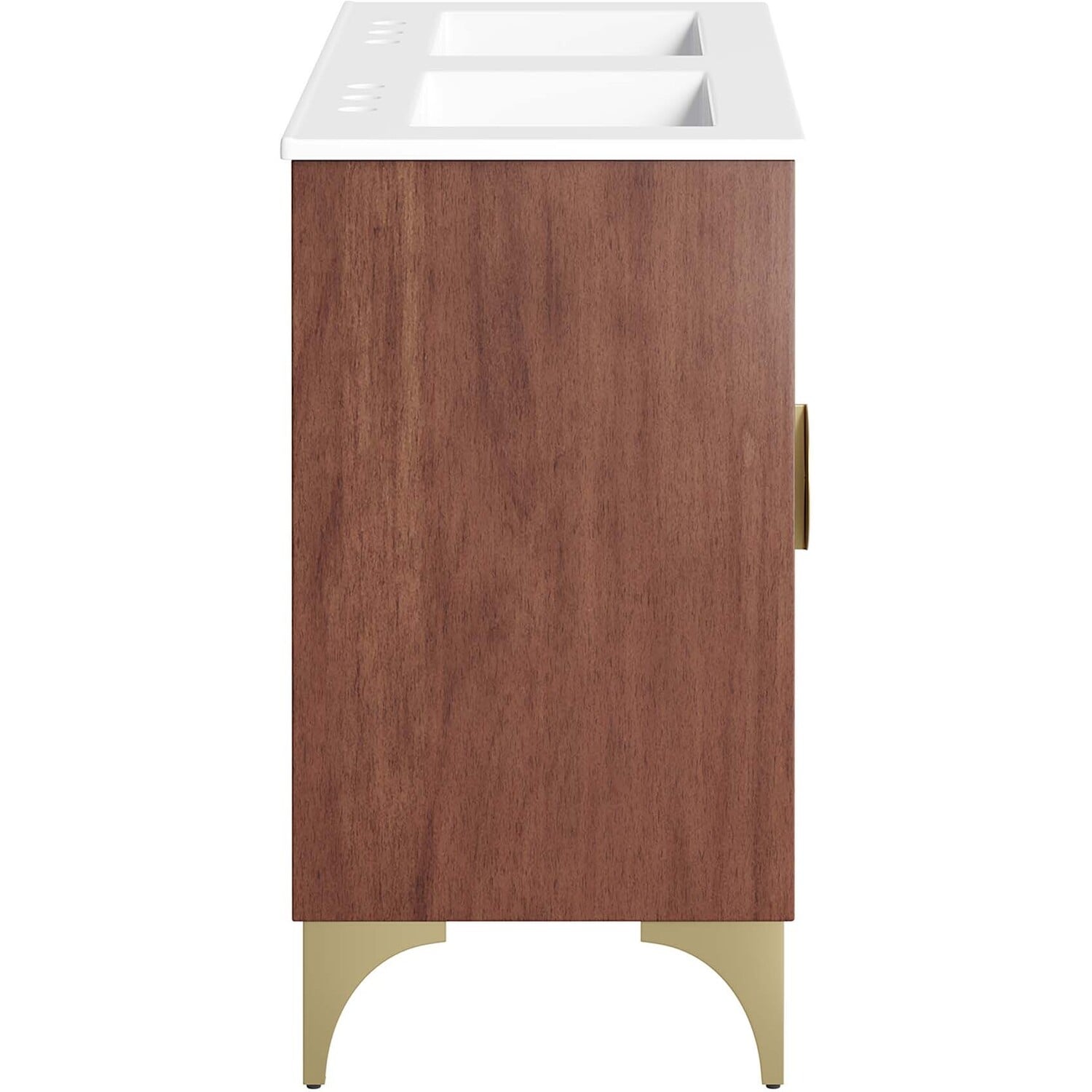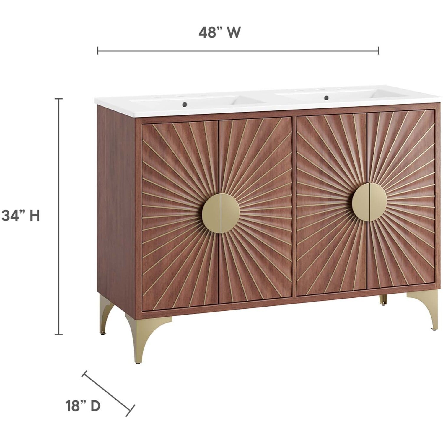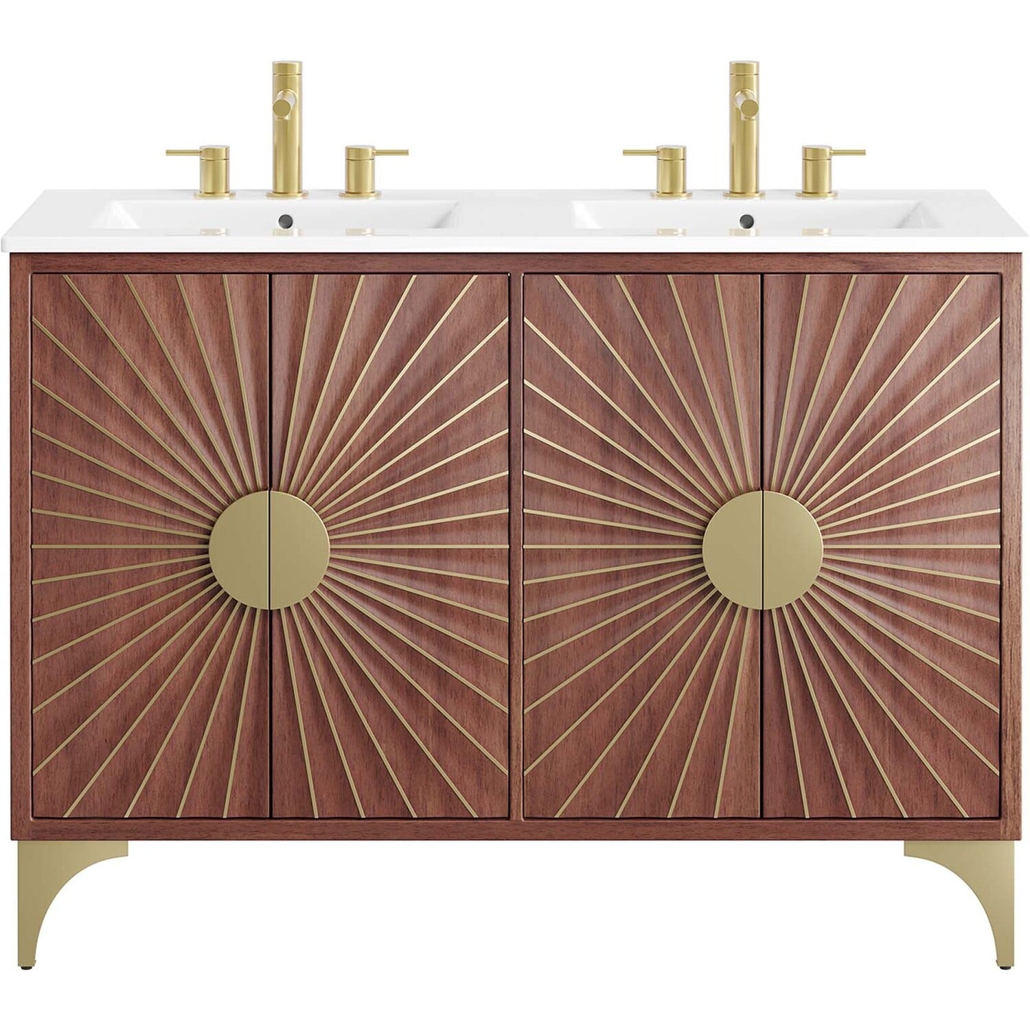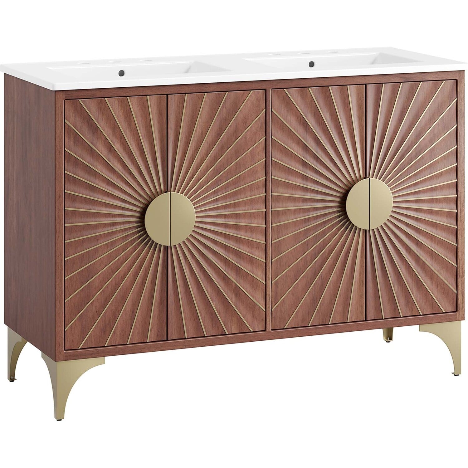Bring refreshing energy into your bathroom space with the Daylight 48" Double Sink Bathroom Vanity. Beautifully crafted with solid mango wood and a rich wood stain, this bathroom cabinet features a sun ray design made possible through intricate powder-coated brass details and hardware. This vanity cabinet is a complete addition to a bathroom with a ceramic double sink basin and an integrated countertop with 8" centerset holes. Resting on a brass base with arched details and non-marking foot caps, this bathroom vanity offers ample storage space for bathroom essentials with the spacious open shelf and pull-out drawer. This dual sink has 8” between basins and 24” between basin drain holes. Fixtures not included. Assembly required.Modern Bathroom Vanity Cabinet