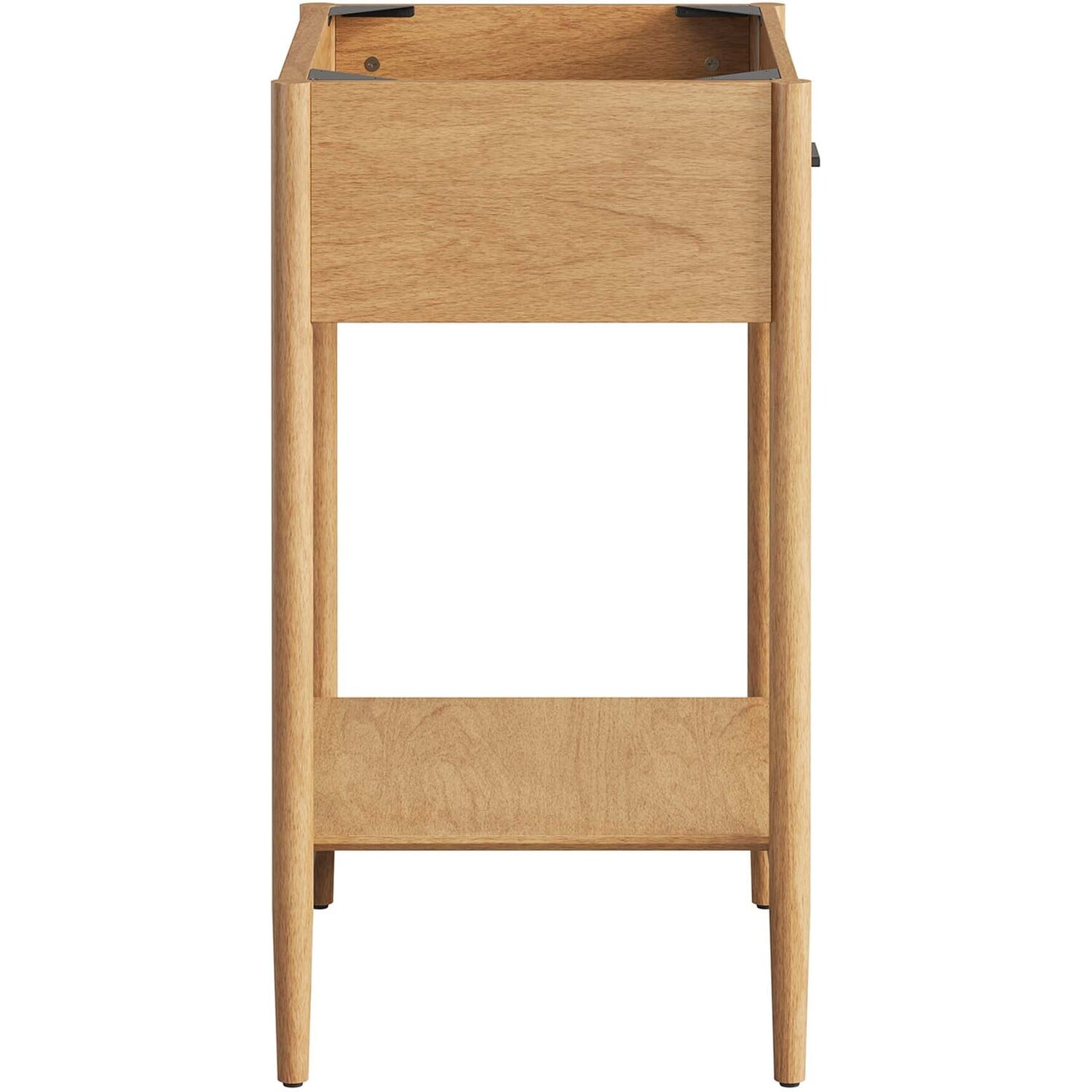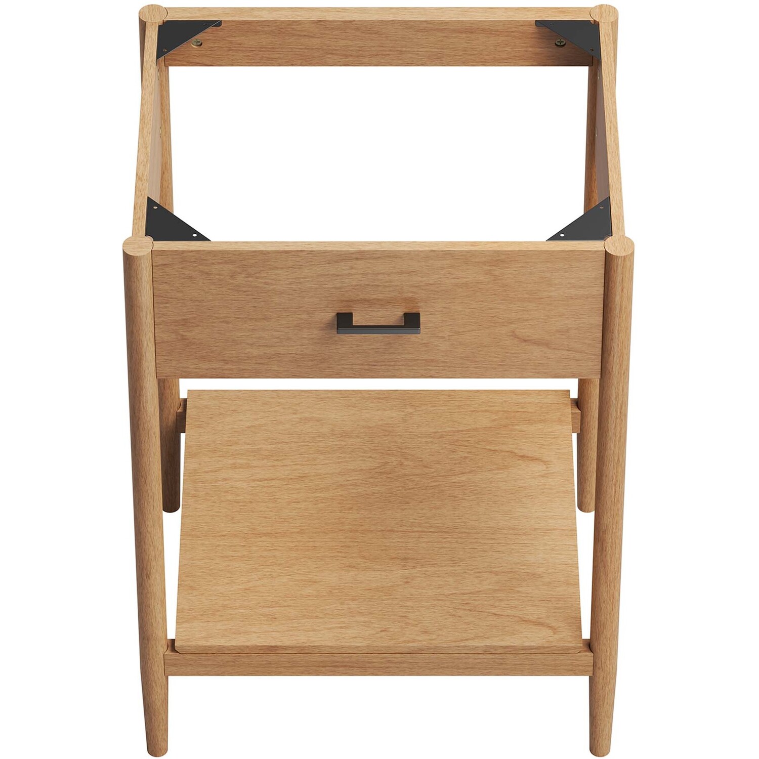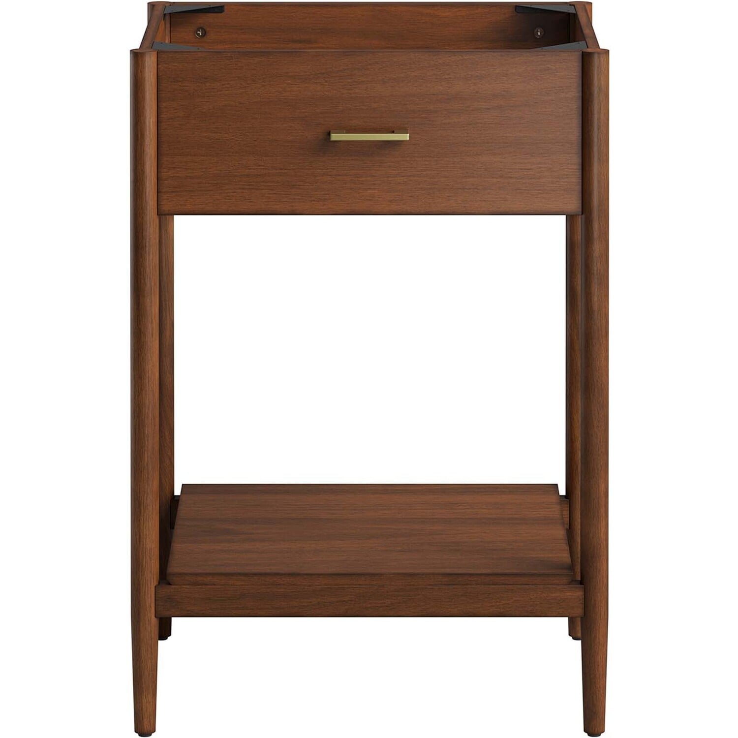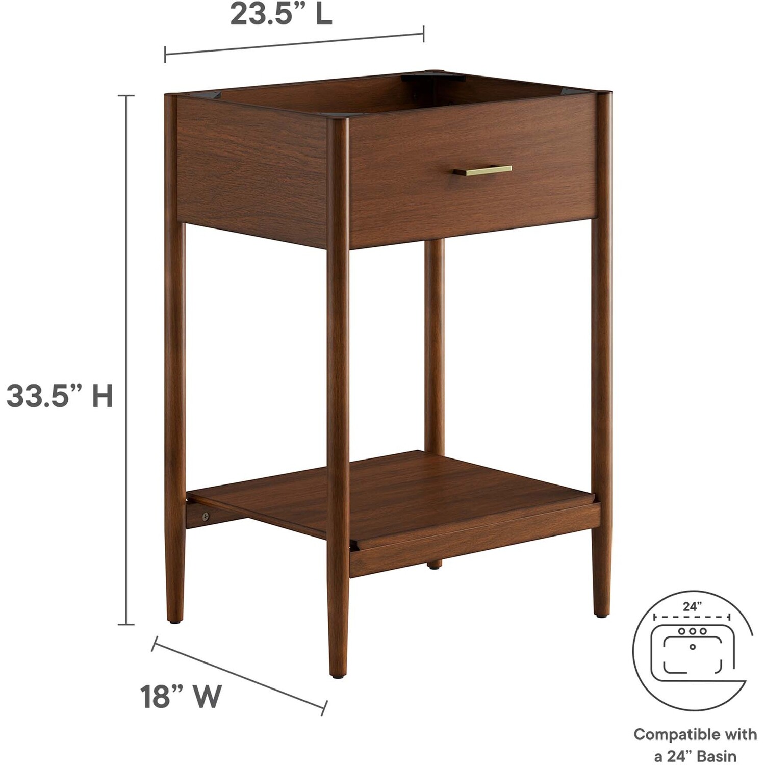 Infuse your bathroom decor with the subtle charm and simplicity of the Zaire 24” Bathroom Vanity Cabinet. This exquisite washstand combines sleek, contemporary lines with the natural beauty of wood in an organic minimalist design. Crafted from MDF and solid rubberwood and topped with a wood grain veneer, this vanity’s design is emphasized by a metal handle pull on its fixed drawer, giving it a touch of urban chic. Below this, you'll find an open shelf, ideal for holding towels or showcasing your favorite decorative pieces. This vanity’s tapered wood legs are a modest and understated design choice that completes the overall simple mid-century aesthetic. Includes adjustable, non-marking feet for added stability and floor protection. Assembly required. Fixtures and sink basin not included. Weight Capacity: 275 lbs.MDF and Rubberwood