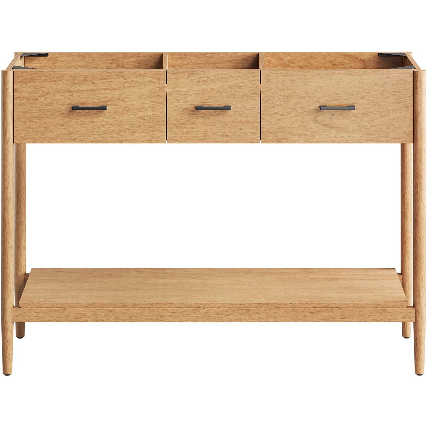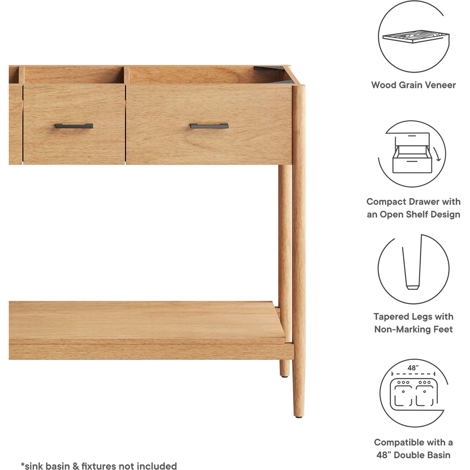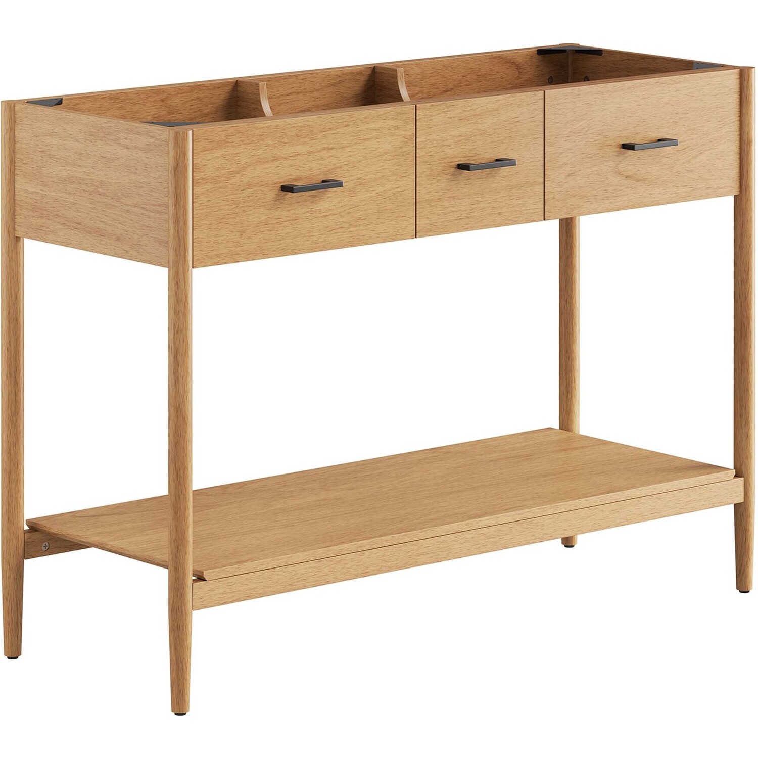 Infuse your bathroom decor with the subtle charm and simplicity of the Zaire 48” Bathroom Vanity Cabinet. This exquisite washstand combines sleek, contemporary lines with the natural beauty of wood in an organic minimalist design. Crafted from MDF and solid rubberwood and topped with a wood grain veneer, this vanity’s design is emphasized by metal handle pulls on its three drawers, giving it a touch of urban chic. While the two side drawers are fixed, the middle drawer offers ample storage space to neatly tuck away your bathroom essentials. Below this, you'll find an open shelf, ideal for holding towels or showcasing your favorite decorative pieces. This vanity’s tapered wood legs are a modest and understated design choice that completes the overall simple mid-century aesthetic. Includes adjustable, non-marking feet for added stability and floor protection. Assembly required. Fixtures and sink basin not included. Weight Capacity: 375 lbs.MDF and Rubberwood