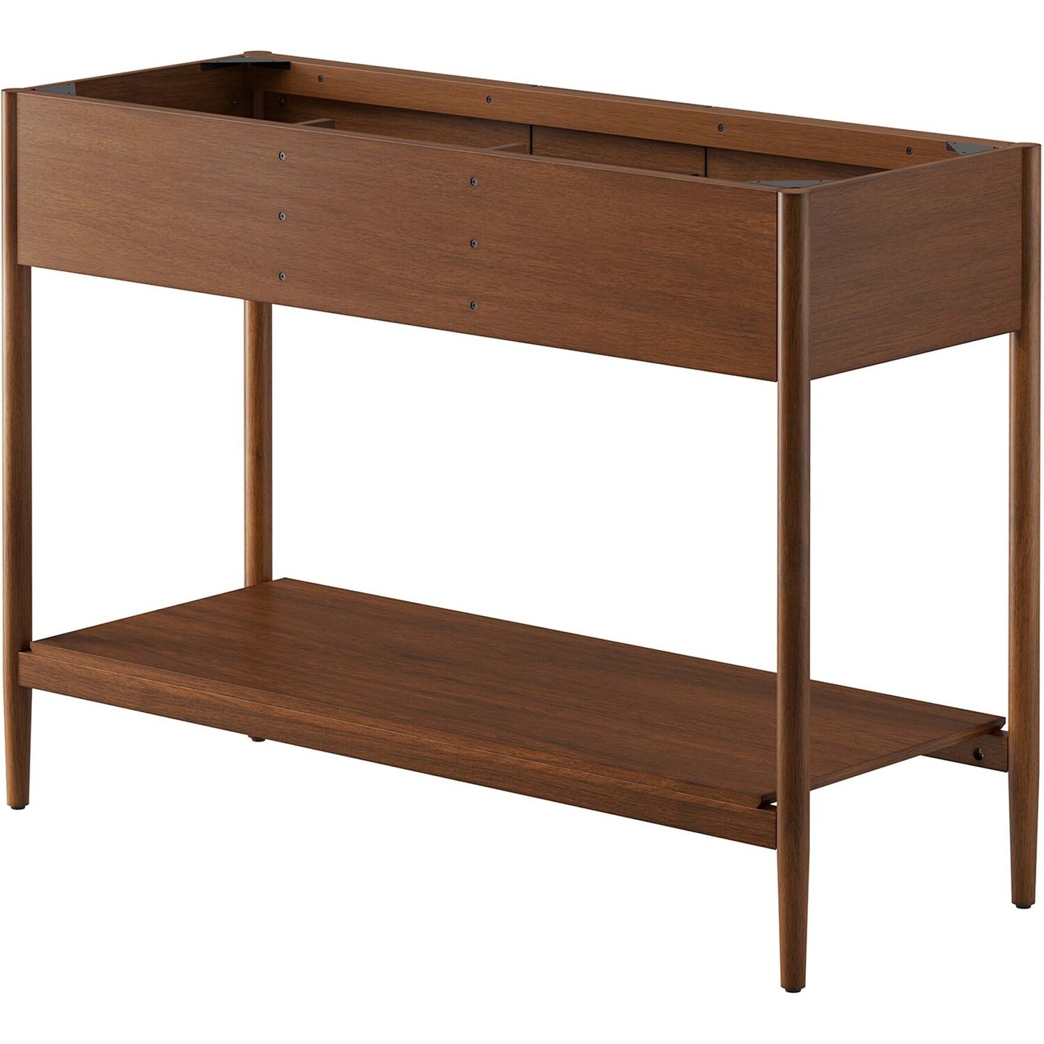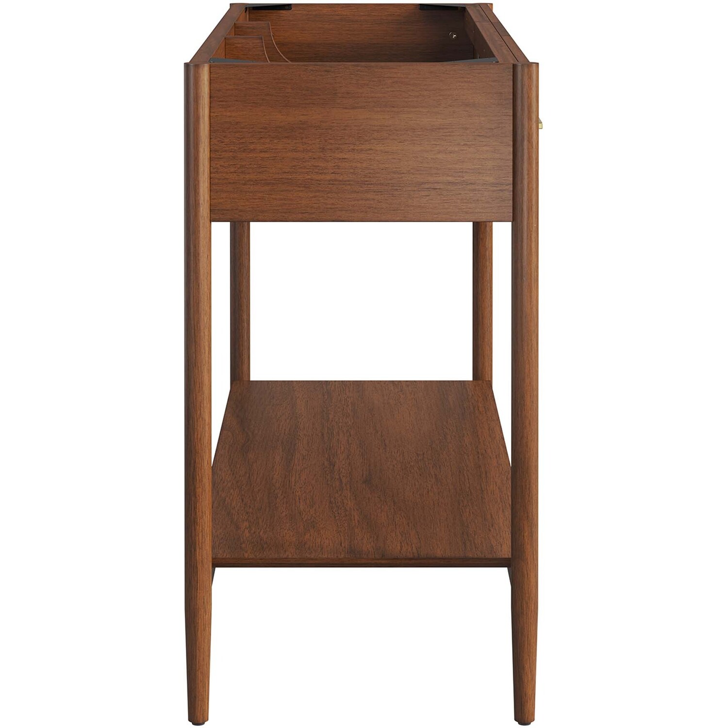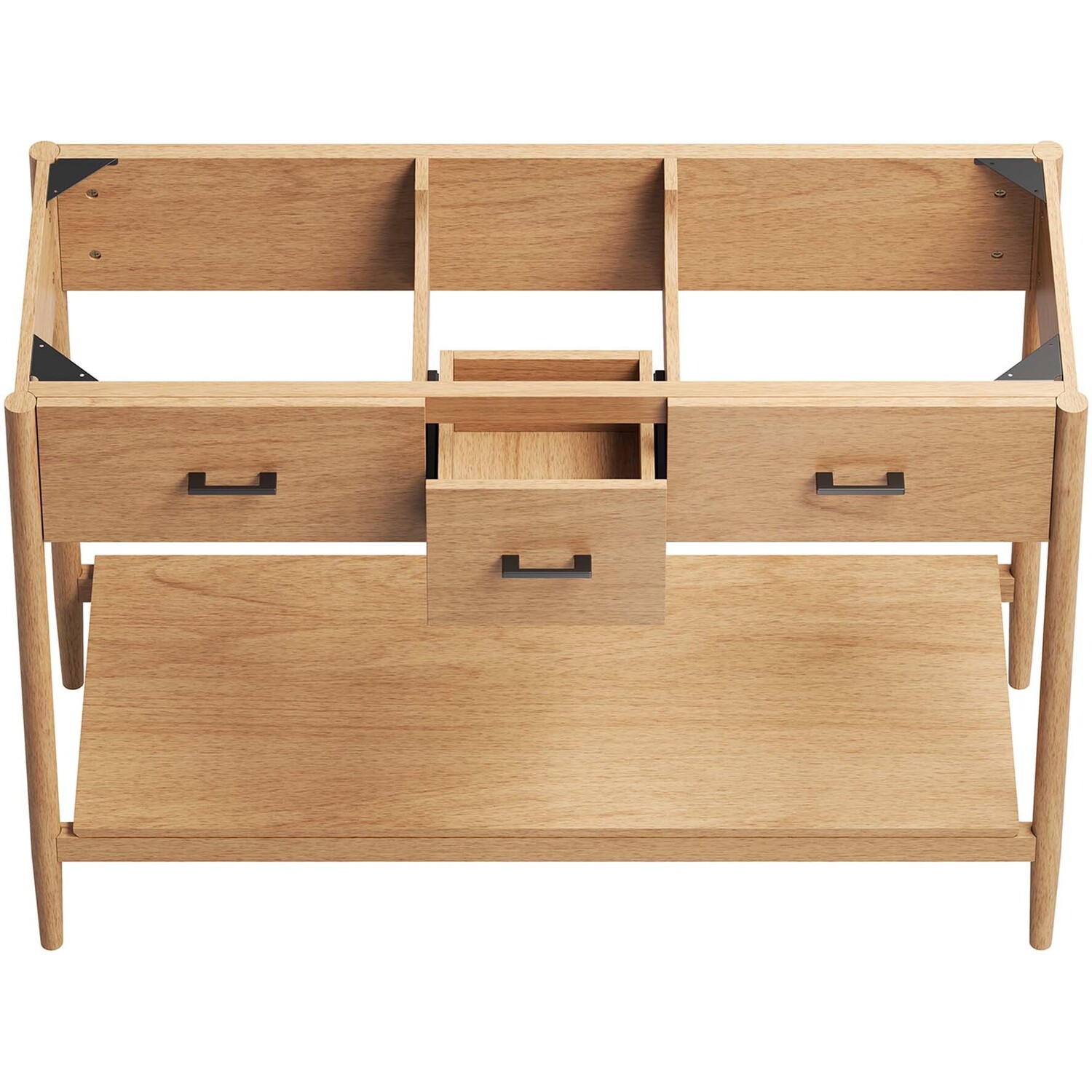 Infuse your bathroom decor with the subtle charm and simplicity of the Zaire 48” Bathroom Vanity Cabinet. This exquisite washstand combines sleek, contemporary lines with the natural beauty of wood in an organic minimalist design. Crafted from MDF and solid rubberwood and topped with a wood grain veneer, this vanity’s design is emphasized by metal handle pulls on its three drawers, giving it a touch of urban chic. While the two side drawers are fixed, the middle drawer offers ample storage space to neatly tuck away your bathroom essentials. Below this, you'll find an open shelf, ideal for holding towels or showcasing your favorite decorative pieces. This vanity’s tapered wood legs are a modest and understated design choice that completes the overall simple mid-century aesthetic. Includes adjustable, non-marking feet for added stability and floor protection. Assembly required. Fixtures and sink basin not included. Weight Capacity: 375 lbs.MDF and Rubberwood