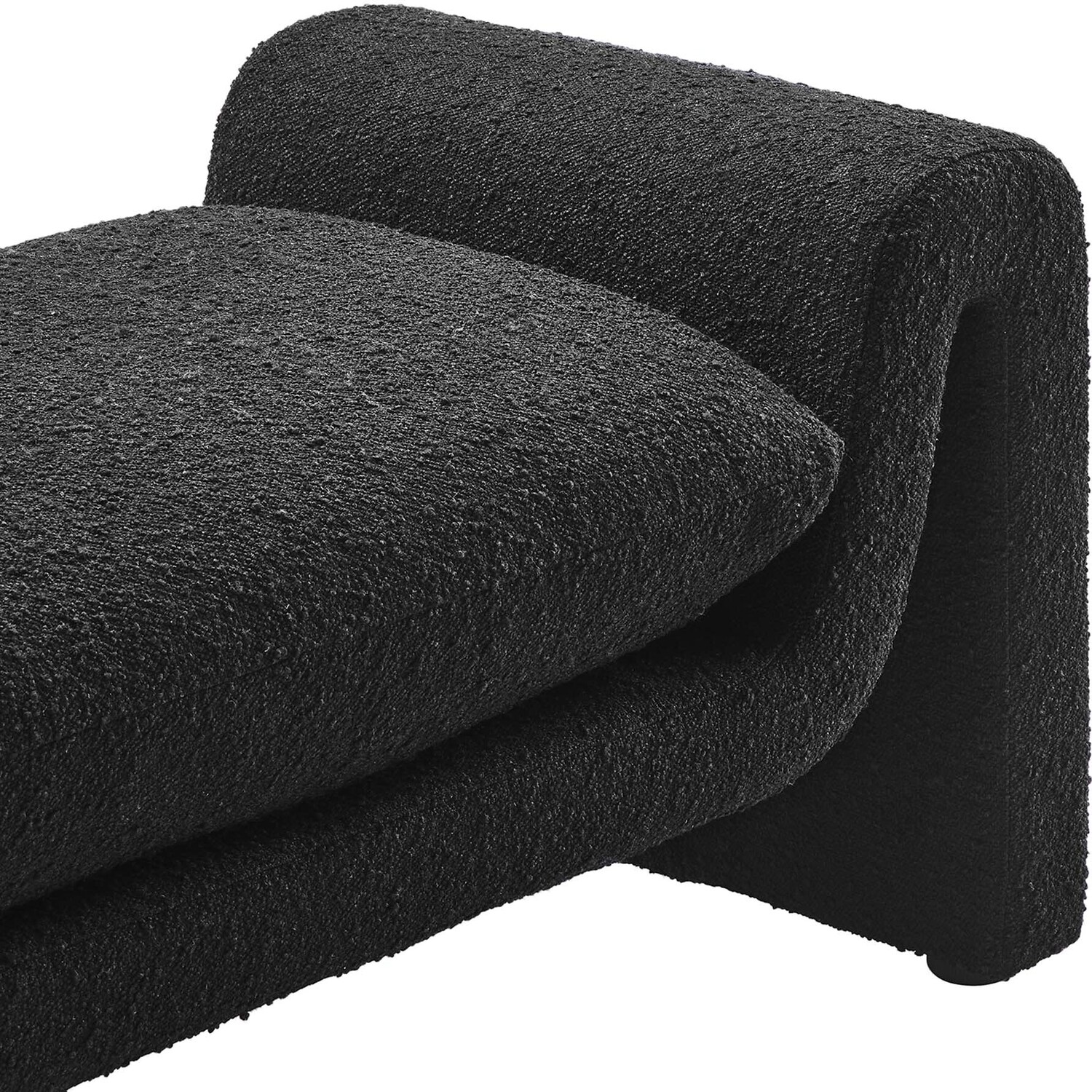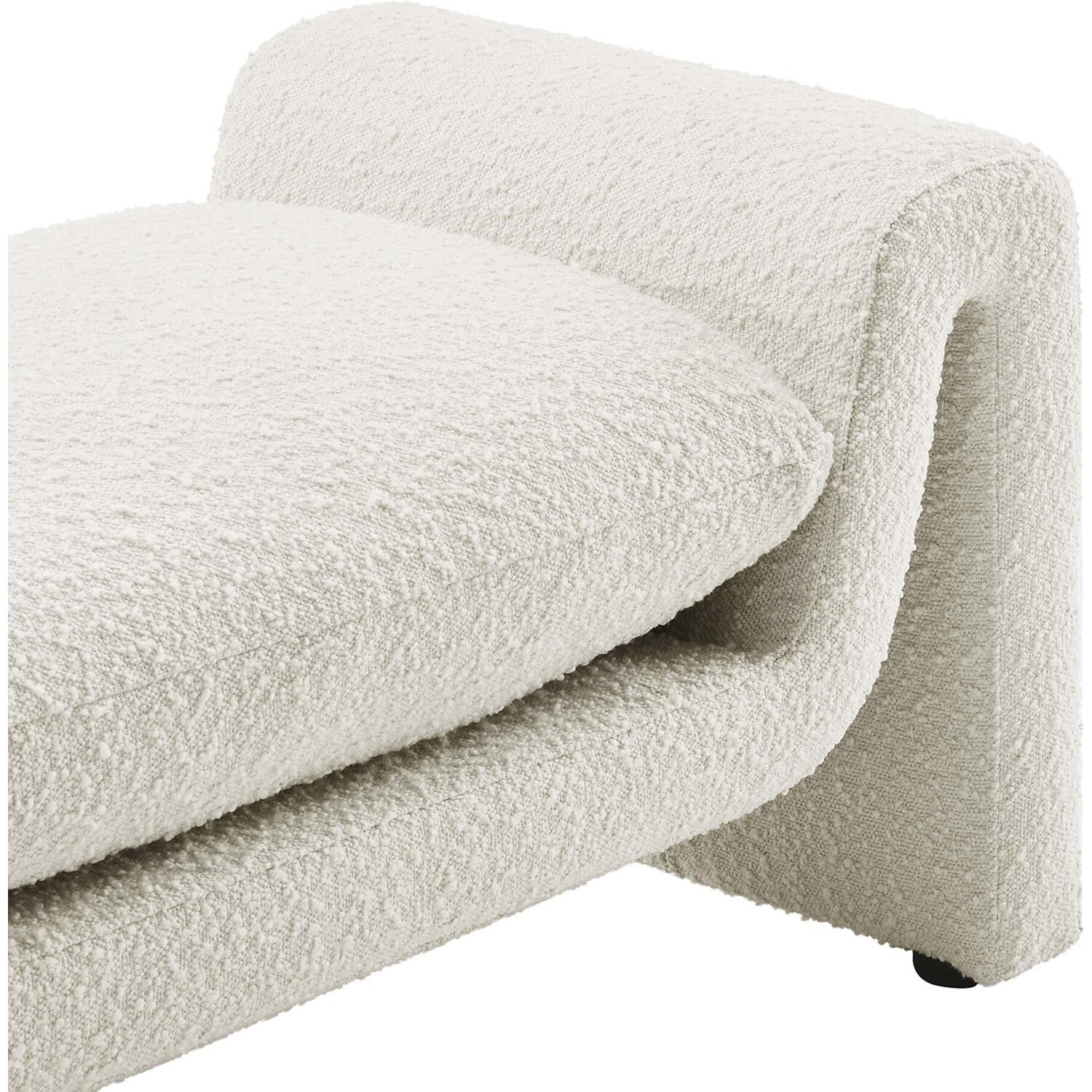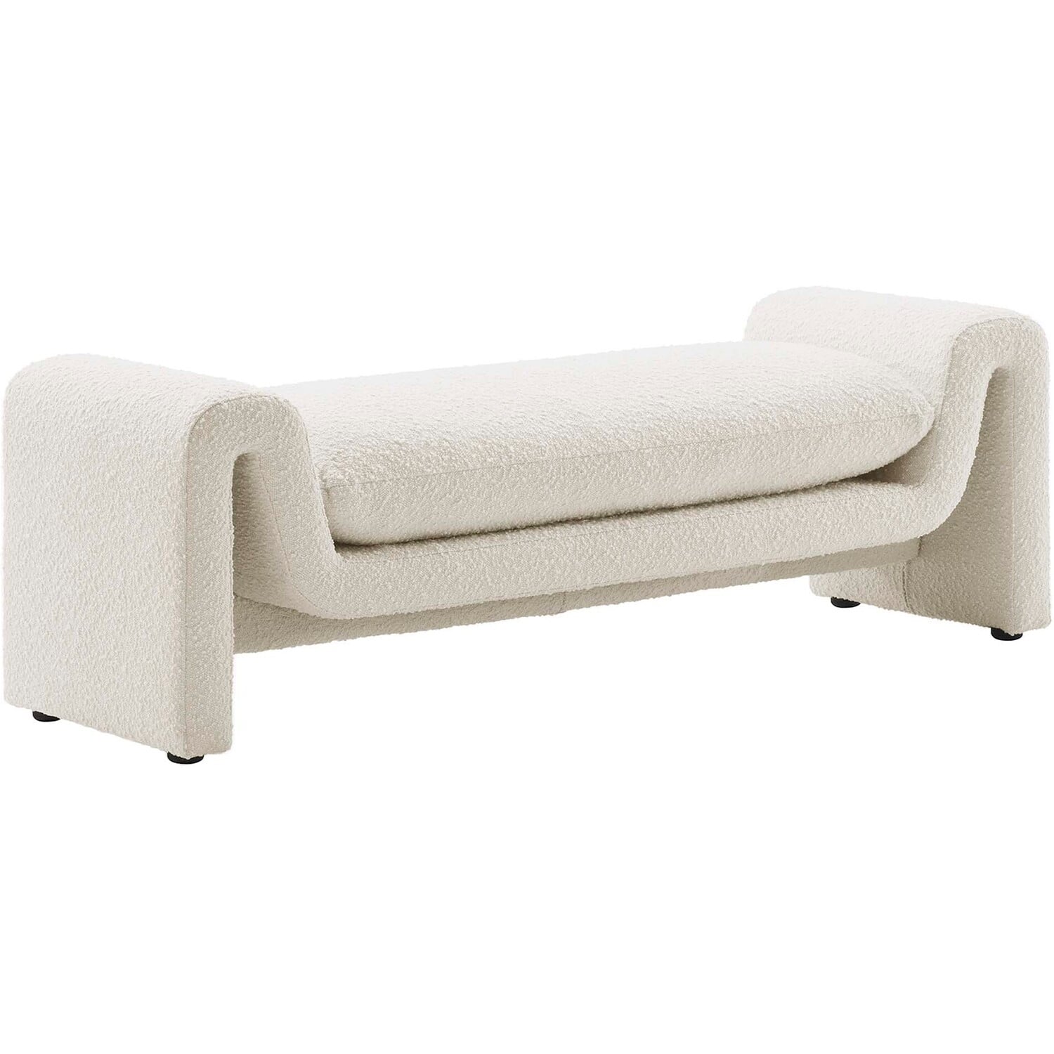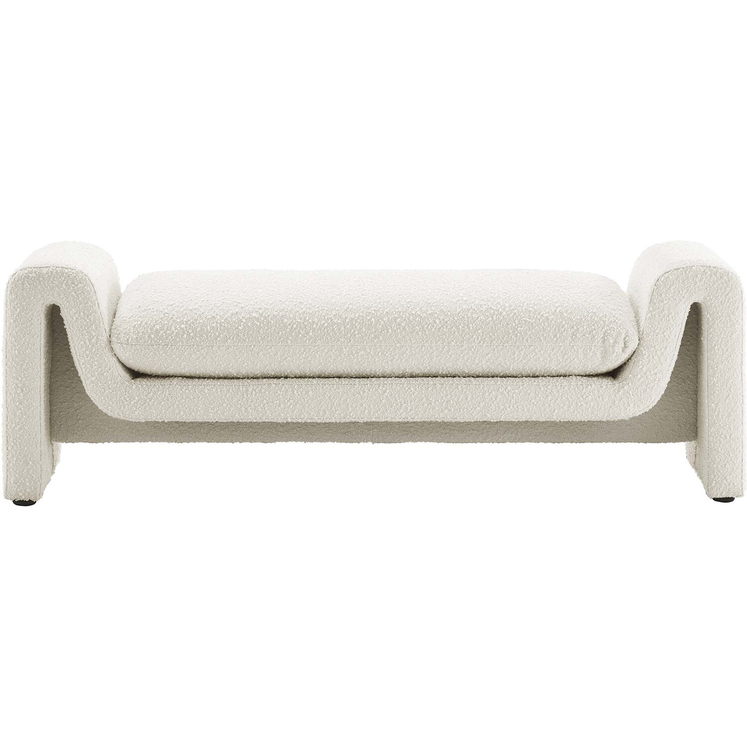 Divulge in the luxe splendor of the one-of-a-kind Waverly Boucle Fabric Bench. This accent bench features a unique, wavy shape complete with bent lines and rounded edges. With dense foam padding for superior comfort, this bench is upholstered in boucle fabric with a charming nubby texture. The cushion is removable and features a removable cover to make cleaning a breeze. The bench seat creates an inviting look and offers superior comfort while resting and relaxing. The adjustable non-marking foot pads elevate this accent bench to perfectly fit your space and protect your floors. With its beautiful silhouette and cozy comfort, this boucle bench is a stylish piece for the living room, bedroom, office, or reception area. No assembly required. Weight Capacity: 661 lbs.Unique Modern Bench