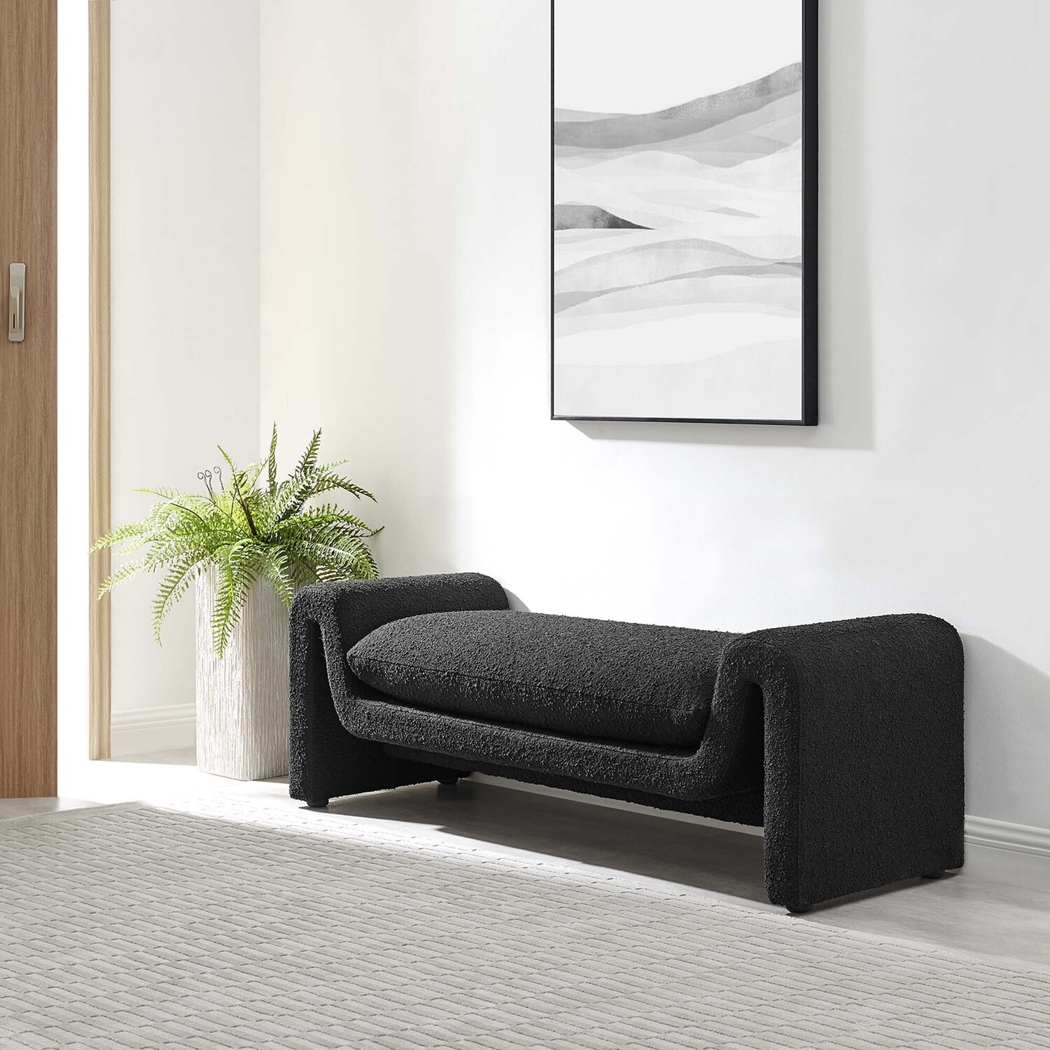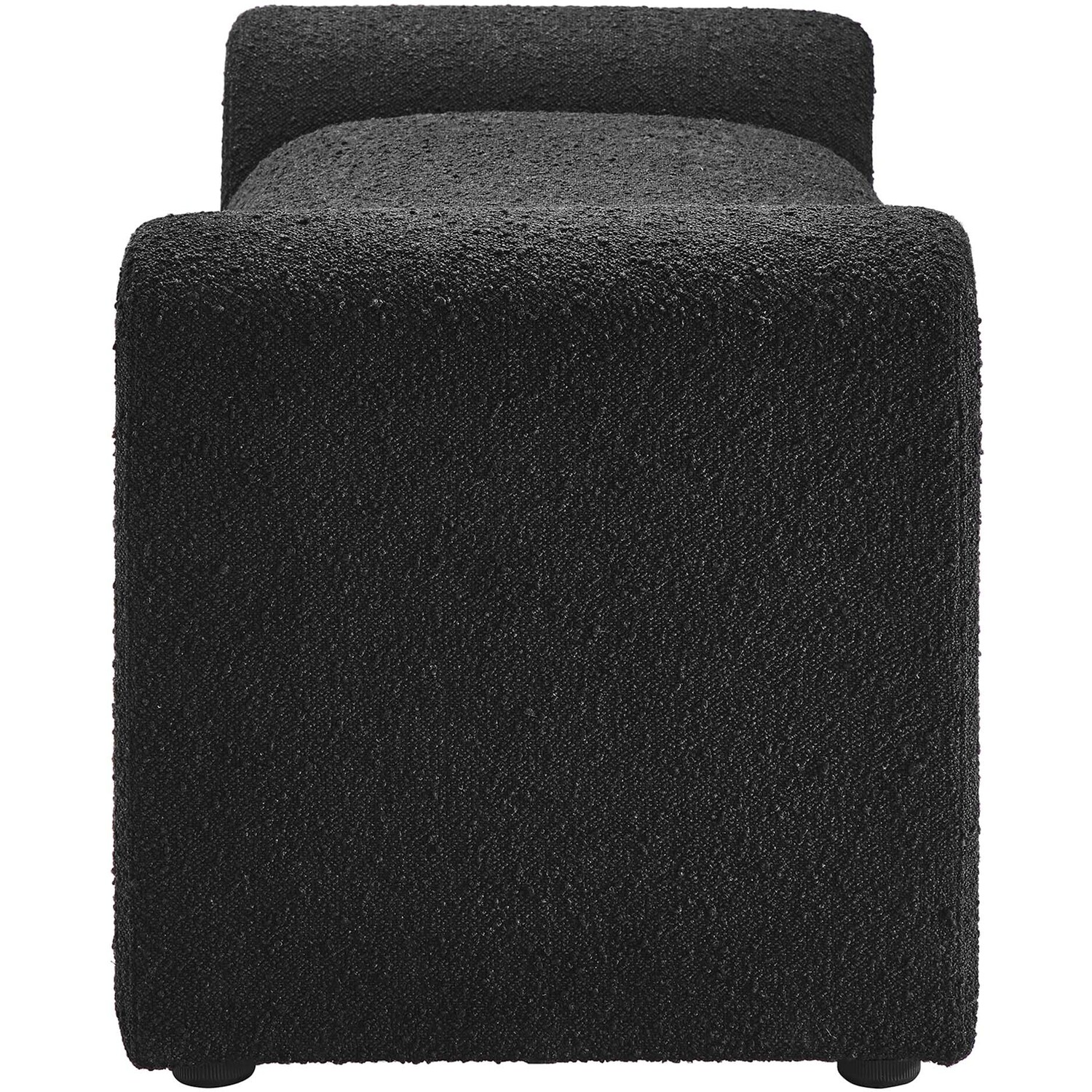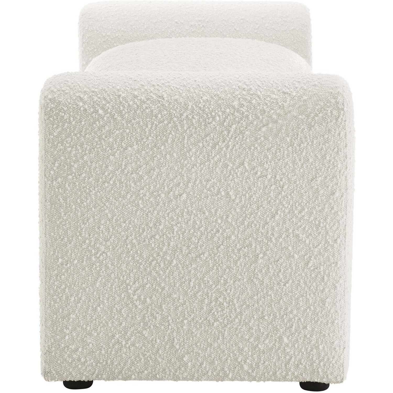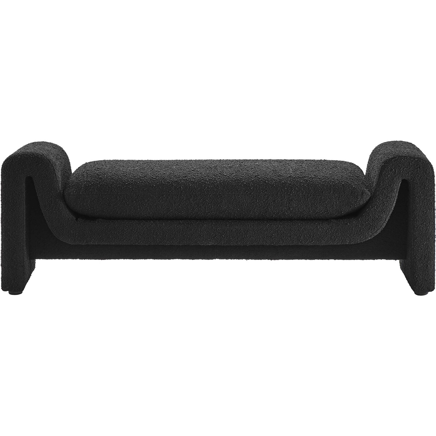Divulge in the luxe splendor of the one-of-a-kind Waverly Boucle Fabric Bench. This accent bench features a unique, wavy shape complete with bent lines and rounded edges. With dense foam padding for superior comfort, this bench is upholstered in boucle fabric with a charming nubby texture. The cushion is removable and features a removable cover to make cleaning a breeze. The bench seat creates an inviting look and offers superior comfort while resting and relaxing. The adjustable non-marking foot pads elevate this accent bench to perfectly fit your space and protect your floors. With its beautiful silhouette and cozy comfort, this boucle bench is a stylish piece for the living room, bedroom, office, or reception area. No assembly required. Weight Capacity: 661 lbs.Unique Modern Bench
