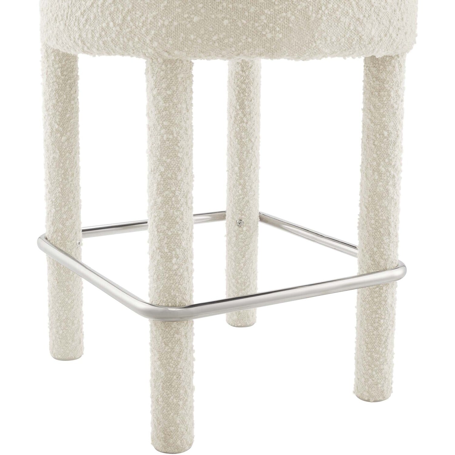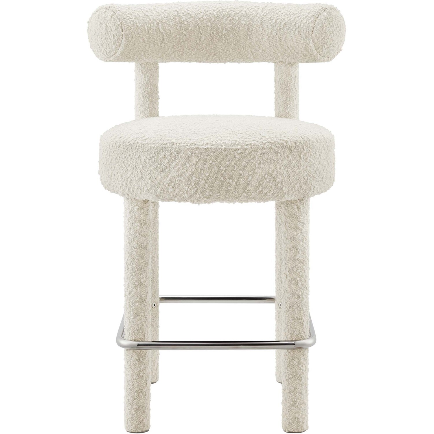 Enhance your dining space with the exquisite Toulouse Boucle Upholstered Counter Stool. Upholstered in beautifully textured boucle fabric, this counter stool exudes modern luxury and glam deco style. The curved bolster pillow backrest, circular seat, and dense foam padding provide unparalleled comfort and unmatched aesthetics. A polished metal stretcher wraps around the four tubular legs to provide function and chic allure to the stylish counter-height stool. With non-marking foot pads to protect your flooring, this boucle counter stool adds a touch of sophistication to the dining room or kitchen space. Easy assembly is required. Weight Limit: 330 lbs.Modern Counter Stool