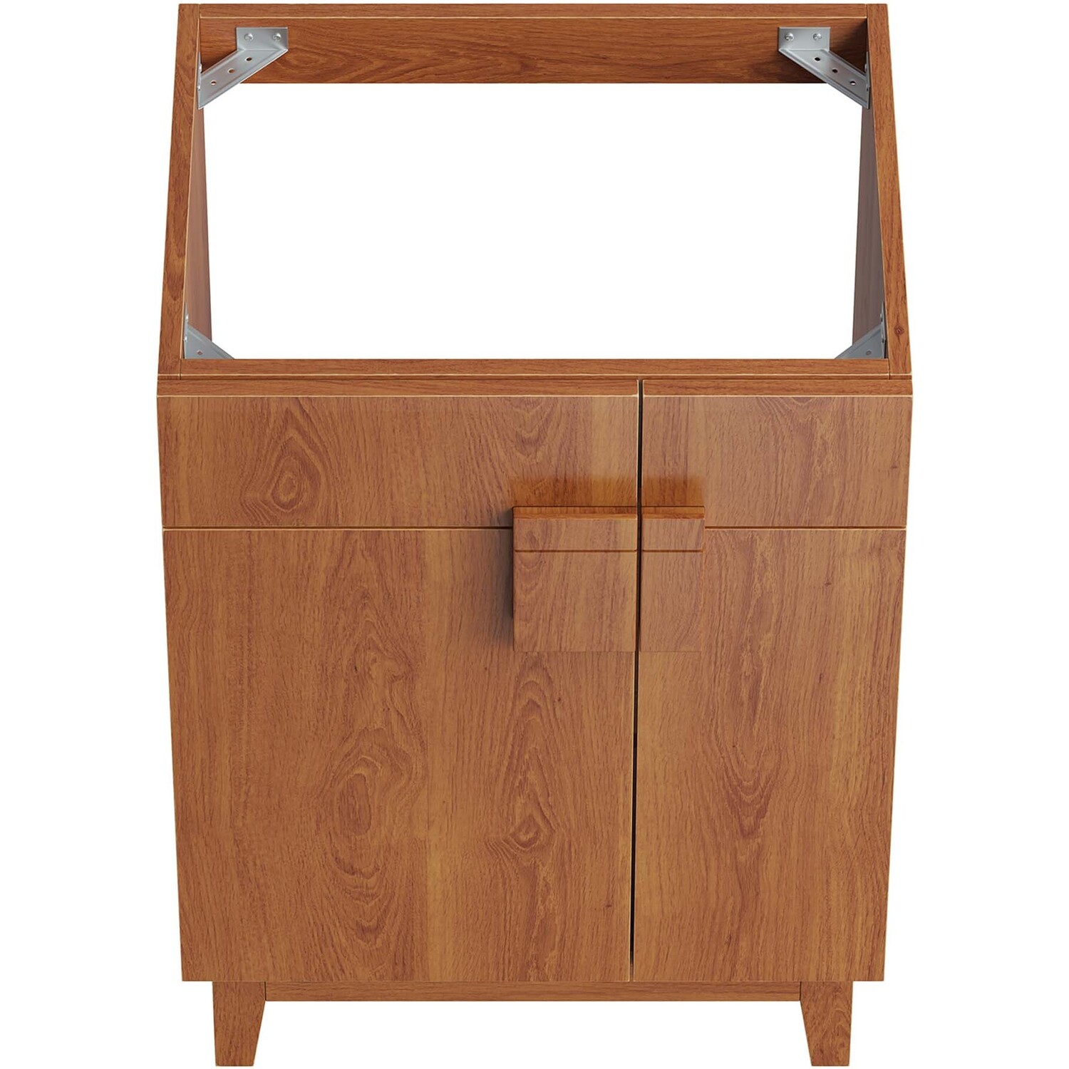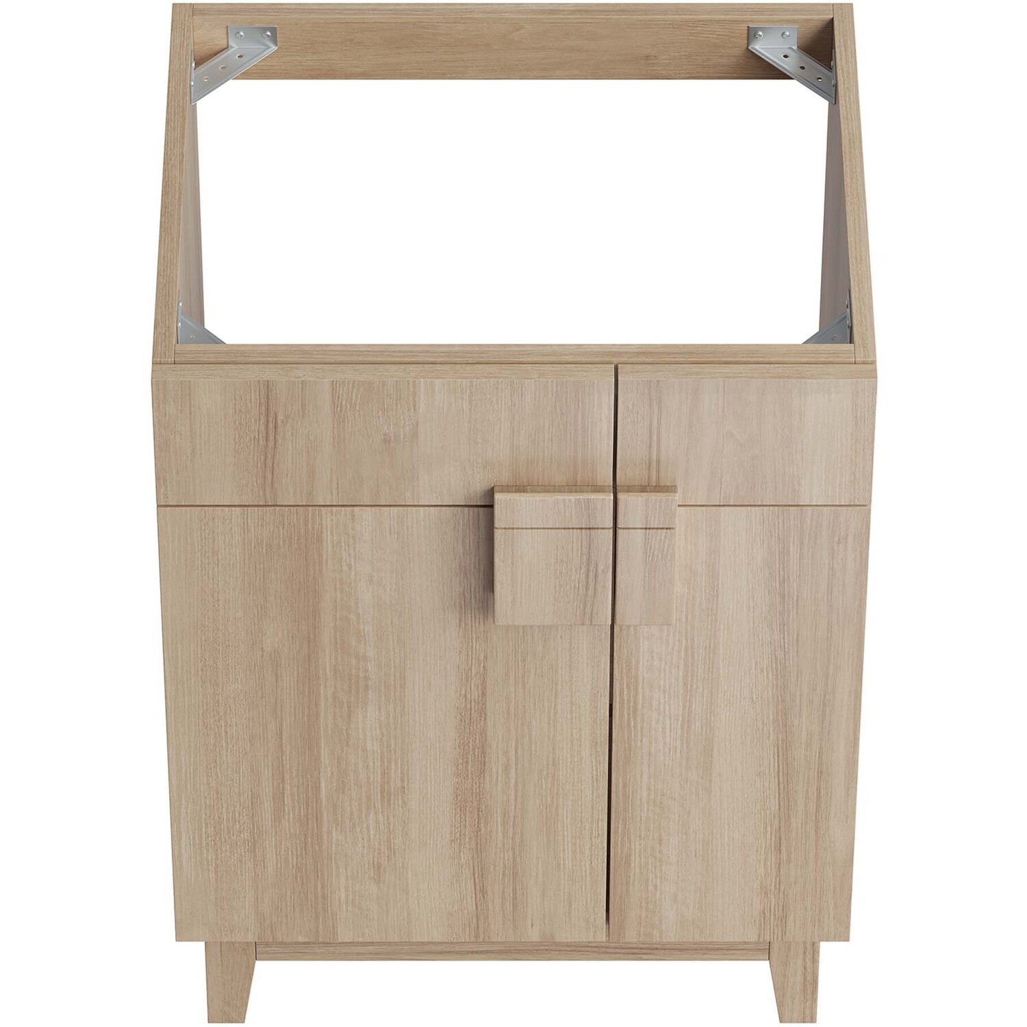 Update your bathroom decor with the modern allure of the Miles 24" Bathroom Vanity Cabinet. Made from particleboard adorned with a sleek melamine laminate, this vanity stands on four tapered rubberwood legs, equipped with non-marking tack glides to protect flooring. The unique design showcases two metal hinged doors, featuring an intriguing asymmetrical layout, and accentuated by a split square handle for a modern touch. Inside, you'll find ample storage on two spacious shelves, perfect for organizing bathroom essentials. Miles features a cut-out design to accommodate plumbing. Assembly required. Sink basin and fixtures not included. Weight Capacity: 200 lbs.Particleboard & Melamine Laminate