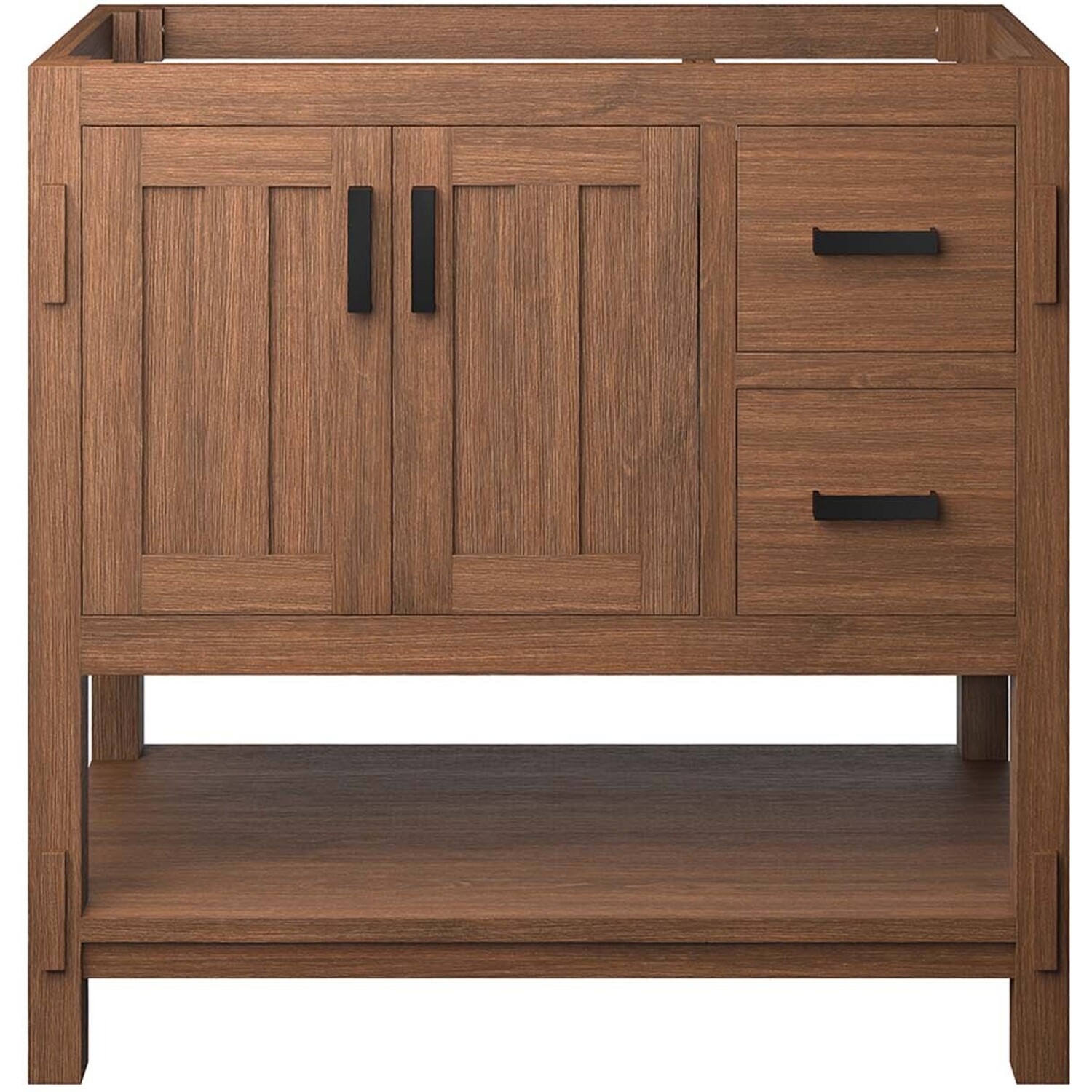 Fusing mid-century design and modern style, the Ashlyn 36" Bathroom Vanity Cabinet brings organic charm to your bathroom ambiance. Crafted from durable mindi wood, the frame and legs are highlighted by four prominent wooden accents, amplifying the design. Two soft-close doors open to reveal a spacious shelf, ideal for towels, toiletries, and other essentials, while two stacked drawers provide additional storage. Below these compartments is an open shelf, perfect for easy-access items or decorative elements. Includes non-marking foot caps to protect flooring. Sink basin and fixtures not included. Assembly required. Weight Capacity: 200 lbs.Solid Mindi Wood